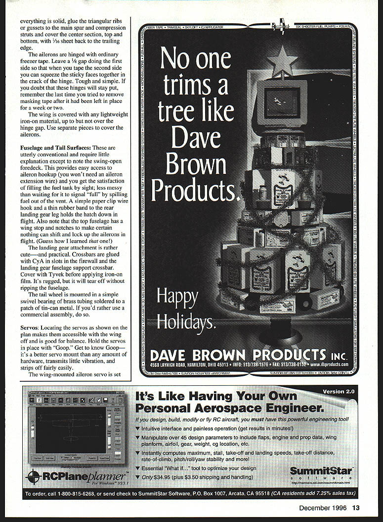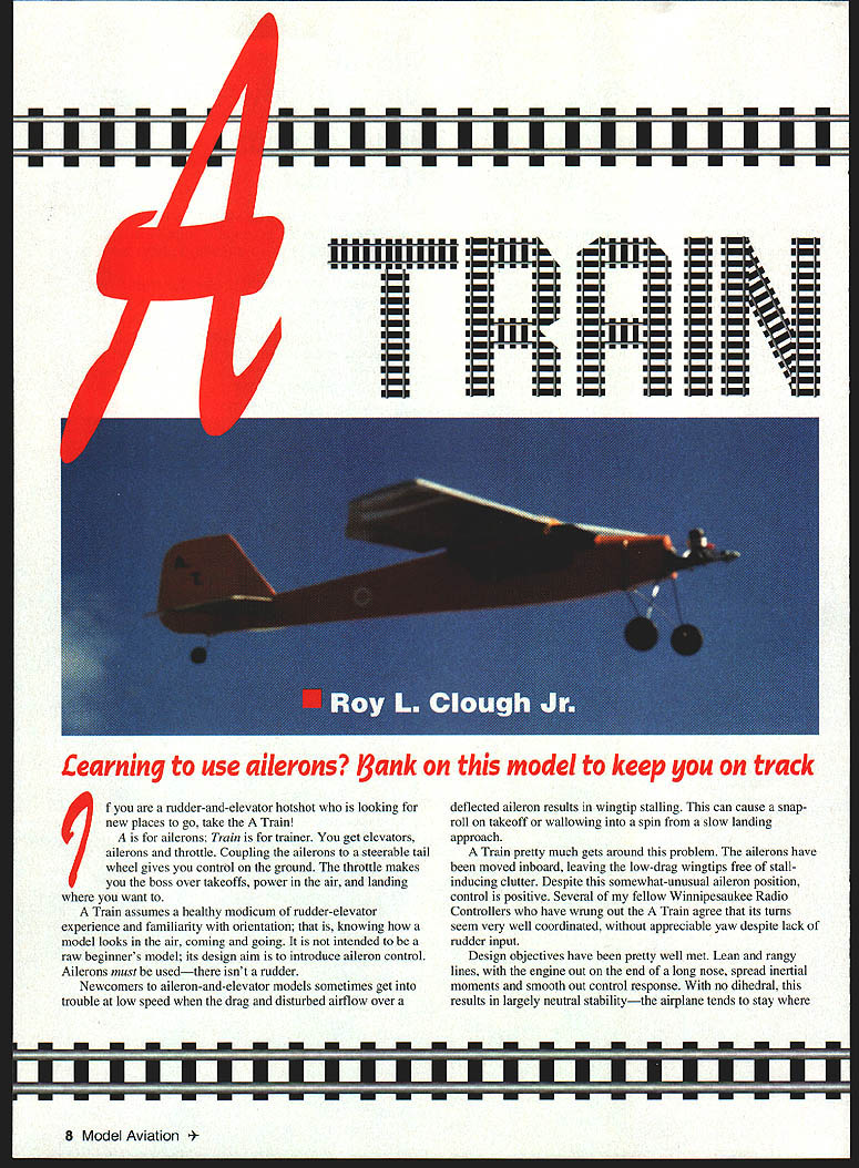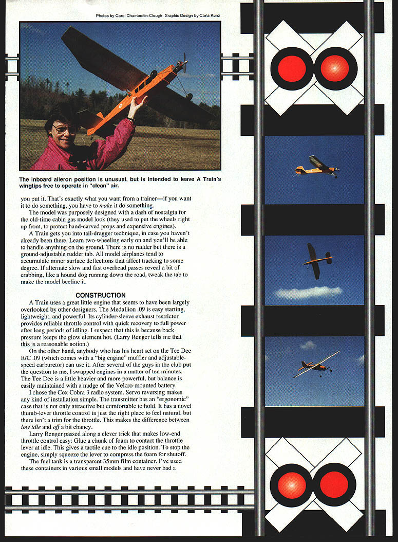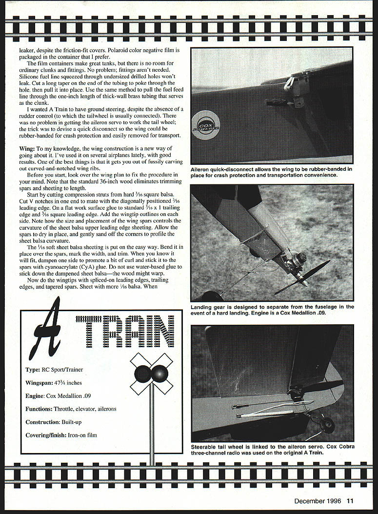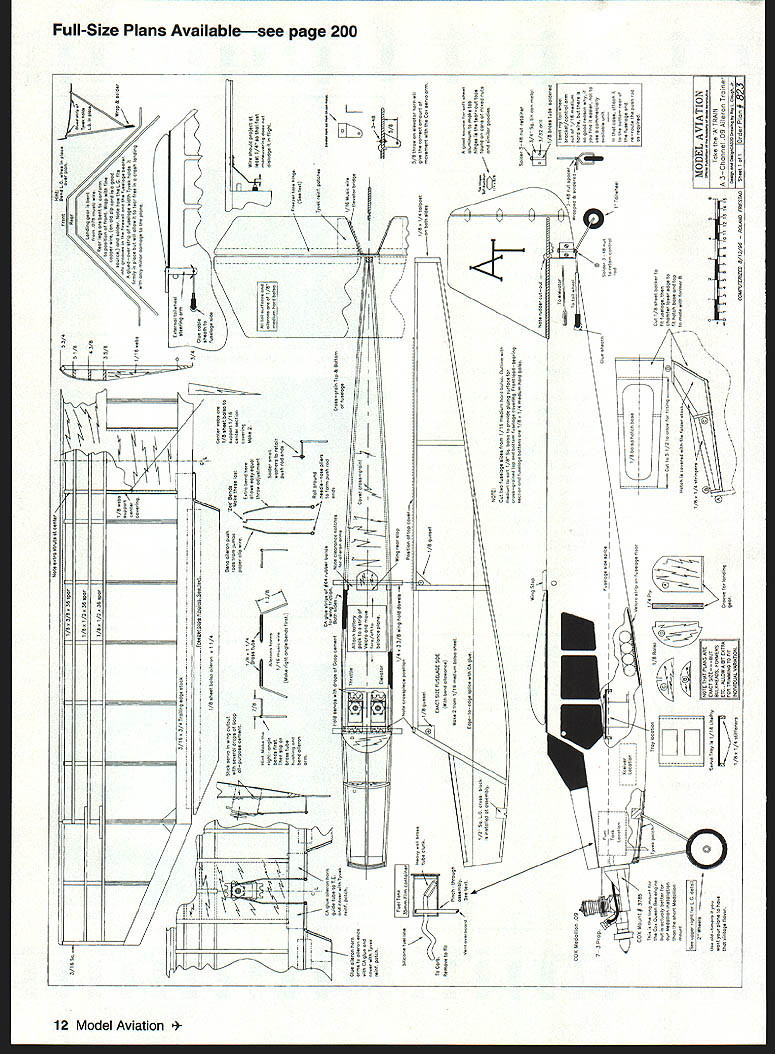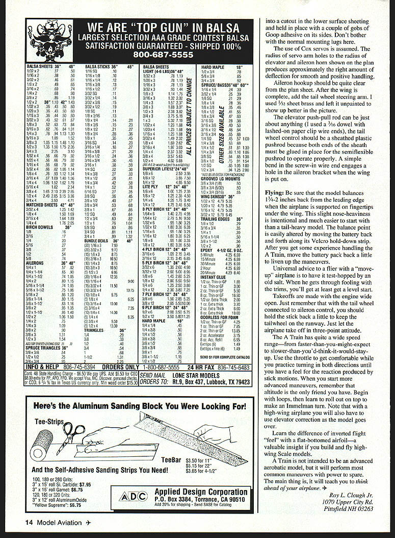 Ill' mm mu~ T f rudder-and-elevator hotshot looking new places go take Train ailerons Train trainer get elevators ailerons throttle Coupling ailerons steerable tail wheel gives control ground throttle makes boss over takeoffs power air landing want Train assumes healthy modicum rudder-elevator experience familiarity orientation knowing model looks air coming going intended raw beginners model its design aim introduce aileron control Ailerons must usedthere isnt rudder Newcomers aileron-and-elevator models sometimes get trouble low speed drag disturbed airflow over deflected aileron results wingtip stalling can cause snaproll takeoff wallowing spin slow landing approach Train pretty much gets around problem ailerons have moved inboard leaving low-drag wingtips free stallinducing clutter Despite somewhat-unusual aileron position control positive Several fellow Winnipesaukee Radio Controllers have wrung out Train agree its turns seem very well coordinated appreciable yaw despite lack rudder input Design objectives have pretty well met Lean rangy lines engine out end long nose spread inertial moments smooth out control response no dihedral results largely neutral stabilitythe airplane tends stay 8 Model Aviation ning use ailerons 3ank model keep track Photoa Carol Chamberlin-Clouch GraDhic Desion Carla Kunz put Thats exactly what want trainerif want something have make something model purposely designed dash nostalgia old-time cabin gas model look used put wheels right up front protect hand-carved props expensive engines Train gets tail-dragger technique case havent already Learn two-wheeling early youll able handle anything ground no rudder ground-adjustable rudder tab model airplanes tend accumulate minor surface deflections affect tracking some degree alternate slow fast overhead passes reveal bit crabbing like hound dog running down road tweak tab make model beeline CONSTRUCTION Train uses great little engine seems have largely overlooked other designers Medallion 09 easy starting lightweight powerful Its cylinder-sleeve exhaust restrictor provides reliable throttle control quick recovery full power after long periods idling suspect because back pressure keeps glow element hot Larry Renger tells reasonable notion other hand anybody has heart set Tee Dee RIC 09 comes big engine muffler adjustablespeed carburetor can use After several guys club put question swapped engines matter ten minutes Tee Dee little heavier powerful balance easily maintained nudge Velcro-mounted battery chose Cox Cobra 3 radio system Servo reversing makes kind installation simple transmitter has ergonomic case attractive comfortable hold has novel thumb-lever throttle control just right place feel natural isnt trim throttle makes difference between low idle off bit chancy Larry Renger passed along clever trick makes low-end throttle control easy Glue chunk foam contact throttle lever idle gives tactile cue idle position stop engine simply squeeze lever compress foam shutoff fuel tank transparent 35mm film container Ive used containers various small models have never III -UThe inboard aileron position unusual intended leave Trains wingtips free operate clean air m mm mm mum mum mm mm mum mum mm leaker despite friction-fit covers Polaroid color negative film packaged container prefer film containers make great tanks no room ordinary clunks fittings No problem fittings arent needed Silicone fuel line squeezed through undersized drilled holes wont leak Cut long taper end tubing poke through hole pull place Use same method pull fuel feed line through one-inch length thick-wall brass tubing serves clunk wanted Train have ground steering despite absence rudder control tailwheel usually connected no problem getting aileron servo work tail wheel trick devise quick disconnect wing could rubber-banded crash protection easily removed transport Wing To knowledge wing construction new way going about Ive used several airplanes lately good results best things gets out fussily carving out curved-and-notched wing ribs Before start look over wing plan fix procedure mind Note standard 36-inch wood eliminates trimming spars sheeting length Start cutting compression struts hard /16 square balsa Cut V notches end mate diagonally positioned i/is leading edge flat work surface glue standard 46 x 1 trailing edge 3A6 square leading edge Add wingtip outlines side Note size placement wing spars controls curvature sheet balsa upper leading edge sheeting Allow spars dry place gently sand off coruers profile sheet balsa curvature 1A6 soft sheet balsa sheeting put easy way Bend place over spars mark width trim know will fit dampen side promote bit curl stick spars cyanoacrylate CyA glue use water-based glue stick down dampened sheet balsathe wood might warp Now wingtips spliced-on leading edges trailing edges tapered spars Sheet A6 balsa Type RC Sport/Trainer Wingspan 47 inches Engine Cox Medallion 09 Functions Throttle elevator ailerons Construction Built-up Covering/finish Iron-on film December 1996 11 Aileron quick-disconnect allows wing rubber-banded place crash protection transportation convenience Landing gear designed separate fuselage event hard landing Engine Cox Medallion 09 fl teeraoie iaii wneei IIflK8U 10 aileron servo Cox Cobra three-channel radio used original Train SS ss_______________F N_____________ ________ -1 ____ LI ____________ U __ 4050550855200505085 22 miizmzz128 122 SO 50504 20 5508Ispo 580080 03205 508 8.b =~osThosoS50i 5578 50 ____cl 850 en psZeI 50888 ~/ 40k1 CO 0100 052 58 SI #00 0051 405008~221s80 20 55 501 1 5.0oO COooooosossossJV5051591501205o0n055500s00L Oo085SoOoS555I0sssoOOCflOoOpOSlCoopsossonSSolnolorn 05I8050so550l2508500C500080jn50p085l50 /050500050jIfl Tyo8k f5osIsgo soIss 50105 Sfl CO OloC 550 20051l5 Snoos s81515olo5 c/IIion52505lI042025 501100 141\8Ip054100lnp01 ISCIOnS l55/OS5 IS5 LJ\4\\T\I2 0.5150005085505 5111505 101 0ITrnfl55ssnlsns s0o5558o558 2085055lI55-- 02 -2 508505 05 00 500S-. 1/8 1OSsIpo5 1/8 