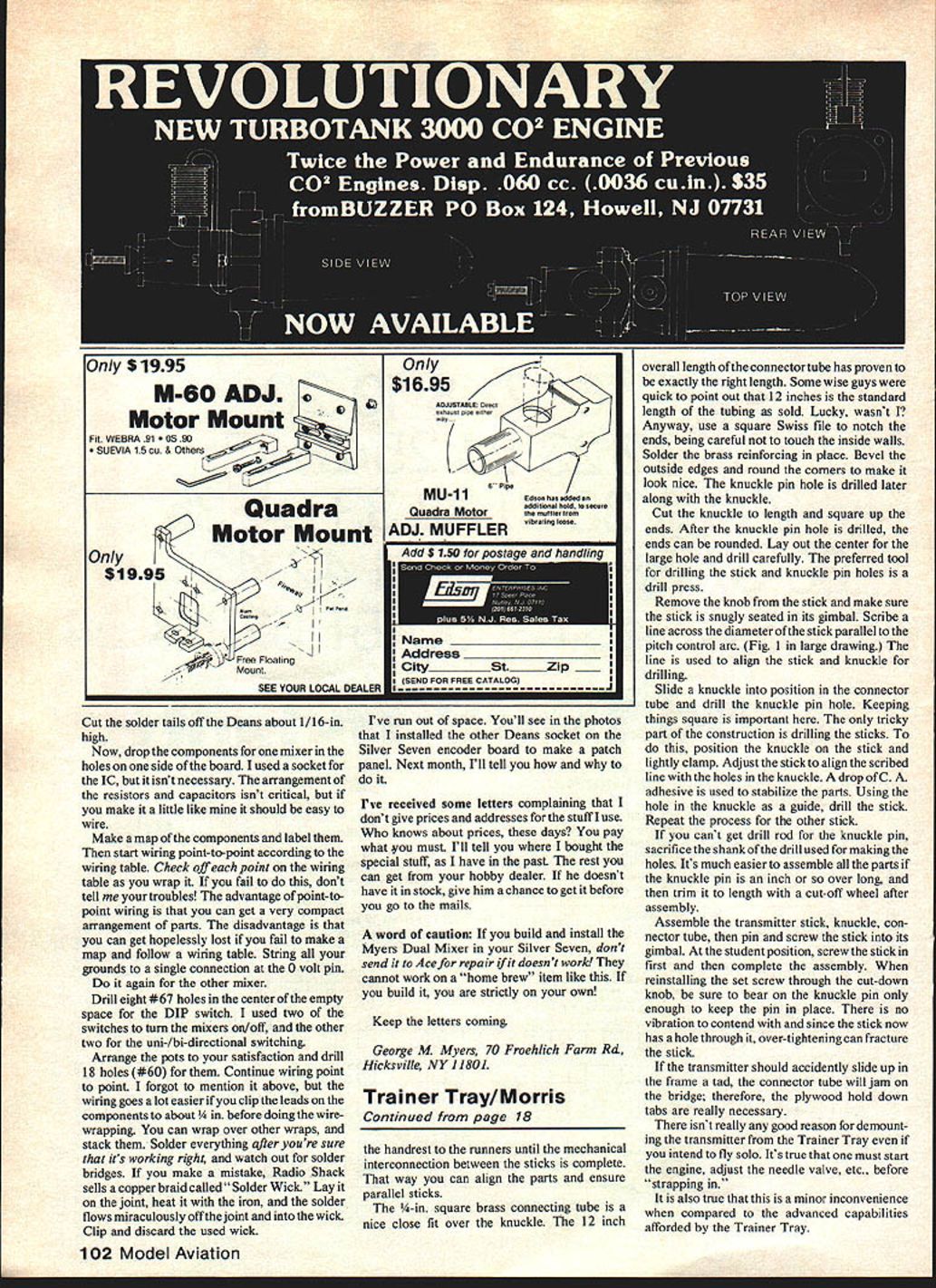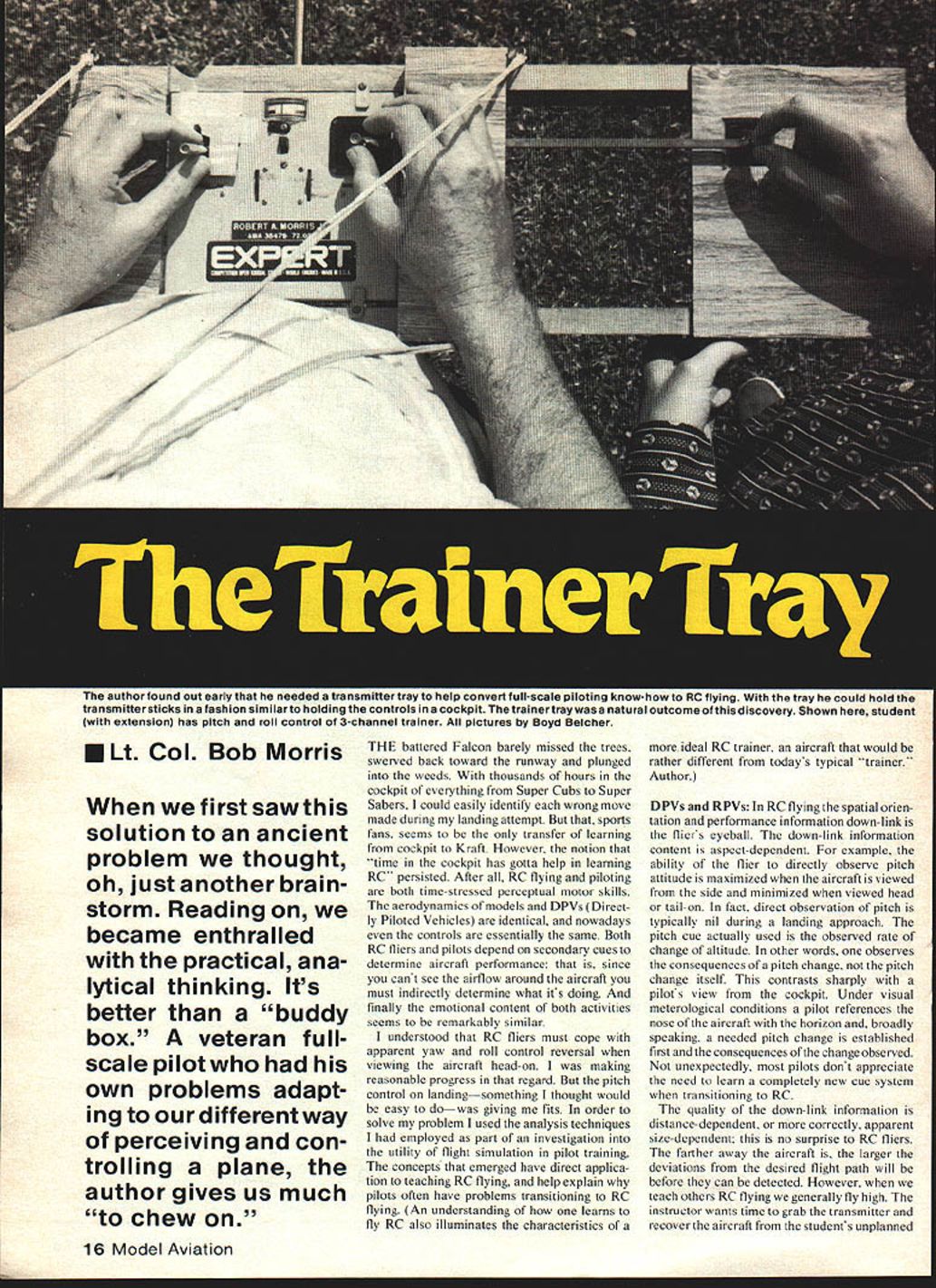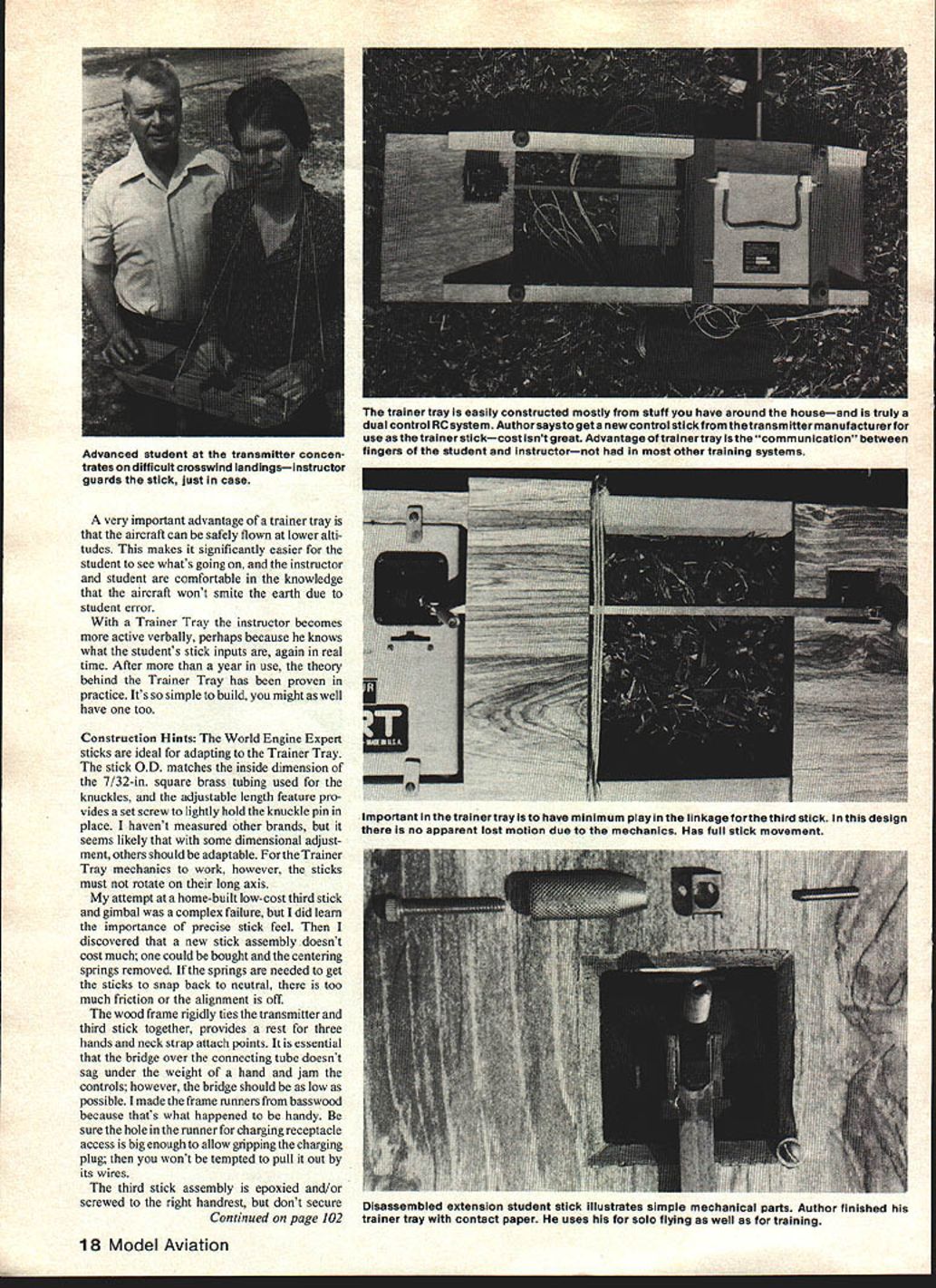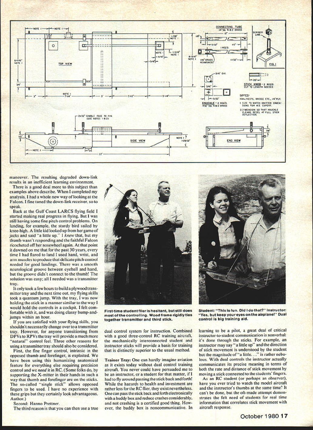 I neeusnuriounu ouseariysnasne neeueo asranamisseriraytoneip aie ting KflOwflOWtO ilying ithetrayhecould holdthe tranamittersticks fashion similarto holding controls cockpit i nexrainertraywas natural outcomeof thisdiscovery Shown student extension has pitch roll control 3-channel trainer pictures Boyd Belcher ELt Col Bob Morris first saw solution ancient problem thought oh just another brain storm Reading became enthralled practical ana lytical thinking Its better buddy box veteran fullscale pilotwho own problems adapt ing ourdifferentway perceiving con trolling plane author gives us much chew THE battered Falcon barely missed trees swerved back toward runway plunged weeds thousands hours cockpit everything Super Cubs Super Sabers could easily identify wrong move made during landing attempt sports fans seems transfer learning cockpit Kraft However notion time cockpit has gotta help learning RC persisted After RC flying piloting both time-stressed perceptual motor skills aerodynamics models DPVs Direct ly Piloted Vehicles identical nowadays controls essentially same Both RC fliers pilots depend secondary cues determine aircraft performance since cant see airflow around aircraft must indirectly determine what its doing finally emotional content both activities seems remarkably similar understood RC fliers must cope apparent yaw roll control reversal viewing aircraft head-on making reasonable progress regard pitch control landingsomething thought would easy dowas giving fits order solve problem used analysis techniques employed part investigation utility flight simulation pilot training concepts emerged have direct applica tion teaching RC flying help explain pilots often have problems transitioning RC flying An understanding learns fly RC also illuminates characteristics ideal RC trainer aircraft would rather different todays typical trainer Author DPVs RPVs RC flying spatial orien tation performance information down-link fliers eyeball down-link information content aspect-dependent example ability flier directly observe pitch attitude maximized aircraft viewed side minimized viewed head tail-on fact direct observation pitch typically nil during landing approach pitch cue actually used observed rate change altitude other words observes consequences pitch change pitch change itself contrasts sharply pilots view cockpit Under visual meterological conditions pilot references nose aircraft horizon broadly speaking needed pitch change established first consequences change observed unexpectedly pilots dont appreciate need learn completely new cue system transitioning RC quality down-link information distance-dependent correctly apparent size-dependent no surprise RC fliers farther away aircraft larger deviations desired flight path will before can detected However teach others RC flying generally fly high instructor wants time grab transmitter recover aircraft students unplanned 16 Model Aviation NOTE I0 TOP VIEW NOTE T K NOTE 0 NO CONNECTING TUBE O4DA KS C BRASS 10 173 L.- 523202 iH j~523o__ KNUCKLE 2 READ 7032 SO 00 S BRASS DITTO GIMALE FACE TO PIN NOTES 102 U NOTE SIDE VIEW1-29252 -0 FIG STICK KNOB 2 READ COT SO LENATR NEEDED NOTED 0106 OESTS BRIODE ETC ITAPLO SIZE TO MATCO OMITTER DIMEN 51005 FOR WE COPERT 2TIUENSION SO THAT KNUCKLE CLEARS BEZEL AT FULL STICK SE FL E C 0 ION 728 -F OVIEW maneuver resulting degraded down-link results inefficient learning environment good deal subject examples above describe completed analysis whole new way looking Falcon fine tuned down-link receiver speak Back Gulf Coast LARCS flying field started making real progress flying still having some fine pitch control problems landing example sturdy bird sailed knee-high little kid looked up game jacks said little up knew thumb wasnt responding faithful Falcon ricocheted off nosewheel again point dawned past 30 years time flared land used hand wrist arm muscles produce delicate pitch control needed good landings smooth neurological groove between eyeball hand groove didnt connect thumb solution easy needed transmitter tray took few hours build plywood trans mitter tray next time out flying skills took quantum jump tray now holding stick manner similar way would hold controls cockpit felt com fortable doing classy bump-andjumps within hour satisfied flying skills shouldnt necessarily change over transmitter tray However anyone transitioning DPVs RPVs tray will provide much natural control feel Three other reasons using transmitter tray should also considered First fine finger control intrinsic opposed thumb forefinger exploited have using humanizing anatomical feature everything else requiring precision control need RC Some folks supporting X-mitter hands such way thumb forefinger sticks so-called "single stick allows opposed fingers used have no experience grips certainly look advantageous Author Second Hanno Prettner third reason can use true dual control system instruction Combined good three-control RC training aircraft mechanically interconnected student instructor sticks will provide basis training distinctly superior usual method Trainer Tray can hardly imagine aviation exists today dual control training aircraft never could have persuaded instructor student matter fly around passing stick back forth hazards health investment rather less RC flier exist nevertheless can pass stick back forth electronically buddy box reduce crashes considerably crashing certified good thing ever buddy box noncommunicative learning pilot great deal critical instructor-to-student communication nonverbal its done through sticks example instructor may say little up direction stick movement understood student magnitude ofa little ther nebu lous dual controls instructor actually communicates its precise meaning terms both rate distance stick movement moving stick connected students fingers As RC student perhaps observer have ever tried watch model aircraft instructors thumbs same time cant done oft-made attempt demon strates felt ne