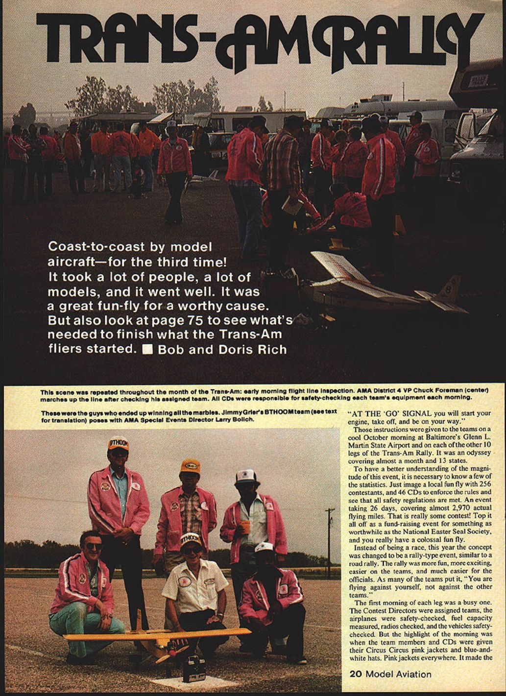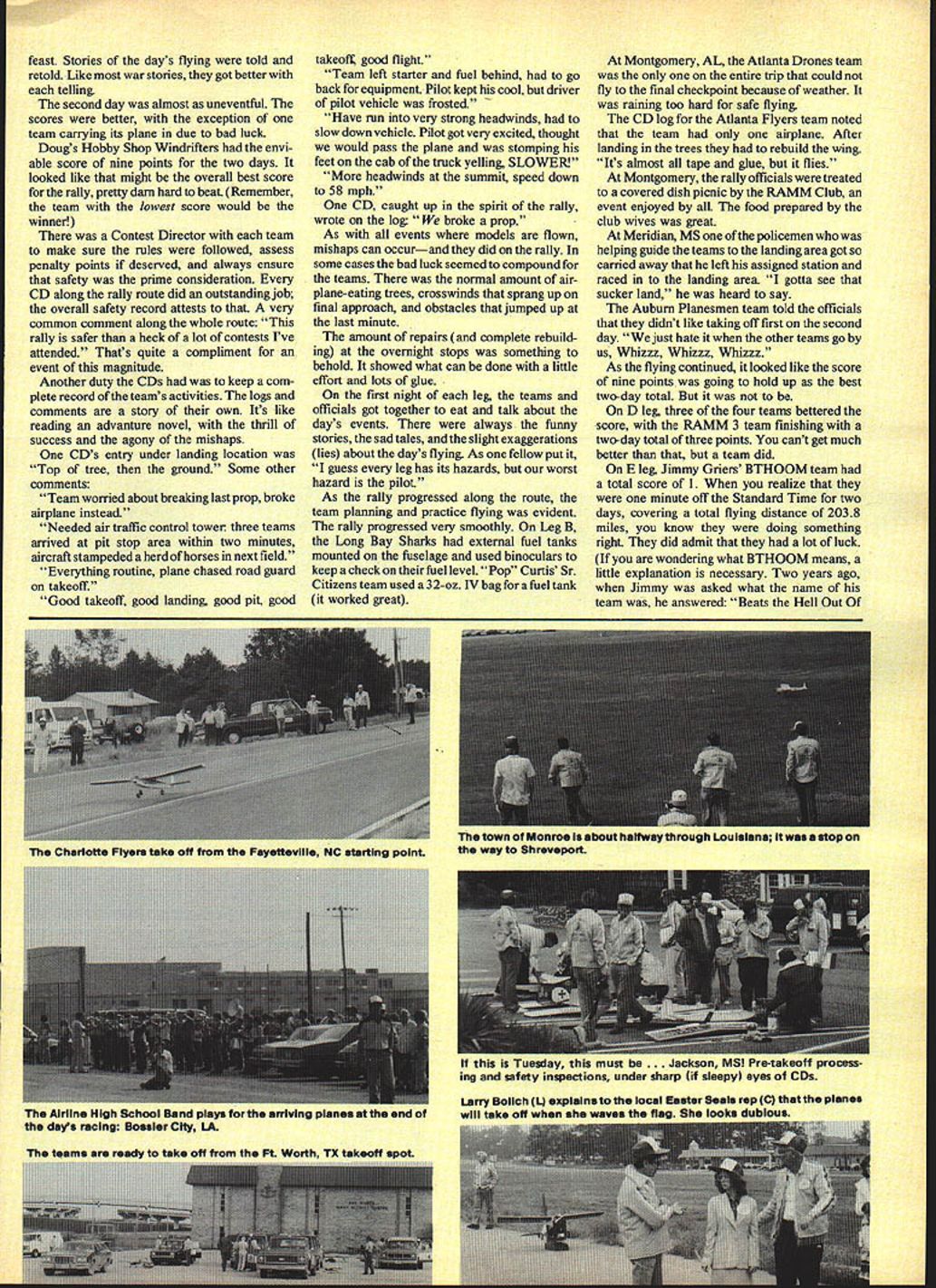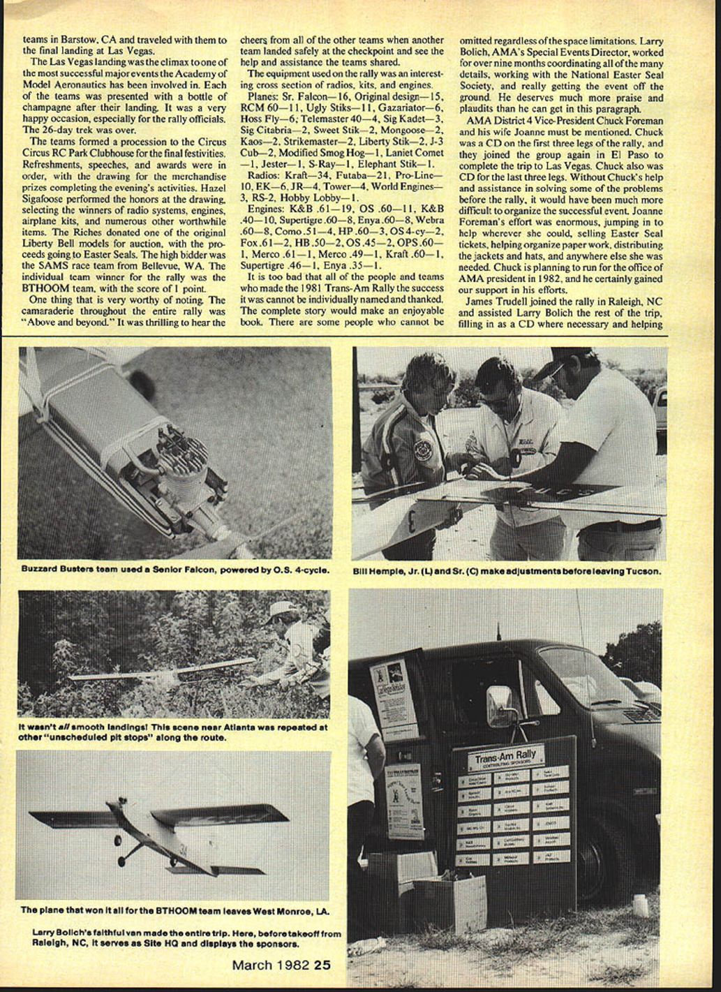 AT THE GO SIGNAL will start engine take off way instructions given teams cool October morning Baltimores Glenn L Martin State Airport other 10 legs Trans-Am Rally odyssey covering almost month 13 states have better understanding magni tude event necessary know few statistics Just image local fun fly 256 contestants 46 CDs enforce rules see safety regulations met An event taking 26 days covering almost 2970 actual flying miles really some contest Top off fund-raising event something worthwhile National Easter Seal Society really have colossal fun fly Instead being race year concept changed rally-type event similar road rally rally fun exciting easier teams much easier officials As teams put flying against yourself against other teams first morning leg busy Contest Directors assigned teams airplanes safety-checked fuel capacity measured radios checked vehicles safetychecked highlight morning team members CDs given Circus Circus pink jackets blue-andwhite hats Pink jackets everywhere made 20 Model Aviation scene repeated throughout month Trans-Am early morning flight line inspection AMA District 4 VP Chuck Foreman center marches up line after checking assigned teem CD responsible safety-checking teams equipment morning guys ended up winning eli marbles Jimmy Oriers UTHOOM team see text transiation poses AMA Special Events Director Lany Bolich Photos authors RaeI Trudell Circus Circus rally members very identifiable very definite help officials thanks Bill Bennett Mel Larson Circus Circus Casinos support morning briefing teams also given route instructions da actual route flown locations mandatory refueling stops areas airplanes carried safety reasons necessary teams also given average mile-perhour figure maintained days takeoff point final landing area arrive exactly time actual mileage predetermined time arrival disclosed teams until days flying completed actual mileage previously measured accurately possible predetermined Standard Time computed using realistic safe driving speed allowing time pit stops refueling minor repairs teams navigator task keeping team time slowing down making up lost time necessary enviable job make things just little interesting penalty points given arriving Standard Time point per minute over Standard Time two-point penalty minute team early Other penalty points also imposed teams mostly safety reasons penalties out-of-fuel deadstick landing Power-on landings safer dead-stick ones initial takeoff point Glenn L Martin airport selected coincide FAAs Safety Seminar Saturday October 3rd Sunday 4th An AMA show team put flying demonstration under very adverse wind conditions Saturday making everyone little apprehensive Sundays weather almost ideal bringing hope good omen rest Trans-Am Rally was single day teams didnt fly scheduled Quite amazing considering time distance covered As takeoff times drew close could feel tension grow everyone trying look calm collected though four teams first leg rally previous Trans-Am Race still feel ing excitement nervousness crowd well-wishers included National Easter Seal Society officials poster child officials AMA HQ including John Worth AMA President John Grigg FAA dignitaries takeotts went scheduled looked like great start waswith minor boo-boo Capitol City Castor Oilers last team take off misread instructions turned wrong way out airport Now wasnt too bad four cars rally officials AMA officials well-wishers followed Con fusion reigned until everyone hack right track first days flying great no major mishaps Everyone arrived Richmond VA landing area safe sound though Team Three little late top off very successful day everyone invited AMA District 4 VP Chuck Foremans house Joanne Foreman prepared March 198221 TEAM SCORES LEG TeamA BC0EFGHIJK 117 38209020775612929 2532451352171105417 3173 7834714613241918 4 937315375818 51101563797 62168157 767 841 Bob Rich briefs teams Ontario CA takeoff area briefings established rally speed located mandatory pft stops end leg winners awaraea plaques nere miss sn Bemadino congratulates ftC Speclaitica Team RiversIde CA FlyIng Griffins Team Georgia poses Montgomery AL stop EUBUm LUgULug M W5flflWiU IJJUU UOEIGfl Esater Seals Poster Child Easter Seals reps look Wood manaing nema mesquite IAbridge RC Club Tesm readies SenIor Falcon takeoff Buzzard Busters afiattlreln Fort Worth Takeoff wassoheduiedGeorge Reis Sun Valley Fliers gets Go signal Bev Wis En OV started fixlna AS7 took off g07nawdci nn thair wnv fram tha Tusnn tnl,snff nnint John Grlgg AMA President Chuck Foreman Dlstflct4 VP show Nonflem Virginia NaaIo control ciunteam posesassne intaleugn NI model AMA Headquarters Building end-of-the-nIly party landing site No didnt fly big plane Raiiyt feast Stories days flying told retold Like war stories got better telling second day almost uneventful scores better exception team carrying its plane due bad luck Dougs Hobby Shop Windrifters envi able score nine points two days looked like might overall best score rally pretty darn hard beat Remember team lowest score would winner Contest Director team make sure rules followed assess penalty points deserved always ensure safety prime consideration CD along rally route did outstanding job overall safety record attests very common comment along whole route rally safer heck lot contests Ive attended Thats quite compliment event magnitude Another duty CDs keep com plete record teams activities logs comments story own Its like reading advanture novel thrill success agony mishaps CDs entry under landing location Top tree ground Some other comments Team worried about breaking last prop broke airplane instead Needed air traffic control tower three teams arrived pit stop area within two minutes aircraft stampeded herd horses next field Everything routine plane chased road guard takeoff Good takeoff good landing good pit good takeoft good flight Team left starter fuel behind go back equipment Pilot kept cool driver pilot vehicle frosted Have run very strong headwin