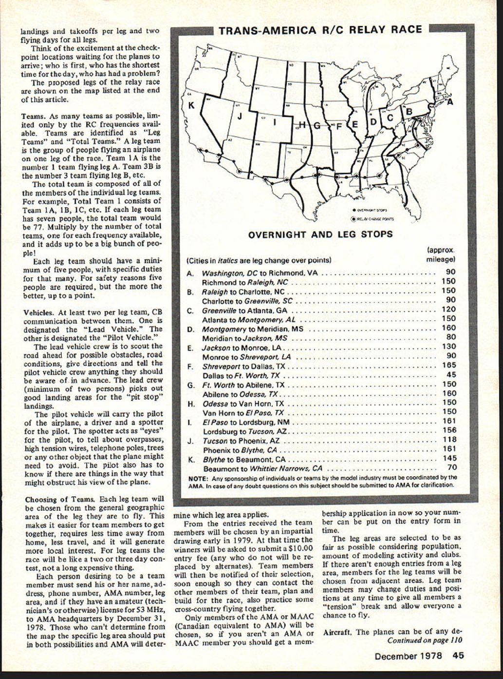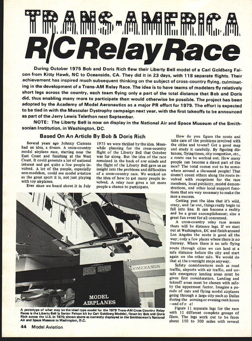 T R C RelayRace During October 1975 Bob Doris Rich flew Liberty Bell model Carl Goldberg Fal con Kitty Hawk NC Oceanside CA did 23 days 118 separate flights achievement has inspired much subsequent thinking subject cross-country flying culminat ing development Trans-AM Relay Race idea have teams modelers fly relatively short legs across country team flying part total distance Bob Doris did thus enabling participate would otherwise possible project has adopted Academy Model Aeronautics major PR effort 1979 effort expected tied Muscular Dystrophy campaign next year first takeoffs announced part Jerry Lewis Telethon next September NOTE The Liberty Bell now display National Air Space Museum Smith sonian Institution Washington DC Based An Article Bob & Doris Rich Several years ago Johnny Clemens idea dream cross-country model airplane race starting near East Coast finishing West Coast could generate lot national interest get quite few people volved lot people especially non-modelers could see model aviation great sport just playing toy airplanes Ever since heard about July 1975 thrilled idea Mean planning cross-country flight Liberty Bell October far along idea race remained back minds flight Liberty Bell gave us insight problems difficulties cross-country race worked idea get people volved relay race gives lot people chance participate figure route take care problems involved cities towns Get good map study carefully figuring dis tances flying times city congestion etc route can worked out people can become direct part race total comes out some around thousand people doesnt count others along route volved receptions race members local publicity model demon strations other local support func tions very necessary make race success Getting past idea its wild crazy far out things really begin fail line can become reality great accomplishment also great fun event concerned cross-country relay race means will distance legs start out Washington DC finish around Los Angeles route good way few places no freeway no safe flying route through cities can land safe distance before city start again other side would overnight stops anyway Safety considerations such road traffic airports air traffic un safe emergency landing areas must given first consideration Landing takeoff areas must chosen safe ty uppermost factor Imagine pa rade cars flying model airplanes going through large city such Dallas during norning evening rush hours end ofr e Figure 11 separate legs race 11 different complete groups fliers legs work out about 150 300 miles several 44 Model Aviation prototype what may ideal type model 1979 Tram-AM cros Country Relay Races Liberty Bell Senior Falcon kit Carl Goldberg Models flown Bob Doris Rich acroes US 1975 shown above currently displayed Smithsonians National Air Space Museum Washington DC landings takeoffs per leg two flying days legs Think excitement check point locations waiting planes arrive first has shortest time day has problem proposed legs relay race shown map listed end article Teams As teams possible lim ited RC frequencies avail able Teams identified Leg Teams Total Teams leg team group people flying airplane leg race Team lA number 1 team flying leg Team 3B number 3 team flying leg B etc total team composed of members individual leg teams example Total Team consists Team lA iB lC etc leg team has seven people total team would 77 Multiply number total teams frequency available adds up big bunch peo ple leg team should have mini mum five people specific duties safety reasons five people required the better up point Vehicles least two per leg team CB communication between designated Lead Vehicle other designated Pilot Vehicle lead vehicle crew scout road ahead possible obstacles road conditions give directions tell pilot vehicle crew anything should aware advance lead crew minimum two persons picks out good landing areas pit stop landings pilot vehicle will carry pilot airplane driver spotter pilot spotter acts eyes~ pilot tell about overpasses high tension wires telephone poles trees other object plane might need avoid pilot also has know things way might obstruct view plane Choosing Teams leg team will chosen general geographic area leg fly makes easier team members get together requires less time away home less travel will generate local interest leg teams race will like two three day con test long expensive thing person desiring team member must send name ad dress phone number AMA number leg area have amateur tech nicians otherwise license 53 MHz AMA headquarters December 31 1978 cant determine map specific leg area should put both possibilities AMA will deterTRANS-AMERICA R/C RELAY RACE OVERNIGHT STOPS CHANGE PONTS OVERNIGHT AND LEG STOPS approx mileage Cities italics leg change over points A Washington DC Richmond VA Richmond Raleigh NC B Raleigh Charlotte NC Charlotte Greenville SC C Greenville Atlanta GA Atlanta Montgomery AL D Montgomery Meridian MS Meridian Jackson MS E Jackson Monroe LA Monroe Shreveport LA F Shreveport Dallas TX Dallas Ft Worth TX G Ft Worth Abilene TX Abilene Odessa TX H OdessatoVanHornTX Van Horn El Paso TX El Paso Lordsburg NM 90 150 150 90 120 150 160 80 130 90 165 45 150 160 150 . I. 161 Lordsburg Tucson AZ1 56 JTucson Phoenix AZ118 Phoenix Blythe CA161 KBlythe Beaumont CA145 Beaumont Whittier Narrows CA70 NOTE Any sponsorship individuals teams model industry must coordinated AMA case doubt questions subject should submitted AMA clarification leg area applies entries received team members will chosen impartial drawing early 1979 time winners will asked submit $1000 entry fee will re placed alternates Team members will notified selection soon enough can contact other members team plan build race also practice some cross-country flying together Only members AMA MAAC Canadian equivalent AMA will chosen arent AMA MAAC member should get mem bership application now num ber can put entry form time leg areas selected fair possible considering population am