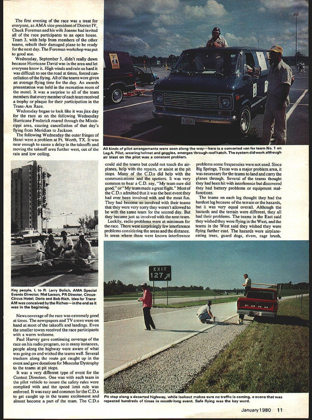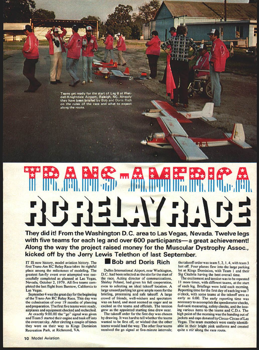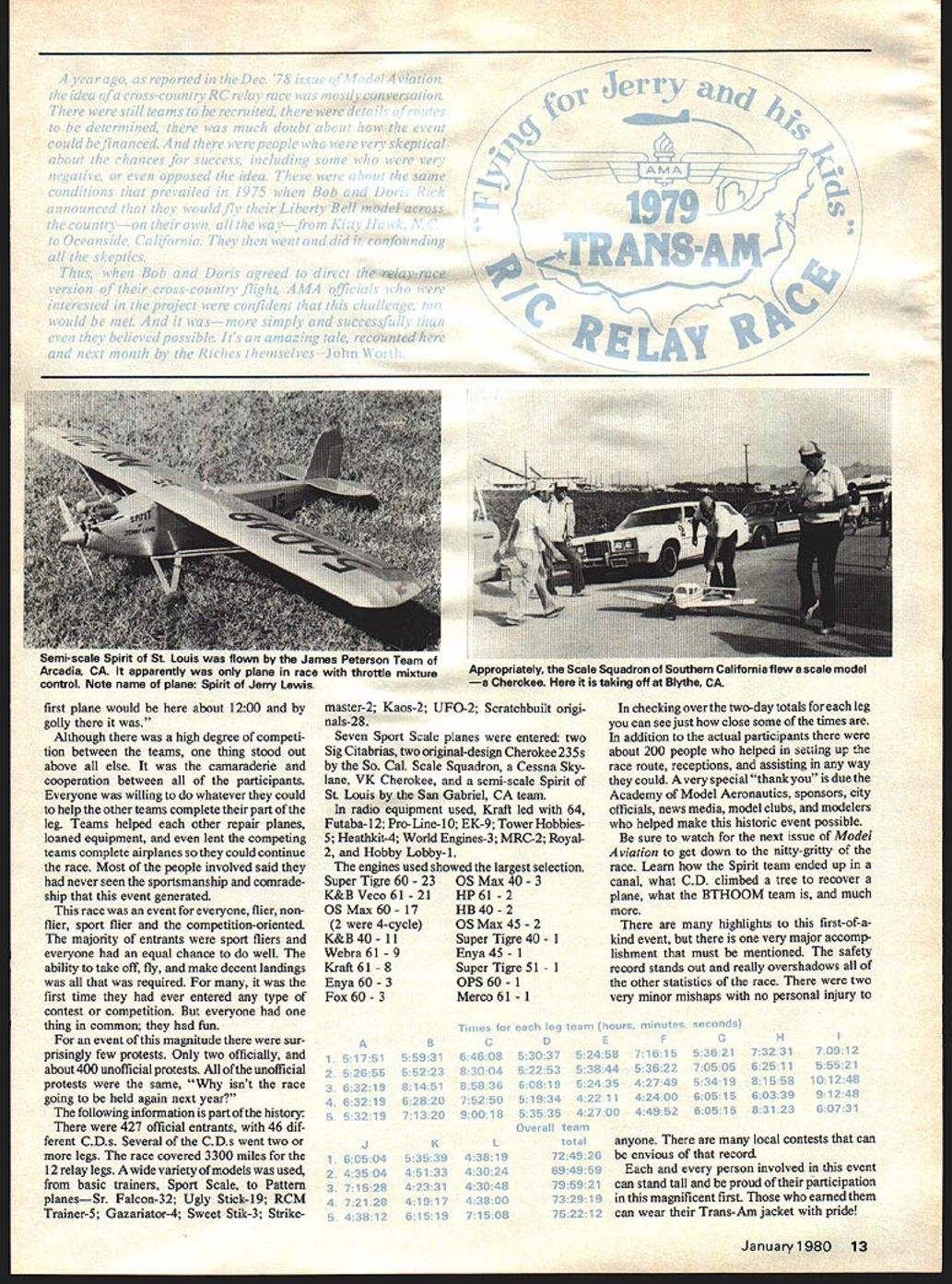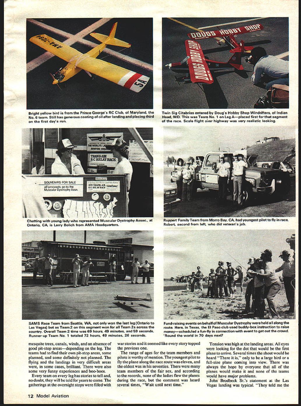 /FhIFZb -b JitflJJJKLh did Washington DC area Las Vegas Nevada Twelve legs five teams leg over 600 participantsa great achievement Along way project raised money Muscular Dystrophy Assoc kicked off Jerry Lewis Telethon last September IT IS now history model aviation history first Trans-Am RC Relay Race takes its rightful place among milestones modeling greatest fun-fly event ever attempted suc cessfully completed planned Las Vegas Nevada October 2 1979 five teams com pleted last flight Barstow California Las Vegas September 4 great day beginning Trans-Am RC Relay Race day culmination over 19 months planning preparation first five teams ready airplanes equipment checked rechecked exactly 90000 go signal given TeamS started engine took off overcast sky After circling couple times way Kings Dominion Recreation Park Richmond VA Bob Doris Rich Dulles International Airport near Washington DC selected site start race Acting director communications Shirley Poland given full cooperation selecting ideal takeoff location large unused parking lot gave ample room briefing processing safe takeoff large crowd friends well-wishers spectators hand seemed eager excited teams officials tension grew appointed starting time drew near takeoff order first day chosen drawing hard tell whether teams wanted first off wished other teams would lead way other four teams received go signal five-minute intervals takeoff order team 5 2 14 team 3 last off Four planes flew large parking lot Kings Dominion Team 1 Sig Citabria having best overall time excitement tension repeated 11 times different teams start leg Briefings held morning Reporting time first day leg 7 oclock some teams takeoff area early 600 early reporting time necessary accomplish speedometer checks fuel-tank measuring safety checks issu ing various items teams CDs high point morning handing out jackets caps donated Circus-Circus Las Vegas team members easily identifi able bright pink uniforms created quite stir along race route 10 Model Aviation first evening race treat everyone AMA vice president District IV Chuck Foreman wife Joanne invited race participants open house Team 3 help members other teams rebuilt damaged plane ready next day Foreman workshop put good use Wednesday September 5 didnt really dawn because Hurricane David area let everyone know High winds rain hard difficult see road times forced can cellation flying teams given average flying time day An awards presentation held recreation room motel surprise team members member team received trophy plaque participation Trans-Am Race Wednesday began look like jinx day race following Wednesday Hurricane Frederick roared through Missis sippi area causing cancellation days flying Meridian Jackson following Wednesday outer fringes Henri problem Ft Worth TX near enough cause delay takeoffs moving takeoff area further west out rain low ceiling News coverage race extremely good times newspapers TV crews hand takeoffs landings smaller towns received race participants warm welcome Paul Harvey gave continuing coverage race radio program instances people along highway aware what going wished teams well Several truckers along route got caught up event gave donations Muscular Dystrophy teams pit stops very different type event Contest Directors team pilot vehicle insure safety rules complied speed limit rule enforced easy common CDs get caught up teams excitement almost become part team CDs could aid teams could touch air planes help repairs assist pit stops CDs did help communications spotters very common hear CD say team sure did good team made great flight Most CDs admitted best event ever involved fun become involved teams very sorry werent allowed same team second day became just involved next team Luckily radio problems minimum race surprisingly few interference problems considering areas distance areas known interference problems some frequencies used Since Big Springs Texas major problem area necessary teams land carry planes through Several teams thought hit interference discovered battery problems equipment mal functions teams leg thought hardest leg because terrain hazards very equal overall Although hazards terrain different problems teams East said wished flying West teams West said wished flying further east hazards airplaneeating trees guard dogs rivers sage brush January1980 11 Ru Kinds OT piuot arrangements seen aiong waynere us converteo van tar team No Ofl Leg Pilot wearing helmet goggles emerges through roof hatch system did work although air blast pilot constant problem Key people L R Larry Bolich AMA Special Events Director Mel Larson PR Director CircusCircus Hotel Doris Bob Rich Idea Trans AM conceived bythe Richesin end beginning v-Il iup among ueaerrea nighway wnuie iooiwut maKes sure no traffic coming scene repeated hundreds times month-long event Safe flying key word ii ting young lady represented Muscular Dystrophy Assoc. Ontario CA Larry Bolich AMA Headquarters SAMS Race Team Seattle WA won last leg Ontario Las Vegas Teem 2 segment won Team 2s across country Overall Team 2 time 69 hours 49 minutes 59 seconds Runner-up Team No 1 totaled 72 hours 49 minutes 26 seconds Huppert 1-amily eam trom iviorro nay LR naa youngesi plum io iii rrnu Robert second left did veterans job Fund-raising events behalf Muscular Dystrophy held along route Texas El Paso club used buddy-box instruction raise moneyscheduled fun-fly connection event get out crowd Round world 70 days next mesquite trees canals winds absence good pit-stop areasdepending leg teams find own pit-stop areas some planned some definitely planned flying landings very difficult areas some cases brilliant also some very funny experiences boo-boos team leg has stories tell no doubt will told years come gatherings overnight stops filled war stories seemed like story topped previous range ages team members pilots worthy mention youngest pilot fly plane along race route eleven oldest seventies team members falr sex according records ladie