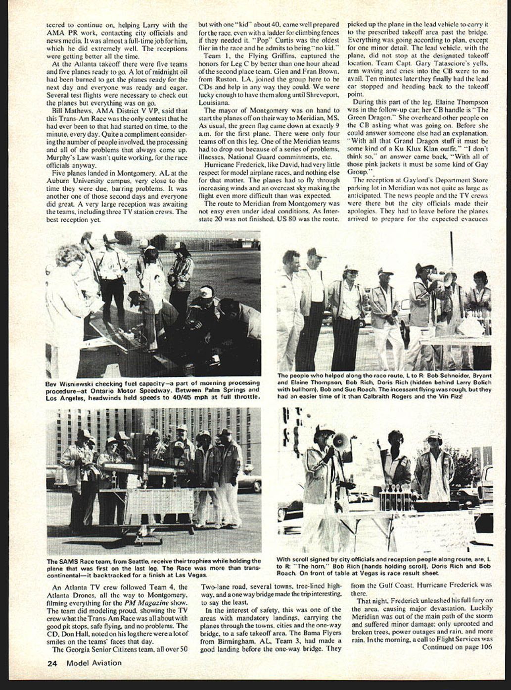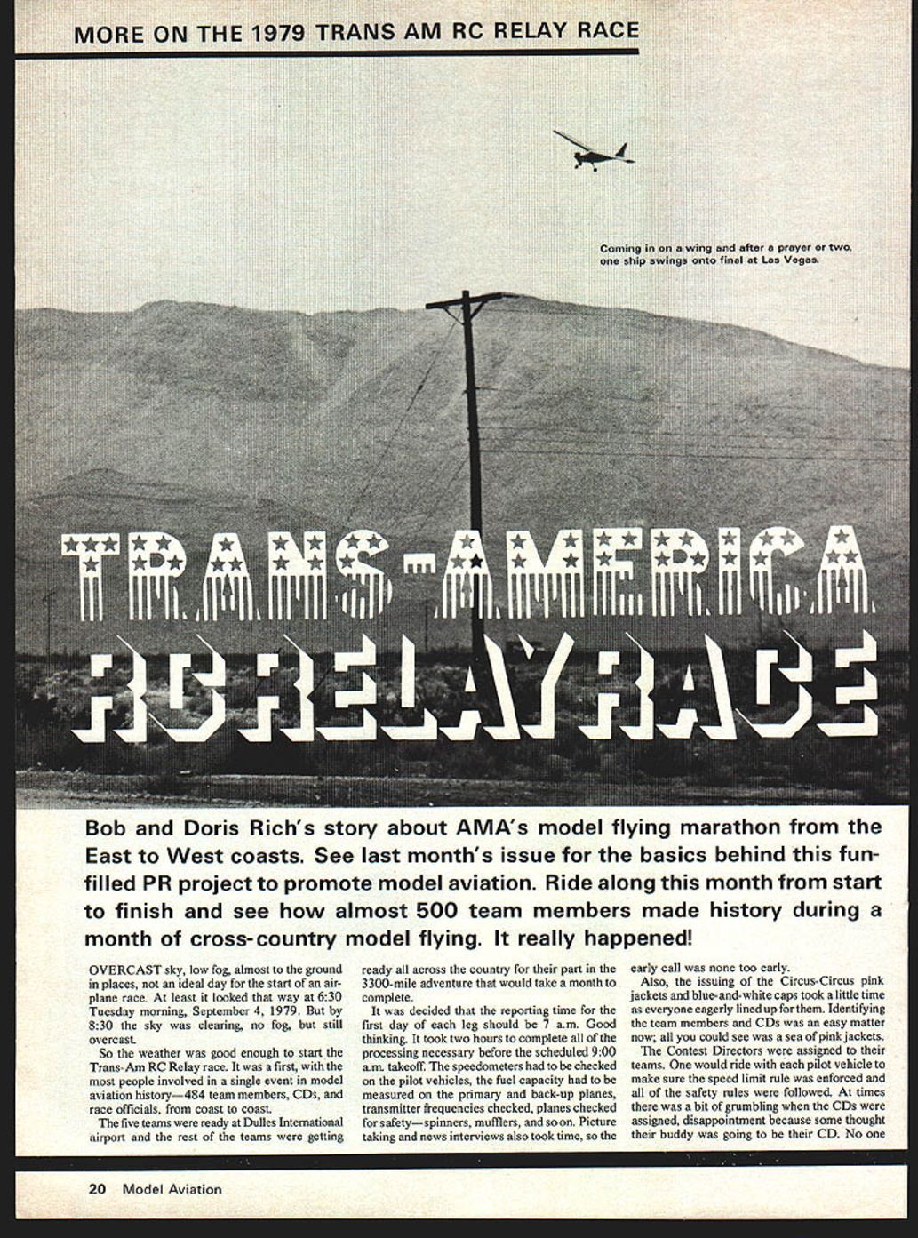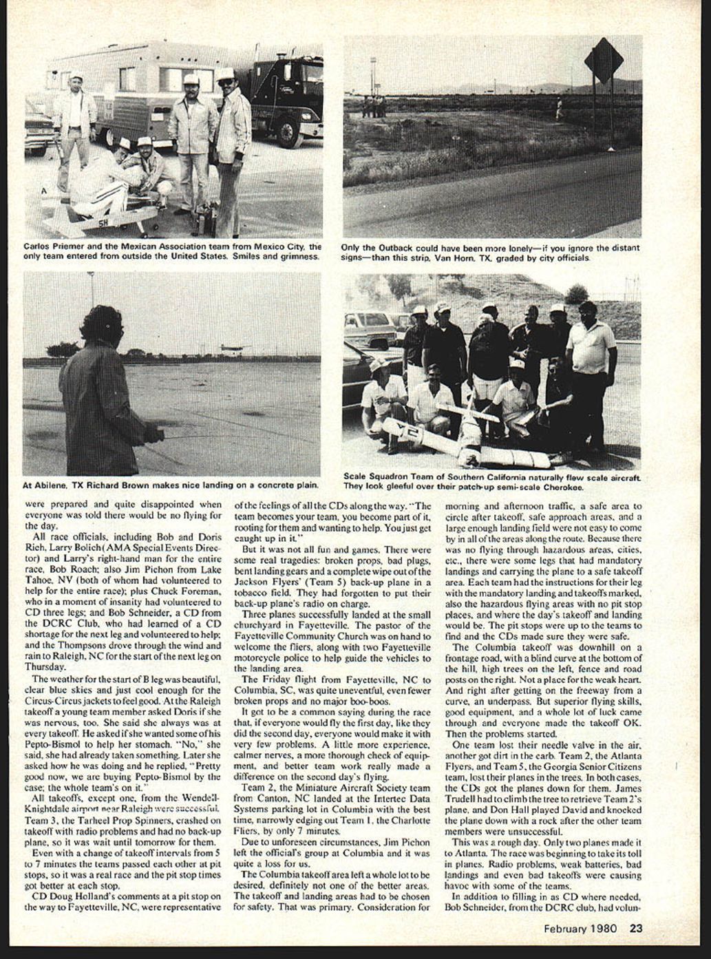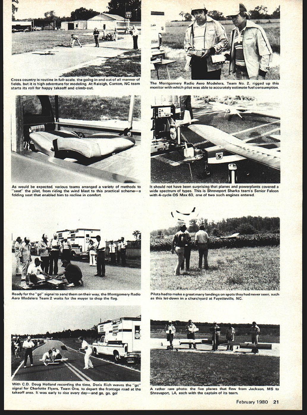 Bob Doris Richs story about AMAs model flying marathon East West coasts See last months issue basics behind funfilled PR project promote model aviation Ride along month start finish see almost 500 team members made history during month cross-country model flying really happened OVERCAST sky low fog almost ground places ideal day start air plane race least looked way 630 Tuesday morning September 4 1979 830 sky clearing no fog still overcast So weather good enough start Trans-Am RC Relay race first people involved single event model aviation history484 team members CDs race officials coast coast five teams ready Dulles Intemational airport rest teams getting ready across country part 3300-mile adventure would take month complete decided reporting time first day leg should 7 am Good thinking took two hours complete processing necessary before scheduled 900 ant takeoff speedometers checked pilot vehicles fuel capacity measured primary back-up planes transmitter frequencies checked planes checked safetyspinners mufflers soon Picture taking news interviews also took time early call too early Also issuing Circus-Circus pink jackets blue-and-white caps took little time everyone eagerly lined up Identifying team members CDs easy matter now could see sea pink jackets Contest Directors assigned teams would ride pilot vehicle make sure speed limit rule enforced safety rules followed times bit grumbling CDs assigned disappointment because some thought buddy going CD No 20 Model Aviation February 1980 21 Cross country routine fuii-scaie going ana oui OT aii manner ui fields high adventure modeling Raleigh Canton NC team starts its roll happy takeoff climb out Montgomery Radio Aero Modelers Team No 2 rigged up monitor pilot able accurately estimate fuel consumption As would expected various teams arranged veriety 0 methods seatr pilot riding wind blast practical schemea folding seat enabled him recline comfort should have surprising planes powerplants covered wide spectrum types Shreveport Sharks teams Senior Falcon 4-cycle OS Max 60 two such engines entered y go signal send way Montgomery Radio Aero Modelers Team 2 waits mayor drop flag Plots make great landings spots never seen such let-down churchyard Fayetteville NC CD Doug Holland recording time Doris Rich waves go signal Charlotte Flyers Team depart frontage road takeoff area early rise dayand go go go n Oil MCI 01 UIIJLMJ LI IC IIVC MOI ICO LI IUL Shreveport LA captain its t6aIn knew what CD going team until just before takeoff time would no buddies could avoided As takeoff time drew near tension rose always did Nerves got little edge especially first day like stepping off unknown No knew just what day would bring Team 5 Prince Georges RC Club Team drawn first off exactly 90000 Go signal given engine started plane checked takeoff roll straight true cheer went up crowd plane lifted off overcast sky crowd well wishing friends spectators news media AMA staff HQ led John Worth Earl Witt Most seemed nervous teams just anxious Dulles runway race route near closed start race air port manager contact tower signaled everything clear Team 5s lead vehicle pilot vehicle left unused parking lot takeoff area plane circling overhead As headed toward Dulles Freeway planes course straight low watchward Stay away full size planes 905 Team 2 DCRC team off way Everything going great just like supposed Team 1 Dougs Hobby Shop Windrifters Indian Head MD trouble aileron servo didnt delay takeoff wasnt until Team 4 Northern Virginia RC Club Team way least started way first problem arose scratch-built original developed fuel feed problems Three attempts head out race route unsuccessful Three dead-sticks luckily no damage meantime Team 3 Woodbridge RC Club Team made successful takeoff way time frame race start Dulles expired Team 4 move next takeoff attempt Wash ington Redskins practice field out airport traffic patterns about four miles away After continuing fuel problems Team 4 decided carry plane landing area Kings Dominion near Richmond VA take hour penalty Discretion better part valor Team 3 didnt fare quite well landing schoolyard didnt quite miss flagpole moved approach path switch back-up airplane before continuing landing area Kings Dominion beauti ful modelers dream least 50 acres paved parking lot easy approach relatively few light poles watch Out four planes landed made beautiful landings first day flying successful everyones point view set pattem rest race Well almost Chuck Foreman AMA VP Dist IV lovely wife Joanne set up mall display race planes Richmond gave Larry Bolich chance set up Byron Originals Pitts Special souvenir sales stop along way beautiful Pitts being raffled off proceeds going Muscular Dystrophy Association Elaine Thompson very ably handled ticket souvenir sales stop until Bryant Thompson leave race group Meridian Mississippi Bryant originally volunteered CD leg Montgomery AL Jackson MS said seemed waste go far just CD leg Elaine joined officials Washington DC go along help way could help very much appreciated After mall display raffle ticket sales over race participants enjoyed open house Foremans Team 3 completely repairing damaged plane help other team members ready second days flying Hurricanes really dont care whether model airplane races go Hurricane David no exception Rain buckets high winds put real damper race day no flying forecast terrible teams except seemed grateful DCRC team came motel recreation room trophies plaques presented said ready fly Complete rain suits goggles visors 22 Model Aviation Monroe LA Holiday Inn ball welcome sign Pima County Fairgrounds Tucson another migrating bird comes home roost far its regular weekend flying site entourage encountereu Arizona Agricultural Inspection Station convoy line opened race vehicles could make swift passage As far know no mentioned tunnels Rather like cow hands letting down after roundup Southern Arizona Modelers team makes happy picture after Tucson landing prepared quite disa