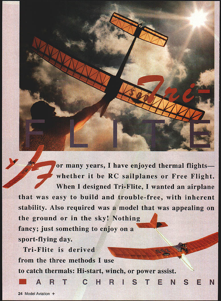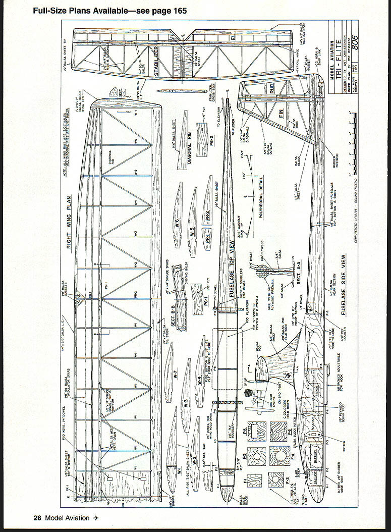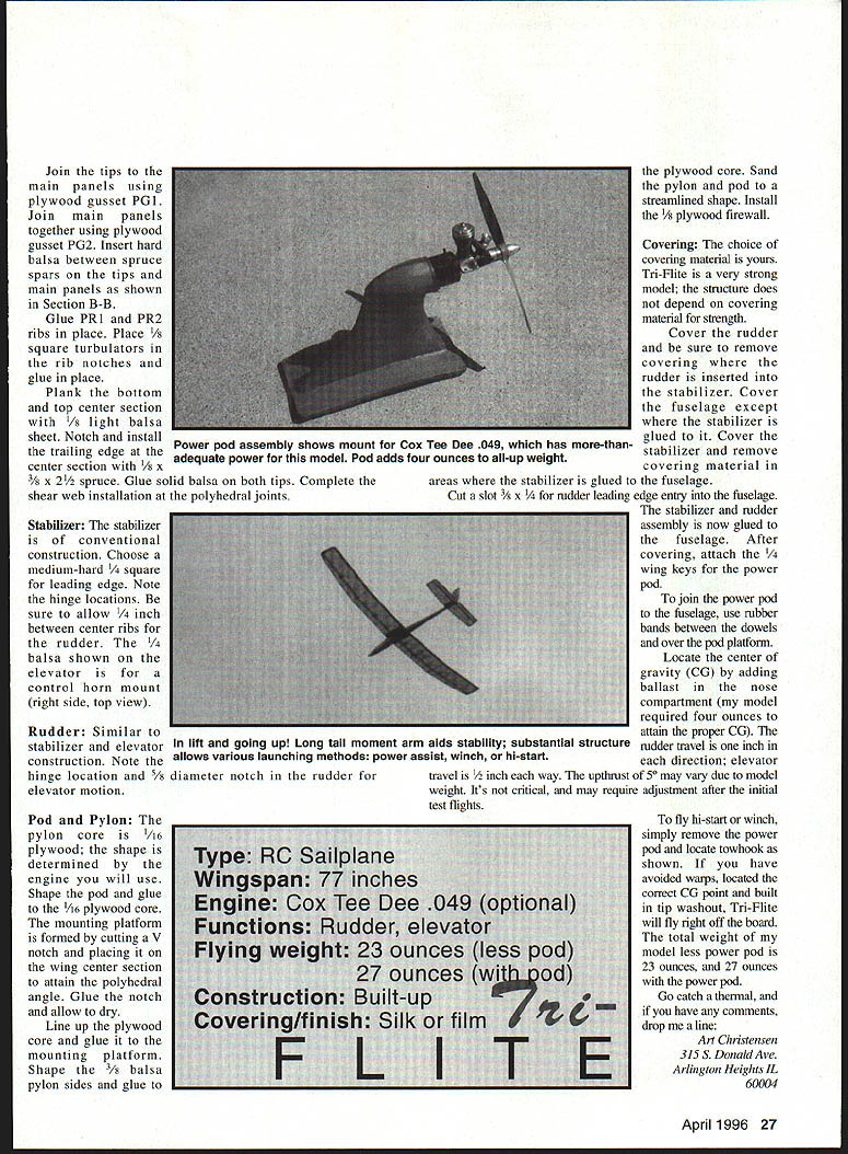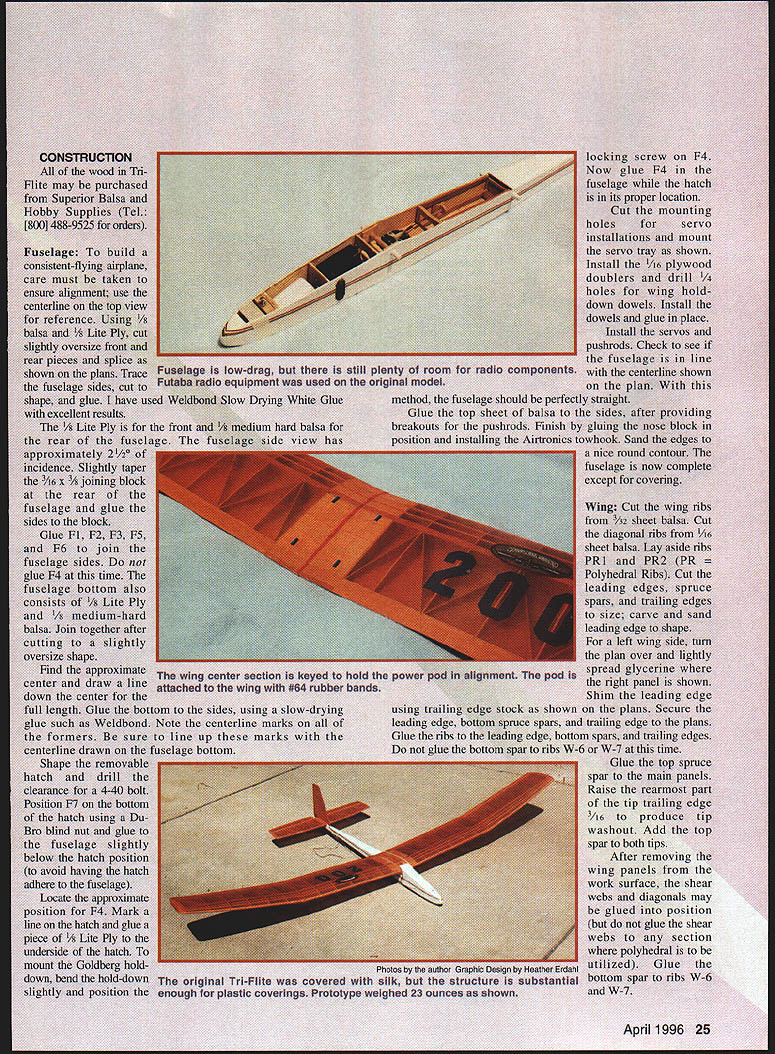 I eRt tied easy build ty Alsowas ou LA ite use N yon r Free ted 24 Model Aviation ST CONSTRUCliON wood Tn Flite may purchased Superior Balsa Hobby Supplies Tel [8001 488-9525 orders Fuselage build consistent-flying airplane care must taken ensure alignment use centerline top view reference Using Vs balsa Ply cut slightly oversize front rear pieces splice shown plans Trace fuselage sides cut FL shape glue have used excellent results Vs Lite Ply front rear fuselage Th approximately 2 1/20 incidence Slightly taper 3A6 x 3/ joining block rear fuselage glue sides block Glue Fl F2 F3 F5 F6 join fuselage sides glue F4 time fuselage bottom also consists /s Lite Ply Vs medium-hard balsa Join together after cutting slightly oversize shape Find approximate center draw line down center full length Glue bottom sides using slow-drying glue such Weldbond Note centerline marks formers sure line up marks centerline drawn fuselage bottom Shape removable hatch drill clearance 4-40 bolt Position F7 bottom hatch using Du Bro blind nut glue fuselage slightly below hatch position avoid having hatch adhere fuselage Locate approximate position F4 Mark line hatch glue piece 1A Lite Ply underside hatch mount Goldberg holddown bend hold-down slightly position locking screw F4 Now glue F4 fuselage hatch its proper location Cut mounting boles servo installations mount servo tray shown Install Y16 plywood doublers drill /4 holes wing holddown dowels Install dowels glue place Install servos pushrods Check see fuselage line centerline shown plan method fuselage should perfectly straight Glue top sheet balsa sides after providing breakouts ~shrods Finish gluing nose block position andthe Airtronics towhook Sand edges nice round contour fuselage now complete except covering Wing Cut wing ribs 3A2 sheet balsa Cut diagonal ribs 1/16 sheet balsa Lay aside ribs PRi PR2 PR Polyhedral Ribs Cut leading edges spruce spars trailing edges size carve sand leading edge shape left wing side turn plan over lightly spread glycerine right panel shown Shim leading edge tnck shown plans Secure ace spars trailing edge plans g edge bottom spars trailing edges sr ribs W-6 W-7 time Glue top spruce spar main panels Raise rearmost part tip trailing edge /16 produce tip washout Add top spar both tips After removing wing panels work surface shear webs diagonals may glued position glue shear webs section polyhedral utilized Glue bottom spar ribs W-6 W-7 April 1996 25 low-drag still plenty room radio components equipment used original model wing center section keyed hold powei attached wing #64 rubber bands Photos author Graphic Design Heather Erdahi original Tri-Flite covered silk structure substantial enough plastic coverings Prototype weighed 23 ounces shown Join tips main panels using plywood gusset PGl Join main panels together using plywood gusset PG2 Insert hard balsa between spruce spars tips main panels shown Section B-B Glue PRi PR2 ribs place Place 1/8 square turbulators rib notches glue place Plank bottom top center section 1/ light balsa sheet Notch install trailing edge center section 1/ x x 2/2 spruce Glue solid balsa both tips Complete shear web installation polyhedral joints Stabilizer The stabilizer conventional construction Choose medium-hard 1/4 square leading edge Note hinge locations sure allow 1/4 inch between center ribs rudder /4 balsa shown elevator control horn mount right side top view Rudder Similar stabilizer elevator construction Note hinge location 5/ elevator motion Pod Pylon pylon core 1/16 plywood shape determined engine will use Shape pod glue 1A6 plywood core mounting platform formed cutting V notch placing wing center section attain polyhedral angle Glue notch allow dry Line up plywood core glue mounting platform Shape 3/ balsa pylon sides glue diameter notch rudder plywood core Sand pylon pod streamlined shape Install 1/ plywood firewall Covering The choice covering material yours Tri-Flite very strong model structure does depend covering material strength Cover rudder sure remove covering rudder inserted stabilizer Cover fuselage except stabilizer glued Cover stabilizer remove covering material areas stabilizer glued fuselage Cut slot 3A x er leading edge entry fuselage stabilizer rudder assembly now glued fuselage After covering attach Y4 wing keys power pod join power pod fuselage use rubber bands between dowels over pod platform Locate center gravity CG adding ballast nose compartment model required four ounces attain proper CC rudder travel inch direction elevator travel 1/2 inch way upthrust 50 may vary due model weight Its critical may require adjustment after initial test flights fly hi-start winch simply remove power pod locate towhook shown have avoided warps located correct CG point built tip washout Tri-Flite will fly right off board total weight model less power pod 23 ounces 27 ounces power pod Go catch thermal have comments drop line Art Christensen 315 S Donald Ave Arlington Heights IL 60004 April 1996 27 Power pod assembly shows mount Cox Tee Dee 049 has more-than adequate power model Pod adds four ounces all-up weight lift going up Long tail moment arm aids stability substantial structure allows various launching methods power assist winch hi-start PR-II/BBALSA SHEET /TOPBB3TYOM tiA /Ir II / POD KEYS I/ADOWELI/B 55 BALSA TIWBSLAOSR SPARS V4x3/BBALSA LE I/A BALSA GUSSETS /1 RIGHT WING PLAN NOTE ALL WING RIBS ARE 3/3D BALSA /1 B B_ -~ VBD I4SFWJELP0 IDIA/AL /BOSALSARIB /EST GRAINSTYONI WRIB-I IWIPR262R3V/-A5*6W7 -- ---------------/7 V5x I/A SPRUCE VAS IBALSA --YE STOCKI/SH 1/A SPRUCE SPARS SECT 9-B W-7 3/B HO BALSA w I____ ALL RIBS 3/52 BALSA SKEETW 3 W 2 SEE TEST -FUSE BOTTOM ID V LITE 32_ 1/4 BOWEL rLPLY FROM NOSE OS HERE INS HOLD DOWN iFP3P4j5JPS P-I II PG-I1/16 PLY 1117 - W-5zi __R2- _ PB LSSi/4 BOWELILK BALSA SHEET IZL~7 1 BALSA BLOCK WINS TIPS v1 I/ASG BALSA I LE STAWLUER CROSS SECT OS ELEVAOSR 1/1K BALSA SHEET DIAGONAL RIB VA PLY PG-2 23/4I/IA H 24 - BALSACENTER OF PLATFORM I/A PLYWOOSPOL