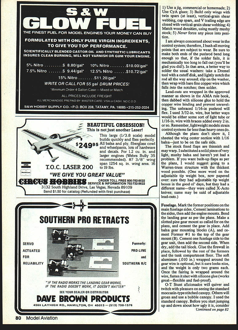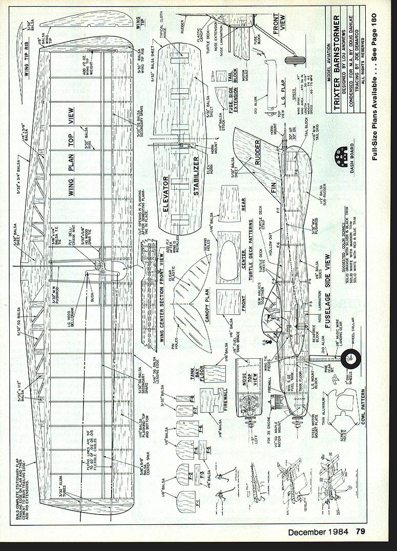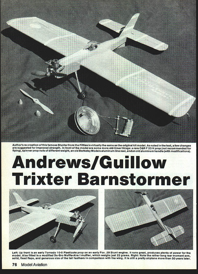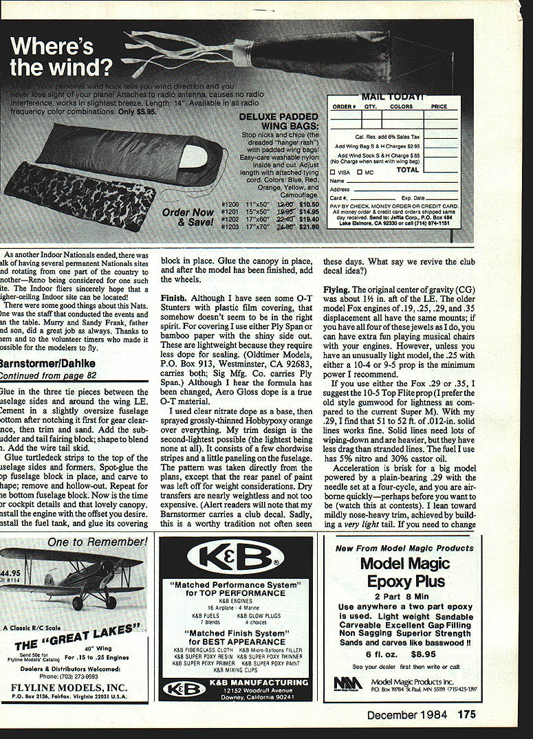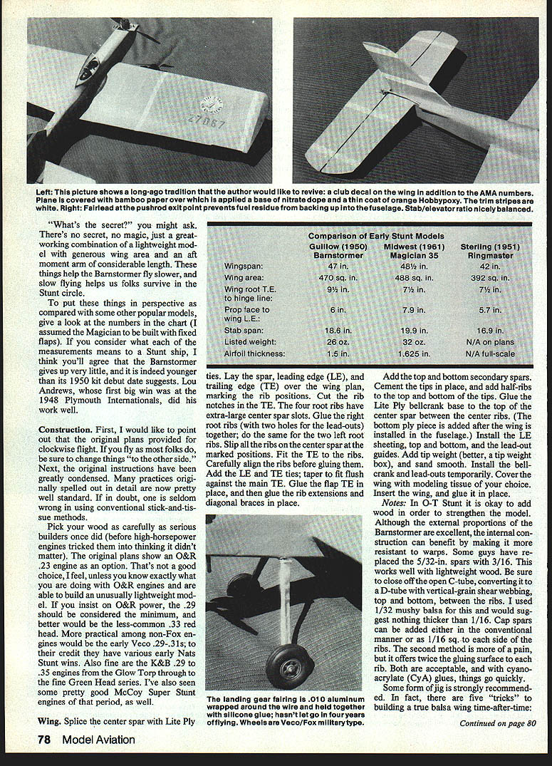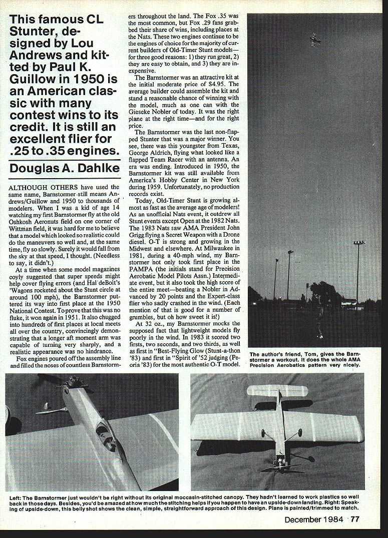 Authors re-creation famous Stunterfrom Fifties virtuallythe same original kit model As noted text few changes suggested improved strength front model some old-timer things rare O&R F 23 H prop recommended flying spinnerprop nuts differentweight old Berkeley Modelsaluminum line reel old aluminum handle modifications AndrewslGuillow Trixter Barnstormer Left Up front earlyTornado 10-5 Piasticote prop early Fox 29 Stunt engine runs great produces plenty power model Also fitted modified Du-Bro Muffle-Aire muffler weighs just 22 grams Right Note rather long rear moment arm solid fixed flaps generous size tail feathers comparison wing still pretty airplane 30 years later 76 Model Aviation famous CL Stunter de signed Lou rews kitted Paul K Guillow 1950 American clas sic contest wins its credit still excellent flier 25 35 engines Douglas Dahlke ALTHOUGH OTHERS have used same name Barnstormer still means An drews/Guillow 1950 thousands modelers kid age 14 watching first Barnstormer fly old Oshkosh Aeronuts field corner Wittman field hard believe model looked realistic could maneuvers well same time fly slowly Surely would fall sky speed thought Needless say didnt time some model magazines coyly suggested super speeds might help cover flying errors HaldeBolts Wagons rocketed about Stunt circle around 100 mph Barnstormer put tered its way first place 1950 National Contest prove no fluke won again 1951 also chugged hundreds first places local meets over country convincingly demon strating longer aft moment arm capable turning very sharply realistic appearance no hindrance Fox engines poured off assembly line filled noses countless Barnstormers throughout land Fox 35 common Fox 29 fans grab bed share wins including places Nats two engines continue engines choice forthe majority cur rent builders Old-Timer Stunt models three good reasons 1 run great 2 easy obtain 3 expensive Barnstormer attractive kit initial moderate price $495 average builder could assemble kit stand reasonable chance winning model much can Gieseke Nobler today right plane right timeand right price Barnstormer last non-flap ped Stunter major winner see youngster Texas George Aldrich flying what looked like flapped Team Racer antenna An era ending Introduced 1950 Barnstormer kit still available Americas Hobby Center New York during 1959 Unfortunately no production records exist Today Old-Timer Stunt growing al fast average age modelers As unofficial Nats event outdrew Stunt events except Open 1982 Nats 1983 Nats saw AMA President John Grigg flying Secret Weapon Drone diesel O-T strong growing Midwest elsewhere Milwaukee 1981 during 40-mph wind Barn stormer took first place PAMPA iaitials stand Precision Aerobatic Model Pilots Assn Intermedi ate event also took high score entire meetbeating Nobler Ad vanced 20 points Expert-class flier sadly crashed wind mention good number grumbles oh sweet 32 oz Barnstormer mocks supposed fact lightweight models fly poorly wind 1983 scored two firsts two seconds two thirds well first Best-Flying Glow Stunt-a-thon 83 first Spirit of52 judging Pe oria 83 authentic O-T model Left Barnstormer just wouldnt right its original moccasin-stitched canopy hadnt learned work plastics well back days Besides youd amazed much stitching helps happen have upsidedown landing Right Speak Ing upsldedown belly shot shows clean simple straightforward approach design Plane painted/trimmed match December 1984 77 authors friend Tom gives Barn stormer workout does whole AMA Precision Aerobatics pattern very nicely Left picture shows longago tradition author wouid iike revive ciub decal wing addition AMA numbers Piane covered bamboo paper over sppiied base nitrate dope thin coat orange Hobbypoxy trim stripes white Right Fairised atthe pushrod exit point prevents fuei residue backing up intothe fuselage Stab/eievatorratio nlceiy balanced Whats secret might ask Theres no secret no magic just greatworking combination lightweight mod el generous wing area aft moment arm considerable length things help Barnstormer fly slower slow flying helps us folks survive Stunt circle put things perspective compared some other popular models give look numbers chart assumed Magician built fixed flaps consider what measurements means Stunt ship think youll agree Barnstormer gives up very little indeed younger its 1950 kit debut date suggests Lou Andrews first big win 1948 Plymouth Internationals did work well Construction First would like point out original plans provided clockwise flight fly folks sure change things other side Next original instructions have greatly condensed practices origi nally spelled out detail now pretty well standard doubt seldom wrong using conventional stick-and-tis sue methods Pick wood carefully serious builders once did before high-horsepower engines tricked thinking didnt matter original plans show O&R 23 engine option Thats good choice feel unless know exactly what doing O&R engines able build unusually lightweight mod el insist O&R power 29 should considered minimum better would less-common 33 red head practical among non-Fox en gines would early Veco 29-3 credit have various early Nats Stunt wins Also fine K&B 29 35 engines Glow Torp through fine Green Head series Ive also seen some pretty good McCoy Super Stunt engines period well Wing Splice center spar Lite Ply ight ckness ties Lay spar leading edge LE trailing edge TE over wing plan marking rib positions Cut rib notches TE four root ribs have extra-large center spar slots Glue right root ribs two holes lead-outs together same two left root ribs Slip ribs center spar marked positions Fit TE ribs Carefully align ribs before gluing Add LE TE ties taper fit flush against main TE Glue flap TE place glue rib extensions diagonal braces place Add top bottom secondary spars Cement tips place add half-ribs top bottom tips Glue Lite Ply bellcrank base top center spar between center ribs bottom ply piece added after wing installed fuselage Install LE sheeting top bottom 