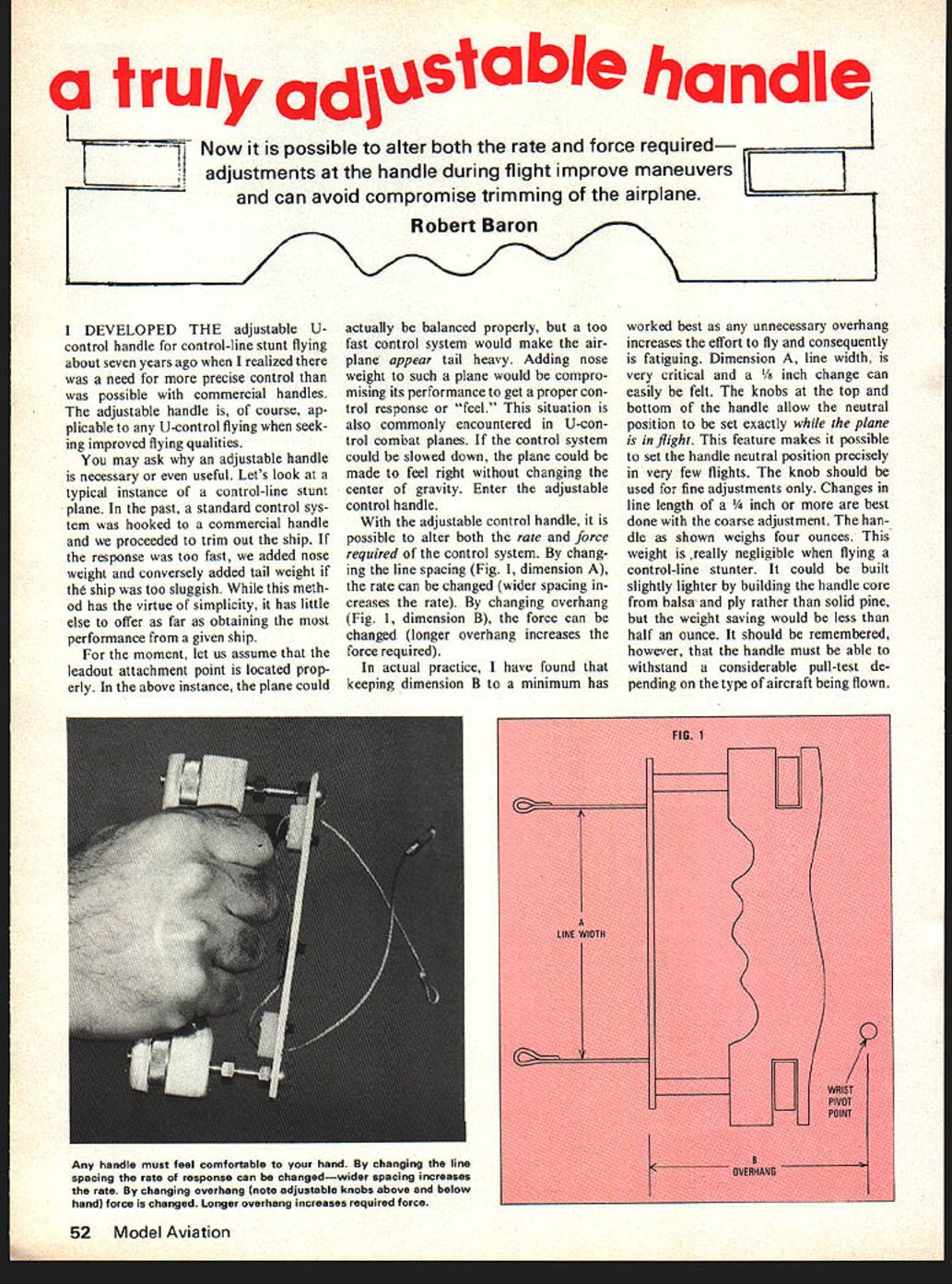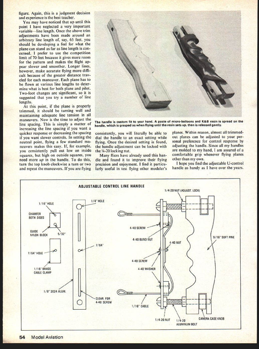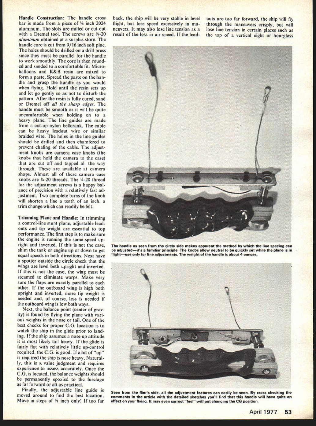 a truly OdIstabIe handle Now possible alter both rate force required adjustments handle during flight improve maneuvers 1111 can avoid compromise trimming airplane Robert Baron DEVELOPED THE adjustable Ucontrol handle control-line stunt flying about seven years ago realized need precise control possible commercial handles adjustable handle course ap plicable U-control flying seek ing improved flying qualities may ask adjustable handle necessary useful Lets look typical instance control-line stunt plane past standard control sys tem hooked commercial handle proceeded trim out ship response too fast added nose weight conversely added tail weight th ship too sluggish meth od has virtue simplicity has little else offer far obtaining performance given ship moment let us assume leadout attachment point located prop erly above instance plane could actually balanced properly too fast control system would make air plane appear tail heavy Adding nose weight such plane would compro mising its performance get proper con trol response feel situation also commonly encountered U-con trol combat planes control system could slowed down plane could made feel right changing center gravity Enter adjustable control handle adjustable control handle possible alter both rate force required control system chang ing line spacing Fig 1 dimension rate can changed wider spacing creases rate changing overhang Fig 1 dimension B force can changed longer overhang increases force required actual practice have found keeping dimension B minimum has worked best unnecessary overhang increases effort fly consequently fatiguing Dimension line width very critical change can easily felt knobs top bottom handle allow neutral position set exactly plane flight feature makes possible set handle neutral position precisely very few flights knob should used fine adjustments Changes line length best done coarse adjustment han dle shown weighs four ounces weight really negligible flying control-line stunter could built slightly lighter building handle core balsa ply rather solid pine weight saving would less half ounce should remembered however handle must able withstand considerable pull-test de pending type aircraft being flown 52 Model Aviation Any handle must feel comfortable hand changing line spacing rate response can changedwider spacing increases rate changing overhang Inote adjustable knobs above below handl force changed Longer overhang increases required force Handle Construction handle cross bar made piece inch 2024 aluminum slots milled cut out Dremel tool screws /4-20 aluminum obtained surplus store handle core cut 9/16 inch soft pine holes should drilled drill press since must parallel handle work smoothly core round ed sanded comfortable fit Microballoons K&B resin mixed form paste Spread paste han dle grasp handle would flying Hold until resin sets up let go gently disturb pattern After resin fully cured sand Dremel off sharp edges handle must smooth will quite uncomfortable holding heavy plane line guides made cut-up nylon bellcrank cable can heavy leadout wire similar braided wire holes line guides should drilled chamfered prevent chafing cable adjust ment knobs camera case knobs knobs hold camera case cut off tapped way through available camera shops Almost camera case knobs -20 threads /4-20 thread adjustment screws happy bal ance precision relatively fast ad justment Two complete turns knob will shorten line tenth inch trim change can readily felt Trimming Plane Handle trimming control-line stunt plane adjustable leadouts tip weight essential top performance first step make sure engine running same speed up right inverted case shim tank engine up down get equal speeds both directions Next have spotter outside circle check wings level both upright inverted case wing must steamed eliminate warps Make very sure flaps exactly parallel other outboard wing high both upright inverted tip weight needed course less needed outboard wing low both ways Next balance point center grav ity found flying plane vari ous weights nose tail best checks proper CG location watch ship glide prior land ing ship assumes nose-up attitude likely tail heavy glide fairly flat relatively little up-control required CG good lot up required ship nose heavy Natural ly e judgment requires experiencc assess accurately Once CG located balance weights should permanently epoxied fuselage far forward aft practical Finally adjustable line guide moved around find best location Move steps inch too far back ship will very stable level outs too far forward ship will fly flight lose speed excessively ma- through maneuvers crisply will neuvers may also lose line tension lose line tension certain places such result loss air speed lead- top vertical eight hourglass April 1977 53 handle seen circle side makes apparent method line spacing can adjustedits familiar principle knobs allow neutral quickly set plane flightuse fine adjustments weight handle about 4 ounces Seen fliers side adjustment features can easily seen cross checking comments article detailed sketches youll find handle will have quite effect flying may correct feel changing CG position figure Again judgment decision experience best teacher may have noticed up until point have neglected very important variableline length Once above trim adjustments have made around arbitrary line length say 65 feet should developing feel what plane can stand far line length con cerned prefer use competition limit 70 feet because gives room pattern makes flight ap pear slower smoother Longer lines however make accurate flying diffi cult because greater distance trav eled maneuver plane has flown various line lengths deter what best both plane pilot Two-foot changes significant suggested try number line lengths point plane properly trimmed should turning well maintaining adequate line tension maneuvers Now time adjust line spacing simply matter increasing line spacing want quicker response decreasing spacing want slower c