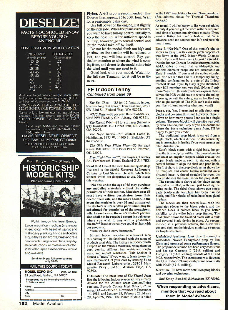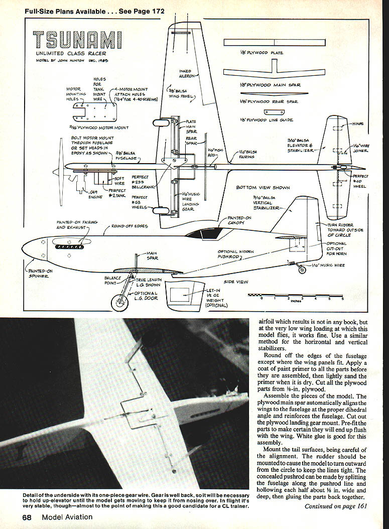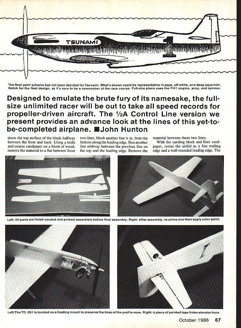 BY THE TIME read article perhaps Tsunami will have taken air first leg journey will likely end Smithsonian Institutions Na tional Air Space Museum re markable racing aircraft has designed John Sandburg Minneapolis MN Bruce Roland Tsunami conceived capable doing things better other aircraft has done before I To superior Unlimited class closed-course racing Expectations will compete Reno 2 To better land speed record reciprocating-engine-powered aircraft record currently held Red Baron another project having participation Bruce Roland 3 To establish new seaplane speed record propeller-driven aircraft Italians have held record since 1938 4 To try absolute speed record prop-driven planes would turboprop version Although Tsunami bears superficial resemblance venerable P-5 1 Mus tang things same spinner 2400-hp Rolls Royce Merlin engine Otherwise new original design speed flying flushriveted compact finely-detailed thorough bred model its profile format engine simplest quickest way get new significant design built flying profile form sleek lines come through particularly flight model easy fly good beginner racing heritage seems require better usual attention detail some optional features shownsuch enclosed pushrod offset engine mount preserves lines spinner removable landing gear model can flown Construction Obtain full-size plan MA Plans Service will make easier lay out accurate profiles Select firm h-in sheet balsa wing fuselage /16 sheet balsa tail surfaces Cut balsa parts outline plans band saw available knife Shaping airfoil wing tedious chore begin Ill des cribe method doing may make job easier First mark wing blank left other right may surprised times two right wings made mistake Using ballpoint pen scribe line along trailing edge wing blank Vs up bottom Run another line 66 Model Aviation Top Artists rendition Tsunami racer Above authors daughter Carol poses model Hunton also archi tectof National CenterforAeromodeling final paint scheme has decided Tsunami Whats shown could representative aqua off white deep aqua trim Watch final design its sure newsmaker race course Full-size plane uses P-51 engine prop spinner Designed emulate brute fury its namesake fullsize unlimited racer will out take speed records propeller-driven aircraft 1/2A Control Line version present provides advance look lines yet-tobe-completed airplane EJohn Hunton down top surface blank halfway between front back Using knife coarse sandpaper block wood remove material flat between two lines Mark another line om along leading edge Run another line midway between previous line top leading edge Remove material between two lines sanding block finer sand paper round airfoil fine trailing edge well-rounded leading edge Left parts finish-sanded primed separately before final assembly Right After assembly re-prime apply color paint LeftThe TD 051 located floating mount preserve lines profile nose Right piece painted tape hides elevator horn October 1986 67 Full-Size Plans Available. See Page 172 U UNLIMITED CLASS 4CEI MOL 50 JO*4N MUNTO KCLESAJL5ON FOP MOTORTAN44-MOTOI MOUNT MOUNTIN MO/NTATTACH MOLES HOLESWlR/4roWINS/ epoe1 AS 3HOWN3/SmALSAFAIIN6 SOFT WIPE Q4PRFEC-T ENIN *TAIW /5 PLYWOOO PLATE H /5PLYwooo MAIN R I/ PLXWOOP PEAR 5PA 1/bPyWOOO LINE GIJIOE 4GaALEA ELEVATOr* 5TALIZ&- FEPECX PAINTEP-ON PAN76P-ON AIPINGCANOPTN ANO EXHALTT0WAO CVr5IE OP CIRCLE -OPTIONAL CUT OUT MAINOPTIONAL HI~H-PO IPN PAP5HO Ac MuSIC- WIRE PAIN1P BALANCe/ POINT /TRUE LENGTh // L&5140WN / OPTIONALMZOZ3458 / LG OOOWEI&HT GPTIONAL airfoil results book very low wing loading model flies works fine Use similar method horizontal vertical stabilizers Round off edges fuselage except wing panels fit Apply coat paint primer parts before assembled lightly sand primer dry Cut plywood parts -in plywood Assemble pieces model plywood main spar automatically aligns wings fuselage proper dihedral angle reinforces fuselage Cut out plywood landing gear mount Pre-fit parts make certain will end up flush wing White glue good assembly Mount tail surfaces being careful alignment rudder should mounted cause model turn outward circle keep lines tight concealed pushrod can made splitting fuselage along pushrod line hollowing half about deep gluing parts back together Continued page 161 68 Model Aviation 7e Vb W etail underside its one-piece gearwire Gear isweil back soitwill necessary hold up-elevator until model gets moving keep nosing over flight its very stable thoughalmost point making good candidate CL trainer C Oou moo no Hoo Exo IO Picft Ships Boats Cors 4Topues/ wcrnds Trdo Exhibitors CIaiIotto mechondiso mart 2500 E Independence IIij. Charlotte flO e THANKSGIVING WEEKEND flowembe 9 30 * meet Ou Special Ouest WORLD WAR H FIGHTER ACE Robert S Johnson 028 Victories0 5th FIGHTER GROUP Display Inlormatton contact CAROLINA HOBBY EXPO 3452 ODELL SCHOOL RQCONCORD NC 28025 704-786-8373 approximately half weight anything else have seen filler can used companys glue MM1 11 suggest try lightweight fillets general filling Racing aircraft manufacturers address Model Magic Inc PO Box 19784 St Paul MN 85119 Another product found worked excep tionally well frozen elevator hinges made Micro Research Inc PO Box 277 Danbury CT 06813 occasions have replace worn damaged elevator hinges planes found after repair hinges some residual epoxy Hot Stuff innards restricted movement applying drop two material hinge bind completely eliminated addition material does remain liquid after applied dries leaves fuel-proof deposit hinge allows permanent freedom movement material also excellent bellcrank mounting bolt bushings pushrods used control elevator fuel shutoff have considerable amount trouble items hardware binding up after have use product seems eliminate binding penetrates actually deposits thin permanent coating dramatically re duces friction might want try product have make field repair elevator Racer have also found inexpensive fiberglassfilled propeller Scale Racing requires very little de