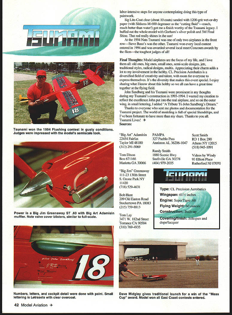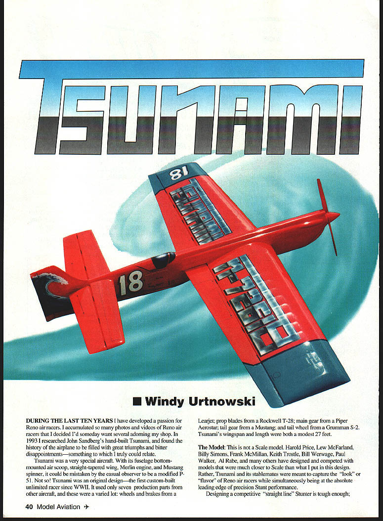 FV1F7F7rF7F777 U Windy Urtnowski DURING THE LAST TEN YEARS have developed passion Reno air racers accumulated photos videos Reno air racers decided Id someday want several adorning shop 1993 researched John Sandbergs hand-built Tsunami found history airplane filled great triumphs bitter disappointmentssomething Itruly could relate Tsunami very special aircraft its fuselage bottommounted air scoop straight-tapered wing Merlin engine Mustang spinner could mistaken casual observer modified P 51 Tsunami original designthe first custom-built unlimited racer since WWII used seven production parts other aircraft varied lot wheels brakes Leaijet prop blades Rockwell T-28 main gear Piper Aerostar tail gear Mustang tail wheel Grumman S-2 Tsunamis wingspan length both modest 27 feet Model Scale model Harold Price Lew McFarland Billy Simons Frank McMillan Keith Trostle Bill Werwage Paul Walker Al Rabe others have designed competed models much closer Scale what put design Rather Tsunami its stablemates meant capture look flavor Reno air racers simultaneously being absolute leading edge precision Stunt performance Desigaing competitive straight line Stunter tough enough 40 Model Aviation certain look flavorwithout compromising performancethe job gets tougher spent hours drawing board flying capture flavor Tsunami maintaining critical calculations aerodynamics master Big Jim Greenaway based proven Pattemmaster design Pat Johnston finalized original sketches Gerald Schamp did would have set very accurate pians As always videotaped construction finish flight trimming Building own Tsunami plans and/or videos should out ballpark anyone has built full-body Stunter CONSTRUCTION Big Jim Greenaway has always advocated rigid nose construction Tsunami takes advantage technology Note small closelyspaced formersthese provide very rigid fuselage Ive built two wings Tsunamis used Tom Hunts lost foam method used rod method works fine both wings true light Nonnal C-tube construction applies either way Ribs cut stack As blanks traditional manner wing can laid out over plans tacked up rods installed built foam wing cradle available Scott Smith have documented detailed construction video anyone interested type construction tips hollowed blocks flaps /4 C-grain sheet grain running parallel trailing edge Tsunamis tail surfaces used foam cores Scott Smith Hes best foam cutter book believe have big book bellcrank horns arrow shafts heavy-duty items heart Stunter heavy-duty system proper ratios no flexing biggest improvement Stunters during last 10 years horns four-inch glass/nylon belicranks pioneered both advancements can truly say know improvement afford us flying wind turbulence 1994 Nats Lubbock Texas competitors impressed Tsunami made Walker Cup flyoff handled very windy conditions well Patternmaster aerodynamics have always handled wind well especially turbulent conditions East Coast flying sites Tsunami really has excellent all-weather fighter original Tsunami weighed 60 ounces balanced eight inches ahead flap hinge line As got more flights shifted CG back 73/4 inches cut down line spacing handle large models always prefer short arms power steering feel always incorporate Rabe rudder model prop diameter greater 12 inches Tsunami flies best 14 x 5 Rev-Up cut down l2A inches diameter have always good success using SuperTigre 60s designs Ive tried other engines have always preferred classic twofour break Tigre Big Jin Greenaway has set up engines have never bad Tom Dixon importing Double Star 60 seems like good replacement cant get hands Tigre Notice well ST 60s hold value thoughtheres reason Muffler type offers easy way fine-tune CG location tongue muffler usually lightest give raw power expansion type will bit quieter expense some power Big Art Adamisin Tom Lay make expansion mufflers ST 60 worth having arsenal pilots prefer tuned pipes both Randy Smith Tom Lay have packages available would power Tsunami just fine people PAMPA [Precision Aerobatics Model Pilots Association] directoryand dont belong PAMPA join now tell truth though love realistic low-rpm growl ST 60 tongue- expansion-type mufflerit says airplane Paint After building wing stab before installing fuselage finished right up silver using Sig dope DuPont 3608S V-36085 thinner Medium silkspan everything dope-talc filler coat two silver sanded off made good substrate finish over used Sig silver project Sig s silver has finest metallic particles Ive found reflection really big help highlighting flaws can fixed before color coats Once silver-finished wing tail installed fuselage attached top bottom blocks fmished fuselageeven cowlup silver using same method before starting color paintwork full-scale Tsunami two distinctive paint jobs silver blue red light blue wingtips Tsunami tidal wave wave motif painted vertical stabilizer rudder decided red/blue color scheme duplicating wave tail true labor love used 1993 Porsche Fire Red DuPont acrylic lacquer Sig Light Blue main colors custom-mixed colors needed airbrush wave time-consuming necessary get look after back-masked using aluminum foil suggested master painter Walt Preyit works great lettering another labor love Luckily videotaped October 1996 41 Tsunami placed fifth 1994 Nationals Lubbock TX Wave rudder airbrushed using cardboard patterns front row appearance judging Capturing Tsunami look real challenge labor-intensive steps anyone contemplating doing type paintwork Sig Lite-Coat clear about 10 coats sanded 1200-grit wet-or-dry paper Sikkens M-600 degreaser cutting fluidmuch much better water got finish worthy Tsunami legacy buffed out whole model Gorhams silver polish 3M Final Shine red really shines sun 1994 Nats Tsunami oaly two airplanes front rowSteve Busos other Tsunami won local contest entered 1994 awarded several local meet Concours awards fliersthe toughest judges Final Thoughts Model airplanes focus life love old ones big ones small ones semi-scale designs jets traditional styles radical designs mult