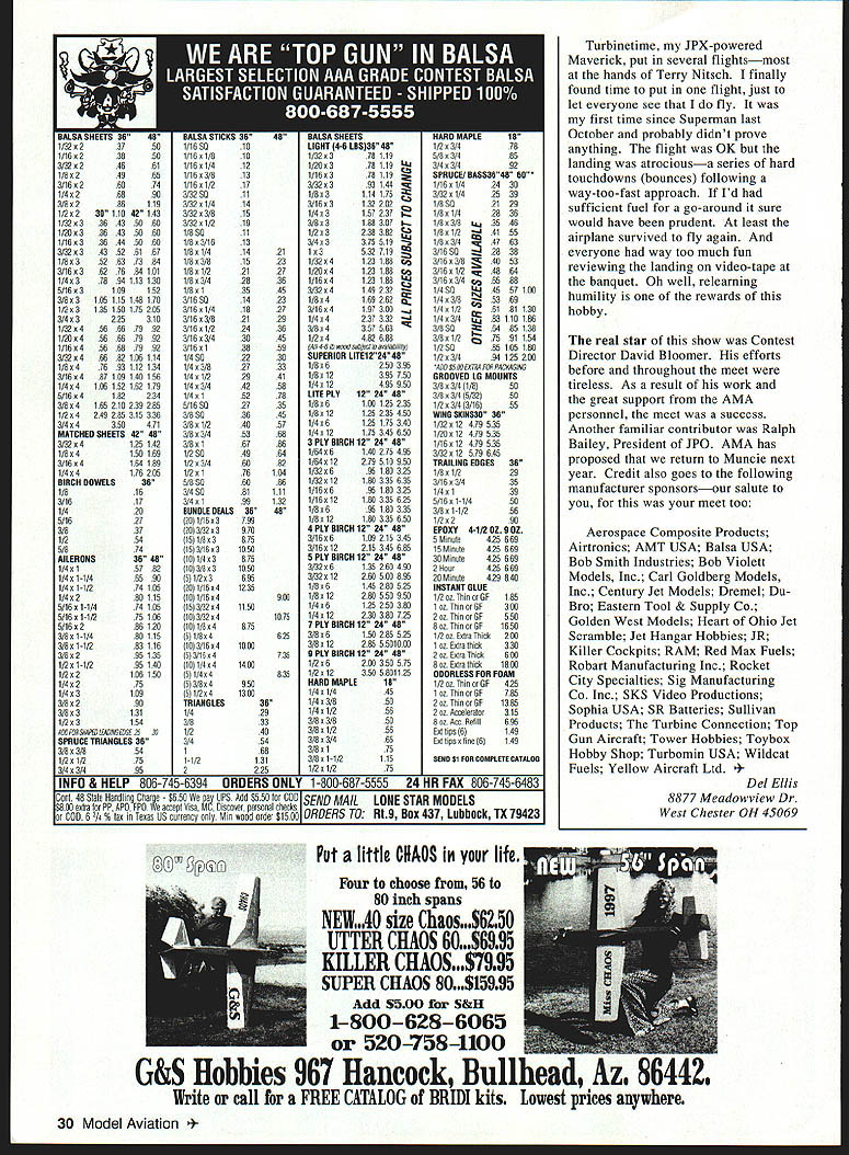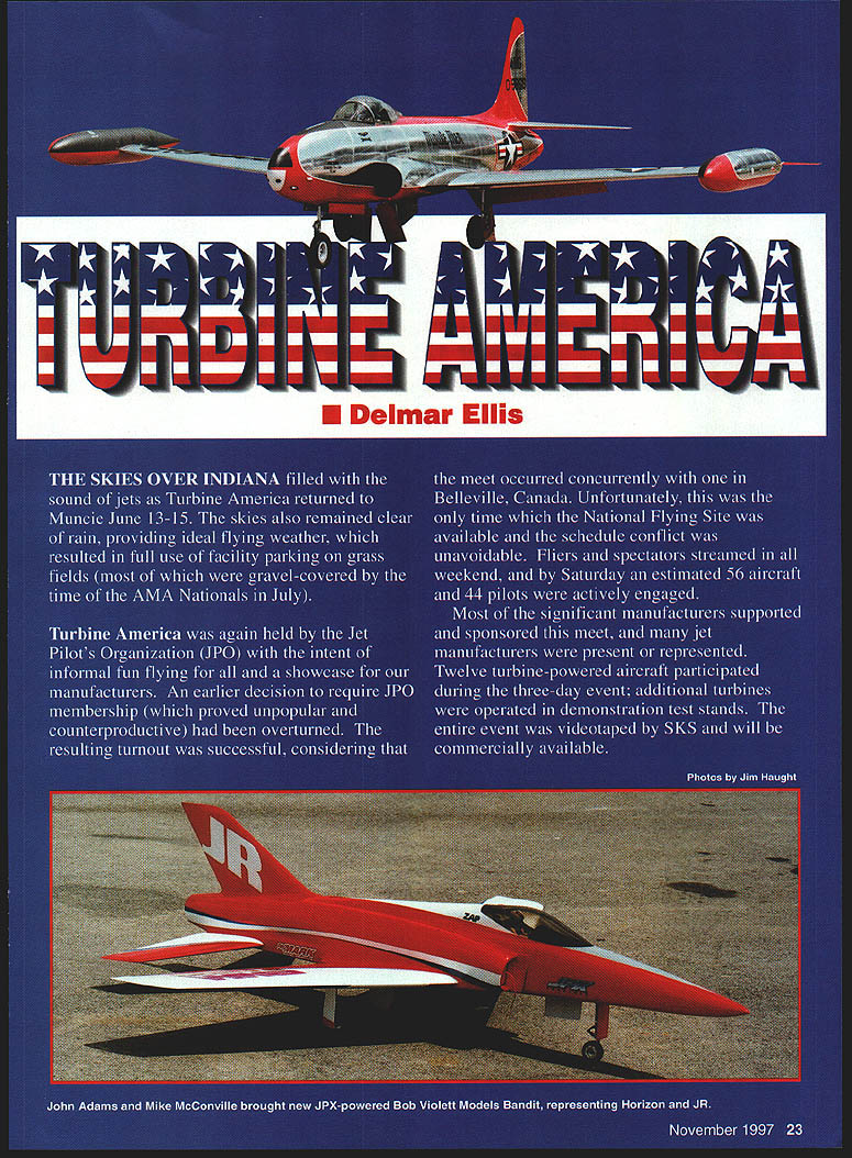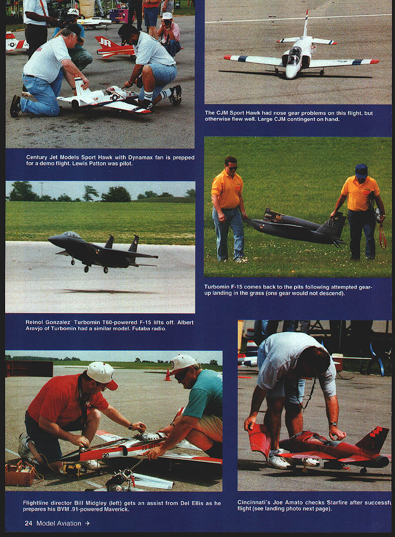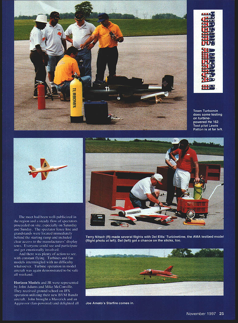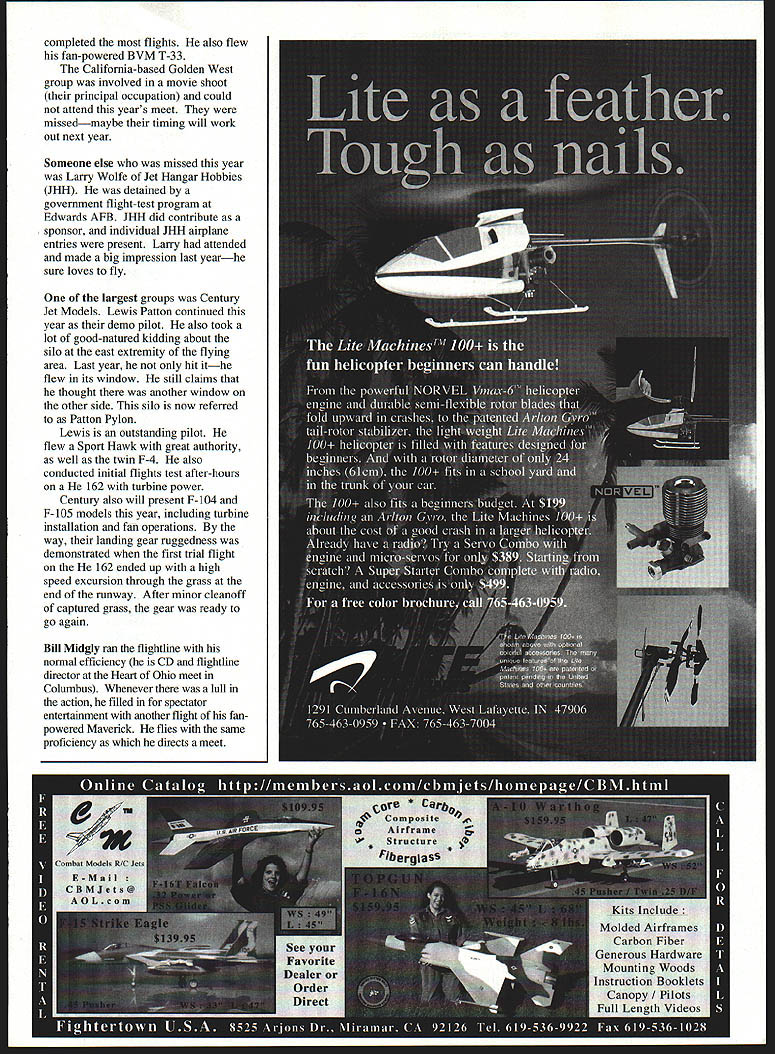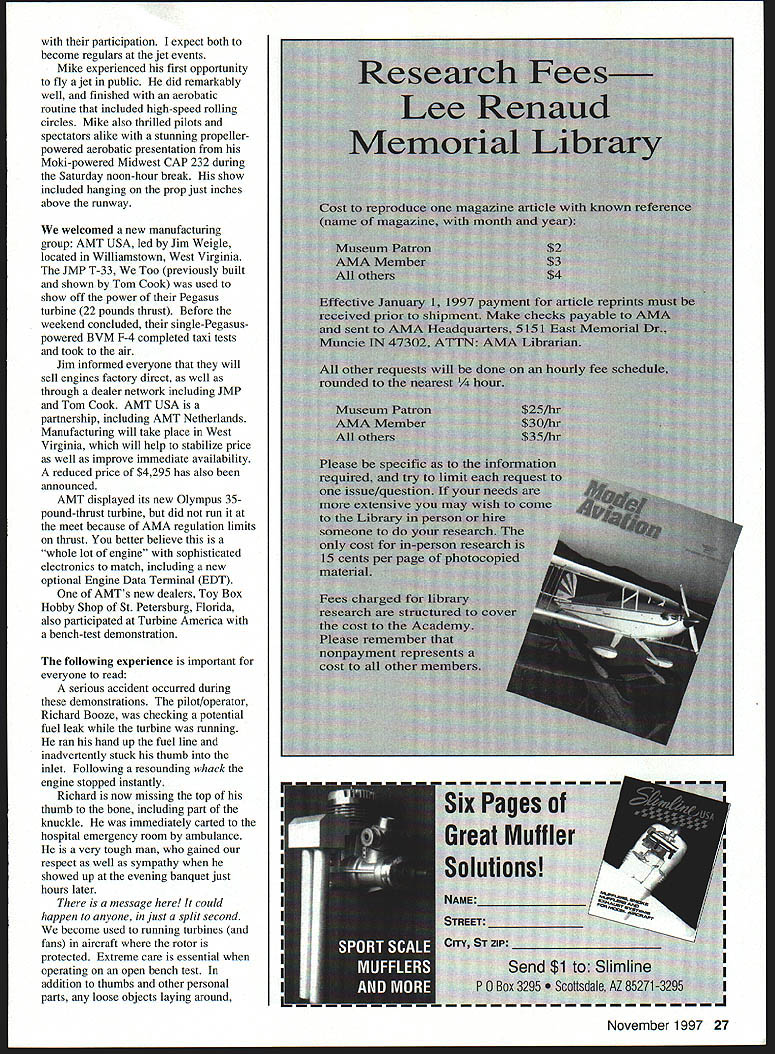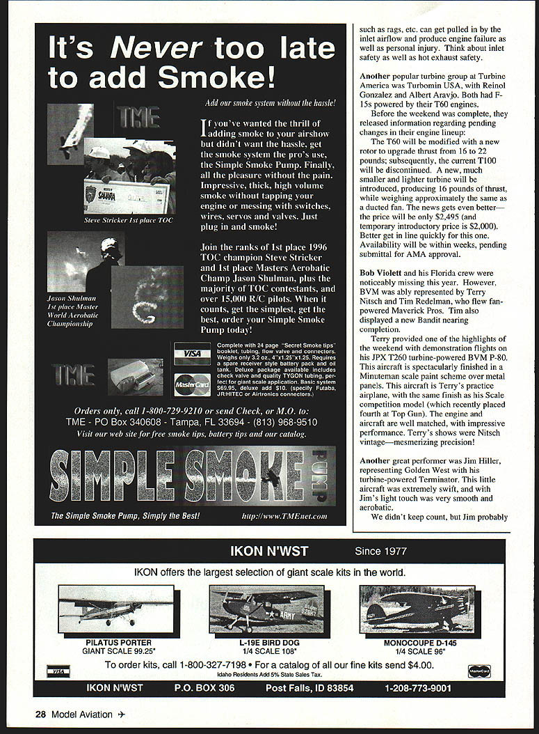 U Delmar Ellis NO OCR TEXT NO OCR TEXT NO OCR TEXT participation expect both become regulars jet events Mike experienced first opportunity fly jet public did remarkably well finished aerobatic routine included high-speed rolling circles Mike also thrilled pilots spectators alike stunning propellerpowered aerobatic presentation Moki-powered Midwest CAP 232 during Saturday noon-hour break show included hanging prop just inches above runway welcomed new manufacturing group AMT USA led Jim Weigle located Williamstown West Virginia JMP T-33 Too previously built shown Tom Cook used show off power Pegasus turbine 22 pounds thrust Before weekend concluded single-Pegasuspowered BVM F-4 completed taxi tests took air Jim informed everyone will sell engines factory direct well through dealer network including JMP Tom Cook AMT USA partnership including AMT Netherlands Manufacturing will take place West Virginia will help stabilize price well improve immediate availability reduced price $4295 has also announced AMT displayed its new Olympus 35pound-thrust turbine did run meet because AMA regulation limits thmst better believe whole lot engine sophisticated electronics match including new optional Engine Data Terminal EDT AMTs new dealers Toy Box Hobby Shop St Petersburg Florida also participated Turbine America bench-test demonstration following experience important everyone read serious accident occurred during demonstrations pilot/operator Richard Booze checking potential fuel leak turbine running ran hand up fuel line inadvertently stuck thumb inlet Following resounding whack engine stopped instantly Richard now missing top thumb bone including part knuckle immediately carted hospital emergency room ambulance very tough man gained respect well sympathy showed up evening banquet just hours later message could happen anyone just split second become used running turbines fans aircraft rotor protected Extreme care essential operating open bench test addition thumbs other personal parts loose objects laying around November 1997 27 such rags etc can get pulled inlet airflow produce engine failure well personal injury Think about inlet safety well hot exhaust safety Another popular turbine group Turbine America Turbomin USA Reinol Gonzalez Albert Aravjo Both F iSs powered T60 engines Before weekend complete released information regarding pending changes engine lineup T60 will modified new rotor upgrade thrust 16 22 pounds subsequently current T100 will discontinued new much smaller lighter turbine will introduced producing 16 pounds thrust weighing approximately same ducted fan news gets better price will $2495 temporary introductory price $2000 Better get line quickly Availability will within weeks pending submittal AMA approval Bob Violett Florida crew noticeably missing year However BVM ably represented Terry Nitsch Tim Redelman flew fanpowered Maverick Pros Tim also displayed new Bandit nearing completion Terry provided highlights weekend demonstration flights JPX T260 turbine-powered BVM P-80 aircraft spectacularly finished Minuteman scale paint scheme over metal panels aircraft Terrys practice airplane same finish Scale competition model recently placed fourth Top Gun engine aircraft well matched impressive performance Terrys shows Nitsch vintagemesmerizing precision Another great performer Jim Hiller representing Golden West turbine-powered Terminator little aircraft extremely swift Jims light touch very smooth aerobatic didnt keep count Jim probably order kits call 1-800-327-7198 log fine kits send $400 Idaho Residents Add 5% State Sales Tax 28 Model Aviation 4IKON offers largest selection giant scale kits world 1/4 LALE 96 completed flights also flew fan-powered BVM T-33 California-based Golden West group involved movie shoot principal occupation could attend years meet missedmaybe timing will work out next year Someone else missed year Larry Wolfe Jet Hangar Hobbies JHH detained government flight-test program Edwards AFB JHH did contribute sponsor individual JHH airplane entries present Larry attended made big impression last yearhe sure loves fly largest groups Century Jet Models Lewis Patton continued year demo pilot also took lot good-natured kidding about silo east extremity flying area Last year hit ithe flew its window still claims thought another window other side silo now referred Patton Pylon Lewis outstanding pilot flew Sport Hawk great authority well twin F-4 also conducted initial flights test after-hours 162 turbine power Century also will present F-104 F-105 models year including turbine installation fan operations way landing gear rnggedness demonstrated first trial flight 162 ended up high speed excursion through grass end rnnway After minor cleanoff captured grass gear ready go again Bill Midgly ran flightline normal efficiency CD flighfline director Heart Ohio meet Columbus Whenever lull action filled spectator entertainment another flight fan powered Maverick flies same proficiency directs meet S 0 C --C C C n C Ct CCC CC Ccc - - BScc cccE ccc CC -cC -CBS cc SC Bps Sn C Cr m acc Cr55 C 0CC ry 90 tar - m Co o g M C r r o 0 r -I MC -J Co Na Ca E 1 C Ac z m r -c C 0 C Cc 0 -CC 0 C Co C z r C C C C 4 Cr C, C-fl Cr Na C C 0 cci -CC 0 0 C cC C Co N 0 C C 5cSe5C4 ccc-ccca C ccccccoa-cccccca cc a-cccc--ca ccccc cm 0cc-4cccc ccc ac C~c ccacccc ccccCcc c ccc ccCcc c nac c ac ccc ccccnc Ccc cc ccc c ccc cc aS-a -a aaa-accccccoaoacacc hA0n SZ3Z aa aCa cc--BCcccc srmccc,ccc mmCarcrr--c cccccc cccc ccccccocc--acaa -aBB Bccca mcCammommcccccc cccc cccccccccc cccncc-a cccacc ccc ccCcccc-a ccUflcBccic BccBB &COccca-- LB&cco cc acccc-a -c-a--c---cccccccccccc -a cccccccccccccccccccc-acc-ccc--a C aa-ccccccc cc-a Ccc cccc cccccc ccccC C cccc Ca-b-Cc cccccc cc-acc---cc-cccccBccB m-cccccCa-a ccccccC cccc--accca cccccccccccacc--acccccccc cc ccCccccccccCcccc ccCccccacacc c cc -acccc-a cccccccccccccccca--a cccccccaccaccCcc -acccc-a cs Zc ccc, cccnccc ccccc ccc cccccccccccccc cccccc ccccccccccaacccccc zc