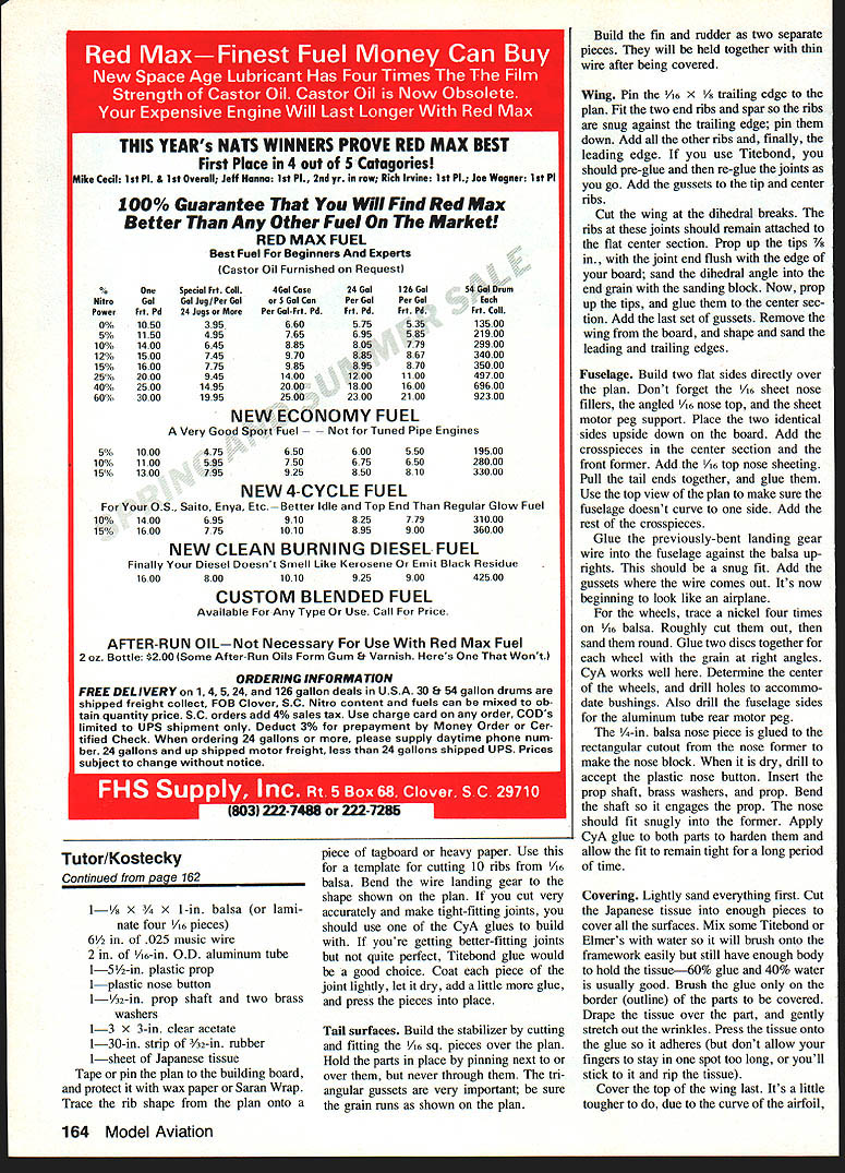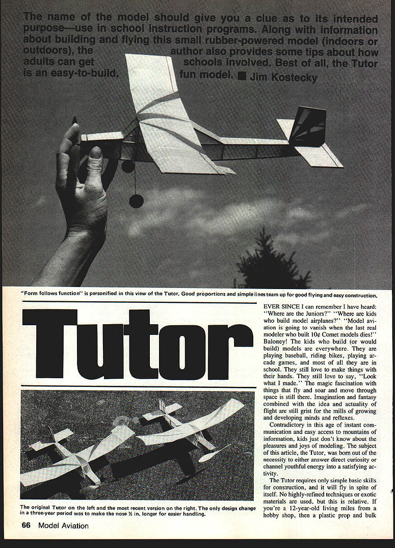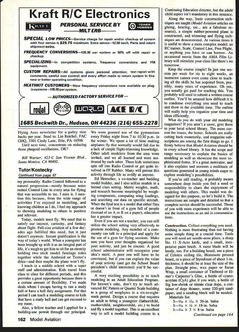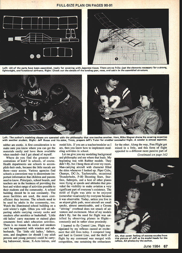 Form follows functior personified view Tutor Good proportions simple linesteam up good flying easy construction EVER SINCE can remember have heard Juniors kids build model airplanes Model avi ation going vanish last real modeler built lO Comet models dies Baloney kids build would build models everywhere playing baseball riding bikes playing ar cade games school still love make things hands still love say Look ____________________________________________________________[v32][b14542280182400]]what made magic fascination things fly soar move through space still Imagination fantasy combined idea actuality flight still grist mills growing developing minds reflexes Contradictory age instant com munication easy access mountains information kids just dont know about pleasures joys modeling subject article Tutor born out necessity either answer direct curiosity channel youthful energy satisfying ac tivity Tutor requires simple basic skills construction will fly spite itself No highly-refined techniques exotic materials used relative youre 12-year-old living miles hobby shop plastic prop bulk 66 Model Aviation original Tutor left recent version right design change three-year period make nose longer easier handling Left All parts have assembled ready covering Japanese tissue no frillsjust elements necessary strong lightweight functional airframe Right Check out details landing gear nose cabin assembled structure Left The authors modeling classes operated philosophy teaches another Mike Wagner shares covering expertise another student Right Jeff Russo sister Tricia prepare Jeffs Tutor another successful flight winder almost essential rubber exotic first consideration make sure know can get materials easily have available neededbut get ahead myself find greatest con centrations kids schools course Health departments use schools accom plish ends because little rascals thereeasy access Various agencies find schools convenient way disseminate im portant information children parents need know Principals school boards teachers business providing best widest range activities possible students community school building should use constantly facilities used costefficient become schools need used adults community too Watch illuminated school building cold winters night Often will see de parting adults carrying sweaty socks sneakers after aerobics basketball Little old -ladies carry macrame stained glass ornaments adult education activities no reason socks sneakers cant augmented winders rub berbands little old ladies fathers sons daughters should say adult persons young persons could carry ing balsawood tissue X-Acto knives model kits teacher/modeler am know implement mod eling activities school Let give modeling background philosophy see leads beginning Rubber models didnt fly hung over room Man-carrying aircraft character filled skies whenever looked up Piper Cubs Champs DC-3s Taylorcrafts occasional Thunderbolts P-80 Shooting Stars Star fires Sabrejets host other planes flying speeds altitudes pro vided visibility make aviation very significant part everyones existence thrill flight able enjoyed somewhat vicariously everyone because observable Today unless live airport glide path aircraft small specks almost unnoticeable Cessna driving overhead does smack ad venture excitement Most models didnt fly need flight sat isfied observing planes flight constantly rather close proximity learned fly Control Line Right ma nipulated reflexes caused excite ment still lives today competed long hard Control Line thrill flight command merged competition sustaining enthusiasm other Along way Free Right got mixed little form flight appealed different passive part June 1984 67 FULL-SIZE PLAN ON PAGES 90-91I Continued page 162 Ah sweet feeling success exudes trom picture Jeff model heads rafters photos author Kraft RIC Electronics PERSONAL SERVICE BY MILT ERB SPECIAL LOW PRICESService charge repair and/or checkup system four servos $2975 maximum Extra servos$250 Parts return shipment extra FREQUENCY CONVERSIONS$25oo per system 50% off repair checkup SPECIALIZINGin competition systems frequency conversions FM equipment CUSTOM REPAIRSAll systems given personal attention test report comments careful cost control effort made return system likenew better operating condition HEATHKIT CUSTOMERSrjew frequency conversions now available plug systemsS35O0 per system AUTHORIZED FACTORY SERWCE FOR j~jJ neAU W/ 1685 Beckwith Dr Hudson OH 44236216 655-2278 Flying Aces newsletter paltry nine bucks per year Send Lin Reichel FAC GHQ 3301 Cindy Lane Erie PA 16506 Until next time concentrate reducing phugoid oscillations OK Bill Warner 423-C San Vicente Blvd Santa Monica CA 90402 Tutor/Kostecky Continued paoe 67 personality Radio Control followed natural progressionmostly because noise mined Control Line area flying accessible miss men tion because wide range activities Ive enjoyed modeling knowing children I feel approach showing modeling others positive relevant Today models must fly need satisfy interest curiosity fantasy about flight Full-size aviation few dec ades ago fulfilled need just doesnt anymore Instant gratification way todays world youngster has brought up integral part life its tough get him sit eternity holding two stick model fuselage sides together Ambroid Testors driesand maybe plane wont fly teach middle school super staff administration Kids travel class class different periods provides great opportunity because certain amount flexibility Ive made deals escape having run study hall have hall duty assignment period can teach modeling course kids have study hall can get excused room Also fellow teacher applied building-use permit through principal granted use gymnasium Friday night 7 1030 pm winter spent lot time making airplanes fly normally would fail due lack simple flight-trimming knowledge Other adult modelers area invited learned mo tivated other kids sometimes spin off Radio Control get quite volved FF Rubber will pursu
