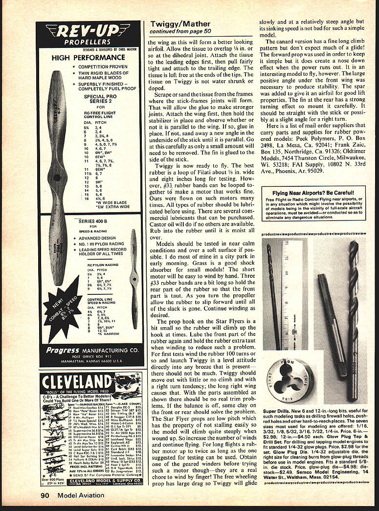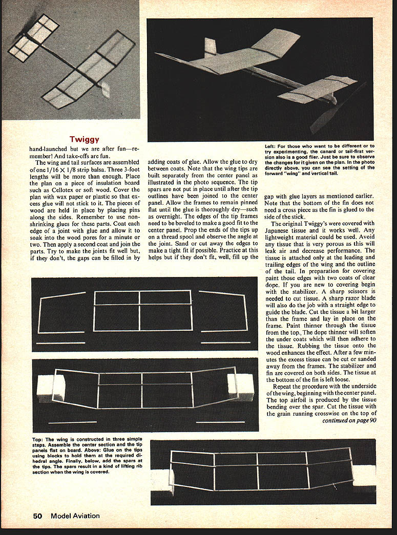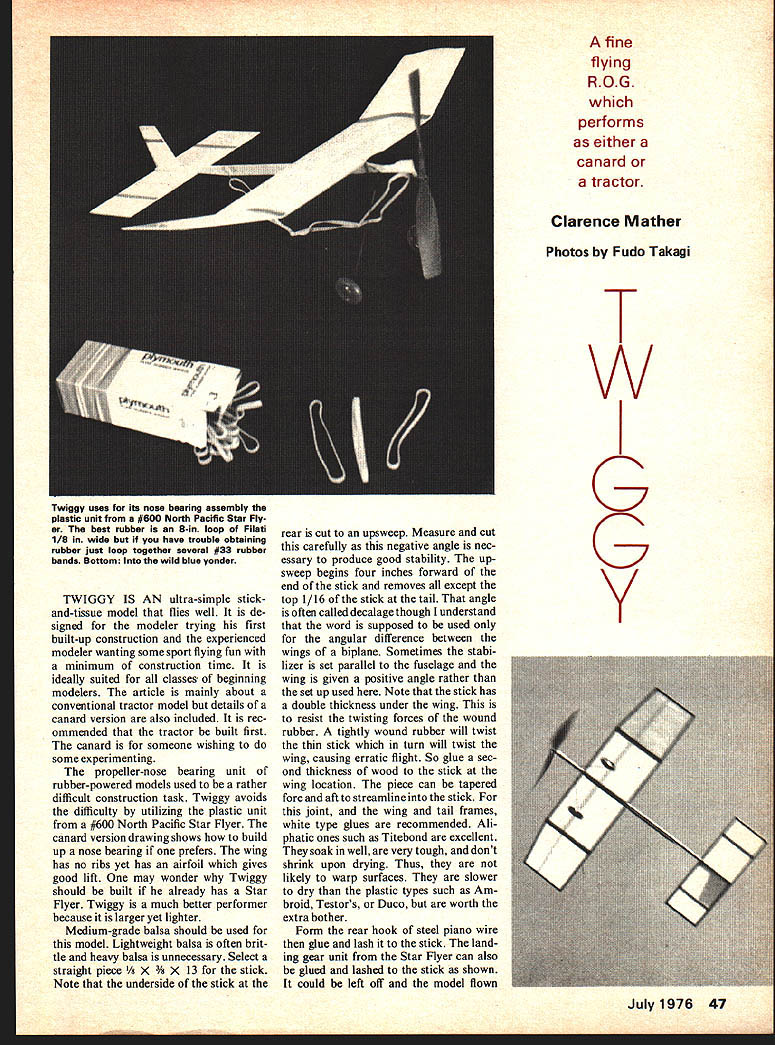 TWIGGY IS ultra-simple stickand-tissue model flies well de signed modeler trying first built-up construction experienced modeler wanting some sport flying fun minimum construction time ideally suited classes beginning modelers article mainly about conventional tractor model details canard version also included rec ommended tractor built first canard someone wishing some experimenting propeller-nose bearing unit rubber-powered models used rather difficult construction task Twiggy avoids difficulty utilizing plastic unit #600 North Pacific Star Flyer canard version drawing shows build up nose bearing prefers wing has no ribs yet has airfoil gives good lift may wonder Twiggy should built already has Star Flyer Twiggy much better performer because larger yet lighter Medium-grade balsa should used model Lightweight balsa often brit tle heavy balsa unnecessary Select straight piece X stick Note underside stick rear cut upsweep Measure cut carefully negative angle nec essary produce good stability upsweep begins four inches forward end stick removes except top 1/16 stick tail angle often called decalage though understand word supposed used angular difference between wings biplane Sometimes stabi lizer set parallel fuselage wing given positive angle rather set up used Note stick has double thickness under wing resist twisting forces wound rubber tightly wound rubber will twist thin stick turn will twist wing causing erratic flight So glue sec ond thickness wood stick wing location piece can tapered fore aft streamline stick joint wing tail frames white type glues recommended Ali phatic ones such Titebond excellent soak well very tough dont shrink upon drying Thus likely warp surfaces slower dry plastic types such Am broid Testors Duco worth extra bother Form rear hook steel piano wire glue lash stick land ing gear unit Star Flyer can also glued lashed stick shown could left off model flown fine flying ROG performs either canard tractor Clarence Mather Photos Fudo Takagi w July1976 47 Twiggy uses its nose bearing assembly plastic unit #600 North Pacific Star Fly er beat rubber S-in loop Filati 1/8 wide have trouble obtaining rubber just loop together several #33 rubber bands Bottom wild blue yonder G G Y TIP OUTLINES ARE BUILT SEPARATE FROM CENTER PANEL AND WITHOUT SPAR --TIPS ARE PROPPED UP TO 1 1/f DIHEDRAL AND GLUED TO THE CENTER SPAR IS THEN ADDED I1 I -- _ ENTIRE CENTER NOTE-WING HAS NO RIBS AIRFOIL IS CREATED BY TISSUE BENDING OVER SPAR LAP iTISSUE 1/8w AT DIHEDRAL JOINT TISSUE GRAIN 1 -TRACTOR MODEL STAB IS _ ON BOTH SIDES /16X1/8 SPAR ON CANARD ONLY - 1/16X 1/~ FRAME K FLAT AND COVERED -- 3/ X 13 MOTOR STICK STEEL WIRE AD BINDING U-- Ihill // I1~X / ~ / -Sf 12 EXPERIMENTAL CANARD II I PANEL IS FLAT Kl/6X VOTE-RIGHT SIDE THAN LEFT 1/8 SET ON EDGE IS LONGER DO NOT SHRINK TISSUE TIPS ARE RAISED 1 1/4 FOR DIHEDRAL ALL SURFACE OUTLINES ARE OF 1/16 X 1/8 MEDIUM BALSA . _______ MODEL FLIES ON THREE 33 RUBBER BANDS OR 10 LOOP OF I/8 FILATI 1 TIP DIHEDRAL OPTIONAL BALSANORTH 1w600 TISSUE COVERING FROMNORTH DOUBLERPACIFIC MAY BEUSED TRACTOR MODELOR BEND FROM 1/32 WIRE 0 NOTE HIGH STAB ANGLE _- - 11g BALSAKIiiIA4 _______SI __5-7 PLASTIC PROP I/I6AL TUBE VERSION GGY SIMPLIFIED SPORT MODEL CAatAvc SAN DIEGO ORBITEERS Twiggy band-launched after funre member take-offs fun wing tail surfaces assembled 1/16 X 1/8 strip balsa Three 3-foot lengths will enough Place plan piece insulation board such Cellotex soft wood Cover plan wax paper plastic ex cess glue will stick pieces wood held place placing pins along sides Remember use nonshrinking glues parts Coat edge joint glue allow soak wood pores minute two apply second coat join parts Try make joints fit well dont gaps can filled adding coats glue Allow glue dry between coats Note wing tips built separately center panel illustrated photo sequence tip spars put place until after tip outlines have joined center panel Allow frames remain pinned flat until glue thoroughly drysuch overnight edges tip frames need beveled make good fit center panel Prop ends tips up thread spool observe angle joint Sand cut away edges make tight fit possible Practice helps dont fit well fill up gap glue layers mentioned earlier Note bottom fin does need cross piece fin glued side stick original Twiggys covered Japanese tissue works well Any lightweight material could used Avoid tissue very porous will leak air decrease performance tissue attached leading trailing edges wing outline tail preparation covering paint edges two coats clear dope new covering begin stabilizer sharp scissors needed cut tissue sharp razor blade will also job straight edge guide blade Cut tissue bit larger frame lay place frame Paint thinner through tissue top dope thinner will soften under coats will adhere tissue Rubbing tissue onto wood enhances effect After few min utes excess tissue can cut sanded away frames stabilizer fin covered both sides tissue bottom fin left loose Repeat procedure underside wing beginning center panel top airfoil produced tissue bending over spar Cut tissue grain running crosswise top continued page 90 50 Model Aviation Left For want different try experimenting canard tail-first ver sion also good flier Just sure observe changes given plan photo directly above can see setting forward wing vertical tail Top The wing constructed three simple steps Assemble center section tip panels flat board Above Glue tips using blocks hold required di hedral angle Finally below add spars tips spars result kind lifting rib section wing covered COMPETITION PROVEN THIN RIGID BLADES OF HARD MAPLE WOOD SUPERBLY FINISHED COMPLETELY FUEL PROOF SPECIAL PRO SERIES 2 FOR RC-FREE FLIGHT CONTROL LINE DIAPITCH 5%34 634 733y04 83%456 945677% 10467 106W 8W0 106EW 114677% 7% 7% 8 116EW 11%67 126 125W 1356 1456 1556 164%6 W WIDE BLADE EW EXTRA WIDE SERIES 400 B FOR SPEED & RACING ADVANCED DESIGN NO 1 IN PYLON RACING LEADING SPEED RECORD HOLDER OP ALLTIMES RC PYLON RACING DIAPITCH 5h354 758 75N SN0 8%61577% 96157