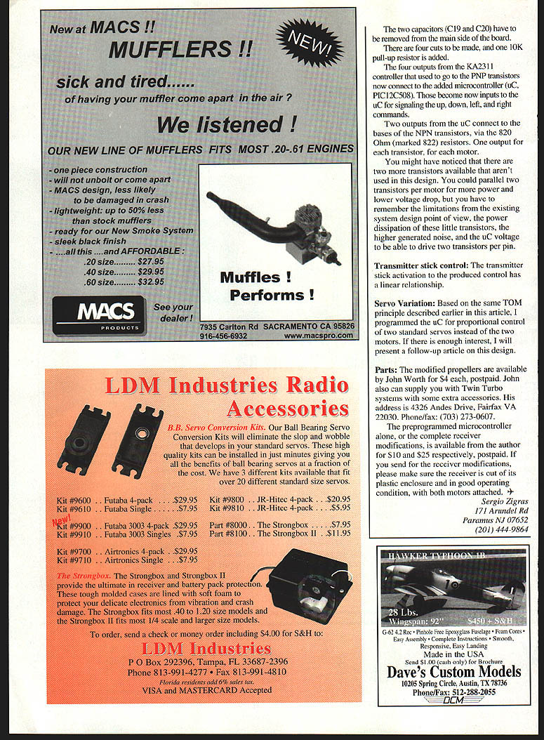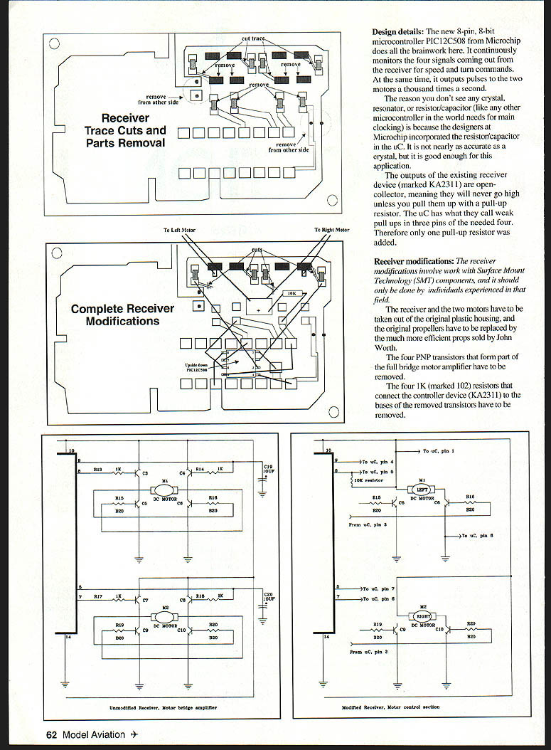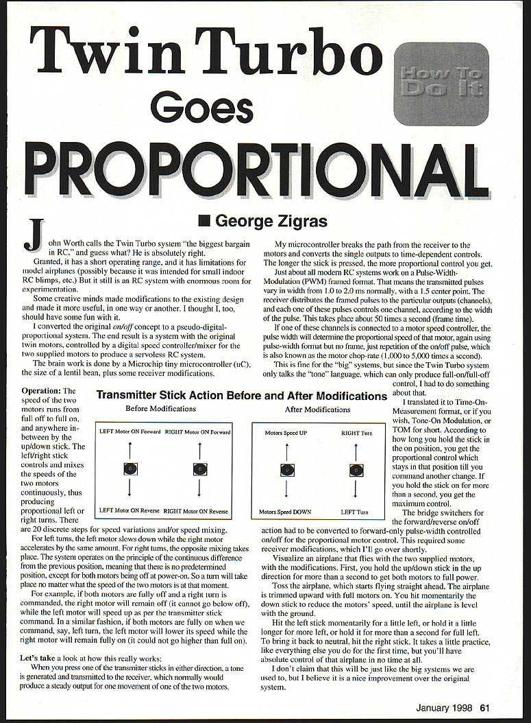 0 Twin Turbo Goes PRO PORTIO NAL TEGeorgeZigras ohn Worth calls Twin Turbo system biggest bargain in RC guess what absolutely right Granted has short operating range has limitations model airplanes possibly because intended small indoor RC blimps etc still RC system enormous room experimentation Some creative minds made modifications existing design made useful way another thought too should have some fun converted original on/off concept pseudo-digitalproportional system end result system original twin motors controlled digital speed controller/mixer two supplied motors produce servoless RC system brain work done Microchip tiny microcontroller uC size lentil bean plus some receiver modifications microcontroller breaks path receiver motors converts single outputs time-dependent controls longer stick pressed proportional control get Just about modem RC systems work Pulse-WidthModulation PWM framed format means transmitted pulses vaiy width 10 20 ms normally 15 center point receiver distributes framed pulses particular outputs channels pulses controls channel according width pulse takes place about 50 times second frame time channels connected motor speed controller pulse width will determine pmportional speed motor again using pulse-width format no frame just repetition on/off pulse also known motor chop-rate 1000 5000 times second fine big systems since Twin Turbo system talks tone language can produce full-on/full-off control something Transmitter Stick Action Before After Modifications aboutthat translated Time-OnBefore ModificationsAfter ModificationsMeasurement format wish Tone-On Modulation LEFT Motor ON Forward RIGHT Motor ON ForwardMotors Speed UPRIGHT TurnTOM short According long hold stick position get 11 proportional control stays position till U U U U command another change hold stick 11 second get maximum control LEFT Motor ON Reverse RIGHT Motor ON ReverseMotors Speed DOWNLEFT TurnThe bridge switchers forward/reverse on/off action converted forward-only pulse-width controlled on/off proportional motor control required some receiver modifications Ill go over shortly Visualize airplane flies two supplied motors modifications First hold up/down stick up direction second get both motors full power Toss airplane starts flying straight ahead airplane trimmed upward full motors hit momentarily down stick reduce motors speed until airplane level ground Hit left stick momentarily little left hold little longer left hold second full left bring back neutral hit right stick takes little practice like everything else first time youll have absolute control airplane no time dont claim will just like big systems used believe nice improvement over original system Operation speed two motors runs full off full anywhere inbetween up/down stick left/right stick controls mixes speeds two motors continuously thus producing proportional left right turns 20 discrete steps speed variations and/or speed mixing left turns left motor slows down right motor accelerates same amount right tums opposite fluxing takes place system operates principle continuous difference previous position meaning no predetermined position except both motors being off power-on So turn will take place no matter what speed two motors moment example both motors fully off right turn commanded right motor will remain off cannot go below off left motor will speed up per transmitter stick command similar fashion both motors fully command say left turn left motor will lower its speed right motor will remain fully could go higher full Lets take look really works press transmitter sticks either direction tone generated transmitted receiver normally would produce steady output movement two motors January1998 61 Design details new 8-pin 8-bit microcontroller PlC 2C508 Microchip does brainwork continuously monitors four signals coming out receiver speed turn commands same time outputs pulses two motors thousand times second reason dont see crystal resonator resistor/capacitor like other microcontroller world needs main clocking because designers Microchip incorporated resistor/capacitor uC nearly accurate crystal good enough application outputs existing receiver device marked KA23 II opencollector meaning will never go high unless pull up pull-up resistor uC has what call weak pull ups three pins needed four Right MoOorTherefore pull-up resistor added Receiver modifications receiver modifications involve work Surface Mount Technology SMT components should done individuals experietwed field receiver two motors have taken out original plastic housing original pmpellers have replaced much efficient props sold John Worth four PNP transistors form part full bridge motor amplifier have removed four 1K marked 102 resistors connect controller device KA231 1 bases removed transistors have removed * To sC pIn 0 Mi 7T RODDC MOTOR ROE CDCE EDO MD EIGHT ROEDC MOTOR CECOO 820EDO Modified Receiver Motor control section 62 Model Aviation trac 5remove rrom other side Receiver TraceCutsand DERID ii Parts Removal W DDDD 0 Left Motor Complete Receiver Modifications 0 oC plo 4 iTooCphoD 001 renOstor CI IOU RiODC MOTORROE 8 7R07ICCCERIBII MD ROEDC MOTOR CECiE 14EDOEDO Unmodified Receiver Motor bridge amplifier cC pIn 8 sC pin S cC p10 7 SOC pl. 8 14 pin 2 two capacitors C19 C20 have removed main side board four cuts made 10K pull-up resistor added four outputs KA231 1 controller used go PNP transistors now connect added microcontroller uC PlC 12C508 become now inputs uC signaling up down left right commands Two outputs uC connect bases NPN transistors via 820 Ohm marked 822 resistors output transistor motor might have noticed two transistors available arent used design could parallel two transistors per motor power lower voltage drop have remember limitations existing system design point view power dissipation little transistors higher generated noise uC voltage able drive two transistors per pin Transmitter stick control transmitter stick activation produced 