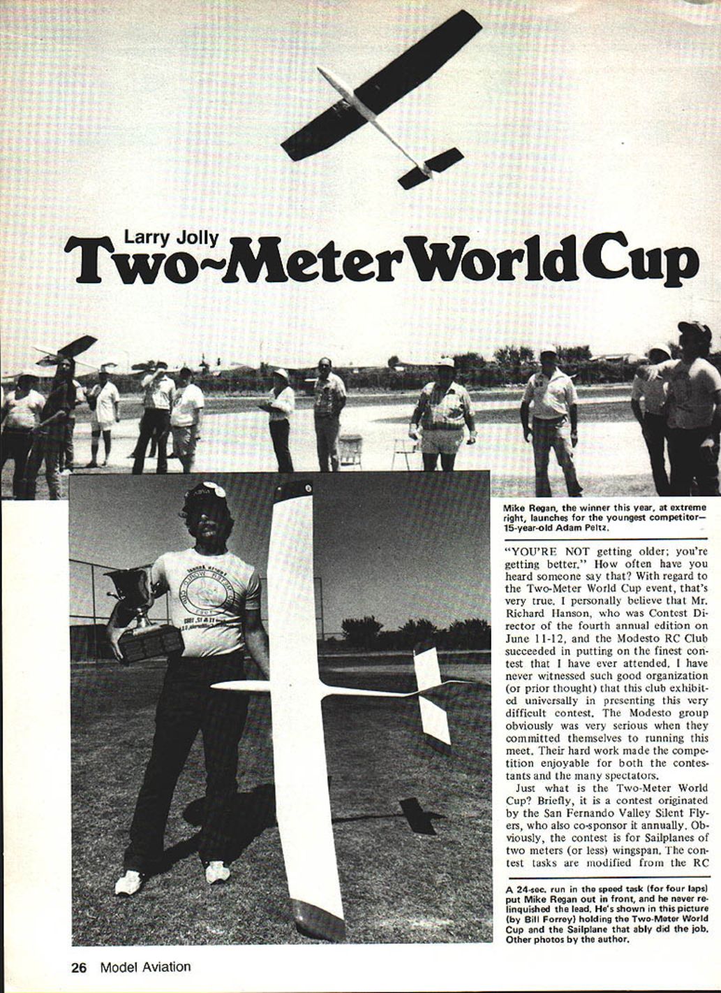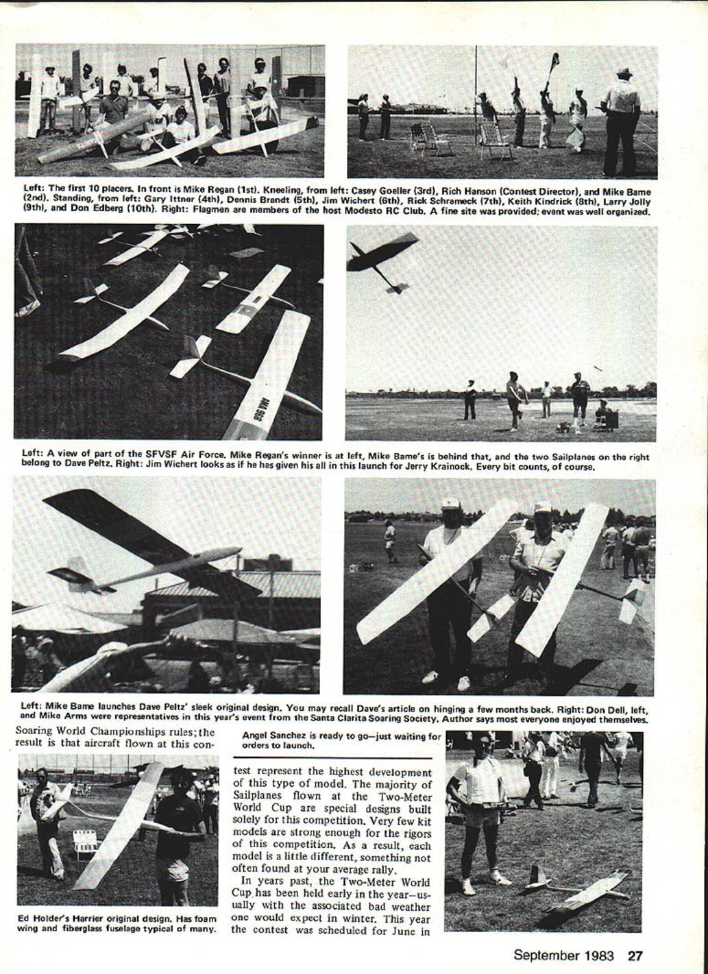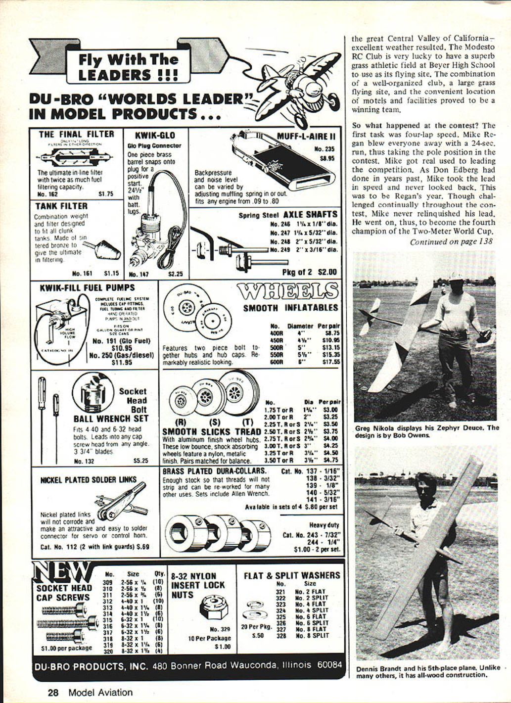 Larry Jolly M Two eterWorid Cup Mike Regan winner year extreme right launches youngest competitor 15-year-old Adam Peltz YOURE NOT getting older youre getting better often have heard someone say regard Two-Meter World Cup event thats very true personally believe Mr Richard Hanson Contest Di rector fourth annual edition June 11-12 Modesto RC Club succeeded putting finest con test have ever attended have never witnessed such good organization prior thought club exhibit ed universally presenting very difficult contest Modesto group obviously very serious committed themselves running meet hard work made compe tition enjoyable both contes tants spectators Just what Two-Meter World Cup Briefly contest originated San Fernando Valley Silent Fly ers also co-sponsor annually Ob viously contest Sailplanes two meters less wingspan con test tasks modified RC 24-sec run speed task four laps put Mike Regan out front never re linquished lead Hes shown picture Bill Forrey holding Two-Meter World Cup Sailplane ably did job Other photos author 26 Model Aviation Left A view part SFVSF Air Force Mike Regans winner left Mike Bames behind two Sailplanes right belong Dave Peltz Right Jim Wichert looks has given launch Jerry Krainock bit counts course Soaring World Championships rules result aircraft flown con test represent highest development type model majority Sailpianes flown Two-Meter World Cup special designs built solely competition Very few kit models strong enough rigors competition As result model little different something often found average rally years past Two-Meter World Cup has held early yearus ually associated bad weather would expect winter year contest scheduled June Ed Holders Harrier original design Has foam wing fiberglass fuselage typical September 1983 27 Left The first 10 placers front Mike Regan 1st Kneeling left Casey Goeller 3rd RICh Hanson Contest Director Mike Bame 2nd Standing left Gary lttner 4th Dennis Brandt 5th Jim Wichert 6th Rick Schrameck 7th Keith Kindrick 8th Larry Jolly 9th Don Edberg 10th Right Flagmen members host Modesto RC Club fine site provided event welt organized Left Mike Bame launches Dave Peltz sleek original design may recall Daves article hinging few months back Right Don Dell left Mike Arms representatives years event Santa Clarita Soaring Society Author says everyone enjoyed themselves Angel Sanchez ready gojust waiting orders launch Fly LEADERS ! DU-BRO WORLDS LEADER! MODEL PRODUCTS III AiIZII1A.EMUFFLAIRE II No235 $895 THE FINAL FILTER ONLY heu mae ne e w h w ea m h e g apa ty No 62S 75 TANK FILTER Combination weight filter designed fit clunk tanks Made sin gdm g No 6S S KWIK-CLO Ole Plug Connector piece brass barrel snaps onto plug positive start 2 41/2 batt lugslB 4 c No 187S225 KWIK-FILL FUEL PUMPS ANCOMPtE FAELIWC SOSTEM INCLUDE S CAP FiTTiNGS FUEl TUSSlE AND FILTER HAND OPERATID PUMPS N AND 0T OAAPT O PINT if1 0 UMESIZE CANS No 191 010 Fuel GASLON FITS ON MUS1095 No 250 Gas/diesel $1195 Backpressure noise level can varied adjusting muffling spring ous fits engine 09 80 Spring Steel AXLE SHAFTS No286 1/x1/8dla No287 1/AxS132 di. No288 2x5132dla No289 2x3116dla P1w 2 $200 NA Features two piece bolt gether hubs hub caps Re markably realistic looking \ILiI SMOOTH INFLATABLES No 800K 850K SOAR 550K m Diameter 8 8W 5. 6 Per pair $575 SbUS $1315 $1535 S1755 EHed NoAla Per pair Bolt orK 1/i $300 2OOTorK2$325 BALL WRENCH SET T225 TRorS2I$350 Fits 440 632 headSMOOTH SLICKS TREAD2SOTRorS2W$375 bolts Leads cap With aluminum finish wheel hubs 275 T K $ 2I $500 screw head angle low bounce shock absorbing 300 T K $ 3 $425 3 3/4 blades wheels feature nylon metalic 325 T K 3I. $850 No 132 S525 finish Pairs matched balance 350 T K 3W $875 NICKEL PLATED SOLDER LINKS Nickel plated links will corrode make attractive easy solder connector servo control horn Cat No 112 2 wIth link guards S69 28 Model Aviation BRASS PLATED DURA-COLLARS Enough stock threads will strip can re-worked other uses Sets include Allen Wrench Cat No 137 1/16 138 139 1/8 140 141 Ava lable sets 4 580 per set Heavy duty Cat No 243 7/32 244 1/4 Si 00- 2 per set great Central Valley California excellent weather resulted Modesto RC Club very lucky have superb grass athletic field Beyer High School use its flying site combination well-organized club large grass flying site convenient location motels facilities proved winning team So what happened contest first task four-lap speed Mike Re gain blew everyone away 24-sec run thus taking pole position contest Mike got real used leading competition As Don Edberg done years past Mike took lead speed never looked back Regans year Though chal lenged continually throughout con test Mike never relinquished lead went thus become fourth champion Two-Meter World Cup Continued page 138 Greg Nikola displays Zephyr Deuce design Bob Owens No SizeQty 3092-56 x I10 3102-56 x Yz8 3112-56 x 6 CAP3128-80 x 110 3138-80 x P18 3188-80 x l/ 3I6-32 x 1 16K 1IB KlUtz6 xl 1IT1R S- I, a-32 NYLON INSERT LOCK NUTS No 32920 Per Pkg 10 Per Packages50 $100 FLAT & SPLIT WASHERS No Size 321 No 2 FLAT 322 No 2 SPLIT 323 No 8 FLAT 328 No 8 SPLIT 325 No 6 FLAT 326 No 6 SPLIT 327 No 8 FLAT 328 No S SPLIT Dennis Brandt 5th-place plane Unlike others has all-wood construction find regular issue SAM 35 Speaks editors name David Baker 22 Ellington Rd Muswell Hill London NlO 3DG England long-hand slip sample says American modelers may obtain copy $700 Perhaps youll want inquire first perse vere Stop must Bill Winter 4426 Altura Ct Fairfax VA 22030 Two-Meter/Jolly Continued page 28 Mike Regans model could des cribed typical Valley competition Sailplane features fiberglass fuse lage incredibly strong wing foam spruce balsa construction Mike Bame 15% airfoilalways good taste familiar current F3B scene coun try will recognize similarity Alex Bowers Tai Tai special interest Mikes model has conventional polyhe dral geometry leads wonder ailerons really necessary high-speed Sailplane Close Regans heels anot