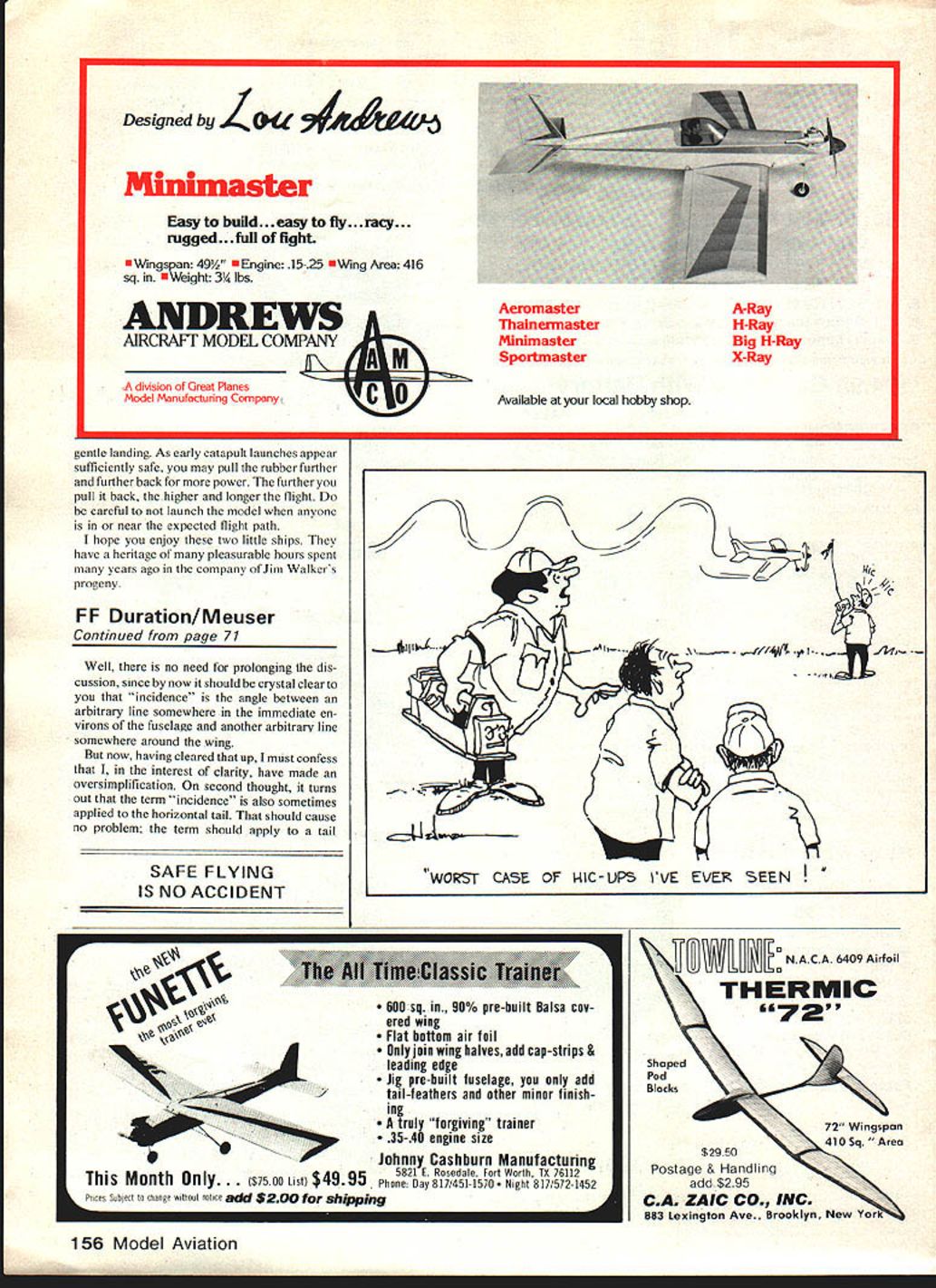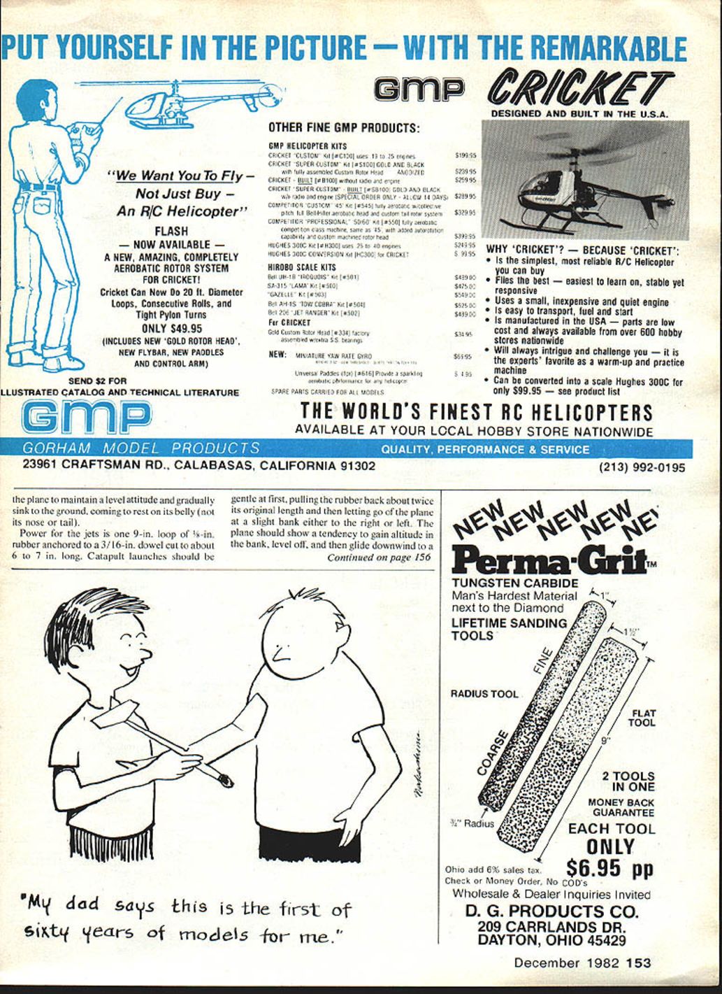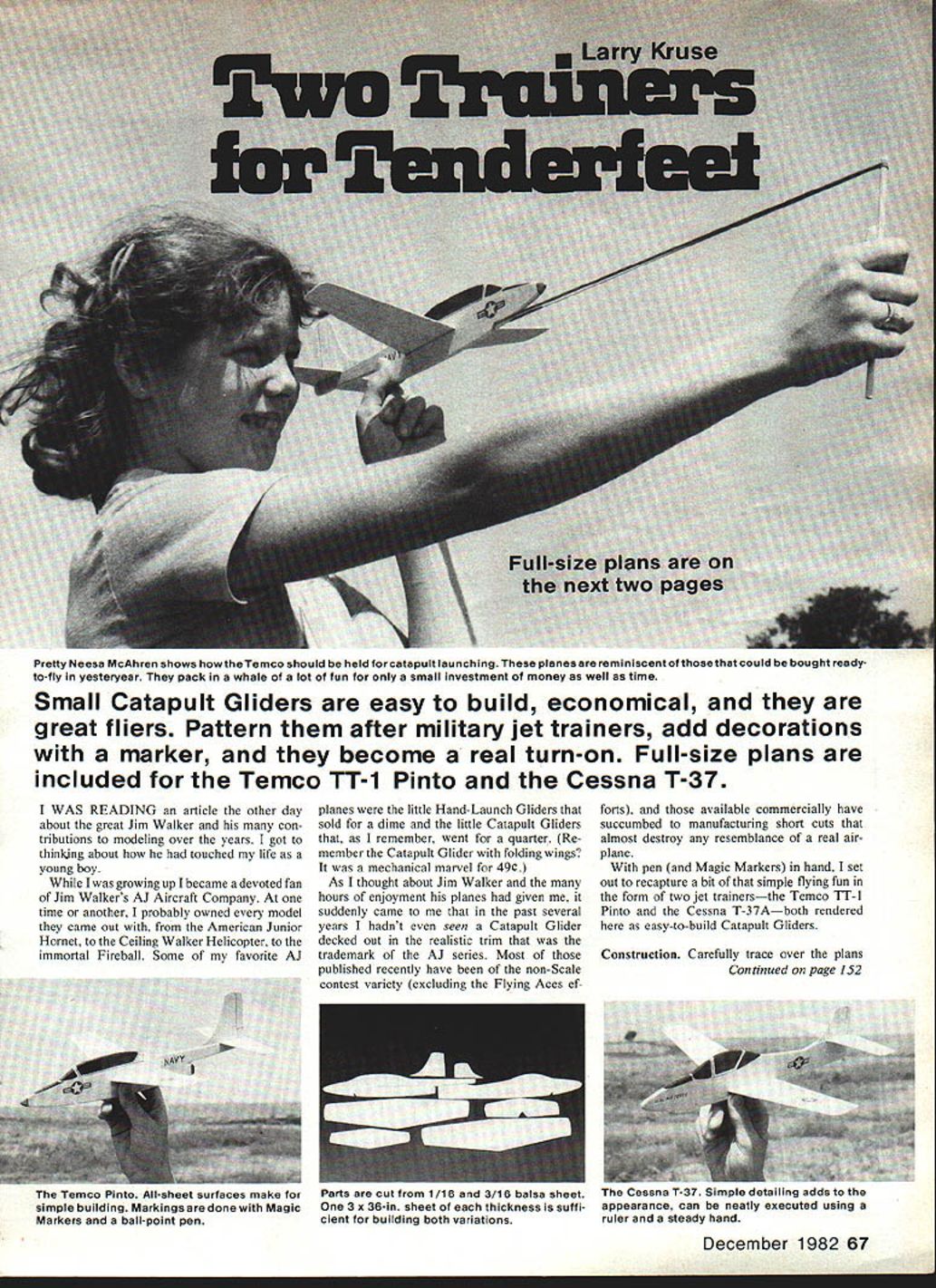 Pretty Neesa McAhren shows howtheTemco should held forcatapultlaunching planes reminiscentof thosethatcould bought readyto-fly yesteryear pack whale lot fun small investment money well time Small Catapult Gliders easy build economical great fliers Pattern after military jet trainers add decorations marker become real turn-on Full-size plans included Temco TT-1 Pinto Cessna T-37 WAS READING article other day about great Jim Walker con tributions modeling over years got thinking about touched life young boy growing up became devoted fan Jim Walkers AJ Aircraft Company time another probably owned model came Out American Junior Hornet Ceiling Walker Helicopter immortal Fireball Some favorite AJ planes little Hand-Launch Gliders sold dime little Catapult Gliders remember went quarter Re member Catapult Glider folding wings mechanical marvel 49t As thought about Jim Walker hours enjoyment planes given suddenly came past several years hadnt seen Catapult Glider decked out realistic trim trademark AJ series Most published recently have non-Scale contest variety excluding Flying Aces ef forts available commercially have succumbed manufacturing short cuts almost destroy resemblance real air plane pen Magic Markers hand set Out recapture bit simple flying fun form two jet trainersthe Temco TI-i Pinto Cessna T-37Aboth rendered easy-to-build Catapult Gliders Construction Carefully trace over plans Continued page 1S2 December 1982 67 Temco Pinto All-sheet surfaces make simple building Markings done Magic Markers ball-point pen Parts cut 1/16 3/16 balsa sheet Cessna T-37 Simple detailing adds 3 x 36-in sheet thickness suffi- appearance can neatly executed using cient building both variations ruler steady hand quadra engine PERFORMANCE 37 lbs capacity 35 cc develops over 20 HP 8000-10000 RPM Part credit impressive performance weight ratio due Schnuerle porting combined piston port induction QUALITY Precision machining continuous testing run engine factory has made Quadra No 1 world component detail design Quadra provides ultimate quality reliability Model II needle main bearings Model Ill e/needle main bearings Model 111111 le bearing piston pin Roller bearing crank pin 4 WAYS BETIER IN POWERING LARGE SCALE AIRCRAFTE rn SERVICEABILITY simplicity design provides accessible maintenance free engine market ECONOMY Quadra offers value money other comparable engine Alter youve flown wifh Quadra Youll never safistied wifh anything less TML Manufacturing Ltd Huron Industrial Park Canada Avenue Huron Park Ontario Canada NOM 1YO Telephone 5191 228-6514 Teleu 064-7181 start well Propeller limited power 15 size engine choice pitch propeller can affect performance dramatically Initially recarved Top Flite 7 x 6 speed prop used mold fiberglass copy After considerable testing pitching molded Walt Perkins Shadow Racing 1100 SE 28th St Ocala FL 32670 Walt molded prop carbon fiber epoxy After minimum de-flashing rework excellent terminal speed obtained superior acceleration takeoff diameter Shadow copy about 6Yn pitch 5 stations Station 2 tip blade Different engines and/or atmospheric conditions may require different propeller selection imperative prop balanced carefully hub trued-up Several excellent commercial balancers availableI use Harry Higley Hub Balancer prior pitching Racing team efforthard work through preparedness will deliver dividends sys tem presented can produce consistent winner have comments questions address care Mode/Aviation Two Trainers/Kruse Continued page 67 using carbon paper lightweight poster board underneath After youre done tracing may cut out poster board templates transfer shapes / 16 sheet balsa wings TATONE engine test siand cast aluminum adjustable hold size engines trom AA 80 unit includes 4 oz tank tubes tittings completely di400li dia575assembled Tank strap anc 1 dia4001 dia750mounting screws Included 1 dia500ludia850 Idia500.diaOnly 1495 aIm tail surfaces 3/16 balsa fuselages Try best can cut out fuselages 900 angle stabilizer mounting areas tilted glue stabilizers main bodies Its also important cut wing slots 900 flat sides fuselage Sand surfaces lightly round off leading trailing edges wings tail surfaces Round off edges fuselages except stabilizer mounted markings original plans done outlining first ball-point pen filling colored areas felt-tip pen fineline Magic Marker neat can dont apply too much pressure felt-tip pens will bleed beyond boundaries markings through capillary action Assemble planes Jet Hot Stuff Zap some equivalent cyanoacrylate glue wing tip should blocked up 1 above building board wings glued together before inserting wing slot fuselage wings square fuselage equal dihedral both sides glue stabilizers place add rudders Flying Balance both planes shown plans adding clay nose area prefer small hole can drilled bottom nose lead shot pressed hole glued place proper balance point reached Test-glide planes outdoors grass field Add subtract lead clay until show no tendency dive stall tossed about shoulder height Test glides can best accomp lished holding nose ship level slightly down aiming spot ground about 25 30 feet away moderately smooth toss shoulder height should cause 152 Model Aviation DEALER INQUIR/ES INVITED kit contains five metal fnstnimanf cases machined turned piated Giasses diaf backs precision cut fit cases Aiso included sf action twenty typical instrument disf faces instructions KIT SIZES PUT YOURSELF IN THE PICTURE THE REMARKABLE _____ rn C/#//CKFT -1-tJL4 Want Fly Just Buy An RIC Helicopter FLASH NOW AVAILABLE NEW AMAZING COMPLETELY AEROBATIC ROTOR SYSTEM FOR CRICKET Cricket Can Now 20 ft Diameter Loops Consecutive Rolls Tight Pylon Turns ONLY $4995 INCLUDES NEW GOLD ROTOR HEAD NEW FLYBAR NEW PADDLES AND CONTROL ARM OTHER FINE GMP PRODUCTS GMP HELICOPTER KITS CRICKET CUSTOM KU orCiUT] oses 19 25 ooo res CRICKET SUPER CUSTOM Kt IRStOT] COLE AID RUCK voltS oily asserootrd Cootono Rotor Hevo ONSOtUTE CRICKET BUILT [or Ri UUJ vortosot 040 004 ergror CRICKE