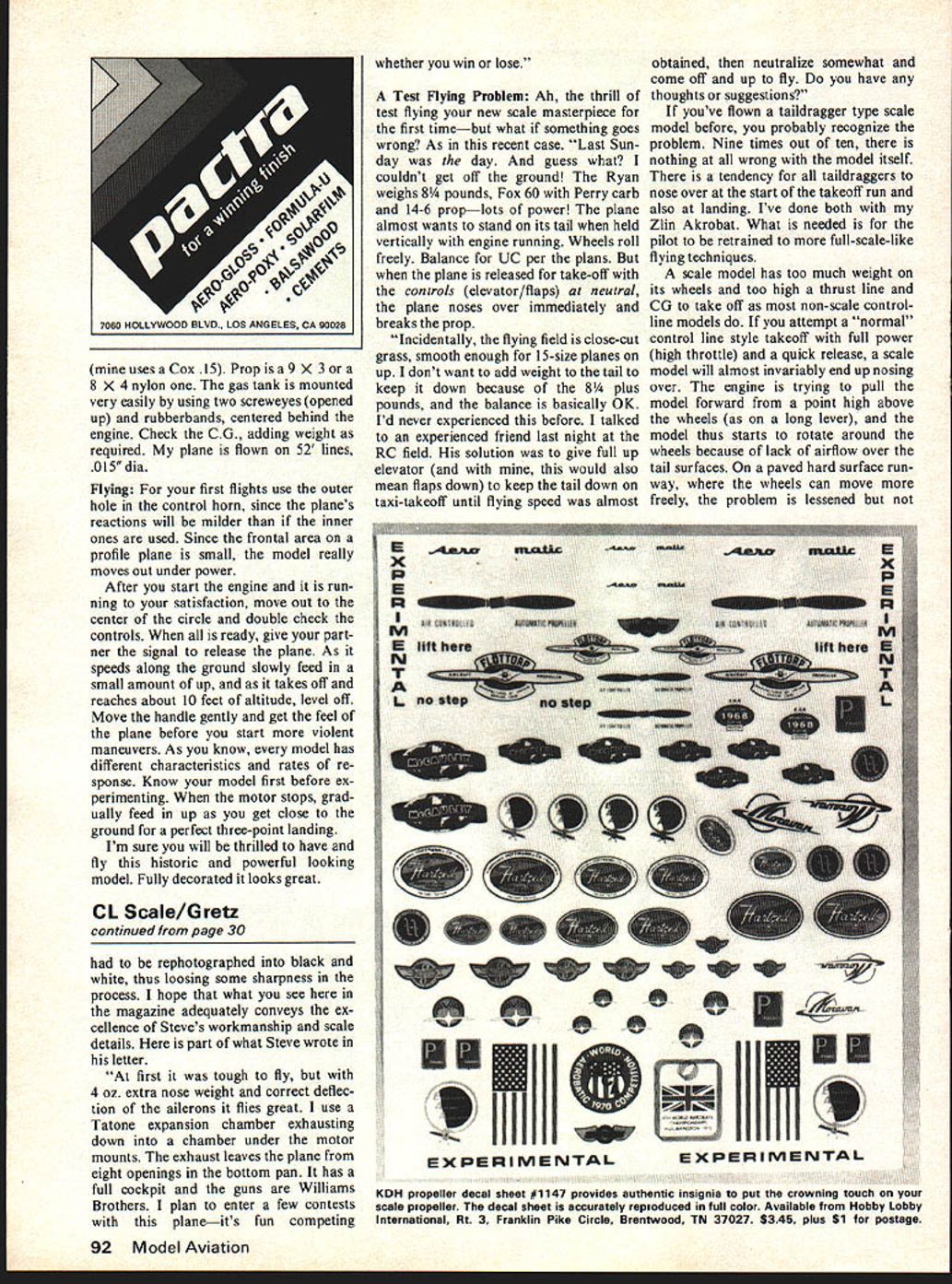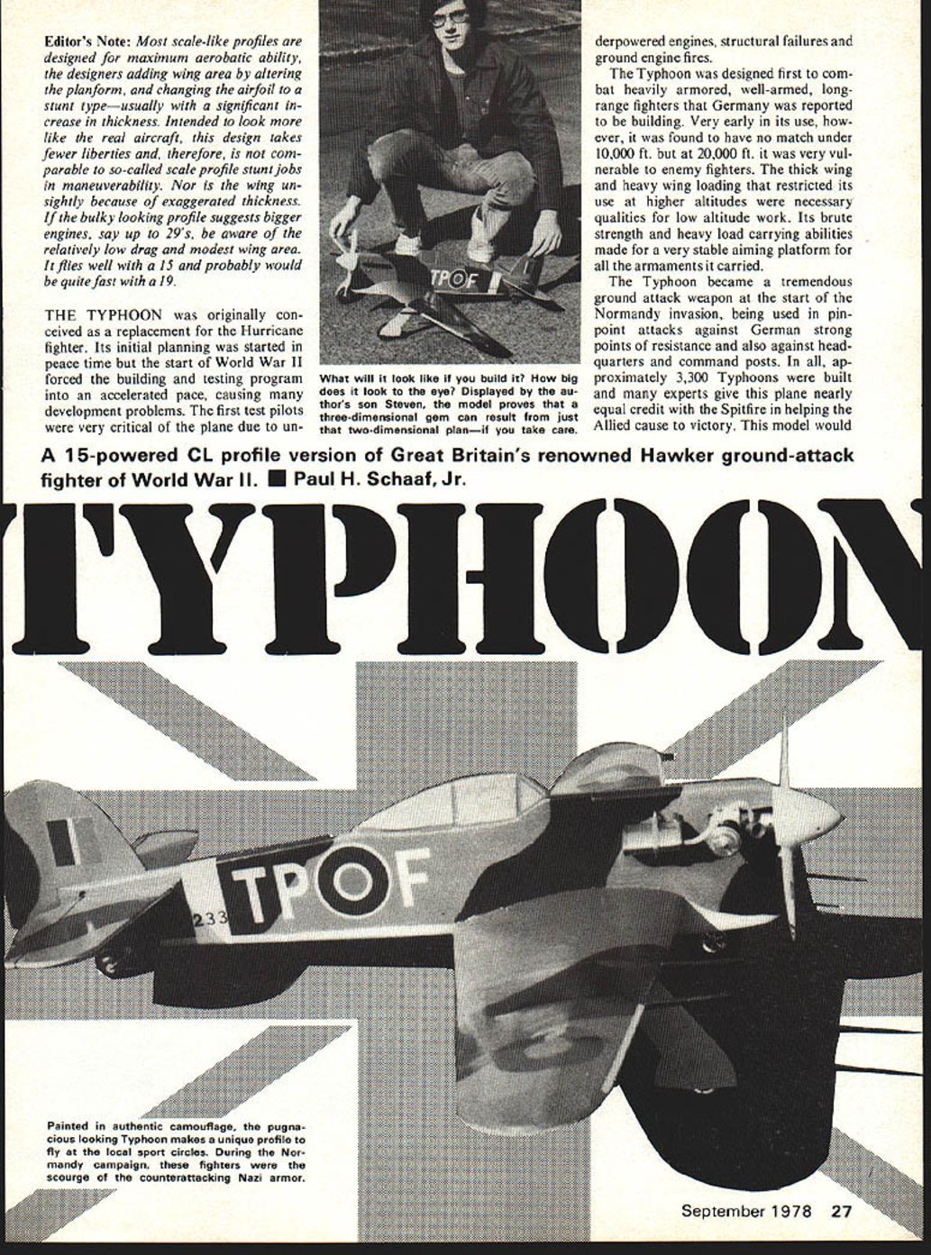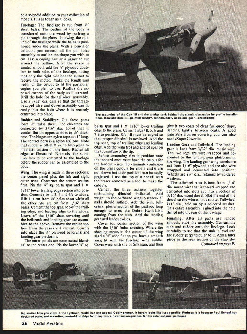 Editors Note Most scale-like profiles designed maximum aeroba tic ability designers adding wing area altering planform changing airfoil stunt typeusually significant crease thickness tended look like real aircraft design takes fewer liberties therefore com parable so-called scale profile stunt jobs maneuverability Nor wing un sightly because exaggerated thickness bulky looking profile suggests bigger engines say up 29s aware relatively low drag modest wing area flies well 15 probably would quite fast 19 THE TYPHOON originally con ceived replacement Hurricane fighter Its initial planning started peace time start World War II forced building testing program accelerated pace causing development problems first test pilots very critical plane due un derpowered engines structural failures ground engine fires Typhoon designed first com bat heavily armored well-armed longrange fighters Germany reported building Very early its use ever found have no match under 10000 ft 20000 ft very vul nerable enemy fighters thick wing heavy wing loading restricted its use higher altitudes necessary qualities low altitude work Its brute strength heavy load carrying abilities made very stable aiming platform armaments carried Typhoon became tremendous ground attack weapon start Normandy invasion being used pin point attacks against German strong points resistance also against head quarters command posts ap proximately 3300 Typhoons built experts give plane nearly equal credit Spitfire helping Allied cause victory model would 15-powered CL profile version Great Britains renowned Hawker ground-attack fighter World War II U Paul H SchaafJr Painted authentic camoullage pugna cious looking Typhoon makes unique profile fly local sport circles During Nor mandy campaign fighters scourge counterattacking Nazi armor What will look like build big does look eye Displayed au thors son Steven model proves three-dimensional gem can result just two-dimensional planif take care splendid addition collection models tough looks Fuselage fuselage cut t balsa outline body transferred onto wood pushing pin through plans following out line fuselage balsa posi tioned under plans pencil ballpoint pen connect pin holes smoothly outline shape wish cut Use coping saw jigsaw cut around outline After shape sanded smooth add ood doub lers both sides fuselage noting right side has cutout receive motor Make length width cutout fit particular engine plan use Radius ex posed corners body illustrated Drill hole tailwheel assembly Use 7/32 dia drill threadwrapped wire dowel assembly can fit easily hole securely cemented place Rudder Stabilizer Cut parts /8 balsa sheet elevators connected 3/16 dia dowel sanded flat opposite sides /8 thick ness hinges nylon tape cut 1 long control horn nylon RC Note rudder offset plane maintain tension lines Radius edges illustrated Note also stabi lizer has cemented fuselage before rudder can assembled body Wing wing made three sections center panel plus left right outer ones Construct center section first Pin 1/4 sq balsa spar X 1/16 lower trailing edge section posi tion Cement ribs 1 2 3 4A above Rib 1 cut a sheet other ribs cut 1/16 sheet balsa Cement top spar top trail ing edge leading edge above Leave off 1/16 sheet covering until bellcrank landing gear assem bled above Remove center sec tion plans cement securely place ood bellcrank landing gear platforms outer panels constructed identi cal center Pin lower alsa spar 1 X 1/16 lower trailing edge plans Cement ribs 4B 5 6 7 position Rib 4B must angled proper dihedral achieved Add top spar top trailing edge leading edge Add wing tips angled spar top surface tip Before cementing ribs position note inboard ones must have cutout leadout wires eliminate confusion plans cutouts ribs 5 6 shown positions can easily projected use top pencil eraser removed tool make cutouts Cement three sections together maintaining dihedral indicated Add weight outboard wingtip three- 3 nails should suffice Add 2-in bellcrank plus section pushrod long enough meet Dubro Kwik-Link coming stab Add landing gear leadout wires Cover top center section wing 1/16 balsa sheeting sheeting meets center wing sand /2 wide flat have smooth snug fit fuselage wing saddle Cover wing silk Silkspan give two coats clear fuel-proof dope sanding lightly between coats good paintable iron-on covering can also use Super Coverite Landing Gear Tailwheel landing gear bent 3/32 dia music wire two legs wire wrapped ce mented landing gear platforms wing landing gear wing panels cut 1/16 plywood also wire wrapped cemented position Wheels 2 dia retained soldered washers tailwheel strut bent 1/16 dia music wire thread wrapped cemented slots cut section 3/16 dia wood dowel Slot end dowel wire cannot rotate Tailwheel 1 dia held soldered washer entire assembly glued hole drilled rear fuselage Finishing After parts sanded smooth start assembly Cement stab rudder onto fuselage Look carefully see stab level rudder perpendicular Add filler piece rear section stab slot Continued page 91 No matter view Typhoon model has eye appeal Oddly enough hardly looks like just profile Perhaps because Paul Scheaf has designed scale scale-like control-line ships years various magazines color scheme perhaps 28 Model Aviation mounting Cox 15 wedge tank behind standard practice profile installa tions Realistic detailspainted canopy cannon beefy nose gearare exciting cially like Rookie Race comments couple held Southern California few years ago very successful think need couple Rookie Races season Thats month go fast turn left Dave Lane 4477 W 136th St Haw thorne CA 90250 RC Helicopters/Chesney continued page 26 vacant lot may usedbut insure site safe permission use verified AMA Contest Director available enlist help would suggest first meet informal After preliminaries get word out Mail letter AMA chartered club state letter should include date time meet location site map list local motels phone numbers name ad dress phone number Also include bri