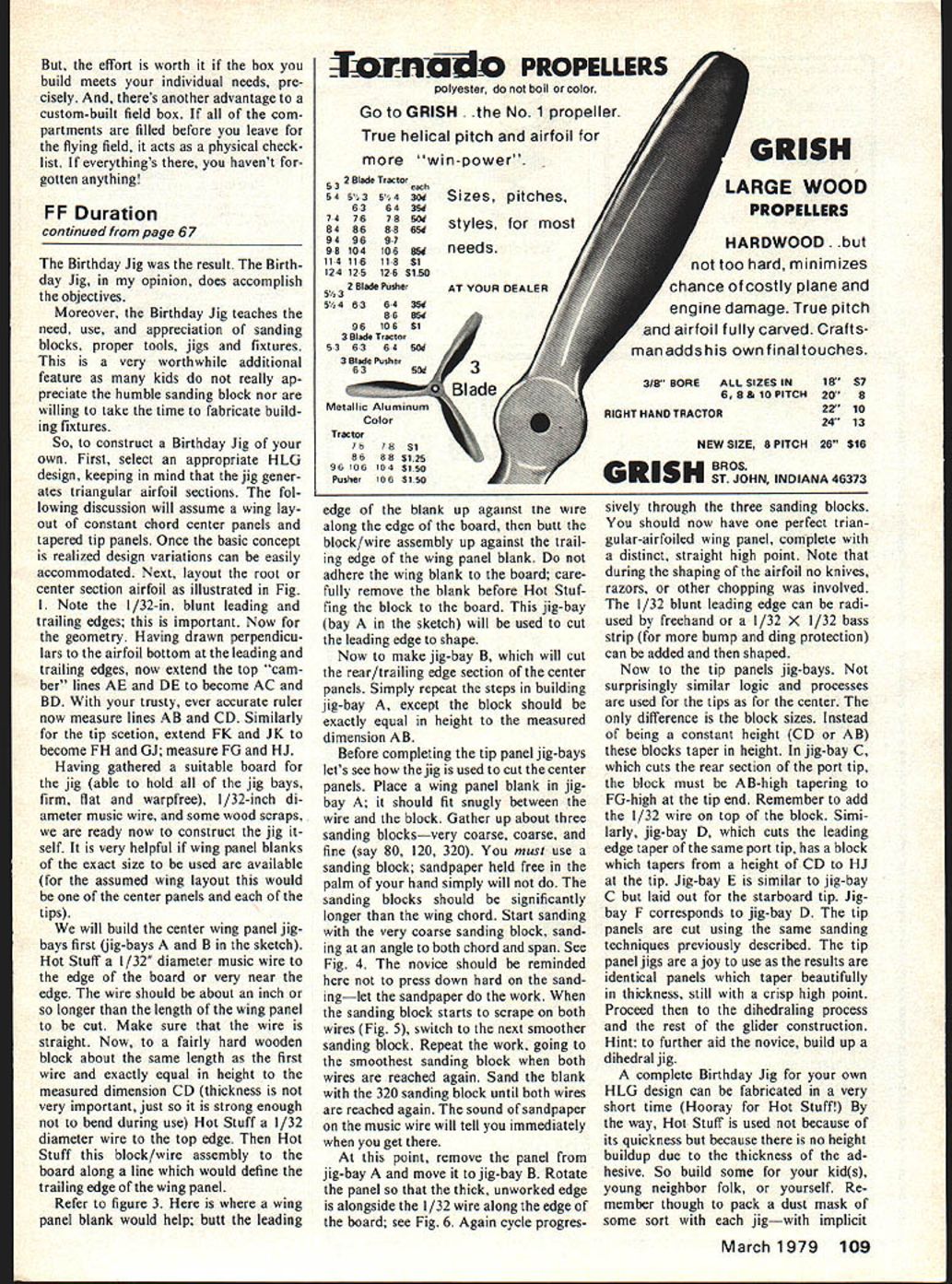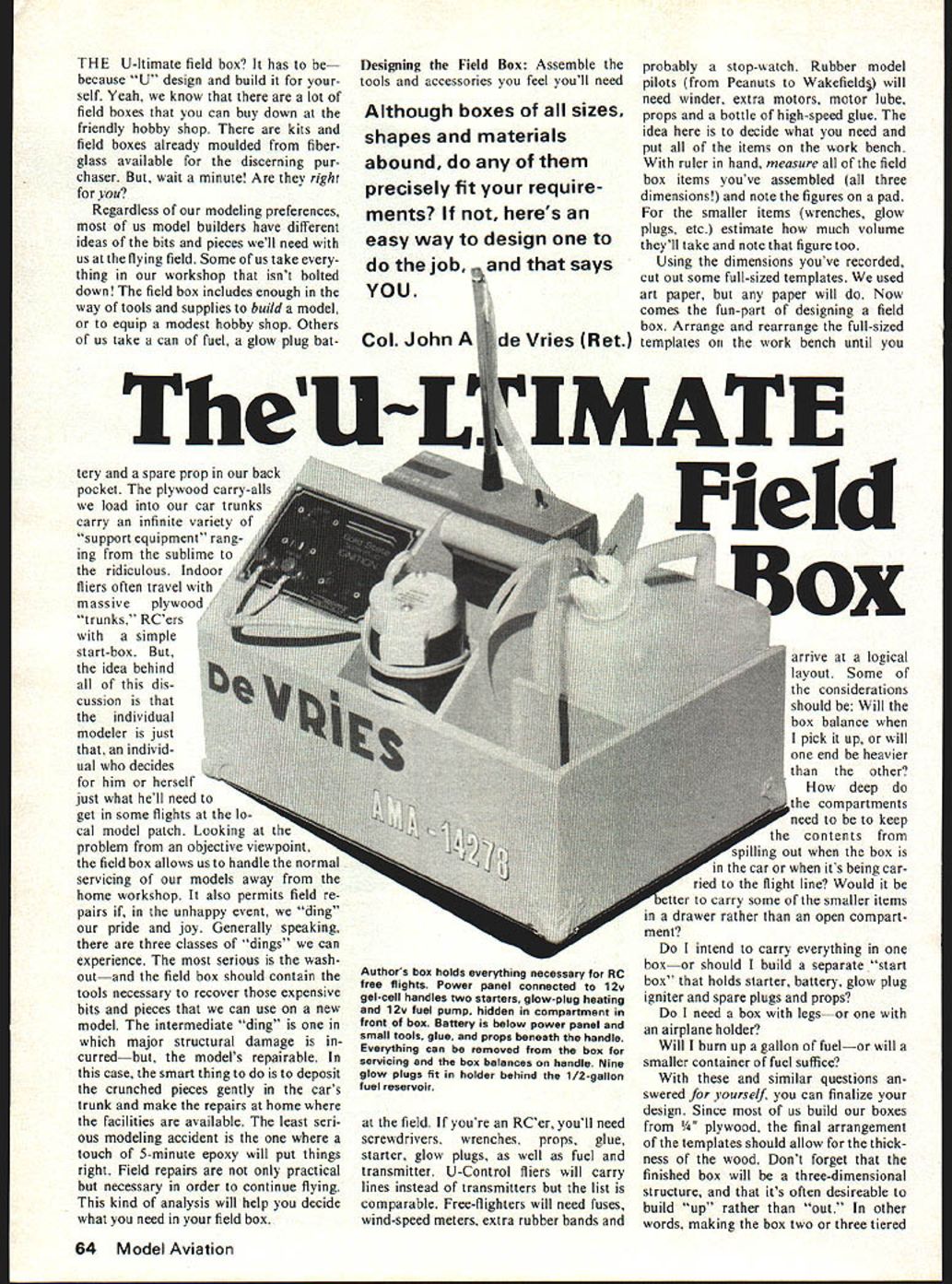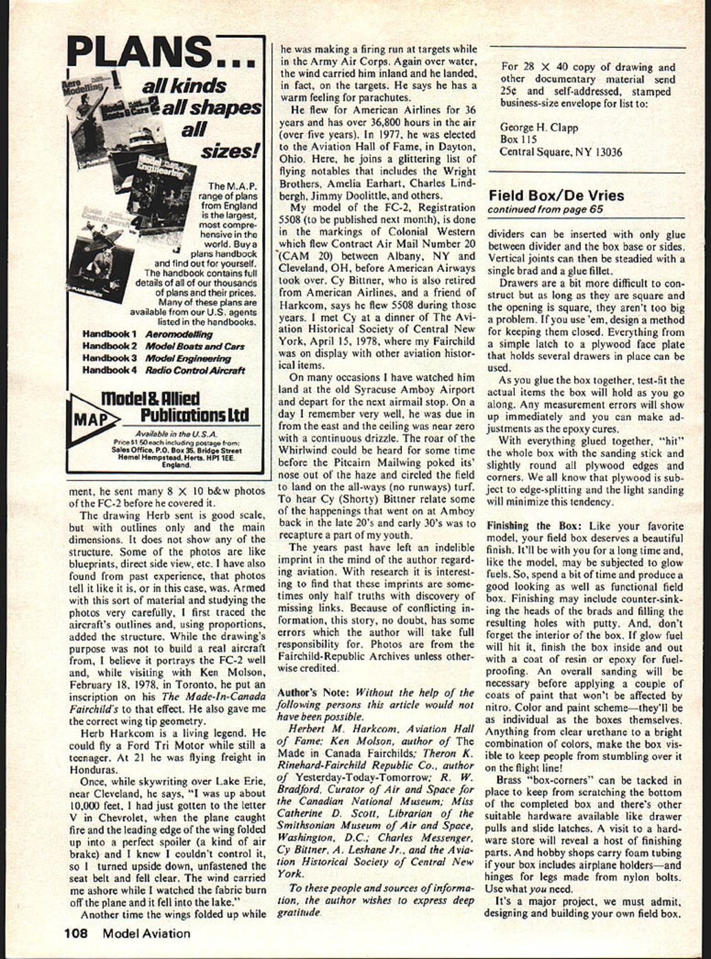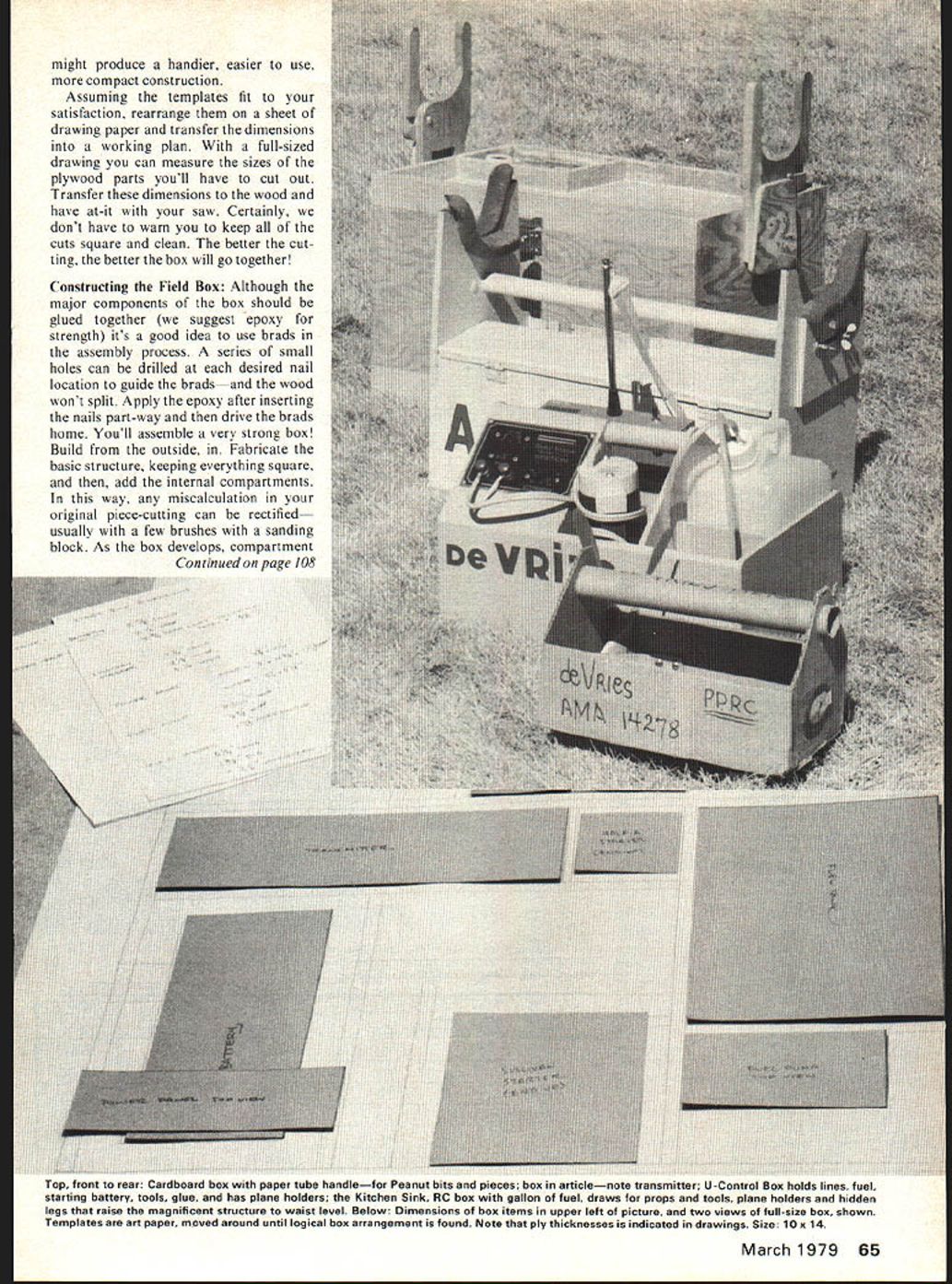 THE U-ltimate field box has because U design build self Yeah know lot field boxes can buy down friendly hobby shop kits field boxes already moulded fiber glass available discerning pur chaser wait minute Are right Regardless modeling preferences us model builders have different ideas bits pieces well need us flying field Some us take thing workshop isnt bolted down field box includes enough way tools supplies build model equip modest hobby shop Others us take can fuel glow plug bat tery spare prop back pocket plywood carry-ails load car trunks carry infinite variety support equipment rang ing sublime ridiculous Indoor fliers often travel massive trunks RCers simple start-box idea behind dis cussion individual modeler just individ ual decides him herself just what hell need get some flights lo cal model patch Looking problem objective viewpoint field box allows us handle normai servicing models away home workshop also permits field re pairs unhappy event ding pride joy Generally speaking three classes dings can experience serious wash outand field box should contain tools necessary recover expensive bits pieces can use new model intermediate ding major structural damage curredbut models repsirable case smart thing to deposit crunched pieces gently cars trunk make repairs home facilities available least seri ous modeling accident touch 5-minute epoxy will put things right Field repairs practical necessary order continue flying kind analysis will help decide what need field box Designing Field Box Assemble tools accessories feel youll need Although boxes sizes shapes materials abound precisely fit require ments heres field youre RCer youll need screwdrivers wrenches props glue starter glow plugs well fuel transmitter U-Control fliers will carry lines instead transmitters list comparable Free-fighters will need fuses wind-speed meters extra rubber bands probably stop-watch Rubber model pilots Peanuts Wakefield will need winder extra motors motor lube props bottle high-speed glue idea decide what need put items work bench ruler hand measure field box items youve assembled three dimensions note figures pad smaller items wrenches glow plugs etc estimate much volume theyll take note figure too Using dimensions youve recorded cut out some full-sized templates used art paper paper will Now comes fun-part designing field box Arrange rearrange full-sized templates work bench until arrive logical layout Some considerations should Will box balance pick up will end heavier other deep compartments need to keep e contents out box car its being car ried flight line Would carry some smaller items drawer rather open compart ment intend carry everything boxor should build separate start box holds starter battery glow plug igniter spare plugs props need box legsor airplane holder Will burn up gallon fuelor will smaller container fuel suffice similar questions swered yourself can finalize design Since us build boxes 1/4 plywood final arrangement templates should allow thick ness wood Dont forget finished box will three-dimensional structure its often desireable build up rather out other words making box two three tiered 64 Model Aviation easy way design says TheW MATE Authors box holds everything necessary RC free flights Power panel connected 12v gel-cell handles two starters glow-plug heating 12v fuel pump hidden compartment front box Battery below power panel small tools glue props beneath handle Everything can removed box servicing box balances handle Nine glow plugs fit holder behind 1/2-gallon fuel reservoir might produce handier easier use compact construction Assuming templates fit satisfaction rearrange sheet drawing paper transfer dimensions working plan full-sized drawing can measure sizes plywood parts youll have cut out Transfer dimensions wood have at-it saw Certainly dont have warn keep cuts square clean better cut ting better box will go together Constructing Field Box Although major components box should glued together suggest epoxy strength its good idea use brads assembly process series small holes can drilled desired nail location guide brads wood wont split Apply epoxy after inserting nails part-way drive brads home Youll assemble very strong box Build outside Fabricate basic structure keeping everything square add internal compartments way miscalculation original piece-cutting can rectified usually few brushes sanding block As the box develops compartment Continued page 108 Top front rear Cardboard box paper tube handlefor Peanut bits pieues box articlenote iransmitter u-Lonrrol uox noias lines fuel starting battery tools glue has plane holders Kitchen Sink RC box gallon fuel draws props tools plane holders hidden legs raise magnificent structure waist level Below Dimensions box items upper left picture two views full-size box shown Templates art paper moved around until logical box arrangement found Note ply thicknesses indicated drawings Size 10 x 14 March 1979 65 PLANS7 MAP range plans England largest compre hensive world Buya s handbook find out yourself handbook contains full details of thousands plans prices plans available US agents listed handbooks Handbook 1 Aeromodeiling Handbook 2 Modal Boats Cars Handbook 3 Model Engineering Handbook 4 Radio ConfroiAirciaft model & Allied MAPPubliwtion5 Ltd Avadable/ntheUSA Price $150 etch including postage Sales Office PO Box 35 Bridge Street emel Hempatead Herts HP1 lEE 1HEngland ment sent 8 X 10 b&w photos FC-2 before covered drawing Herb sent good scale outlines main dimensions does show structure Some photos like blueprints direct side view etc have also found past experience photos tell like case Armed sort material studying photos very carefully first traced aircrafts outlines using proportions added structure drawings purpose build real aircraft believe portrays FC-2 well visiting Ken Molson February 18 1978 Toronto put inscription Made-In-Canada Fairchilds effect also gave correct wing tip geometry Herb Harkcom living legend could fly