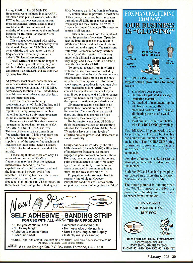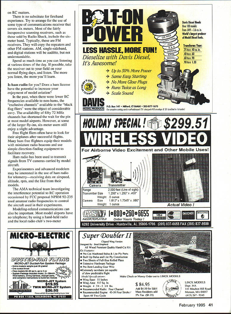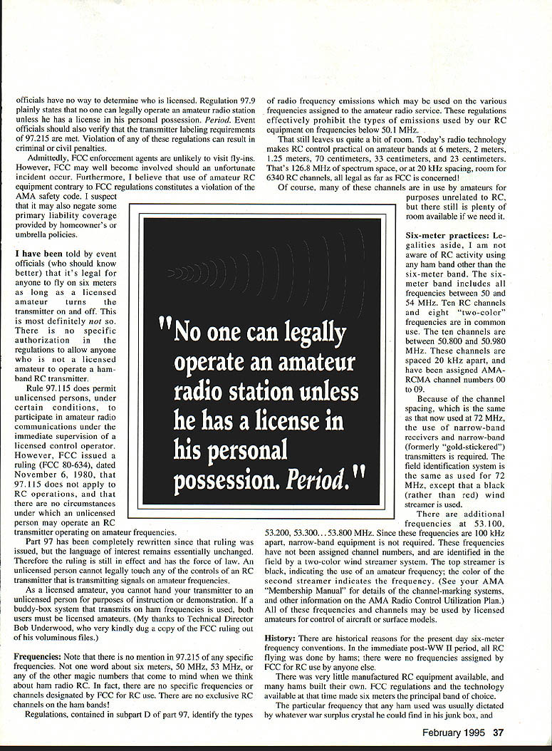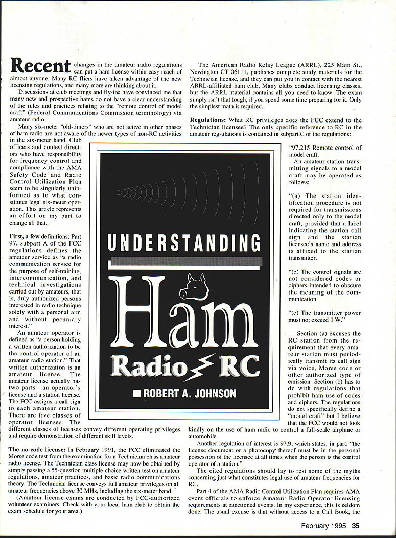 Recen t changes amateur radio regulations can put ham license within easy reach almost anyone RC fliers have taken advantage new licensing regulations thinking about Discussions club meetings fly-ins have convinced new prospective hams have clear understanding rules practices relating remote control model craft Federal Communications Commission terminology via amateur radio six-meter old-timers active other phases ham radio aware newer types non-RC activities six-meter band Club officers contest direct ors have responsibility frequency control compliance AMA Safety Code Radio Control Utilization Plan seem singularly unin formed what con stitutes legal six-meter oper ation article represents effort part change First few definitions Part 97 subpart FCC regulations defines amateur service radio communication service purpose self-training intercommunication technical investigations carried out amateurs duly authorized persons interested radio technique solely personal aim pecuniary interest An amateur operator defined person holding written authorization control operator amateur radio station written authorization amateur license amateur license actually has two partsan operators license station license FCC assigns call sign amateur station five classes operator licenses different classes licenses convey different operating privileges require demonstration different skill levels no-code license February 1991 FCC eliminated Morse code test examination Technician class amateur radio license Technician class license may now obtained simply passing 55-question multiple-choice written test amateur regulations amateur practices basic radio communications theory Technician license conveys full amateur privileges amateur frequencies above 30 MHz including six-meter band Amateur license exams conducted FCC-authorized volunteer examiners Check local ham club obtain exam schedule area American Radio Relay League ARRL 225 Main St Newington CT 06111 publishes complete study materials Technician license can put contact nearest ARRL-affiliated ham club clubs conduct licensing classes ARRL material contains need know exam simply isnt tough spend some time preparing Only simplest math required Regulations What RC privileges does FCC extend Technician licensee specific reference RC amateur reg-ulations contained subpart C regulations 972 15 Remote control model craft An amateur station trans mitting signals model craft may operated follows station iden tification procedure required transmissions directed model craft provided label indicating station call sign station licensees name address affixed station transmitter b control signals considered codes ciphers intended obscure meaning com munication c transmitter power must exceed 1 W Section excuses RC station re quirement ama teur station must period ically transmit its call sign via voice Morse code other authorized type emission Section b has regulations prohibit ham use codes ciphers regulations specifically define model craft believe FCC would look kindly use ham radio control full-scale airplane automobile Another regulation interest 979 states part license document photocopy thereof must personal possession licensee times person control operator station cited regulations should lay rest some myths concerning just what constitutes legal use amateur frequencies RC Part 4 AMA Radio Control Utilization Plan requires AMA event officials enforce Amateur Radio Operator licensing requirements sanctioned events experience seldom done usual excuse access Call Book February 1995 35 officials have no way determine licensed Regulation 979 plainly states no can legally operate amateur radio station unless has license personal possession Period Event officials should also verify transmitter labeling requirements 97215 met Violation of regulations can result criminal civil penalties Admittedly FCC enforcement agents unlikely visit fly-ins However FCC may well become involved should unfortunate incident occur Furthermore believe use amateur RC equipment contrary FCC regulations constitutes violation AMA safety code suspect may also negate some primary liability coverage provided homeowners umbrella policies have told event officials should know better its legal anyone fly six meters long licensed amateur turns transmitter off definitely no specific authorization regulations allow anyone licensed amateur operate hamband RC transmitter Rule 97115 does permit unlicensed persons under certain conditions participate amateur radio communications under immediate supervision licensed control operator However FCC issued ruling FCC 80-634 dated November 6 1980 97115 does apply RC operations no circumstances under unlicensed person may operate RC transmitter operating amateur frequencies Part 97 has completely rewritten since ruling issued language interest remains essentially unchanged Therefore ruling still effect has force law An unlicensed person cannot legally touch controls RC transmitter transmitting signals amateur frequencies As licensed amateur cannot hand transmitter unlicensed person purposes instruction demonstration buddy-box system transmits ham frequencies used both users must licensed amateurs thanks Technical Director Bob Underwood very kindly dug copy FCC ruling out voluminous files Frequencies Note no mention 97215 specific frequencies word about six meters 50 MHz 53 MHz other magic numbers come mind think about ham radio RC fact no specific frequencies channels designated FCC RC use no exclusive RC channels ham bands Regulations contained subpart D part 97 identify types radio frequency emissions may used various frequencies assigned amateur radio service regulations effectively prohibit types emissions used RC equipment frequencies below 501 MHz still leaves us quite bit room Todays radio technology makes RC control practical amateur bands 6 meters 2 meters 125 meters 70 centimeters 33 centimeters 23 centimeters Thats 1268 MHz spectrum space 20 kHz spacing r