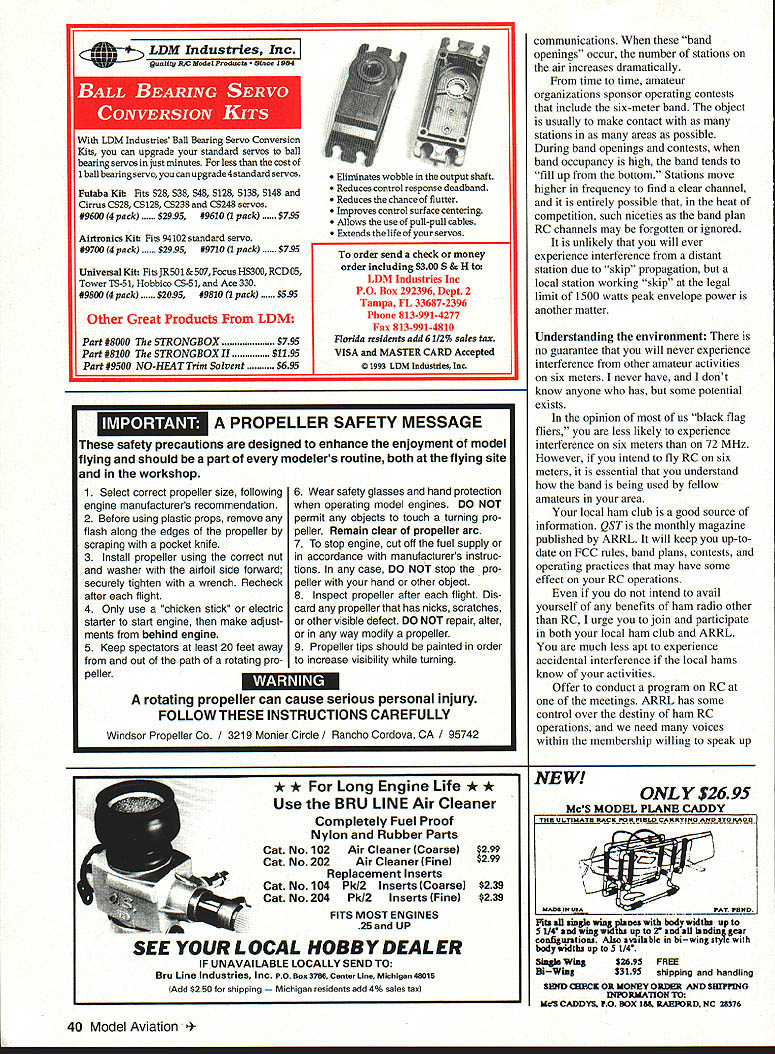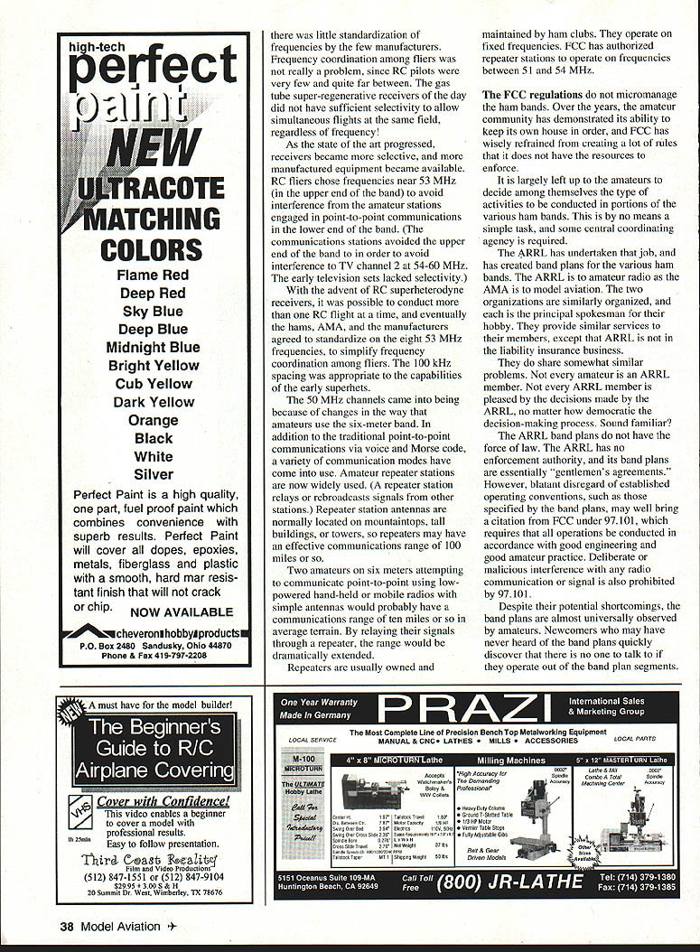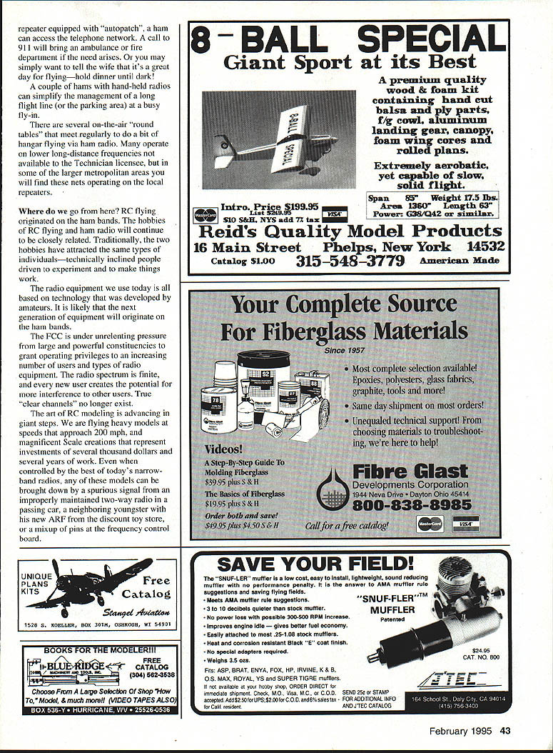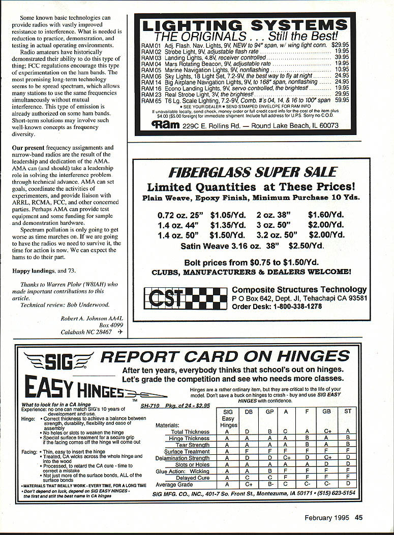 Recen t changes amateur radio regulations can put ham license within easy reach almost anyone RC fliers have taken advantage new licensing regulations thinking about Discussions club meetings fly-ins have convinced new prospective hams have clear understanding rules practices relating remote control model craft Federal Communications Commission terminology via amateur radio six-meter old-timers active other phases ham radio aware newer types non-RC activities six-meter band Club officers contest direct ors have responsibility frequency control compliance AMA Safety Code Radio Control Utilization Plan seem singularly unin formed what con stitutes legal six-meter oper ation article represents effort part change First few definitions Part 97 subpart FCC regulations defines amateur service radio communication service purpose self-training intercommunication technical investigations carried out amateurs duly authorized persons interested radio technique solely personal aim pecuniary interest An amateur operator defined person holding written authorization control operator amateur radio station written authorization amateur license amateur license actually has two partsan operators license station license FCC assigns call sign amateur station five classes operator licenses different classes licenses convey different operating privileges require demonstration different skill levels no-code license February 1991 FCC eliminated Morse code test examination Technician class amateur radio license Technician class license may now obtained simply passing 55-question multiple-choice written test amateur regulations amateur practices basic radio communications theory Technician license conveys full amateur privileges amateur frequencies above 30 MHz including six-meter band Amateur license exams conducted FCC-authorized volunteer examiners Check local ham club obtain exam schedule area American Radio Relay League ARRL 225 Main St Newington CT 06111 publishes complete study materials Technician license can put contact nearest ARRL-affiliated ham club clubs conduct licensing classes ARRL material contains need know exam simply isnt tough spend some time preparing Only simplest math required Regulations What RC privileges does FCC extend Technician licensee specific reference RC amateur reg-ulations contained subpart C regulations 972 15 Remote control model craft An amateur station trans mitting signals model craft may operated follows station iden tification procedure required transmissions directed model craft provided label indicating station call sign station licensees name address affixed station transmitter b control signals considered codes ciphers intended obscure meaning com munication c transmitter power must exceed 1 W Section excuses RC station re quirement ama teur station must period ically transmit its call sign via voice Morse code other authorized type emission Section b has regulations prohibit ham use codes ciphers regulations specifically define model craft believe FCC would look kindly use ham radio control full-scale airplane automobile Another regulation interest 979 states part license document photocopy thereof must personal possession licensee times person control operator station cited regulations should lay rest some myths concerning just what constitutes legal use amateur frequencies RC Part 4 AMA Radio Control Utilization Plan requires AMA event officials enforce Amateur Radio Operator licensing requirements sanctioned events experience seldom done usual excuse access Call Book February 1995 35 officials have no way determine licensed Regulation 979 plainly states no can legally operate amateur radio station unless has license personal possession Period Event officials should also verify transmitter labeling requirements 97215 met Violation of regulations can result criminal civil penalties Admittedly FCC enforcement agents unlikely visit fly-ins However FCC may well become involved should unfortunate incident occur Furthermore believe use amateur RC equipment contrary FCC regulations constitutes violation AMA safety code suspect may also negate some primary liability coverage provided homeowners umbrella policies have told event officials should know better its legal anyone fly six meters long licensed amateur turns transmitter off definitely no specific authorization regulations allow anyone licensed amateur operate hamband RC transmitter Rule 97115 does permit unlicensed persons under certain conditions participate amateur radio communications under immediate supervision licensed control operator However FCC issued ruling FCC 80-634 dated November 6 1980 97115 does apply RC operations no circumstances under unlicensed person may operate RC transmitter operating amateur frequencies Part 97 has completely rewritten since ruling issued language interest remains essentially unchanged Therefore ruling still effect has force law An unlicensed person cannot legally touch controls RC transmitter transmitting signals amateur frequencies As licensed amateur cannot hand transmitter unlicensed person purposes instruction demonstration buddy-box system transmits ham frequencies used both users must licensed amateurs thanks Technical Director Bob Underwood very kindly dug copy FCC ruling out voluminous files Frequencies Note no mention 97215 specific frequencies word about six meters 50 MHz 53 MHz other magic numbers come mind think about ham radio RC fact no specific frequencies channels designated FCC RC use no exclusive RC channels ham bands Regulations contained subpart D part 97 identify types radio frequency emissions may used various frequencies assigned amateur radio service regulations effectively prohibit types emissions used RC equipment frequencies below 501 MHz still leaves us quite bit room Todays radio technology makes RC control practical amateur bands 6 meters 2 meters 125 meters 70 centimeters 33 centimeters 23 centimeters Thats 1268 MHz spectrum space 20 kHz spacing r