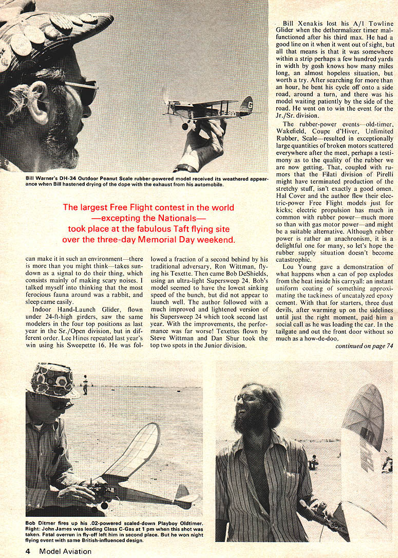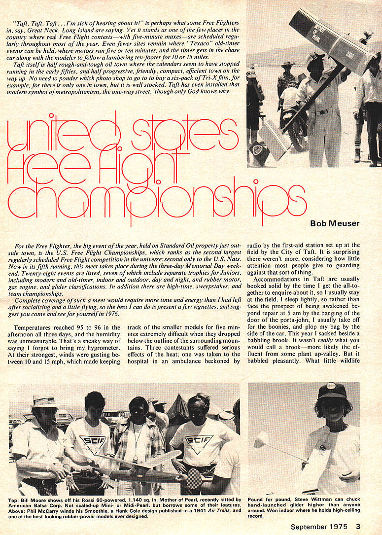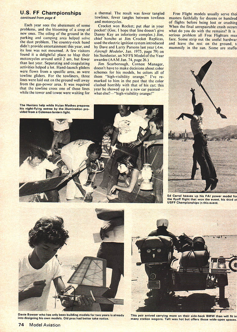 Taft Taft Taft ick hearing about perhaps what some Free Flighters say Great Neck Long Island saying Yet stands few places country real Free Flight contestswith five-minute maxesare scheduled regu larly throughout year fewer sites remain Texaco old-timer events can held motors run five ten minutes timer gets chase car along modeler follow lumbering ten -footer JO IS miles Taft itself half rough-and-tough oil town calendars seem have stopped running early fifties half progressive friendly compact efficient town way up No need ponder photo shop go to buy six-pack Tri-Xftlmfor example town well stocked Taft has installed modern symbol metropolitan ism one-way street though God knows 1e5 e om Free Flight er big event year held Standard Oil property just out side town US Free Flight Championships ranks second largest regularly scheduled Free Flight competition universe second US Nats Now its fifth running meet takes place during three-day Memorial Day week end Twenty-eight events listed seven include separate trophies Juniors including modern old-timer indoor outdoor day night rubber motor gas engine glider classifications addition high-time sweepstakes team championships Complete coverage such meet would require time energy left after socializing little flying best can present afew vignettes sug gest come see yourself 1976 Temperatures reached 95 96 afternoon three days humidity unmeasurable Thats sneaky way saying forgot bring hygrometer strongest winds gusting tween 10 15 mph made keeping track smaller models five min utes extremely difficult dropped below outline surrounding moun tains Three contestants suffered serious effects heat taken hospital ambulance beckoned Bob Meuser radio first-aid station set up field City Taft surprising werent considering little attention people give guarding against sort thing Accommodations Taft usually booked solid time get all-to gether enquire about usually stay field sleep lightly rather face prospect being awakened yond repair 5 am banging door porta-john usually take off boonies plop bag side car year sacked beside babbling brook wasnt really what would call brookmore likely ef fluent some plant up-valley babbled pleasantly What little wildlife September 1975 3 Top Bill Moore shows off Hossi 60-powered 1141 sq Mother Ot rear recently ittea Pound pound Steve Wittman can chuck American Balsa Corp scaledup Mini MidiPearl borrows some features hand-launched glider higher anyone Above Phil McCarry winds Smoothie Hank Cole design published 1941 Air Trails around Won indoor holds high-ceiling best looking rubber-power models ever designed record Bill Warners DH-34 Outdoor Peanut Scale rubber-powered model received its weathered appear ance Bill hastened drying dope exhaust automobile largest Free Flight contest world excepting Nationals took place fabulous Taft flying site over three-day Memorial Day weekend can make such environmentthere might think takes sun down signal thing consists mainly making scary noises talked myself thinking ferocious fauna around rabbit sleep came easily Indoor Hand-Launch Glider flown under 24-ft-high girders saw same modelers four top positions last year Sr/Open division dif ferent order Lee Hines repeated last years win using Sweepette 16 fol lowed fraction second behind traditional adversary Ron Wittman fly ing Texette came Bob DeShields using ultra-light Supersweep 24 Bobs model seemed have lowest sinking speed bunch did appear launch well author followed much improved lightened version Supersweep 24 took second last year improvements perfor mance far worse Texettes flown Steve Wittman Dan Sbur took top two spots Junior division Bill Xenakis lost A/I Towline Glider dethermalizer timer mal functioned after third max good line went out sight means somewhere within strip perhaps few hundred yards width gosh knows miles long almost hopeless situation worth try After searching hour bent cycle off onto side road around turn model waiting patiently side road went win event Jr/Sr division rubber-power events old-timer Wakefield Coupe dHiver Unlimited Rubber Scaleresulted exceptionally large quantities broken motors scattered everywhere after meet perhaps testi mony quality rubber now getting coupled ru mors Filati division Pirelli might have terminated production stretchy stuff isnt exactly good omen Hal Cover author flew elec tric-power Free Flight models just kicks electric propulsion has much common rubber power much gas motor powerand might suitable alternative Although rubber power rather anachronism delightful lets hope rubber supply situation doesnt become catastrophic Lou Young gave demonstration what happens can pop explodes heat inside carryall instant uniform coating something approxi mating tackiness uncatalyzed epoxy cement starters three dust devils after warming up sidelines until just right moment paid him social call loading car tailgate out front door much how-de-doo continued page 74 4 Model Aviation Bob Ditmer fires up 02-powered scaled-down Playboy Oldtimer Right John James leading Class C-Gas 1 pm shot taken Fatal overrun fly-off left him second place ha won night flying event same British-influenced design US FF Championships continued page 4 year sees abatement some problems blooming crop new ones oiling ground parking camping area helped solve dust problem country-rock band didnt provide entertainment year its loss mourned few visitors found delightful place blap motorcycles around until 2 am fewer last year Separating coagulating activities helped lot Hand-launch gliders flown specific area towline gliders towliners three lines laid out ground well away gas-power area required towline cross lines tower towee waiting thermal result fewer tangled towlines fewer tangles between towlines motorcycles Crocket won Rocket put pocket Gee hope line doesnt give Danny Kay inferiority complex Jim chief honcho Jim Crocket Replicas used electric ignition system introduced Dave Larry Parsons last year Am Aircraft Modeler J