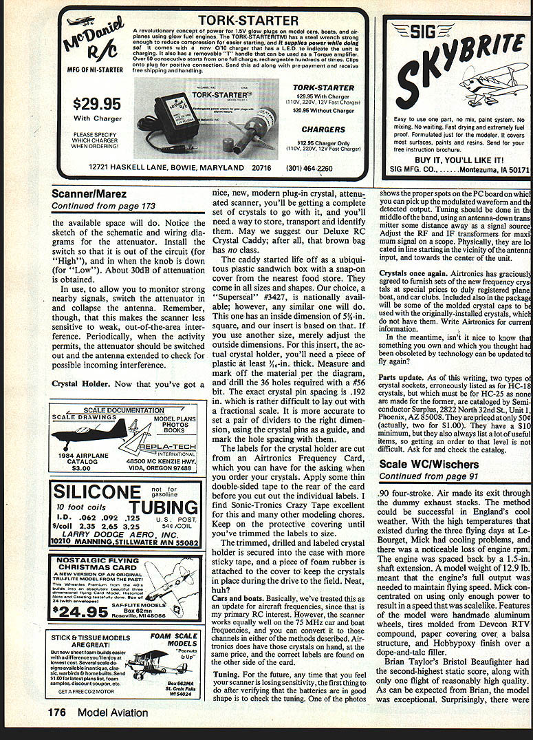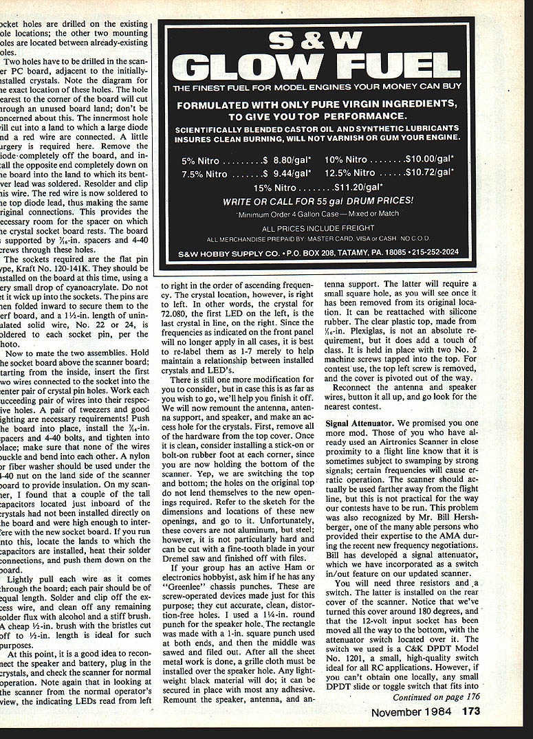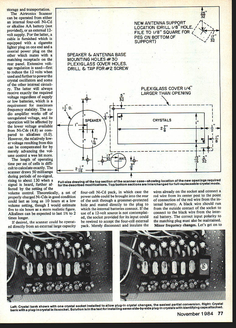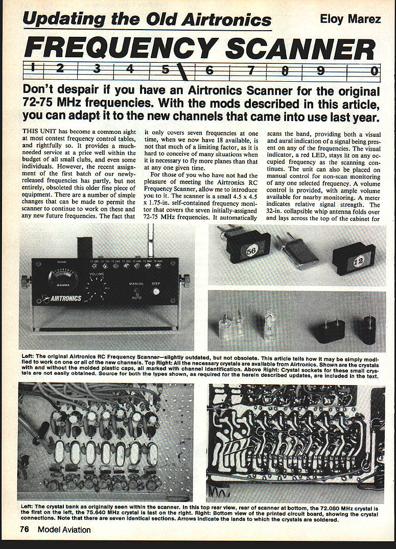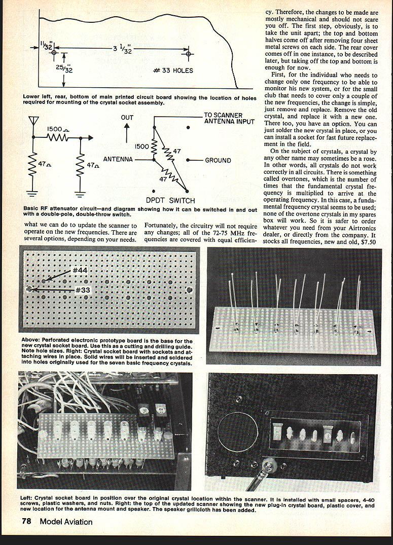 Updating Old Airtronics Eloy Marez FREQUENCY SCANNER IpIIIII Dont despair have Airtronics Scanner original 72-75 MHz frequencies mods described article can adapt new channels came use last year THIS UNIT has become common sight contest frequency control tables rightfully provides muchneeded service price well within budget small clubs some individuals However recent assign ment first batch newlyreleased frequencies has partly entirely obsoleted older fine piece equipment number simple changes can made permit scanner continue work new future frequencies fact covers seven frequencies time now have 18 available much limiting factor hard conceive situations necessary fly planes given time have pleasure meeting Airtronics RC Frequency Scanner allow introduce scanner small 45 x 45 x 175-in self-contained frequency moni tor covers seven initially-assigned 72-75 MHz frequencies automatically scans band providing both visual aural indication signal being pres ent frequencies visual indicator red LED stays lit oc cupied frequency scanning con tinues unit can also placed manual control non-scan monitoring selected frequency volume control provided ample volume available nearby monitoring meter indicates relative signal strength 32-in collapsible whip antenna folds over lays across top cabinet Left The original Airtronics RC Frequency Scannerslightly outdated obsolete article tells may simply modi fled work new channels Top Right necessary crystals available Airtronics Shown crystals molded plastic caps marked channel identification Above Right Crystal sockets smali crys tals easiiy obtained Source both types shown required herein described updates inciuded text Left The crystal bank originally seen within scanner top rear view rear scanner Donom 720W MHZ crystal first left 75640 MHz crystal last right Right Bottom view printed circuit board showing crystal connections Note seven identical sections Arrows indicate lands crystals soldered 76 Model Aviation storage transportation Airtronics Scanner can operated either internal four-6ell Ni-Cd alkaline AA battery provided external 12volt supply latter cable furnished equipped cigarette lighter plug end coaxial power plug other mates matching receptacle rear panel Extensive volt age regulation usedfirst reduce 12 volts used further power crystal oscillat6rs some other internal circuit- ry latter will always receive exactly required voltage regardless supply low batteries requirement maximum frequency stability au dio amplifier works off unregulated voltage its operation will affected lower voltage available Ni-Cds 48 com pared alkalines 60 However relatively low er voltage resulting can compensated merely advancing vol ume control wee bit length operating time per set cells diffi cult calculate exactly scanner draws 50 milliamps during periods no-signal rising about 130 whei signal heard further af fected setting volume control Theoretically set properly charged Ni-Cds good condition could last long 10 hours low volume setting though would estimate five six hours realistic figure Alkalines can expected last 1 2 times longer desired scanner could operat ed directly external large capacity 32 NEW ANTENNA SUPPRT LOCATION DRILL 1/8 HOLE // FILE TO I/B SQUARE FOR ONBOTTOMOFN i7 SUPPORTN/ 32 SPEAKER & ANTENNA BASE MOUNTING HO LES #30 PLEXIGLASS COVER HOLES DRILL & TAP FOR #2 SCREW PLEXIGLASS COVER 1/4 LARGER THAN OPENING 11D EAKER L____1 CRYSTALS - S 15 . ii 32 1 2 Full-size drawing top section scanner caseshowing location new openings required described modifications Top/bottom sections interchanged full-replaceable-Orystai mods four-cell Ni-Cd pack case power cable could brought rear unit through grommet-protected hole mated directly plug internal batteries connect use 12-volt source contemplat ed socket provided its input could rewired accept four-cell external pack Merely disconnect insulate wires already socket connect red wire its center post point connection red wire ternal battery black wire should run outside contact socket connect black wire inter nal battery correct input polarity matching plug must also maintained Minor frequency changes Lets get Left Crystal bank shown crystal socket installed allow plug-in crystal changes easiest partial conversion Right Crystai bankwlth plug-in crystal itssocket Solution thetext installing seven side-by-side plug-in crystalswith identifying capsattached November 1984 77 Lower left rear bottom main printed circuit board showing location holes required mounting crystal socket assembly 470 II OUTTO SCANNER ANTENNA INPUT I5OO~ ANTENNA 47\ DPDT SWITCH Basic RF attenuator circuitand diagram showing can switched out double-pole double-throw switch what can update scanner operate new frequencies several options depending needs Fortunately circuitry will require changes 72-75 MHz fre quencies covered equal efficien -- GROUND cy Therefore changes made mostly mechanical should scare off first step obviously take unit apart top bottom halves come off after removing four sheet metal screws side rear cover comes off instance described later taking off top bottom enough now First individual needs change frequency able monitor new system small club needs cover couple new frequencies change simple just remove replace Remove old crystal replace new too have option can just solder new crystal place can install socket fast future replace ment field subject crystals crystal other name may sometimes rose other words crystals work correctly circuits something called overtones number times fundamental crystal fre quency multiplied arrive operating frequency case funda mental frequency crystal seems used overtone crystals spares box will work So safer order whatever need Airtronics dealer directly company stocks frequencies new old $750 Left Crystal socket board position over original crystal location within scanner installed small spacers 4-40 screws piastic washers nuts Right top updated scanner showing new plug-In crystal board plas