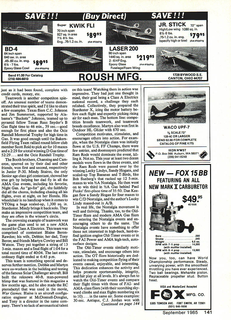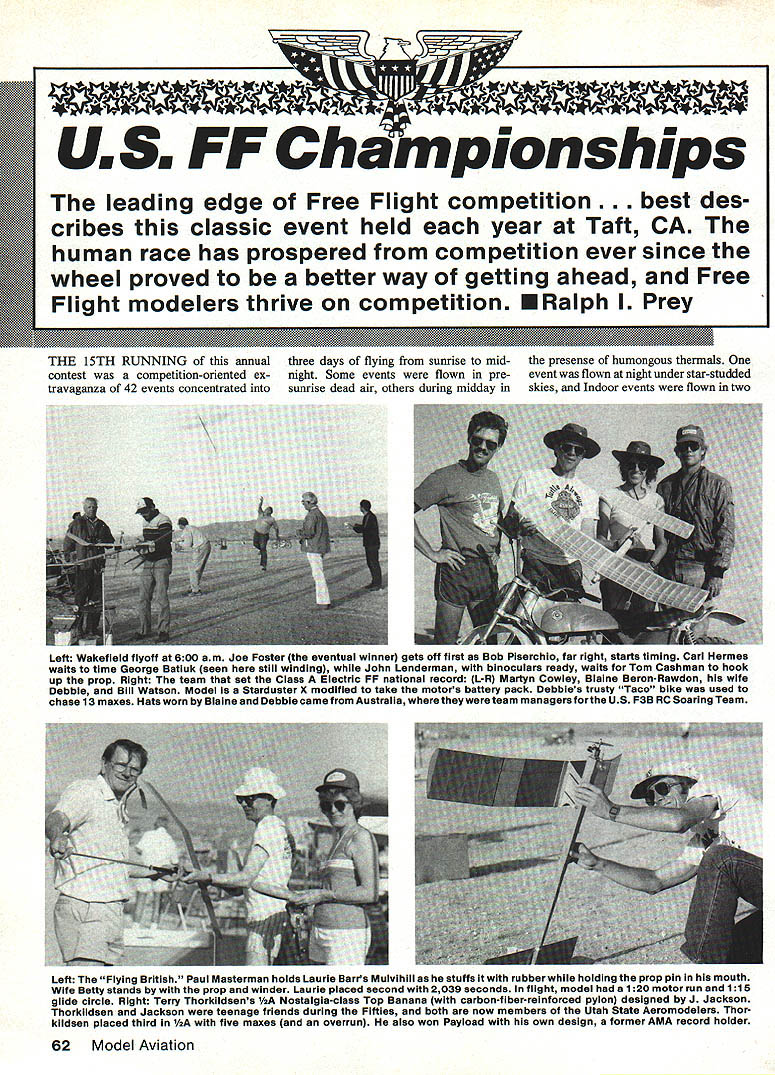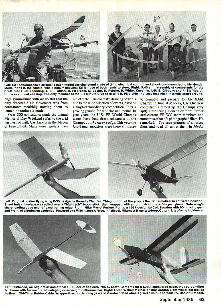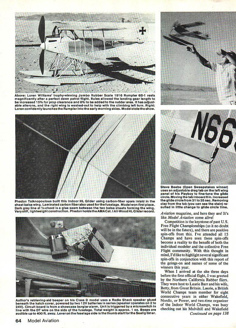 the presense humongous thermals event flown night under star-studded skies Indoor events flown two Left Wakefield flyoff 600 am Joe Foster eventual winner gets off first Bob Piserchia far right starts timing Carl Hermes waits time George Batiuk seen stiii winding whiie John Lenderman binocuiars ready waits Tom Cashman hook up prop Right team set Class Eiectric PP national record L-R Martyn Cowiey Bialne Beron-Rawdon wife Debbie Bill Watson Model Starduster X modified take motors battery pack Debbies trusty Taco bike used chase 13 maxes Hats worn Blame Debbie came Australia wheretheywereteam managers forthe US F3B RC Soaring Team Left The Flying British Paul Masterman holds Laurie Barrs Muivihill stuffs rubber holding prop pin mouth Wife Betty stands prop winder Laurie placed second 2039 seconds flight model 120 motor run 115 glide circle Right Terry Thorkiidsens Nostalgia-class Top Banana carbon-fiber-reinforced pylon designed J Jackson Thorkildsen Jackson teenage friends during Fifties both now members Utah State Aeromodelers Thor kildsen placed third 1/2A five maxes overrun also won Payload own design former AMA record holder 62 Model Aviation UM & FF Championships leading edge Free Flight competition. best des cribes classic event held year Taft CA human race has prospered competition ever since wheel proved better way getting ahead Free Flight modelers thrive competition U Ralph Prey THE 15TH RUNNING annual three days flying sunrise midcontest competition-oriented ex- night Some events flown pre travagauza 42 events concentrated sunrise dead air others during midday Left Ed Tschernoschas original design model carrying siano made OT y2-lfl eieciricai conaui ana snocK-cord-mounted Honda Model rides saddle like baby allowing Ed full use both hands steer Right 545 am assembly contestants Six-Minute Club Standing L-R J Quinn R Piserchio S Beebe R Rohrke R White Kneeling L-R B Gibbons R Siefried Al Uim still out chasing member Six-Minute Club date R Plserchiono easy feat thermals arent around huge gymnasiums air still detectable air movement contestants stealthily moving about launch retrieve model Over 300 contestants made annual Memorial Day Weekend safari arid vastness Taft CA known Mecca Free Flight regulars out state contests drawing power due wide selection events plus always-extraordinary competition proving ground modeler model past years US FF World Champs teams have held dress rehearsals Champs . razors edge year Old-Timer modelers en masse compete prepare SAM Champs June Madera CA new contestant summed up Champs very aptly after seeing dozen former current FF WC team members numerous other oft-photographed fliers remarked Ive seen pictures fliers read about Model Left Original pusher flying wing P-30 design Barnaby Wainfan Thing front prop dethermalizer activated position Sheet balsa fuselage rolled over high-tech broomstick wrapped old pair wifes pantyhose Note wings sharp leading edge reflexed trailing edge Right Mike Myers Porlock Puffin 1937 design Col Bowden 60-in wingspan 71/2 dihedral side Powered Mills 13cc 078 cu diesel Mike says itwantsto loop Culprit lots wing Incidence Left Driftwood original asymmetrical HL Glider early 70s Steve Geraghty NASAsponsored event Has carbon-fiber tail boom fuse-actuated swinging nose weight dethermalizer Right Loren Williams classic 1932 Gordon Light Wakefield replica heflew Old-Timer RubberCabin Wrapped bamboo landing gearand star-decorated wheels give ita unique personality Beautiful model September 1985 63 Above Loren Williams trophy-winning Jumbo Rubber Scale i9i6 Rumpier 6B-1 rests magnificently after perfect dawn patrol flight Rules allowed landing gear length increased 15% prop clearance 8% added rudder area has adjust able ailerons right wing washed-out help climbing left turn Right Loren confidently launches Rumpier early morning skies Model stole show Authors retrieving-aid beeper Class D model uses Radio Shack speaker glued beneath hatch cover powered two 1 2V batteries series speaker operates 2 24V Circuit board showcase burglar alarm Unit triggered microswitch line DT wire side fuselage Total weight approx 1 oz Beeps audible up 400 ft away Leveron fuselage side isthe thumb startforthe Seelig timer Steve Beebe Open Sweepstakes winner uses adjustable drag tab left wing panel Playboy fine-tune glide circle Moving tab Inboard Bin increased glide circle 31 35 sec Removing clay tab can see stain re suited little change glide circle time Aviation magazine Its like Model Aviation come alive Competition keystone past US Free Flight Championships no doubt will future positive spin-offs Ive attended 15 Champs have seen spin-offs become reality benefit both individual modeler collective Free Flight community thought mind Id like highlight several significant spin-offs conjunction report goings-on names some winners year arrived site three days before first official flight greeted Northern California Rubber fliers host Laurie Barr wife Betty Great Britain Laurie British World Champs team member eight consecutive years either Wakefield Nordic Power two-time organizer Indoor World Champs busy checking out Mulvihill Wakefield Continued page 138 64 Model Aviation .3iknopouious built indoor IlL iIider using carbon-tiber spars inlaid sheet balsa wing Laminated carbon fiberaiso used forthefuselage Model won first place Dark gray line Ia-chord glue seam between two balsa sheets forming wing Very stiff lightweight construction Phedon holds theAMA Cat All-Wood H LOuder record OTS TS RIOR TS T THE MOST SUPERIOR PILOT FIGURE ON THE MARKET LIGHTEST WEIGHT MOST REALISTIC AVAILABLE GIVE YOUR PLANE PILOT FOR YOUR NEWEST OLDEST OR NEXT CREATION R YOURS TOOAYI FULL FIGURES CIVILIANWWII MILITARY 1/3 Scale $19951/5 Navy$1395 1/4 Scale14951/6AAF1195 1/5 Scale1295 Plus 1/12 Scale895 $250 shipping 1/12 Chopper 895each figure KNIGHTS OF THE AIR 7148 Lasting Light Way Columbia MD 21045 301-730-5596 ago present RC Assist compo nent Old-Timers its infancy hew cry 