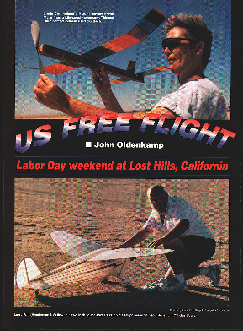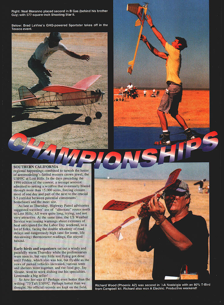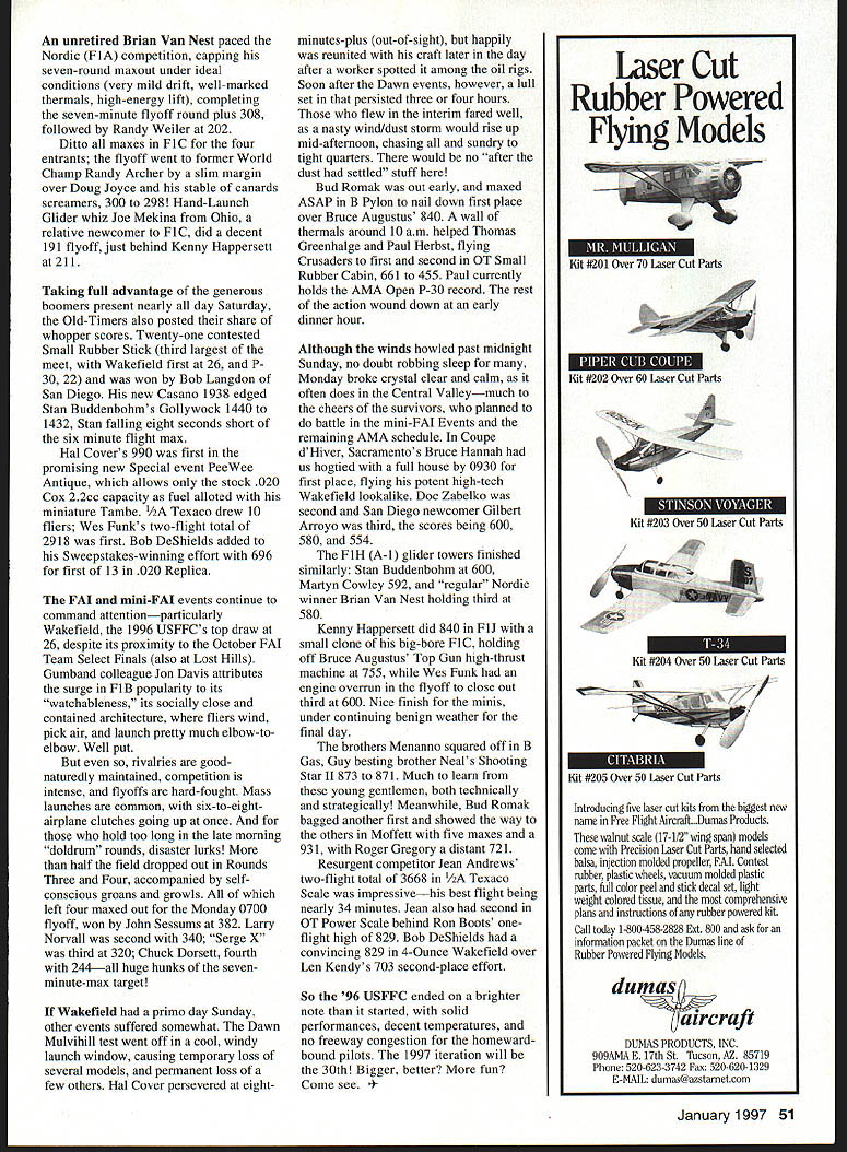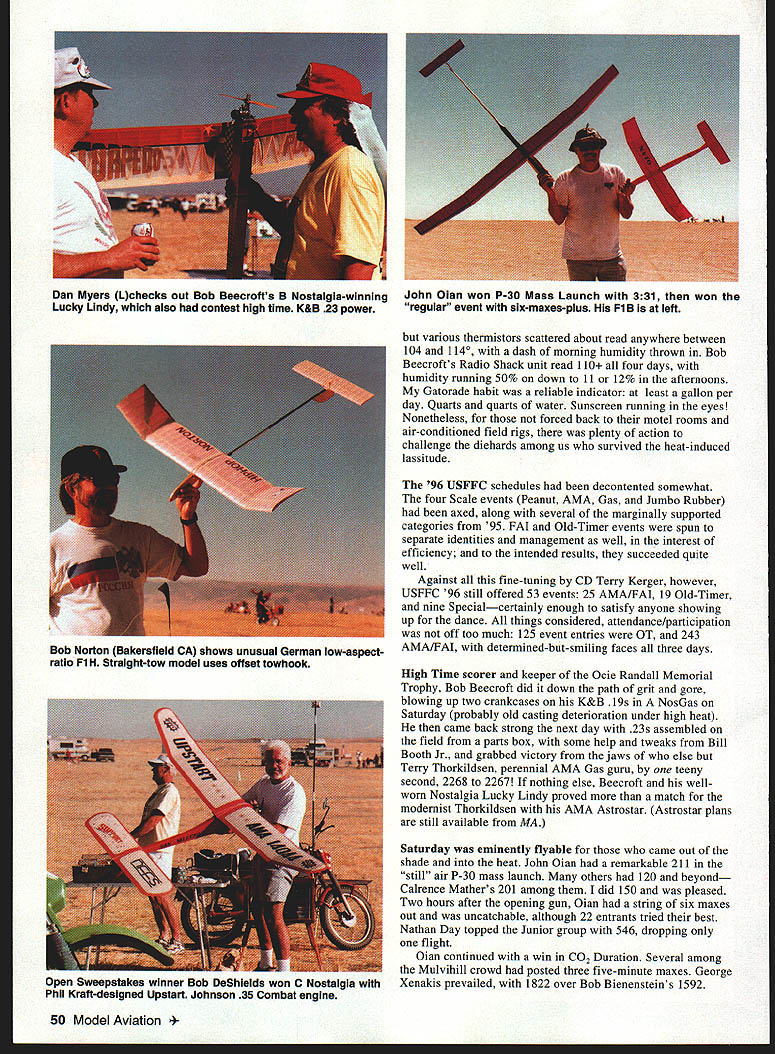 NO OCR TEXT NO OCR TEXT various thermistors scattered about read anywhere between 104 1140 dash morning humidity thrown Bob Beecrofts Radio Shack unit read 110 four days humidity running 50% down 11 12% afternoons Gatorade habit reliable indicator least gallon per day Quarts quarts water Sunscreen running eyes Nonetheless forced back motel rooms air-conditioned field rigs plenty action challenge diehards among us survived heat-induced lassitude 96 USFFC schedules decontented somewhat four Scale events Peanut AMA Gas Jumbo Rubber axed along several marginally supported categories 95 FAI Old-Timer events spun separate identities management well interest efficiency intended results succeeded quite well Against fine-tuning CD Terry Kerger however USFFC 96 still offered 53 events 25 AMA/FAI 19 Old-Timer nine Specialcertainly enough satisfy anyone showing up dance things considered attendance/participation off too much 125 event entries OT 243 AMA/FAI determined-but-smiling faces three days High Time scorer keeper Ocie Randall Memorial Trophy Bob Beecroft did down path grit gore blowing up two crankcases K&B 19s NosGas Saturday probably old casting deterioration under high heat came back strong next day 23s assembled field parts box some help tweaks Bill Booth Jr grabbed victory jaws else Terry Thorkildsen perennial AMA Gas guru teeny second 2268 2267 nothing else Beecroft wellworn Nostalgia Lucky Lindy proved match modernist Thorkildsen AMA Astrostar Astrostar plans still available MA Saturday eminently flyable came out shade heat John Oian remarkable 211 still air P-30 mass launch others 120 beyond Calrence Mathers 201 among did 150 pleased Two hours after opening gun Oian string six maxes out uncatchable although 22 entrants tried best Nathan Day topped Junior group 546 dropping flight Oian continued win CO2 Duration Several among Mulvihill crowd posted three five-minute maxes George Xenakis prevailed 1822 over Bob Bienensteins 1592 50 Model Aviation Myers Lchecks out Bob Beecrofts B Nostalgia-winning Lucky Lindy also contest high time K&B 23 power John Olan won P-30 Mass Launch 331 won regular event six-maxes-plus Fl B left Bob Norton Bakersfield CA shows unusual German low-aspectratio Fl H Straight-tow model uses offset towhook Open Sweepstakes winner Bob DeShields won C Nostalgia Phil Kraft-designed Upstart Johnson 35 Combat engine An unretired Brian Van Nest paced Nordic FlA competition capping seven-round maxout under ideal conditions very mild drift well-marked thermals high-energy lift completing seven-minute flyoff round plus 308 followed Randy Weiler 202 Ditto maxes Fl C four entrants flyoff went former World Champ Randy Archer slim margin over Doug Joyce stable canards screamers 300 298 Hand-Launch Glider whiz Joe Mekina Ohio relative newcomer FiC did decent 191 flyoff just behind Kenny Happersett 211 Taking full advantage generous boomers present nearly day Saturday Old-Timers also posted share whopper scores Twenty-one contested Small Rubber Stick third largest meet Wakefield first 26 P 30 22 won Bob Langdon San Diego new Casano 1938 edged Stan Buddenbohms Gollywock 1440 1432 Stan falling eight seconds short six minute flight max Hal Covers 990 first promising new Special event PeeWee Antique allows stock 020 Cox 22cc capacity fuel alloted miniature Tambe Texaco drew 10 fliers Wes Funks two-flight total 2918 first Bob DeShields added Sweepstakes-winning effort 696 first 13 020 Replica FAI mini-FAI events continue command attentionparticularly Wakefield 1996 USFFCs top draw 26 despite its proximity October FAI Team Select Finals also Lost Hills Gumband colleague Jon Davis attributes surge FiB popularity its watchableness its socially close contained architecture fliers wind pick air launch pretty much elbow-toelbow Well put rivalries goodnaturedly maintained competition intense flyoffs hard-fought Mass launches common six-to-eightairplane clutches going up once hold too long late morning doldrum rounds disaster lurks half field dropped out Rounds Three Four accompanied selfconscious groans growls left four maxed out Monday 0700 flyoff won John Sessums 382 Larry Norvall second 340 Serge X third 320 Chuck Dorsett fourth 244all huge hunks sevenminute-max target Wakefield primo day Sunday other events suffered somewhat Dawn Mulvihill test went off cool windy launch window causing temporary loss several models permanent loss few others Hal Cover persevered eightminutes-plus out-of-sight happily reunited craft later day after worker spotted among oil rigs Soon after Dawn events however lull set persisted three four hours flew interim fared well nasty wind/dust storm would rise up mid-afternoon chasing sundry tight quarters would no after dust settled stuff Bud Romak out early maxed ASAP B Pylon nail down first place over Bruce Augustus 840 wall thermals around 10 am helped Thomas Greenhalge Paul Herbst flying Crusaders first second OT Small Rubber Cabin 661 455 Paul currently holds AMA Open P-30 record rest action wound down early dinner hour Although winds howled past midnight Sunday no doubt robbing sleep Monday broke crystal clear calm often does Central Valleymuch cheers survivors planned battle mini-FAI Events remaining AMA schedule Coupe dHiver Sacramentos Bruce Hannah us hogtied full house 0930 first place flying potent high-tech Wakefield lookalike Doc Zabelko second San Diego newcomer Gilbert Arroyo third scores being 600 580 554 F1H A-i glider towers finished similarly Stan Buddenbohm 600 Martyn Cowley 592 regular Nordic winner Brian Van Nest holding third 580 Kenny Happersett did 840 FlJ small clone big-bore FiC holding off Bruce Augustus Top Gun high-thrust machine 755 Wes Funk engine overrun flyoff close out third 600 Nice finish minis under continuing benign weather final day brothers Menanno squared off B Gas Guy besting brother Neals Shooting Star II 873 871 Much learn young gentlemen both technically strategically Meanwhile Bud Romak bagged another first showed way oth