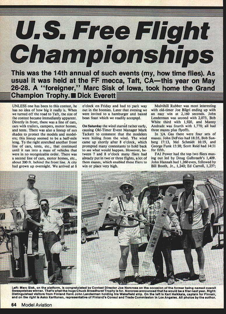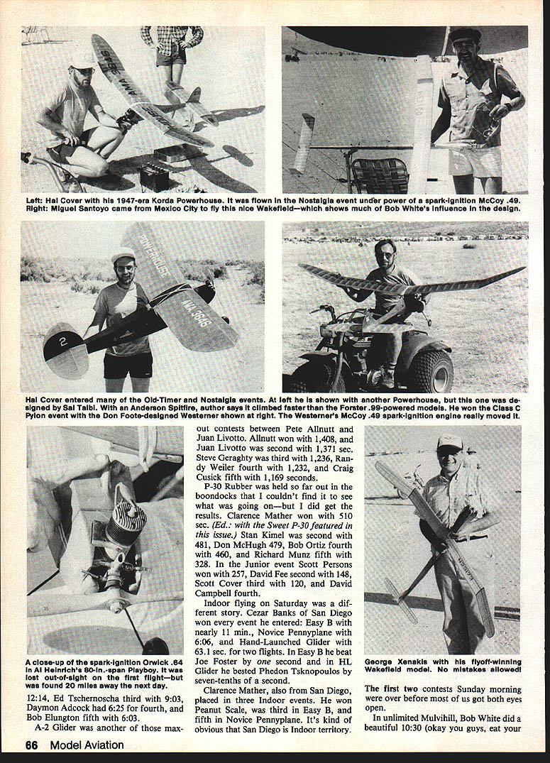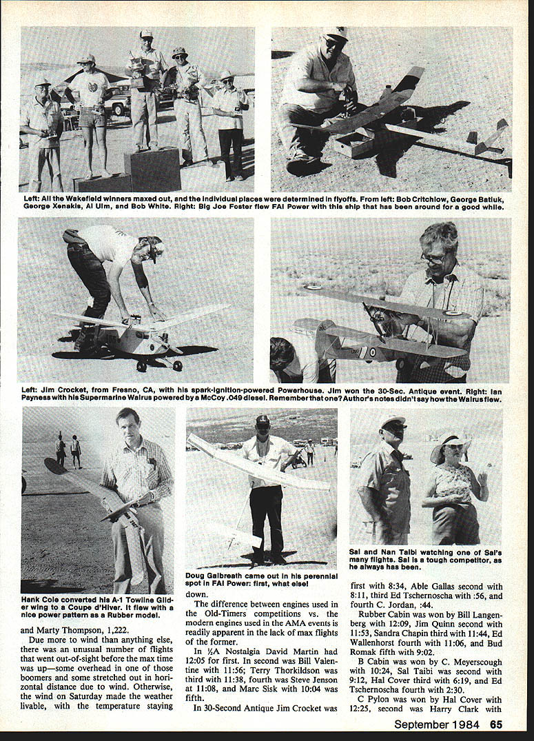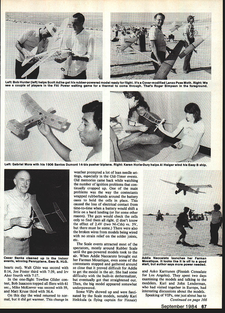 UNLESS has contest has no idea big really turned off road Taft size contest became immediately apparent Directly front line cars cars trailers campers motor homes tents also lineup sun shades protect models model ers lineup seemed half-mile long right stretched another front line cars tents etc continued until ran mass vehicles no recognizable order second line cars motor homes etc about 200 ft behind front line city grown up overnight arrived 6 oclock Friday park way out boonies Later evening invited hamburger baked bean feast readily acceptd Saturday wind started rather early causing Old-Timer Event Manager Mark Tackett comment modelers hiding wind wind came up shortly after 8 oclock prompted contestants hold back see what would happen However tween 7 8 oclock fliers already put two three flights lot maxes enabled fliers win place very high Mulvihill Rubber interesting old-timer Joe Bilgri ending up easy win 2160 seconds John Lenderman second 2073 Bob White third 1920 Manny Andrade fourth 1778 three maxes plus flyoffs AA Gas four sets maxes John DeFries 1835 Bob Sunberg 1713 Mel Schmidt 1619 George Funk 1538 Scott Reid 1431 fifth FAT Power top two fliers max ing out led Doug Galbreaths 1409 John Hannah 1260 followed Bill Booth Jr 1240 Ed Carroll 1237 Left Marc 515k platform congratulated Contest Director Joe Norcross occasion former being named overall Sweepstakes winner Thats what huge Chuck Broadhurst Trophy Norcross announced would flier next year Right Distinguished visitors Finland flank John Lenderman holdIng WakefIeld ship left Karl Heikkala captaIn Finnair right Asko Karttunen representative Finlands Consul Trade Commission Los Angeles photos author 64 Model Aviation Left All Wakefield winners maxed out individual places determined fiyoffa ieft Bob Critchiow George Batiuk George Xenakis Al Uim Bob White Right Big Joe Foster flew FAi Power ship has around good Left Jim Crocket Fresno CA spark-ignition-powered Powerhouse Jim won 30-Sec Antique event Right Ian Paynesswlth Supermarine Walrus powered bye McCoy 049 diesel Rememberthat oneAuthors notesdidnt say howtheWalrusfiew Marty Thompson 1222 Due wind anything else unusual number flights went out-of-sight before max time upsome overhead boomers some stretched out hori zontal distance due wind Otherwise wind Saturday made weather livable temperature staying down difference between engines used Old-Timers competitions vs modern engines used AMA events readily apparent lack max flights former AA Nostalgia David Martin 1205 first second Bill Valen tine 1156 Terry Thorkildson third 1138 fourth Steve Jenson 1108 Marc Sisk 1004 fifth 30-Second Antique Jim Crocket first 834 Able Gallas second 811 third Ed Tschernoscha 56 fourth C Jordan 44 Rubber Cabin won Bill Langen berg 1209 Jim Quinn second 1153 Sandra Chapin third 1144 Ed Wallenhorst fourth 1106 Bud Romak fifth 902 B Cabin won C Meyerscough 1024 Sal Taibi second 912 Hal Cover third 619 Ed Tschernoscha fourth 230 C Pylon won Hal Cover 1225 second Harry Clark September1984 65 Hank Cole converteu ii - u er wing Coup dHiver flew whin u nice power pattem Rubber model Doug Gaibresin came out perennial spot FAI Power first what else Sal Nan Taibi watching Sals flights Sails tough competitor always has Left Hal Cover 1947-era Korda Powerhouse flown Nostalgia event under power spark-ignition McCoy 49 Right Miguel Santoyo came Mexico City fly nice Wakefieldwhich shows much Bob Whites Influence design Hal Cover entered Old-Timer Nostalgia events left shown another Powerhouse de signed Sal Taibi Anderson Spitfire author says climbed faster Forster 99-powered modeis won Class C Pylon event Don Foote-designed Westerner shown right Westerners McCoy 49 spark-ignition engine really moved out contests between Pete Allnutt Juan Livotto Allnutt won 1408 Juan Livotto second 1371 sec Steve Geraghty third 1236 Ran dy Weiler fourth 1232 Craig Cusick fifth 1169 seconds P-30 Rubber held far out boondocks couldnt find see what going onbut did get results Clarence Mather won 510 sec Ed Sweet P-30 featured issue Stan Kimel second 481 Don McHugh 479 Bob Ortiz fourth 460 Richard Munz fifth 328 Junior event Scott Persons won 257 David Fee second 148 Scott Cover third 120 David Campbell fourth Indoor flying Saturday dif ferent story Cezar Banks San Diego won event entered Easy B nearly 11 mm Novice Pennyplane 606 Hand-Launched Glider 631 sec two flights Easy B beat Joe Foster second HL Glider bested Phedon Tsknopoulos seven-tenths second Clarence Mather also San Diego placed three Indoor events won Peanut Scale third Easy B fifth Novice Pennyplane Its kind obvious San Diego Indoor territory George Xenakis flyoff-winning Wakefield model No mistakes aliowedi first two contests Sunday morning over before us got both eyes open unlimited Mulvihill Bob White did beautiful 1030 okay guys eat 66 Model Aviation ciose-up spark-ignition Orwick 64 Al Hem richs S0-in-span Playboy lost out-of-sight first flightbut found 20 miles away next day 1214 Ed Tschernoscha third 903 Daymon Adcock 625 fourth Bob Elungton fifth 603 A-2 Glider another max Left Bob Hunter left helps Scott Adike get rubberpowered model ready flight Its Covermodlfied Lanzo Puss Moth Right see coupie players FAi Power waiting game thermai come through Thats Roger Simpson foreground Left Gabriei Mora 1906 Santos Dumont 1 4-bis pusher biplane Night Karen Horie-Dury helps Ai Heiger wind Easy B ship hearts Out Walt Ghio second 814 Joe Foster third 739 Irv Aker fourth 717 one-flight Towilne Glider con test Bob Isaacson topped fliers 61 sec Mike McKeever second 59 Matt Kruse third 564 day wind returned nor mal did get warmer change weather prompted lot lean needle set tings especially Old-Timer events Old memories came back watching number ignition problems con tinually cropped up main problems way contestants wrapped rubberbands around battery cases hold cells place caused loss electrical contact tune-to-time battery would shift little hard landing some other reason 