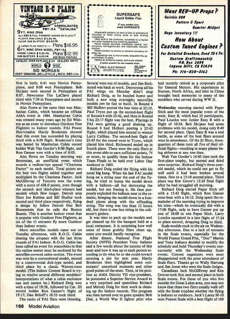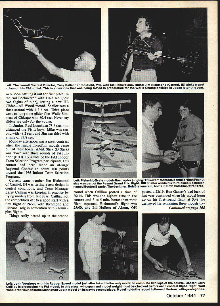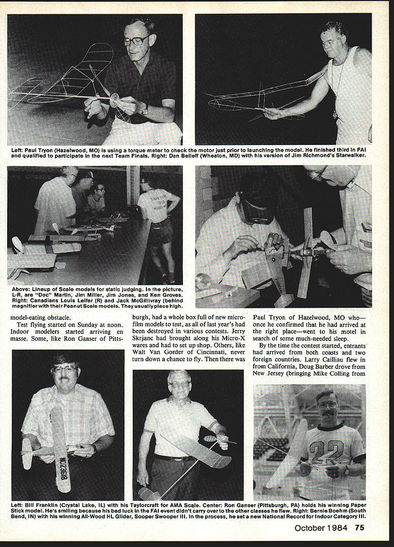 ORGANIZING 1984 event real availability other sites April scramble April suitable arrangements half dozen alternates available could made new owner State Fair Coliseum Detroit MI West Baden building decision chosen proven contest site stable made go alternate site conditions within reasonable travel dis Because rumors winter long tance past participants West Baden off choice spite high rental fee again Indoor modelers checking $40000 per day plus lights half nor U S Indoor Championships Most events well contested though site year different ideal height Best good feelings friendly competition association others similar interests high levelE Melody Richard Doig mal rate State Fair Coliseum arenastyle building girdered roof grandstands surrounding large floor area building fits AMA Ceiling Cat III 15-30 meters 49 ft 24 90 ft 5 66 ft height building does provide conditions suitable setting vast number records West Baden atrium did mind schedule Third US Indoor Championships Monday June 18 through Wednes day June 20 Fifth World Peanut Grand Prix Thursday June 21 no Record Trials year Sunday morning setup crew ar rived find some roads fair grounds under construction including road next coliseum Direction signs quickly posted guide con testants spectators Nothing worse driving off edge pavement dropping 6 potholes fragile Indoor models car plastic An overall view contest side State Fair Coliseum Detroit Ml eventsheeting shroud also hung around well underway top speaker rack especially shrouded plasticrack speakers about 15 ft sheeting previous contest several models destroyed open speakersbelow girders eliminating real Helium-filled balloon right used steering retrieving hung-up models Left MikeCoiling England makessomeadjustmentsto Easy B Behind him Doug MaryAnn Barber Both Easy Bs inthe picture British style long tails short no wing posts Right Larry Cailiiau Westiake Viilage CA launches winning PAl model keeping practice position US team manager alternate team member years indoor World Championships 74 Model Aviation d Len P8Ui Tryon Hazewood MO using torque meter check motor just prior iauncning moaei ne finished third FAi quaiified participate next Team Finals Right Dan Belieff Wheaton MD version Jim Richmonds Starwalker model-eating obstacle Test flying started Sunday noon Indoor modelers started arriving en masse Some like Ron Ganser Pitts October 1984 75 guava ineup OT caie moaeus tor static juaging tne picture L-R Doc Martin Jim Miller Jim Jones Ken Groves Right Canadians Louis Leifer R Jack McGiliivray behind magnifierwith Peanut Scale models usually place high burgh whole box full new micro- Paul Tryon Hazelwood MO film models test last years once confirmed arrived destroyed various contests Jerry right placewent motel Skrjanc brought along Micro-X search some much-needed sleep wares set up shop Others like time contest started entrants Walt Van Gorder Cincinnati never arrived both coasts two turn down chance fly foreign countries Larry Cailliau flew California Doug Barber drove New Jersey bringing Mike Colling Left Bill Franklin Crystal Lake IL Taylorcraft AMA Scaje Center Ron Ganser Pittsburgh PA holds winning Paper Stick model Hes smiling because bad luck FAI event didnt carry over other classes flew Right Bernie Boehm South Bend IN winning All-Wood HL Glider Sooper Swooper ill process set new Nationai Record Indoor Category Ill LUII UVU ILUIU urIun mu WIIfl flU TI5t rennypuuns urn dad just starrea witn i-roe i-iignt moasis last summer hi rirm major contesst Right John Voorhees Sidney OH makes some adjustments thrust bearing Pennyplane Johns second year US Indoor Championships Hes RC filer has gotten hooked Free Flight models well Left NFFS President Tony Italiano addresses attendance banquet Right winning uiuu LaDIn moaeu just arier taKe off built flown co-author Richard Doig Pontiac Ml Model has won Indoor Champs event three years row England Canadian bunch Ken Groves Louis Leifer Jack McGilli vray came down Walt Everson Doc Martin Millard Wells MIAMI Club Florida may problems lack Juniors model aviation better showings families major contest happened time Five families attended Louckas Willoughby OH Skrjancs Lorain OH Fulmers Mishawaka IN Pivitts Detroit MI andnew Indoor modelingthe LaClaves Lake Orion MI time chief Contest Director Tony Italiano arrived late after noon looked like contest would well attended worthy being called US Indoor Championships Monday morning started off HandLaunched Glider Most contestants very traditional gliders Bryan Fulmer Senior won default time 964 sec would have placed him third Open also put glider auxiliary heater unit something happens least once contest site Bernie Boehm South Bend IN Paul Shailor local glider king 76 Model Aviation Left Doc Martin MIAMA Club gets Peanut Scale version italian WW ii fighter ready fly Center Walt Van Gorder Cincinnati OH about launch Easy B fIrst-place trophy Right Bob Skrjanc Lorain OH gets helping hand hIs Pennypiane dad Jerry authors note five families youngsters parents present competing year Left The overall Contest Director Tony itallano Brookfieid WI Pennypiane Right Jim Richmond Carmei IN picks spot aunch FAI mQdei new being tested preparation World Championships Japan later year soon battling out first place end Boehm won 1148 sec best two flights nine setting new HL GliderMi Wood record Shailor close second 1136 sec Third place went long-time glider flier Wally Sim mers Chicago 804 sec Never say gliders young Junior Paul Loucka 786 sec out distanced Pivitt boys Mike sec ond 482 sec Jim third time 278 sec Monday afternoon great contrast fragile microfilm models came out boxes AMA Stick D Stick flown three rounds FAI door FiD vote FAI Indoor Team Selection Program participants contest made at-large Regional Contest count 100 points toward 1986 Indoor Team Selection Program Current team member Jim Richmond Carmel IN testing new design contest conditions Team Manager Larry Cailliau keeping practice flyin