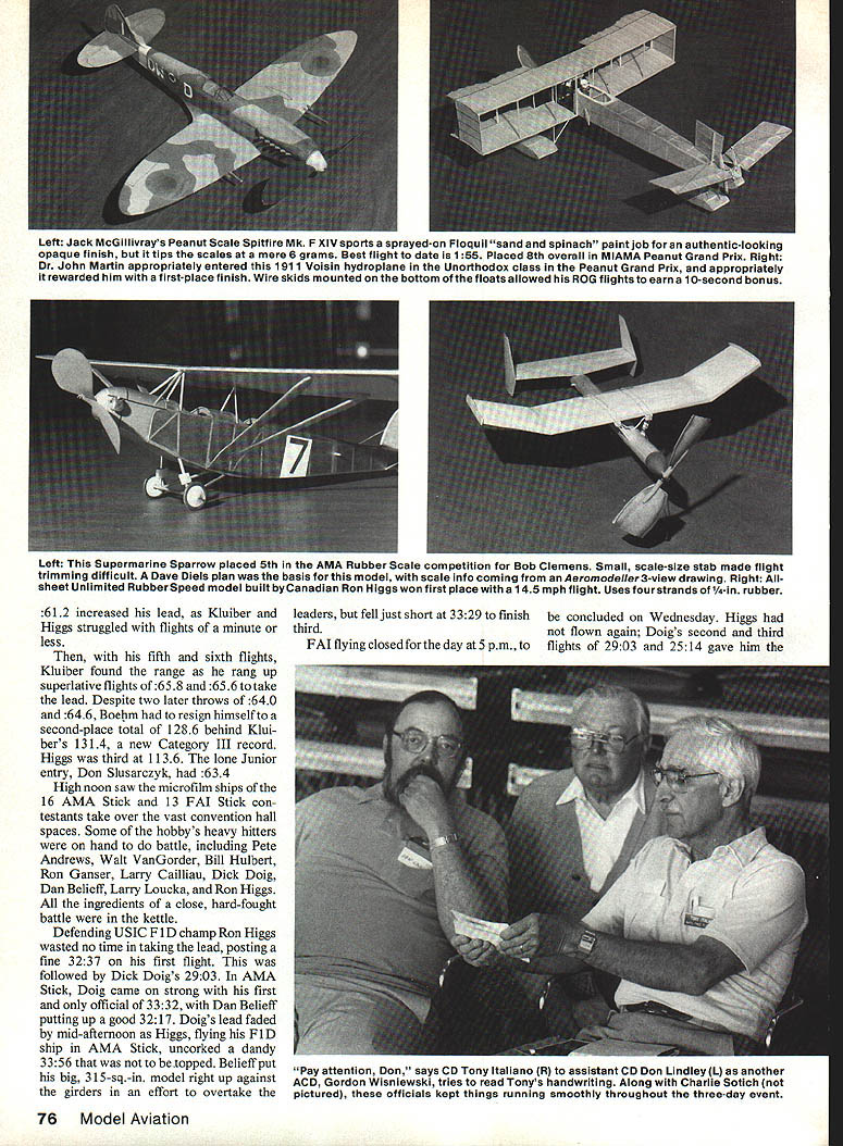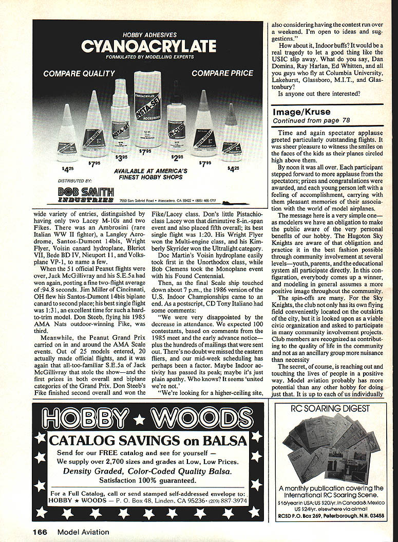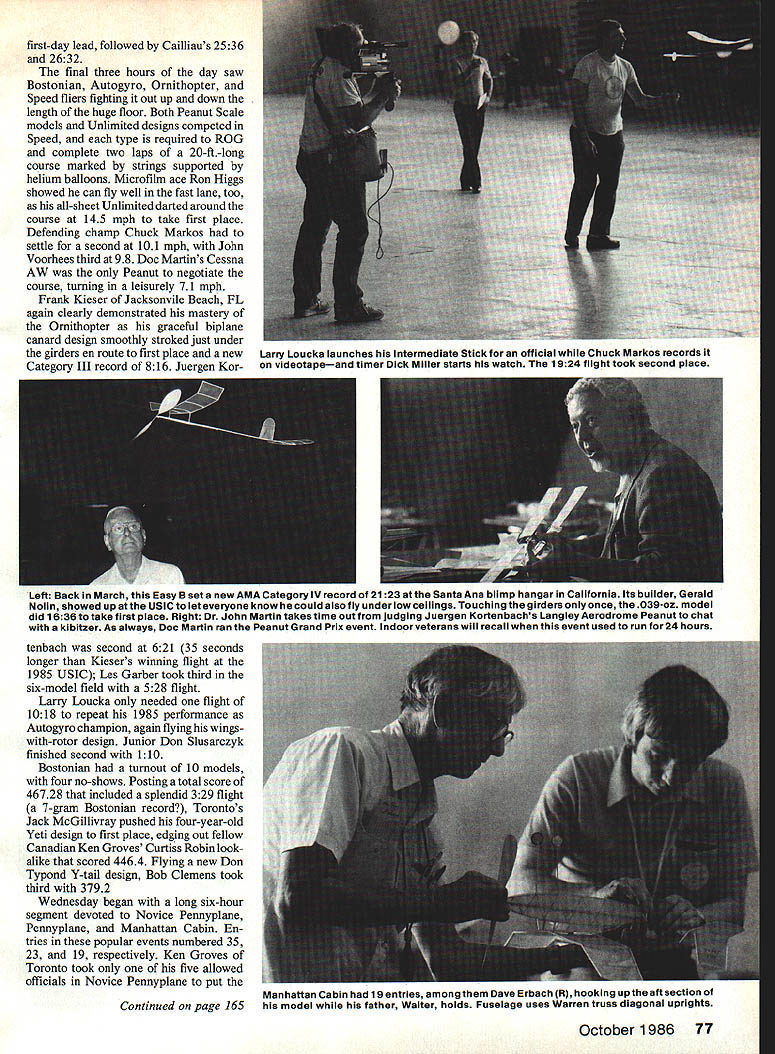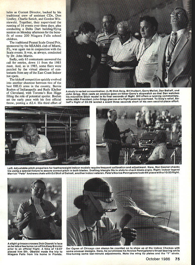 U S door Championships IT WAS 9 am Tuesday June 17 Scattered across vast 260 360-ft concrete floor convention center nine Hand-Launched Glider contestants busily hurling sheet balsa creations still airseemed dwarfed great room its arching 72-ft ceiling second year row glider fliers leading off US Indoor Champion ships Niagara Falls NY As past years Class AAAA USIC ~The years foremost Indoor meet saw some biggest names sport going head-to-head Niagara Falls Convention center again decide USIC Champion 1986 EBob Clemens co-sponsored National Free Flight Society National Indoor Model Airplane Society Once again genial Tony Italiano Brookfield WI 74 Model Aviation Top Your basic large building Niagara Falls Convention Center boasts 80600 sq ft floor area topped 72-ft ceiling isthe second straightyearthe huge structure has housed U S IndoorChampionships qualifies Category II site forAMA record purposes Above Helium-filled balloons have become standard flight path manipulators Indoor fliers wag inflated surgical glove possible use retrieving errant models tables chairsall could usewere provided center helm Contest Director backed traditional crew assistant CDs Don Lindley Charlie Sotich Gordon Wis niewski Together supervised running 16 events over three days plus conducting Delta Dart building/flying session Monday afternoon bene fit some 200 Niagara Falls school children traditional Peanut Scale Grand Prix sponsored MIAMA club Miami FL again run conjunction Scale events always conducted Dr John Martin Sadly 63 contestants answered call entries down 11 1985 meet 1985 some fliers puzzled virtual absence con testants East Coast Indoor hot spots kickoff competition quickly evolved another shootout between two best IHLG arms country Bernie Boehm Indianapolis Rudy Kluiber Cleveland Torontos Ron Higgs filling role potential spoiler Boehm set early pace first official throw posting 624 third effort study varied concentration L-R Dick Doig Bill Hulbert Gerry Mallet Dan Belieff John Grigg Dick casts anxious gaze timer Gerrys stopwatch rival Dan watches microfilm Stick model its final seconds flight Bill offers running commentary AMA President John Grigg glances flight passing overhead Doigs relief lieffs flight 3329 landed scant three seconds short own second-place effort Left Adjustable-pitch propellers featherweight Indoor models require frequent calibration adjustment Ron Gasner checks using special fixture assure correct pitch both blades Drafting triangle fits slots check blade angle Right Indoor legend Merrick Pete Andrews chats Ed Stoll Detroit another Indoor veteran Petes Novice Pennyplane took 4th place 1053 flight October 1986 75 slight grimace crosses Dick Obarskis face lets few turns run off Easy B motor prior official flight time 1307 Del Ogren Chicago can always counted snow up tne Indoor Champs placed him 5th Obarski made trip some unusual designs scrutinizes Novice Pennyplanesthrust bearing Niagara Falls home Florida fine-tuning some last-minute adjustments Note wing tip plates Y struts Left Jack McGillivrays Peanut Scale Spitfire Mk F XIV sports sprayed-on Floquil sand spinach paint job authentic-looking opaque finish tips scales mere 6 grams Best flight date 155 Placed 8th overall MIAMA Peanut Grand Prix Right Dr John Martin appropriately entered 1 gil Voisin hydroplane Unorthodox class Peanut Grand Prix appropriately rewarded him first-place finish Wire skids mounted bottom floats allowed ROG flights earn 10-second bonus Left This Supermarine Sparrow placed 5th AMA Rubber Scale competition Bob Clemens Small scale-size stab made flight trimming difficult Dave Diels plan basis model scale info coming Aeromodeller 3-view drawing Right Allsheet Unlimited Rubber Speed model built byCanadian Ron Higgs won first place 145mph flight Uses four strands of1/4-in rubber 612 increased lead Kluiber Higgs struggled flights minute less fifth sixth flights Kluiber found range rang up superlative flights 658 656 take lead Despite two later throws 640 646 Boel2Im resign himself second-place total 1286 behind Klui bers 1314 new Category III record Higgs third 1136 lone Junior entry Don Slusarczyk 634 High noon saw microfilm ships 16 AMA Stick 13 FAL Stick con testants take over vast convention hall spaces Some hobbys heavy hitters hand battle including Pete Andrews Walt VanGorder Bill Hulbert Ron Ganser Larry Cailliau Dick Doig Dan Belieff Larry Loucka Ron Higgs ingredients close hard-fought battle kettle Defending USIC Fl D champ Ron Higgs wasted no time taking lead posting fine 3237 first flight followed Dick Doigs 2903 AMA Stick Doig came strong first official 3332 Dan Belieff putting up good 3217 Doigs lead faded mid-afternoon Higgs flying Fl D ship AMA Stick uncorked dandy 3356 topped Belieff put big 31 5-sq-in model right up against girders effort overtake leaders fell just short 3 329 finish third FAI flying closed day 5 pm concluded Wednesday Higgs flown again Doigs second third flights 2903 2514 gave him 76 Model Aviation Pay attention Don says CD Tony Italiano R assistant CD Don Lindley L another ACD Gordon Wisniewski tries read Tonys handwriting Along Charlie Sotich pictured officials kept things running smoothly throughout three-day event first-day lead followed Cailliaus 2536 2632 final three hours day saw Bostonian Autogyro Ornithopter Speed fliers fighting out up down length huge floor Both Peanut Scale models Unlimited designs competed Speed type required ROG complete two laps 20-ft-long course marked strings supported helium balloons Microfilm ace Ron Higgs showed can fly well fast lane too all-sheet Unlimited darted around course 145 mph take first place Defending champ Chuck Markos settle second 101 mph John Voorhees third 98 Doc Martins Cessna AW Peanut negotiate course turning leisurely 71 mph Frank Kieser Jacksonvile Beach FL again clearly demonstrated mastery Ornithopter graceful biplane canard design smoothly stroked just under girders en route first place new Category III record
