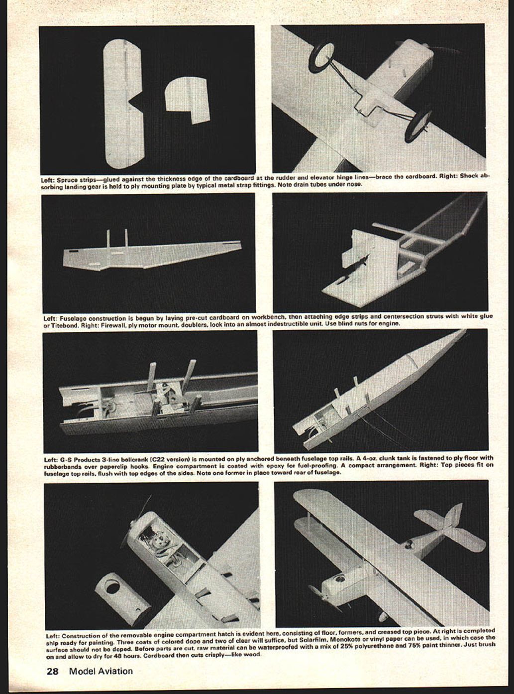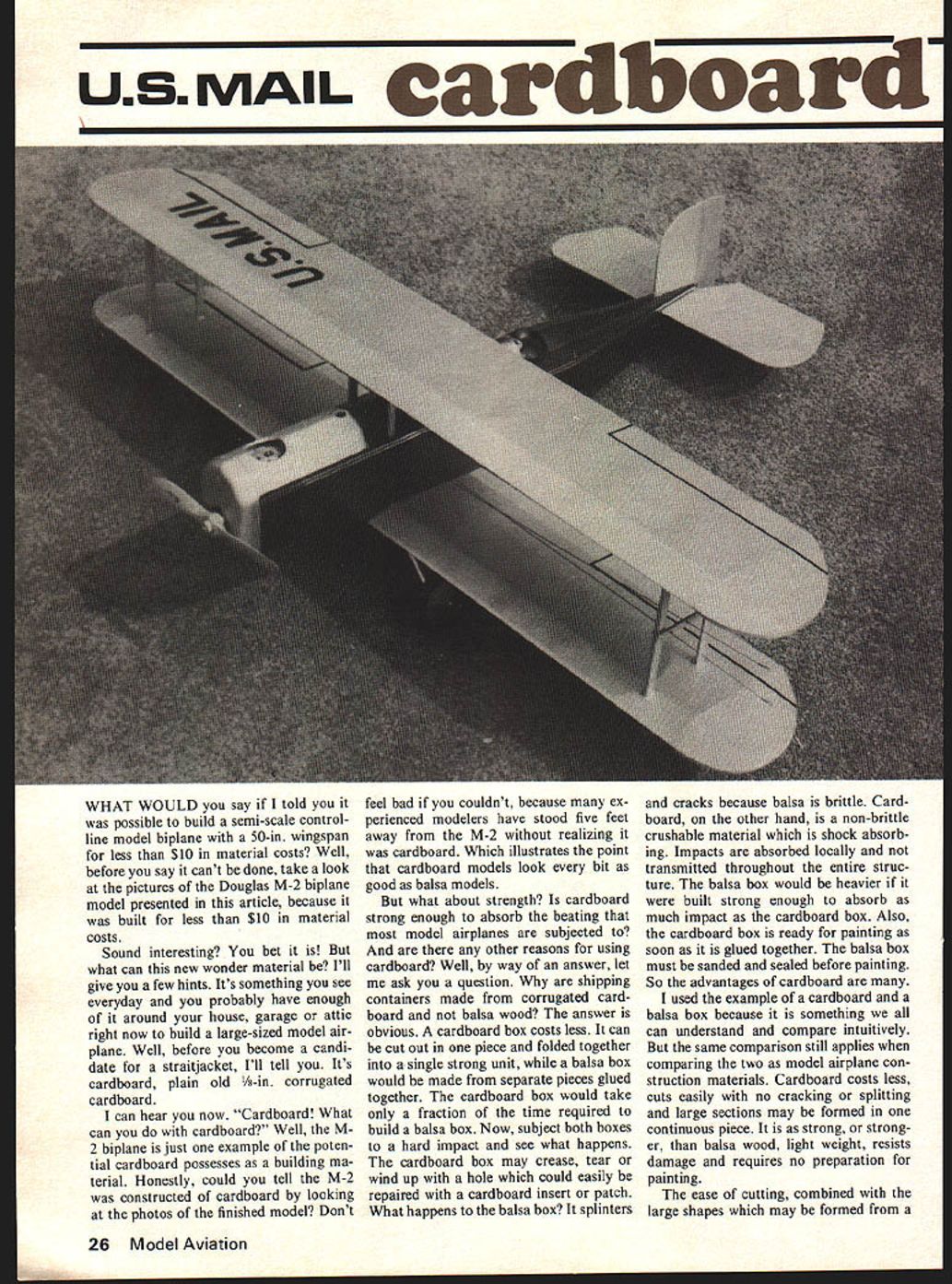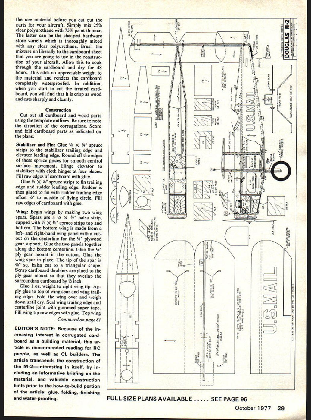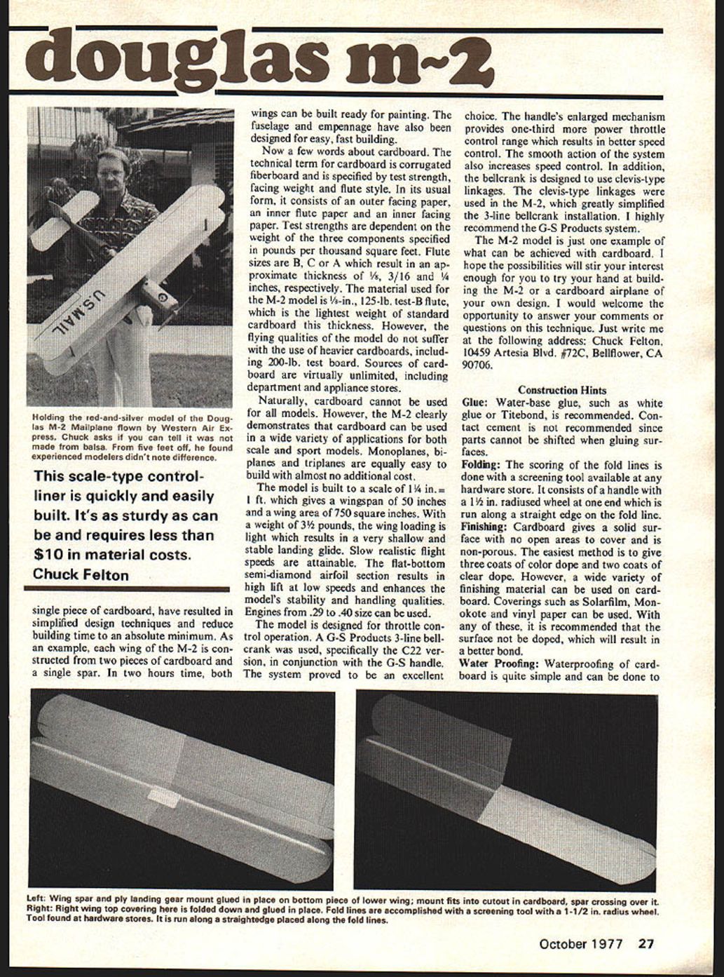US MAIL cardboard] WHAT WOULD say told possible build semi-scale controlline model biplane 50-in wingspan less $10 material costs Well before say cant done take look pictures Douglas M-2 biplane model presented article because built less $10 material costs Sound interesting bet what can new wonder material Ill give few hints Its something see everyday probably have enough around house garage attic right now build large-sized model air plane Well before become candi date straitjacket Ill tell Its cardboard plain old /8-in corrugated cardboard can hear now Cardboard What can cardboard Well M 2 biplane just example poten tial cardboard possesses building ma terial Honestly could tell M-2 constructed cardboard looking photos finished model Dont feel bad couldnt because ex perienced modelers have stood five feet away M-2 realizing cardboard Which illustrates point cardboard models look bit good balsa models what about strength cardboard strong enough absorb beating model airplanes subjected other reasons using cardboard Well way answer let ask question shipping containers made corrugated card board balsa wood answer obvious cardboard box costs less can cut out piece folded together single strong unit balsa box would made separate pieces glued together cardboard box would take fraction time required build balsa box Now subject both boxes hard impact see what happens cardboard box may crease tear wind up hole could easily repaired cardboard insert patch What happens balsa box splinters cracks because balsa brittle Card board other hand non-brittle crushable material shock absorb ing Impacts absorbed locally transmitted throughout entire struc ture balsa box would heavier built strong enough absorb much impact cardboard box Also cardboard box ready painting soon glued together balsa box must sanded sealed before painting So advantages cardboard used example cardboard balsa box because something can understand compare intuitively same comparison still applies comparing two model airplane con struction materials Cardboard costs less cuts easily no cracking splitting large sections may formed continuous piece strong strong er balsa wood light weight resists damage requires no preparation painting ease cutting combined large shapes may formed 26 Model Aviation douglas m-2 scale-type controlliner quickly easily built Its sturdy can requires less $10 material costs Chuck Felton single piece cardboard have resulted simplified design techniques reduce building time absolute minimum As example wing M-2 con structed two pieces cardboard single spar two hours time both wings can built ready painting fuselage empennage have also designed easy fast building Now few words about cardboard technical term cardboard corrugated fiberboard specified test strength facing weight flute style its usual form consists outer facing paper inner flute paper inner facing paper Test strengths dependent weight three components specified pounds per thousand square feet Flute sizes B C result ap proximate thickness i/s 3/16 inches respectively material used M-2 model A-in 125-lb test-B flute lightest weight standard cardboard thickness However flying qualities model suffer use heavier cardboards includ ing 200-lb test board Sources card board virtually unlimited including department appliance stores Naturally cardboard cannot used models However M-2 clearly demonstrates cardboard can used wide variety applications both scale sport models Monoplanes bi planes triplanes equally easy build almost no additional cost model built scale 1 gives wingspan 50 inches wing area 750 square inches weight 3 pounds wing loading light results very shallow stable landing glide Slow realistic flight speeds attainable flat-bottom semi-diamond airfoil section results high lift low speeds enhances models stability handling qualities Engines 29 40 size can used model designed throttle con trol operation G-S Products 3-line bellcrank used specifically C22 ver sion conjunction G-S handle system proved excellent choice handles enlarged mechanism provides one-third power throttle control range results better speed control smooth action system also increases speed control addition bellcrank designed use clevis-type linkages clevis-type linkages used M-2 greatly simplified 3-line bellcrank installation highly recommend G-S Products system M-2 model just example what can achieved cardboard hope possibilities will stir interest enough try hand build ing M-2 cardboard airplane own design would welcome opportunity answer comments questions technique Just write following address Chuck Felton 10459 Artesia Blvd #72C Bellflower CA 90706 Construction Hints Glue Water-base glue such white glue Titebond recommended Con tact cement recommended since parts cannot shifted gluing sur faces Folding scoring fold lines done screening tool available hardware store consists handle 1 radiused wheel end run along straight edge fold line Finishing Cardboard gives solid sur face no open areas cover non-porous easiest method give three coats color dope two coats clear dope However wide variety finishing material can used card board Coverings such Solarfilm Mon okote vinyl paper can used recommended surface doped will result better bond Water Proofing Waterproofing card board quite simple can done October1977 27 Holding red-and-silver model Doug las M-2 Mailplane flown Western Air Ex press Chuck asks can tell made balsa five feet off found experienced modelers didnt note difference Left Wing spar ply landing gear mount glued piece bottom piece lower wing mount fits cutout cardboard spar crossing over Right Right wing top covering folded down glued place Fold lines accomplished screening tool 1-1/2 radius wheel Tool found hardware stores run along straightedge placed along fold lines Left Construction removable engine compartmenT natch evident consisting floor formers creasea top piece ix rigni compnmid ship ready painting Three coats colored dope two clear will suffice Solarfilm Mo