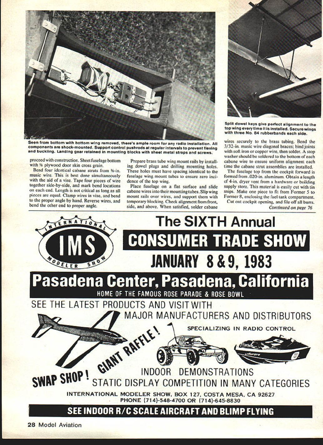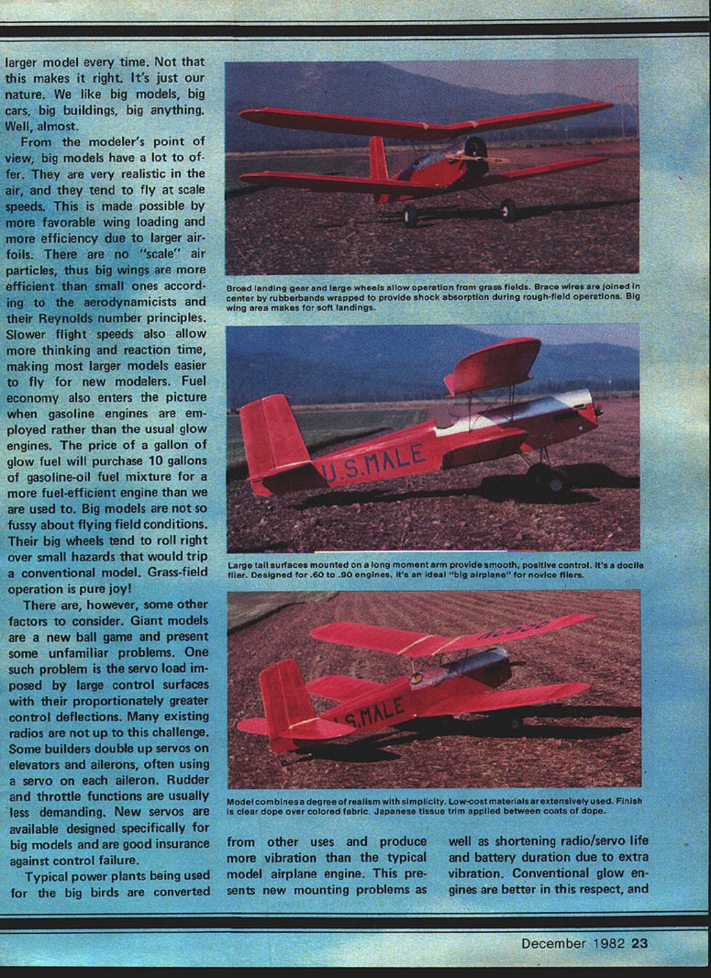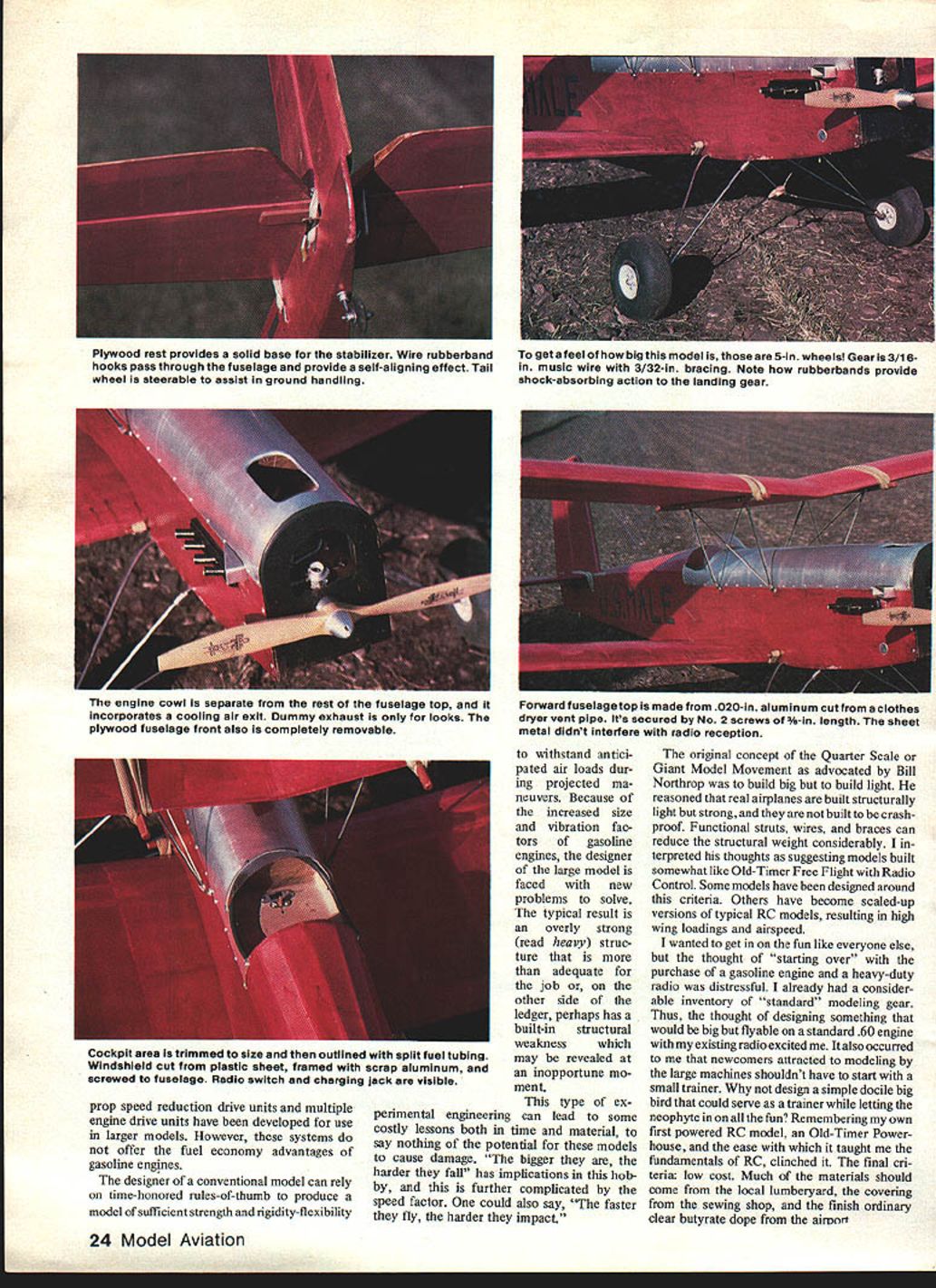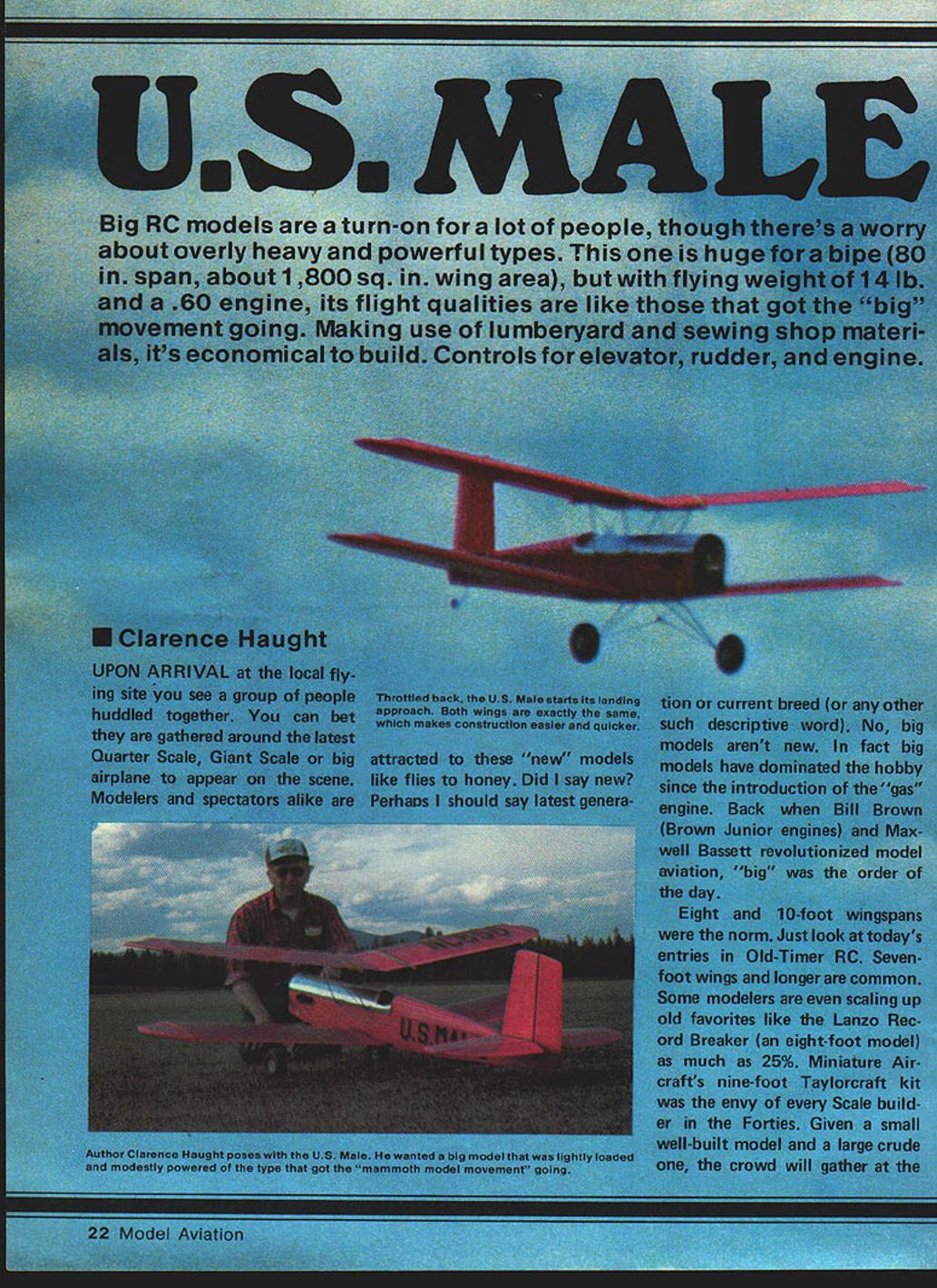 NO OCR TEXT NO OCR TEXT prop speed reduction drive units multiple engine drive units have developed use larger models However systems offer fuel economy advantages gasoline engines designer conventional model can rely time-honored rules-of-thumb produce model sufficient strength rigidity-flexibility withstand antici pated air loads dur ing projected ma neuvers Because increased size vibration fac tors gasoline engines designer large model faced new problems solve typical result overly strong read heavy struc ture adequate job other side ledger perhaps has built-in structural weakness may revealed inopportune mo ment type ex perimental engineering can lead some costly lessons both time material say nothing potential models cause damage bigger harder fall has implications bob further complicated speed factor could also say faster fly harder impact original concept Quarter Scale Giant Model Movement advocated Bill Northrop build big build light reasoned real airplanes built structurally light strong built crashproof Functional struts wires braces can reduce structural weight considerably terpreted thoughts suggesting models built somewhat like Old-Timer Free Flight Radio Control Some models have designed around criteria Others have become scaled-up versions typical RC models resulting high wing loadings airspeed wanted get fun like everyone else thought starting over purchase gasoline engine heavy-duty radio distressful already consider able inventory standard modeling gear Thus thought designing something would big flyable standard 60 engine existing radio excited also occurred newcomers attracted modeling large machines shouldnt have start small trainer design simple docile big bird could serve trainer letting neophyte fun Remembering own first powered RC model Old-Timer Power house ease taught fundamentals RC clinched final cri teria low cost Much materials should come local lumberyard covering sewing shop finish ordinary clear butyrate dope airnort 24 Model Aviation Plywood rest provides solid base stabilizer Wire rubberband hooks pass through fuselage provide self-aligning effect Tail wheel steerable assist ground handling get feel big model 5-in wheels Gear 3/16in music wire 3/32-in bracing Note rubberbands provide shock-absorbing action landing gear engine cowl separate rest fuselage top incorporates cooling air exit Dummy exhaust looks plywood fuselage front also completely removable Forward fuselage top made 020-in aluminum cut clothes dryer vent pipe Its secured No 2 screws -in length sheet metal didnt interfere radio reception Cockpit area trimmed size outlined split fuel tubing Windshield cut plastic sheet framed scrap aluminum screwed fuselage Radio switch charging jack visible CHUCK WOODb Hank Clark HANECLSREJUNORP HELLOCHUCIf YOUMUST8ESUSY THEPANSAREWITHTHEBUTHEDICSJTGIVE MEVFE YOU I-lORE TOI WAS JUSTWITH YOUR DADS EATNG EM UPLITNOSPIAOTQ5 AWM OOZIN INTO THE NEWS ADMIRE MY NEWNERIPING AAIRPLANE RDTOS OSOSOLD 616SAND BOATON DISPLAY N AMA N-ID 3/8SO L EDGE CITATIONBONANZA-CMFANTASTIC FLOC IN HIS DAYS-IMPLANS HE BET 6ETSYMDICATED OVER DOING CARS NIOF FILM liE SELLIIISSURE GAVEl BOATS TOO FIRED INTl-IT 7XII UPALOT THE NATIONYET7 1 SOS , LAIN5IESP ~~sI/8X3/8I/B WIRE IN ELEVATORSI/8X 3/8 RIBS --AND I/B PLYC I/BPL~O3/STUBULAR STRINGER UINERSSPAR JOINERSWING SUPPORTS 1/4 DOWEL ENDSI/8X 1/4 STRINGERS I/8ID BRASSTUBEFl TUBE 14 WIRED TO BUIJHEADS 020 ALUM COWLING I2TAILWHEELON 1/8 MWIRE 1/8 PLYWOOD SIDES FULL LENGTH AND BOTTOM 10 LGEAR 3/B X 1/2 BALSA T EDGE 3/8SO SPRCE REAR SPAR -5 CD 1-1/8 PLYWOOD FRONT LL 2-1/4 PLYWOOD 1/43/lePLYWOOD3/16 MUSV WIRE LG LEGSBACK MAIN SPARS3/850 SPRLEE SPARSI/8SHEETBALSA RIBS PLYWOOD ENGINEDOUBLED FOR3/32M WIRE 11MOUNT PLATELG NlOuNTSSHOCK STRUTSI/8X 3/4BALSA TIPS 5 WHEELS3/IBSO SPRUCE LESTRINGERSI/2X3/4LEDGELAMINATED 14 3/4 SQ PINE ENGINE REARERS FULL-SIZE PLANS AVAILABLE . SEE PAGE 164 SIBRIIT ERIGRUST ST 3/B BRASS uSE VA PLY ARAIRS GEAR 000 NMT SOS IC ROY 7/R SlEET METAL SCREWS S/WOOWEL 3/R&D BRASS TIMAB CAWABE STRUTS eISA /4 U ITS SERVO MT- BITS US 10 BRASS TURING ATTACHED TO 6 FORMERS NW7B I3/32 66W RIND N SOLDER CAR AINCBAVT PLY -ERUIBE MT PLATE SOLDER CAR MA CASANE STRUT EDIT 3/5 03 VALAP 4SISTX A/ITFUEL TANG AA TRELER U VR PLC DC 5/B DOWEL STAB REST I/BA/C PLY STRINUERSOMMITED-ELEV SCAN FUR OABITT 90 3/B SOC 3/SN A/S 3/BS 3/B RACE WCRYVO I/B S 3/B 3/B SHYI/H SHY GAB SHROUD .---A-E------/TSU ART 3/B - ZBAOE DOUR DOD ALURTA 1/B PLY OS 5WFDCH-s IA./.xA METAL SCREWS ENTER TENT PIPECOO/PIT FL~I/TROW- ST-4-SROSYE OUT DOUBLERD B PLY DS- .ABALIABGCT OOLRLERF. STAB RODETB WREE --PRB VA BALSAL.I/IN MWPINE SAIL BLOCK ZT4 PINEU/\BATTERYER REUSEDTOIPLER 0OUSBETDODGER DOGBLEBE CAR MW I/B PLC DC CROSSUBAIN CAD TABWSSEEL GD TO 50 U/SW ERASE 13-S OW N-A PROP DO GO USE ENGINE 5 WHEELS ALIBH STROPSSCREWS US MALE ALAME TBABER FUR 3 URANNEL RARER BY CLARENCE WASORT SECT DOUBLER 5 PLY DS DOUBLER E Being biplane resulting US Male quite large wingspan 80 giving total wing area around 1800 sq Finished weight ballast bring center gravity 14 lb figures out wing loading roughly 1 lb per sq ft Compare typical 25-lb 1000 sq model over 3 lb per sq ft flat-bottom airfoil coupled typical OldTimer Free Flight moments produces model basically will fly itself fact day having some radio problems model did land itself quarter mile away will recover unassisted unusual attitudes simply releasing controlsgiven reasonable altitude Three-channel control chosen simplify initial flight training accounts generous dihedral US Male Scale model designed spirit 1930 mail planes mentioned non-traditional building materials means reducing construction cost plans call spruce fir wing spars Spruce readily obtainable hobby shop have access table saw clear fir 2 x 4 lumberyard will yield enough spar stock about buck Some lumberyards discount stores handle trim strip already cut usable sizes Common fir plywood used fuselage farmers Fuselage sides doublers cut -in mahogany door skin available sheets 7 f