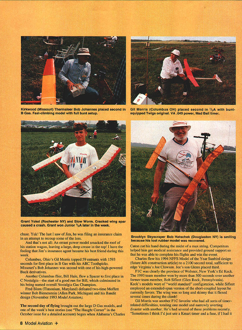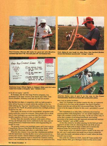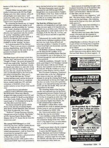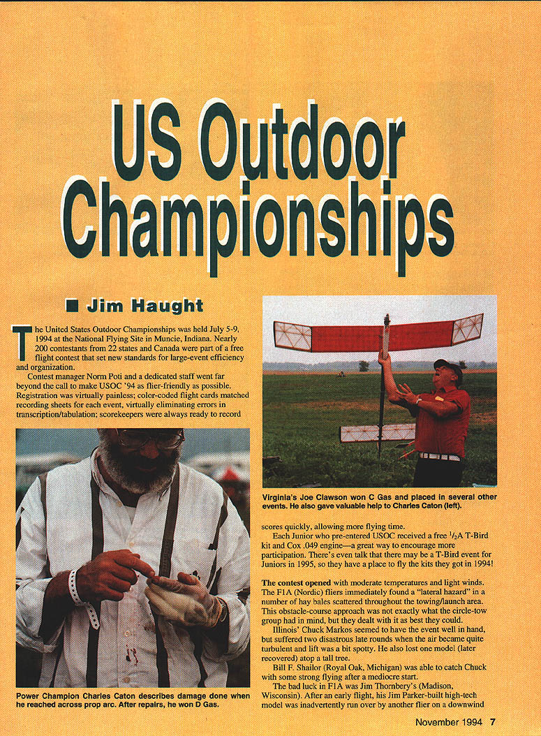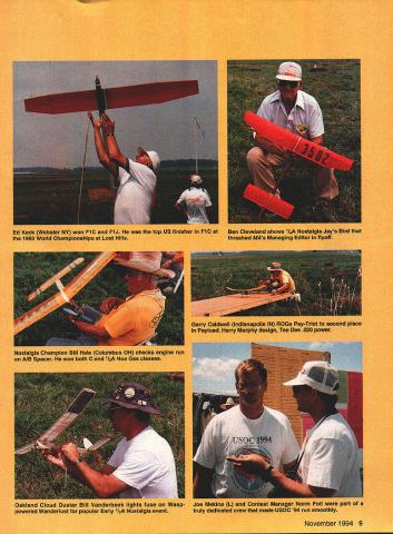 NO OCR TEXT NO OCR TEXT NO OCR TEXT NO OCR TEXT handle FiB Paul won 14 seconds Catapult Glider run under setup similar used US Free Flight Champs few other contests official flights made pen marked traffic cones Fliers persons allowed pen timers support crews stayed outside containing launch area its hoped weather conditions similar contestants possibility mystery scores read cheating eliminated general setup can quite effective questioned practice goating launching pilot model directly upwind pen allowed seems gives unfair advantage have someone available goating So asked assistant CD Joe Mekina about intent eliminate goating piggybacking.point being though its pen its same general [we] heard very favorable comments Day Four began stronger winds previous days forced early move Haught s Corner newly developed FF launch area south hog barn location involved decision locate launch area few cronies dont like choice named area after me. despite fact adds considerable length field prevailing wind direction Nice guys first time Corner location used decision move wise moderate breeze models could max DT land plenty field left fact models landed near previous launch area Scattered showers turbulent conditions made difficult string maxes Ed Konefes Wauconda Illinois dropped eight seconds win FiG Ed Keck won FlJ flyoff over Bobcat man Bob Combs Dallas Texas Bill Hale stayed tough /2A Nostalgia being flier able post four maxes Six Juniors entered special ABCD Power event two posted flights Billy Reuter North Olmstead Ohio defeated Ryan Bane Lyndonville New York Professor George Perryman Smyma Georgia proved still Big Daddy C02 beating Francis Hodson Elgin Illinois 449 373 Seems like wins event year annual NFFS Banquet held following Day Four Carolina Room once again site buffet-style dinner followed number NFFS related announcements talk Norm Poti just managed super organization contest presentation Day Fours awards Overall championship awards white jackets silkscreened USOC logo presented locked up categories latest Symposium report also presented sale $20 through NFFS though no presentation papers Models Year Either both may return next years contest possibly evening other reserved banquet final day flying began relatively cool temperatures light winds Setup once again hog barn area drift no problem early day being dedicated small models such hA Nostalgia P-30 Pee Wee 30 hA Gas FIH lack breeze drift especially nice Unfortunately weather didnt hold breezy turbulent conditions previous day made flying difficult retrieving problem number models entered head-high corn downwind few came back out Gib Robbins Anderson Indiana just thing weather CSpowered heavily-modified Hydro-Star just screeched its way first place 12A blasted through wind turbulence no problem Under conditions thought pretty good shape /4A Nostalgia posted three early maxes new Dream Weaver waited see rest field did weather figured could afford wait flyoff Ben Cleveland Tullahoma Tennessee better idea Jays Bird put up three maxes catch debated put up winning flyoff flight picked poor air own flight Ben beat easily good fun though enjoyed harassing other before after flyoffs cant competition like remaining drama final day neck-and-neck race Power Championship between Charles Caton Joe Clawson Charles gave Joe opening /2A Gas dropping early max own faultI didnt test-fly model Joe could place higher Charles overall championship would despite valiant effort included use six allotted attempts Charles hung declared Power Champion USOC 1994 discovered another story final day may better watching young Junior flying Starduster 12A Gas noticed essentially flying own wasnt big support crew some Juniors have make sure everything goes just right asked around about youngster Jim Bocckinfuso filled seems Bill Saunders Silver Spring Maryland Cuckoo Challenge fame took 13-year-old Justin Aronhalt Bumpass Virginia under wing Bill Dan Belieff other fliers region have teamed up help Justin out Justin learned modeling through club school formed teachers come Cuckoo site Bill praised Justins self-motivationthat will come older fliers ask help family very supportive said Bill father builds little bit helps Justin hard thingslike soldering Justin Dad very close Justin really goes Justin s mother thinks modeling wonderful outlet leisure time encourages him pushing him try win said Saunders Bill feels other Justins around need exposure modeling helping hand get started Lets hope hes right final thanks gave up part own flying time organize execute contest will tough act follow Special thanks Joe Mekina tireless data-processing efforts Norm Poti Dale Mateer photo support mber1994 11 Jt Propelled Turbojet Bounds Like Real Jet Plane Battery Powered Push-Button Control FUN TO FLY ORDEk IUDAY---ILYA ILALJU Only $23ff Plus S4Q Postage Send Check Money Order