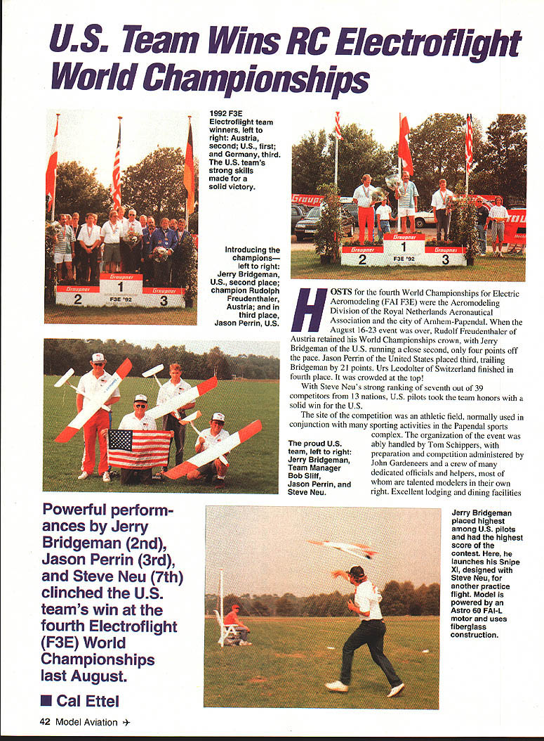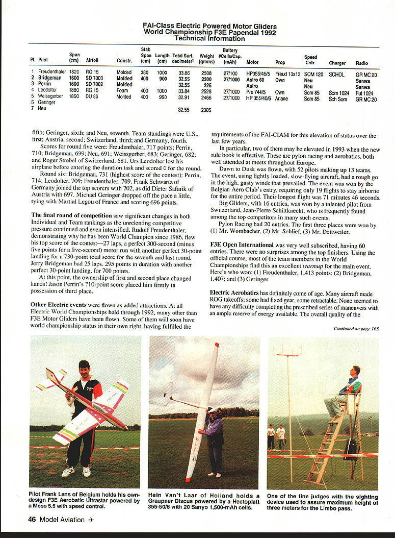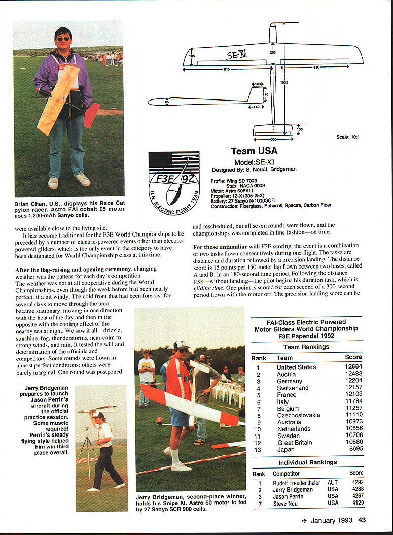 U S Team Wins RC Electroflight N World Championships Powerful perform ances Jerry Bridgeman 2nd Jason Perrin 3rd Steve Neu 7th clinched US teams win fourth Electroflight F3E World Championships last August Cal Ettel T1992 F3E Electroflight team winners left right Austria second US first Germany third US teams strong skills made solid victory Introducing champions left right Jerry Bridgeman US second place champion Rudolph Freudenthaler Austria third place Jason Perrin US HOSTS fourth World Championships Electric Aeromodeling FAI F3E Aeromodeling Division Royal Netherlands Aeronautical Association city Ambem-Papendal August 16-23 event over Rudolf Freudenthaler Austria retained World Championships crown Jerry Bridgeman US running close second four points off pace Jason Perrin United States placed third trailing Bridgeman 21 points Urs Leodolter Switzerland finished fourth place crowded top Steve NeWs strong ranking seventh out 39 competitors 13 nations US pilots took team honors solid win US site competition athletic field normally used conjunction sporting activities Papendal sports complex organization event proud USably handled Tom Schippers team left rightpreparation competition administered Jerry BridgemanJohn Gardeneers crew Team Managerdedicated officials helpers Bob Sliff Jason Perrin andwhom talented modelers own Steve Neuright Excellent lodging dining facilities Jerry Bridgeman placed highest among US pilots highest score contest launches Snipe Xl designed Steve Neu another practice flight Model powered Astro 60 FAI-L motor uses fiberglass construction 42 Model Aviation %rtc v# Brian Chan US displays Race Cat pylon racer Astro FAI cobalt 05 motor uses 1200-mAh Sanyo cells available close flying site has become traditional F3E World Championships preceded number electric-powered events other electricpowered gliders event category have designated World Championship class time After flag-raising opening ceremony changing weather pattern days competition weather cooperative during World Championships though week before nearly perfect bit windy cold front forecast several days move through area became stationary moving direction heat day opposite cooling effect nearby sea night saw alldrizzle sunshine fog thunderstorms near-calm strong winds rain tested will determination officials competitors Some rounds flown almost perfect conditions others barely marginal round postponed Jerry Bridgeman prepares launch Jason Perrins aircraft during official practice session Some muscle required Perrins steady flying style helped him win third place overall V 215 - I JUL L1 610 4 Scale 101 Team USA ModelSE-XI Designed S NeuIJ Bndgeman Profile lMng SD 7003 Stab NACA 0009 Motor Astro 6OFAI-L Propeller 12-X 305-25X Battery 27 Sanyo N-1000SCR Construction Fiberglass Rohacell Spectra Caibon Fiber rescheduled seven rounds flown championships completed fine fashionon time unfamiliar F3E scoring event combination two tasks flown consecutively during flight tasks distance duration followed precision landing distance score 15 points per 150-meter lap flown between two bases called B 180-second time period Following distance taskwithout landingthe pilot begins duration task gliding time point scored second 300-second period flown motor off precision landing score can FAI-Class Electric Powered Motor Gliders World Championship F3E Papendal 1992 Team Rankings RankTeamScore 1United States12684 2Austria12483 3Germany12204 4Switzerland12157 5France12103 6Italy11784 7Belgium11257 8Czechoslovakia11110 9Australia10973 10Netherlands10856 11Sweden10706 12Great Britain10580 13Japan8695 Individual Rankings RankCompetitorScore 1Rudolf FreudenthalerAUT4292 2Jerry BridgemanUSA4288 3Jason PerrinUSA4267 7Steve NeuUSA4129 January1993 43 100* 140 65 4-140-* ~* Jerry Bridgeman second-place winner holds Snipe Xl Astro 60 motor fed 27 Sanyo SCR 900 cells Austria 4 Jason Perrin US Steve Neu steady conservative style creditable ninth place 25 laps points total 695 Round high-caliber beginning exciting hard-fought World Championships Round two began 130 pm after brief lunch little time rest first six pilots begun morning round dropped bottom flight order Bridgeman flew third slot making 26 laps total 711 points Perrin turned heat 27 laps total 727 points Leodolter finished 26 laps 711 points Last top four fly round two Freudenthaler completed 27 laps amassed 726 points rankings changed somewhat would case throughout championships Standings end round two day 1 Freudenthaler 1439 points 2 Bridgeman 1437 2 Perrin 1437 4 Leodolter 1425 Steve Neu 26-lap 707-point total round tied fifth place Franz Weissgerber Germany both cumulative two-round totals 1402 second day competition began real threat rain air Pen-in scored first US excellent 696 points second best windy rain-swept day Michael Geringer Austria topped Perrins score 697 top score round Freudenthaler tied top honors posting identical 697 Bridgeman scored 685 Weissgerber 683 Leodolter 682 Steve Neu 657 throwaway round now effect individual rankings through eighth place remained same pilots poorest round competition Because lengthy rain delay during round three no attempt made fly round four until next day Time makeup round built organizers schedule Round four saw Bridgeman recapture first place 721 points Freudenthaler posted 689 followed Perrin 690 Leodolter 701 Weissgerber 708 Geringer 674 Neu 678 top seven places well established point significant changes come round seven Bridgeman first Freudenthaler second Perrin third Leodolter fourth Weissgerber Lower left Swiss team member Urs Leodolters Orion Notice neat front assembly spinner prop Un fortunately Urs lost plane before entering duration task scored zero round five 0 15 30 points depending precisely done flight per round flown competitor two rounds flown lowest round pilot dropped Points cumulative pilot has highest points total after rounds have flown winner Lets see competition developed Freudenthaler flew second round com