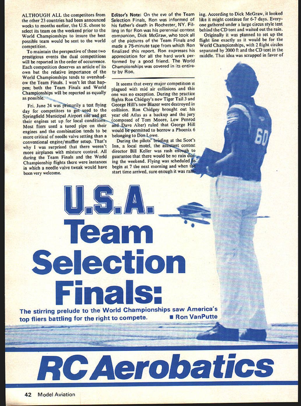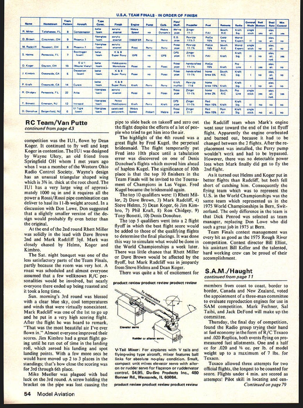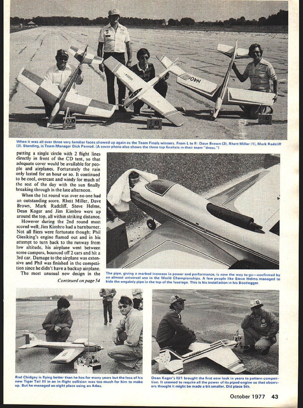 ALTHOUGH ALL competitors other 23 countries announced weeks months earlier US chose select its team weekend prior World Championships insure best possible team would sent world competition maintain perspective two prestigious events dual competitions will reported order occurrence competition deserves article its own relative importance World Championships tends overshad ow Team Finals wont let hap pen both Team Finals World Championships will reported equally possible Editors Note eve Team Selection Finals Ron informed fathers death Rochester NY Fil ling Ron perennial contest companion Dick McGraw took pictures Team Finals made 75-minute tape Ron finalized report Ron expresses appreciation hard work per formed good friend World Championships covered its entire ty Ron seems major competition plagued mid air collisions no exception During practice flights Ron Chidgeys new Tiger Tail 3 Fri June 24 rin~ly test flyingGeorge Hills new Blazer destroyed day competitors get used thecollision Ron Chidgey brought out Springfield Municipal Airport siian getyear old Atlas backup jury engines set up localcomposed Tom Moore Lew Penrod Most fliers used tuned pipe theira 4ave Alter ruled George Hill engines combination tends bewould bpermitted borrow Phoenix 6 critical needle valve setting abelonging Don Lowe conventional engine/muffler setup Thats During pilots ng Scots surprised werentInn local motel nt contest airplanes mixture control Alldirector Bill Keller rash en during Team Finals Worldguarantee would no rain Championship flights instancesing weekend Flying sche needle valve tweak would havebegin 7 next morning wnen very welcomestart time arrived sure enough r ULL Team Selection Finals stirring prelude World Championships saw Americas top fliers battling right compete U Ron VanPutte ing According Dick McGraw looked like might continue 6-7 days gathered under large circus style tent behind CD tent waited out rain Originally planned set up flight line exactly would World Championships 2 flight circles separated 2000 ft CD tent middle idea scrapped favor RC Aeroba tics 42 Model Aviation F vvnen aI over three very familiar faces showed up again Team Finals winners L R Dave Brown 2 Rhett Miller 1 Mark Radcliff 3 Standing Team Manager Dick Penrod cover photo also shows three top finalists team dress putting single circle 2 flight lines directly front CD tent adequate cover would available peo ple airplanes Fortunately rain lasted hour continued cool overcast windy much rest day sun finally breaking through late afternoon 1st round over no outstanding score Rhett Miller Dave Brown Mark Radcliff Steve Helms Dean Koger Jim Kimbro up around top within striking distance However during 2nd round scored well Jim Kimbro barnburner fliers fortunate though Phil Giesikings engine flamed out attempt turn back runway low altitude airplane went between some campers bounced off 2 cars hit 3rd car Damage airplane exten sive Phil finished competi tion since didnt have backup airplane unusual new design Continued page 54 pipe giving marked increase power performance now way goconfirmed almost universal use World championships few people like Steve Helms managed hide ungainly pipe top fuselage installation Bootlegger Rod Chidgey flying better has years loss Dean Kogers IU 1 brought first new look years pattern competi new Tiger Tail III in-flight collision too much him make tion seemed require power its piped engine observ up managed eight place using Atlas ers thought might made bit smaller Did place 5th October 1977 43 USA TEAM FW4ALS IN ORDER OP FItEISN Pm.AmCone.PioetEngi.PoC.9MflPropNrPoolft*.m Sadie MdSat Cemorel TypePIp/SetDgl beltatyVIlOW1eoW9rWereZinqrSoenIrKnellrnq*eln N M OCrTollale.. FLSConen.norlen.nndSpotOrIoDynonnin pron1 1-7PAllrCSigtircEyeoilye lberglooooonyhnSDRUPRoGoGold-World1ev O BronC no ne 01-I9PhoneloorIrnOnelOS6CFSRPrryPnrrypoe1 1Wi%berg5pr-IIInooilno M Redol t Newport OH8Wroenro 7loomenornelNo,PnornPnrryppe11-7%19%N/CSevenglinirnooilno ber91eoorylioRoeReo-UpRoGoSoonWorldrnglglen BoorleggrbolsoK &3OPSZingerKrollCoin S HInPnnoeoo FL7loreloonSoperPony OPSnoOPSpipe11-TAPAlKnollSigIInogilye rod 0 KvgrOgyton OH10~{ROrhandorolled RoGopr,eon 41Moohote0PIPO11-7%15%KrlrLineyegilno Deogotionborn BRonhondoralnodhon.SomnlrKoll01ev KnbnOregnerd CA5 loomSoper PonyRonnoRonrrrPe11-7%brew 5%RICSfInogilno Irod KneltGogionord CACorer BKrolrRoy-UphomeKrgln10 lolSopor PonyPm1morller118brew 19% KindSiRnoOil 14 owlf no libergbeeonryiroNonerZingerhon.Soorh roOm 10 R ChrdgeyPnnonolo FL22AnnloomnorrelRonnoRogerpipe11-74brew 3%N/CLineclinkyenonye I 1 4 T BonenniEnnron NJ12IntreordloanHobbypoonKreftPnrryKrettpipe11-TAMoo 15% KnaltSigIInonono El TigrelibergIancololynodWebroRn.ZingerRedRowKnellninglo IrbergienPernrrOPSZingerRedKrfI DDonoiro Bennlrrd NJ6lownlloonj polynrellrSpendRobertWbrgpipe11-7Moo 15% AirSbOtioknogilno RC Team/Van Putte continued page 43 competition IUl flown Dean Koger continued fly well kept Koger contention IU 1 designed Wayne Ulery old friend Springfield OH met years ago member Western Ohio Radio Control Society Waynes design has unusual triangular shaped wing 35/s thick root chord IUl has very large wing approxi mately 1000 sq requires power Rossi/Rossi pipe combination can deliver haul its 11-lb weight around discussion Don Lowe Don suggested slightly smaller version de sign would probably fly better original end 2nd round Rhett Miller solidly lead Dave Brown 2nd Mark Radcliff 3rd Mark closely chased Helms Koger Kimbro Sat night banquet less satisfactory parts Team Finals partly because room very hot roast scheduled almost everyone assumed few wellknown R/C per sonalities would involved nearly everyone ended up being roasted took long time Sun mornings 3rd round blessed clear blue sky cool temperatures winds virtually nonexistent Mark Radcliff 1st go up put very high scoring flight After flight heard remark beautiful air Ive ever flown Almost everyone improved scores Jim Kimbro great flight go ing un