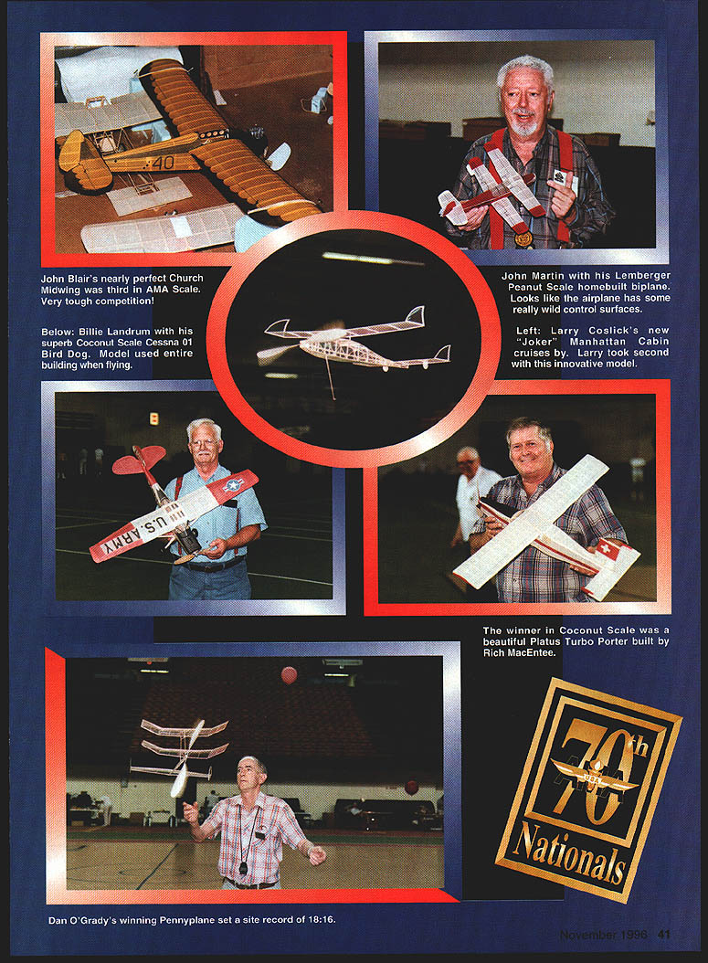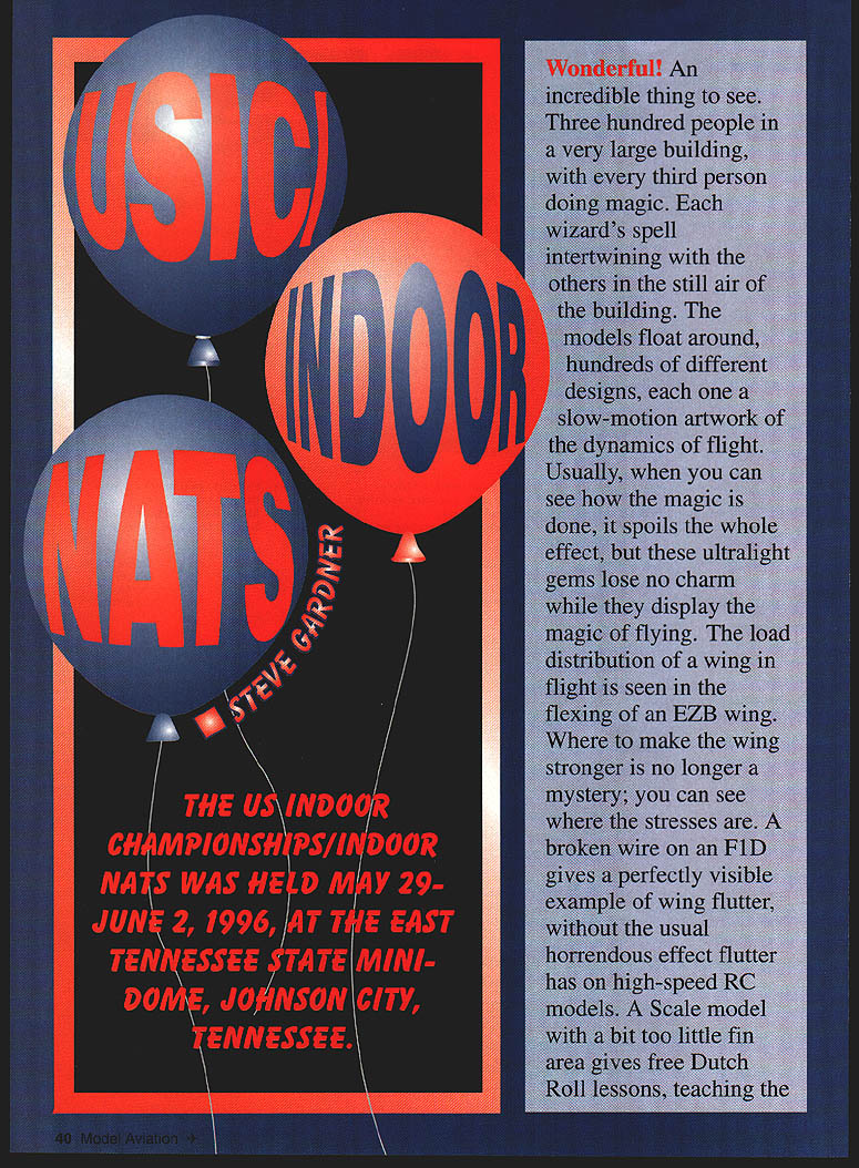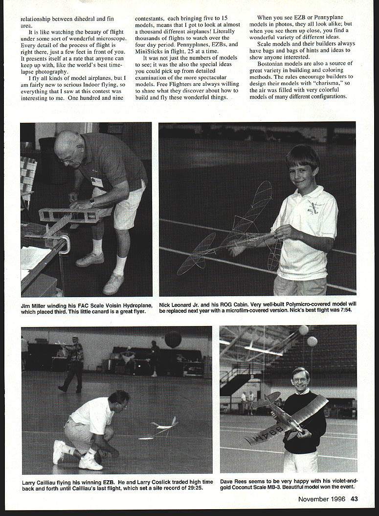 NO OCR TEXT NO OCR TEXT relationship between dihedral fin area like watching beauty flight under some sort wonderful microscope detail process flight right just few feet front presents itself rate anyone can keep up like worlds best timelapse photography fly kinds model airplanes am fairly new serious Indoor flying everything saw contest interesting hundred nine contestants bringing five 15 models means got look almost thousand different airplanes Literally thousands flights watch over four day period Pennyplanes EZBs MiniSticks flight 25 time just numbers models see also special ideas could pick up detailed examination spectacular models Free Flighters always willing share what discover about build fly wonderful things see EZB Pennyplane models photos look alike see up close find wonderful variety different ideas Scale models builders always have bags bags hints ideas show anyone interested Bostonian models also source great variety building coloring methods rules encourage builders design models charisma air filled very colorful models different configurations November 1996 43 Jim Miller winding FAC Scale Voisin Hydroplane Nick Leonard Jr ROG Cabin Very well-built Polymicro-covered model will placed third little canard great flyer replaced next year microfilm-covered version Nicks best flight 754 Larry Cailliau flying winning EZB Larry Coslick traded high time Dave Rees seems very happy violet-andback forth until Cailliaus last flight set site record 2925 gold Coconut Scale MB-3 Beautiful model won event could get really good advice get models fly too models must weight seven grams motor flight times around six minutes makes think magic again magicians gladly told Between little Catapult Gliders magnificent FlD models Omithopters Helicopters MiniSticks Manhattan Cabins Pistachios Peanuts Coconuts bunch other very interesting models watch fly marvel soaked up good ideas could hold met magicians possible Best made new group friends am looking forward meeting again future Indoor meets including next years Nats important element missing Nats next generation mostly home instead attending wonderful event 109 contestants we Junior Senior have figure thing out fix now What going take Most Free Flight people know spend time kids average indeed new Free Flighters arc coming enough great number kids lives could enriched free flight get know problem getting kids interested something worthwhile alone arc creative people have better-thanaverage chance find something works has no offer yet anyone Indoor Free Flight community run USIC/AMA Nats next year Johnson City Abram Van Dover Dave Thomson Jim Miller Mary Jane Barber group did excellent job year certainly deserve guests next time hosts lets get find some heroes next year odei Aviation Clem Dallas TX grins camera first-place trophy USIC Mass Launch P-24 Jim repeated 1995 win time 525 Pistachio Scale Sperry Parasol Ed Ripley Model flew well despite being doublesurface-covered Japanese tissue Holly Vonasek Catapult Glider managed very respectable 1251John Koptonaks seconds best two-flight totalPeanut Bristol Scout I.- Golden Age Fairchild F-24 Ranger beside his