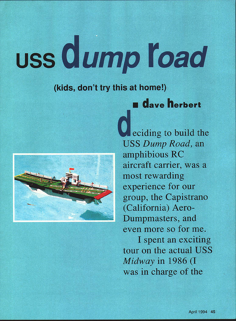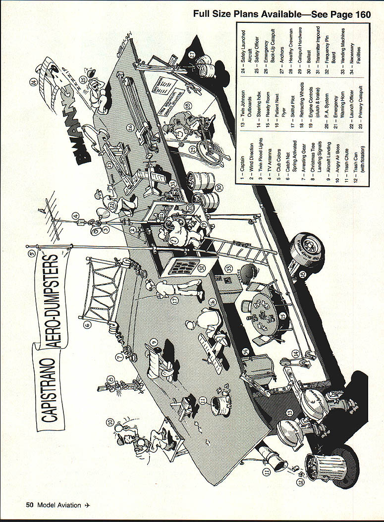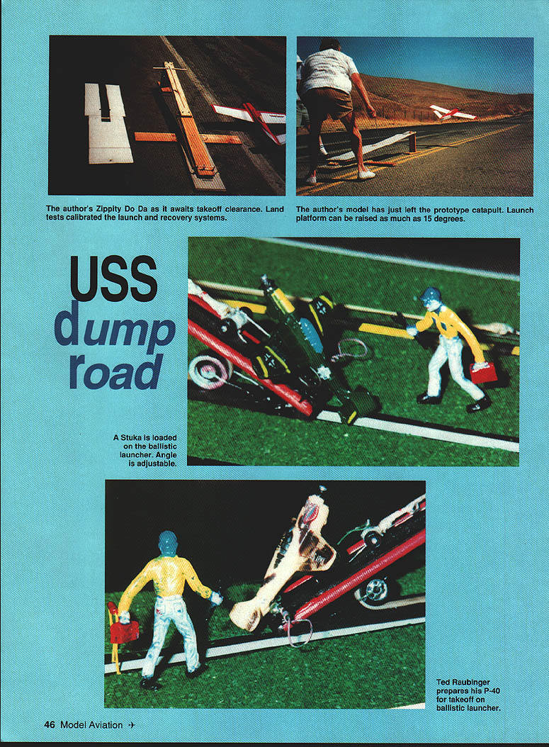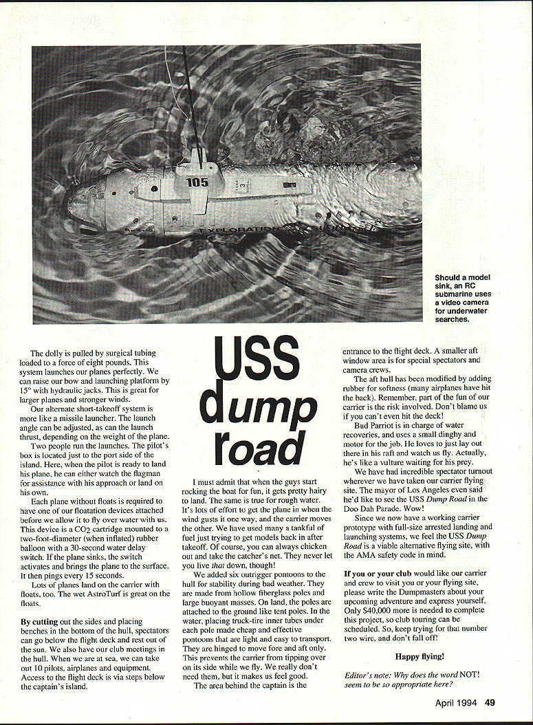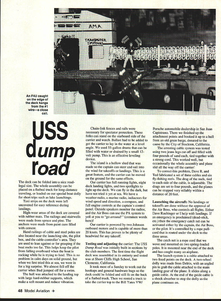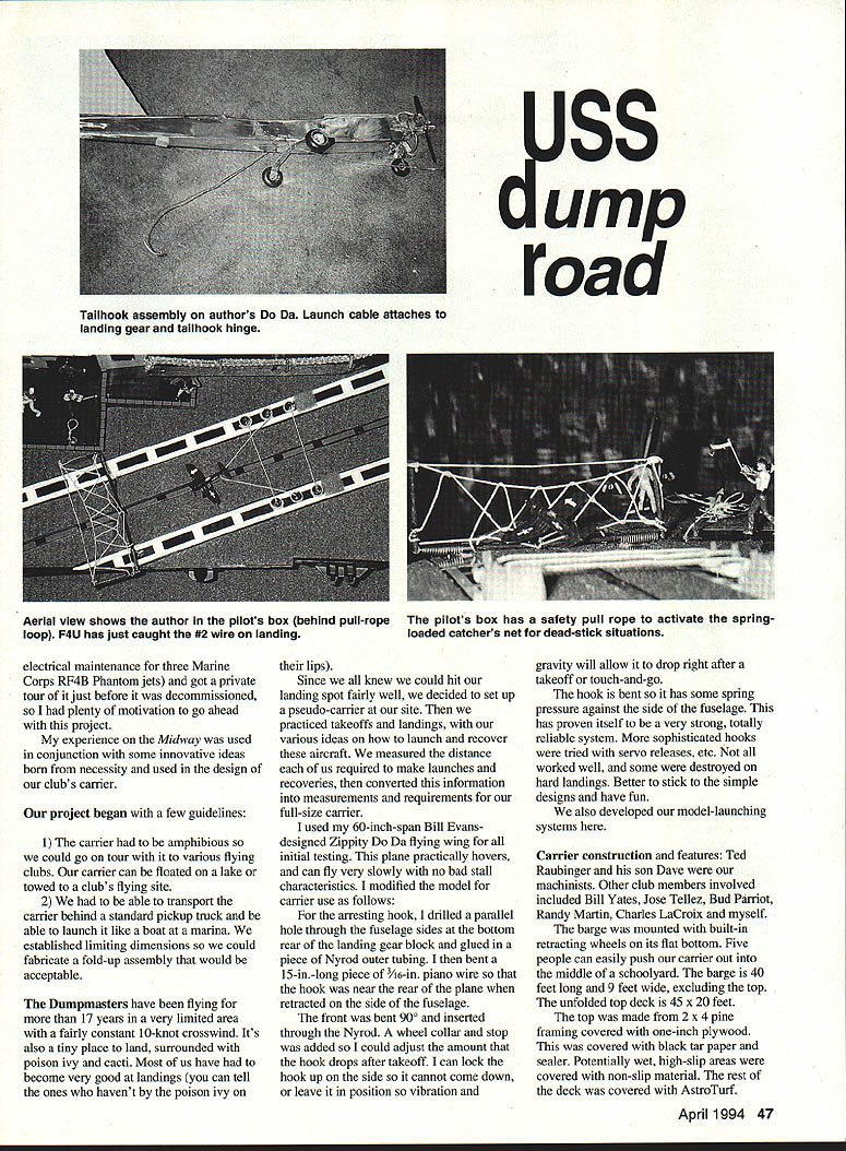 NO OCR TEXT NO OCR TEXT AJSS ump road electrical maintenance three Marine Corps RF4B Phantom jets got private tour just before decommissioned plenty motivation go ahead project experience Midway used conjunction some innovative ideas born necessity used design clubs camer project began few guidelines 1 carrier amphibious could go tour various flying clubs carrier can floated lake towed clubs flying site 2 able transport carrier behind standard pickup truck able launch like boat marina established limiting dimensions could fabricate fold-up assembly would acceptable Dumpmasters have flying 17 years very limited area fairly constant 10-knot crosswind Its also tiny place land surrounded poison ivy cacti Most us have become very good landings can tell ones havent poison ivy lips Since knew could hit landing spot fairly well decided set up pseudo-carrier site practiced takeoffs landings various ideas launch recover aircraft measured distance us required make launches recoveries converted information measurements requirements full-size carrier used 60-inch-span Bill Evansdesigned Zippity Da flying wing initial testing plane practically hovers can fly very slowly no bad stall characteristics modified model carrier use follows arresting hook drilled parallel hole through fuselage sides bottom rear landing gear block glued piece Nyrod outer tubing bent 15-in-long piece 3/16-in piano wire hook near rear plane retracted side fuselage front bent 900 inserted through Nyrod wheel collar stop added could adjust amount hook drops after takeoff can lock hook up side cannot come down leave position vibration gravity will allow drop right after takeoff touch-and-go hook bent has some spring pressure against side fuselage has proven itself very strong totally reliable system sophisticated hooks tried servo releases etc worked well some destroyed hard landings Better stick simple designs have fun also developed model-launching systems Carrier construction features Ted Raubinger son Dave machinists Other club members involved included Bill Yates Jose Tellex Bud Parriot Randy Martin Charles LaCroix myself barge mounted built-in retracting wheels its flat bottom Five people can easily push carrier out middle schoolyard barge 40 feet long 9 feet wide excluding top unfolded top deck 45 x 20 feet top made 2 x 4 pine framing covered one-inch plywood covered black tar paper sealer Potentially wet high-slip areas covered non-slip material rest deck covered AstroTurf April 1994 47 Talihook assembly authors Da Launch cable attaches landing gear talihook hinge Aerial view shows author pilots box behind pull-rope loop F4U has just caught #2 wire landing pilots box has safety pull rope activate spring loaded catchers net dead-stick situations An F4U caught edge deck hangs #1 wirea close call ss ump road deck can folded nice roadlegal size whole assembly can placed flatbed truck long-distance traveling loaded special boat dolly short trips such lake launchings Taxi strips deck left uncovered easy reference during landings High-wear areas deck covered rubber mats railings stairwells made spruce pine anchors made paint cans filled cement Hand railings cable steel poles also located near launching site pilot box cable controllers area used lean against grasping boat rocks too far helps keep pilot falling overboard boat rocking trying land no problem calm days solid ground first tried sea big surprise almost fell off carrier Bud jumped off swim hull attached landing top large hard-rubber supports make soft mount reduce vibration Chain-link fences rails necessary spectator protection folks can stand starboard side carrier watch Ballast added get carrier lay water level angle used 55-gallon drums can filled water drained small 12volt pump effective leveling device island hollow shed made captain can steer sail wind takeoffs landings great feature carrier can moved ground same effects carrier has full running lights night deck landing lights two spotlights light up deck can fly dark have tried yet sea have weather radio marine radio indiactors wind speed direction compass full engine controls captains control panel Outside speakers monitor radios Air Boss can use PA system yell go around common words carrier powered two Johnson outboard motors capable 20 knots has proven plenty headwind takeoff Testing adjusting carrier USS Dump Road initially built sections club members first time flight deck assembled its entirety tested Shore Cliffs High School San Clemente California took Sunday work out hookups general hardware bugs deck could folded still fit back flatbed truck rented truck take carrier top Bill Yates VWI Porsche automobile dealership San Juan Capistrano finished up attachment points hooked up hull old grain barge donated cause City Stockton California arresting cable system tested using two jeans legs cut off filled four pounds sand tied together strong cord worked well occasionally whole assembly plane slid way off carrier correct problem Dave R Ted fabricated set three cables six fly-fishing reels drag reels tied side cable adjustable drags set four pounds planes can stopped very reliably within distance 20 feet Launching aircraft No landings takeoffs done approval Air Boss controls flights Either Dave Raubinger help landings emergency proclaimed dead-stick etc emergency catch net can activated either captain Air Boss pilot Its controlled rope pullcord routed under deck three areas catch net rope cord wove mounted two spring-loaded poles mounted near end deck has caught airplane launch system cable attached two fixed points deck two-wheel dolly made Delrin angled pin grab cable attached main landing gear plane slides along guide cable end guide cable shock absorber stop dolly plane continues 48 Model Aviation y pulled surgical tubing loaded force eight pounds system launches planes perfectly can raise bow launching platform 150 hydraulic jacks great larger planes stronger winds alternate short-takeoff system like missile