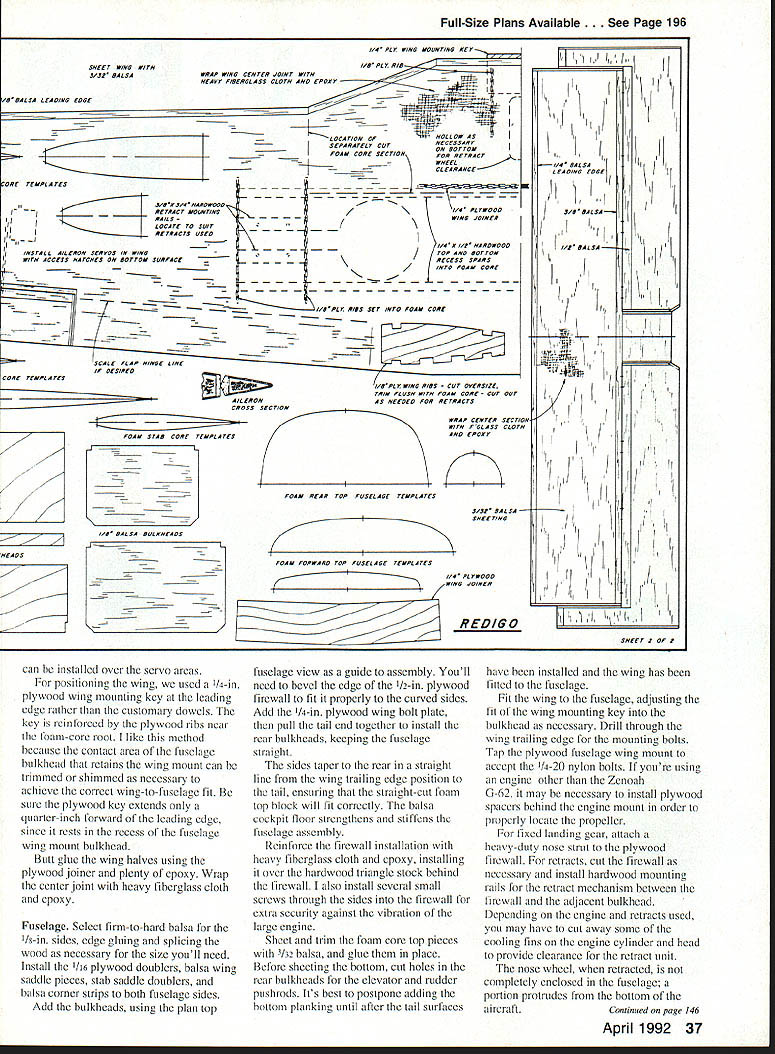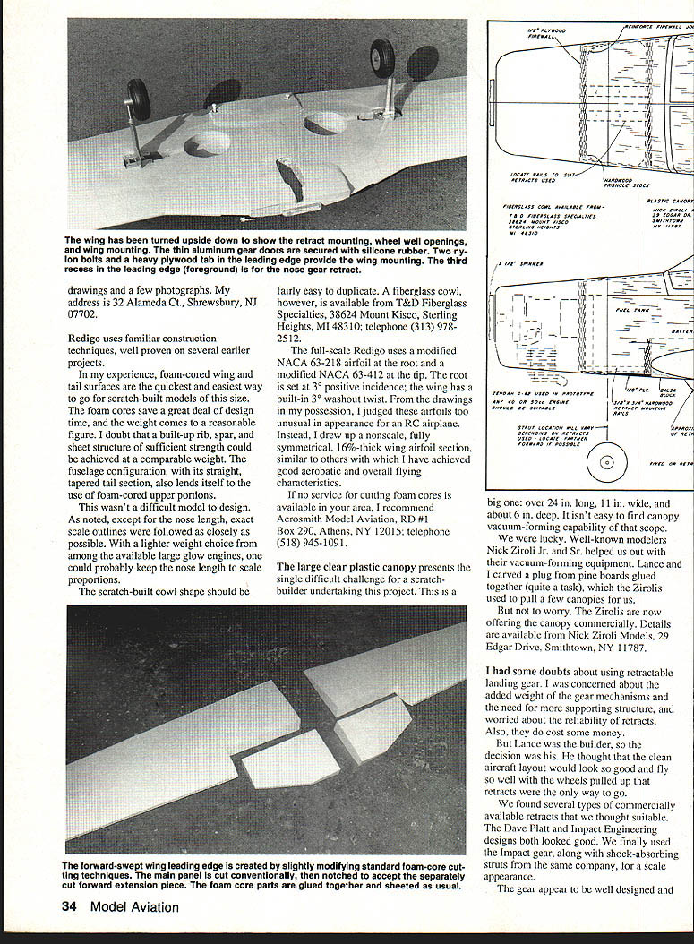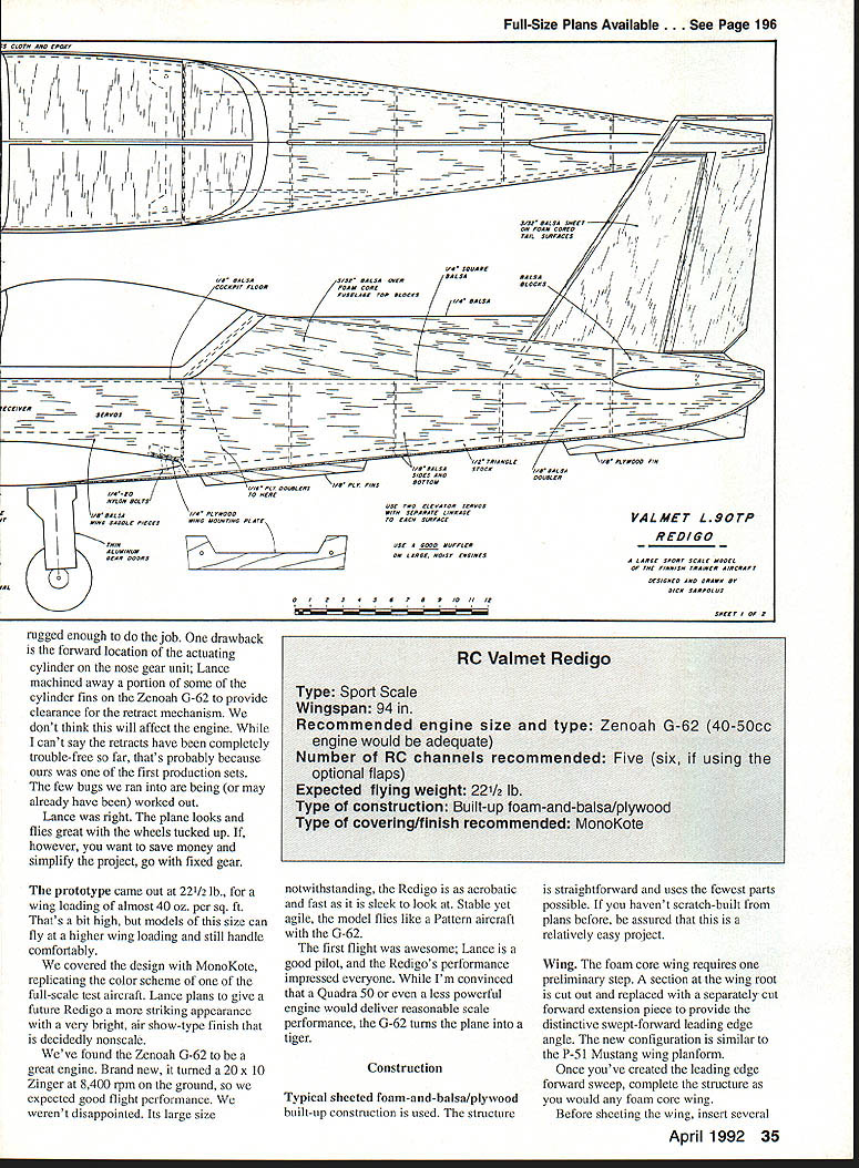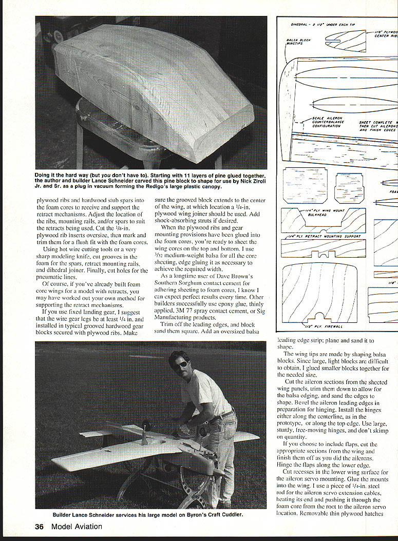 NO OCR TEXT NO OCR TEXT Holding closely possible scale outlines drew up plans 94-in wingspan provided 1300 sq wing area figured would suit Quadra 50 Zenoah 0-62 engine retractable landing gear intentional deviation scale shorten nose length Otherwise model would probably have come out nose-heavy keep project relatively simple left off turbine exhaust stacks air scoop beneath cowl can add details choose Likewise decided flaps unnecessary because anticipated wing loading interested sport aircraft handles well aircraft thats precisely Scale three versions Valmet trainer L-70 L-8OTP L-9OTP would make good Scale projects intend draw up L-70 plans myself near future its barn door wing fixed landing gear shorter nosed piston engine L-70 would easier model build build Send stamped self-addressed envelope two stamps copies three three-view Left Bottoms-up view tail surfaces showing tail skid stabilizer elevators separate pushrods Right Close-up tail feathers model sitting its field stand Note sweptback fin rudder stabilizer elevators counterbalanced elevator 32 Model Aviation Having helped builder Lance Schneider author mold large clear plastic canopy Nick Ziroll Jr Sr now offer Item commercially fiberglass cowl available T&D Fiberglass Specialties Retractable landing gear shock-absorbing struts Impact Engineering add scale appearance Zenoah G-62 engine pushes craft Pattern league 20 x 10 prop spun aluminum spinner both Zinger two-seat cockpit has room two pas senger seats rear Designing model View radio installation Zenoah G-62 engine B&B muffler ImpacT engineering retractable landing gear Note retract gear air pressure filler fitting fuselage bottom next engine elevators have separate servo/pushrod installations Y-adapter used receiver Other servos throttle rudder nose gear steering I z BPLSfl 3HEET OVER OTh DICK S4RPOLz----~I ~auuruu EUWEW PLflSTIC CRNOP9 PILPbLEI FROM NICK ZROII MODE-i-S~7 S4LE -7 7JQBRLSR1141S OR -s I- SUPtO N RECIcL IrSPKING i BRLS SIDE5&O1TOM Ac FIREWOLL 4O op 5O ENGINE- OVER FORM CORE 4z HPRD4o PLY RISS FIBERGL5 COWL Fi T&D FI5ERGLPEE 0 0 drawings few photographs address 32 Alameda Ct Shrewsbury NJ 07702 Redigo uses familiar construction techniques well proven several earlier projects experience foam-cored wing tail surfaces quickest easiest way go scratch-built models size foam cores save great deal design time weight comes reasonable figure doubt built-up rib spar sheet structure sufficient strength could achieved comparable weight fuselage configuration its straight tapered tail section also lends itself use foam-cored upper portions wasnt difficult model design As noted except nose length exact scale outlines followed closely possible lighter weight choice among available large glow engines could probably keep nose length scale proportions scratch-built cowl shape should fairly easy duplicate fiberglass cowl however available T&D Fiberglass Specialties 38624 Mount Kisco Sterling Heights MI 48310 telephone 313 9782512 full-scale Rcdigo uses modified NACA 63-2 18 airfoil root modified NACA 63-4 12 tip root set 30 positive incidence wing has built-in 30 washout twist drawings possession judged airfoils too unusual appearance RC airplane Instead drew up nonscale fully symmetrical 16%-thick wing airfoil section similar others have achieved good aerobatic overall flying characteristics no service cutting foam cores available area recommend Aerosmith Model Aviation RD #1 Box 290 Athens NY 12015 telephone 518 945-1091 large clear plastic canopy presents single difficult challenge scratchbuilder undertaking project Ul PLEWBOB IREALL I2i REINFORCE FIREWALL i1i1I 11111 _____________ 217~ liii Locate PAILS TO SUIT RETRACTS USEDHARDWOOD TRIANGLE SroCK FIBERGLASS COWL AVAIL ABLE FROM TAO FIBERGLASS SPECIALTIES 3*820 MOUNT KISCO STERLING HEIGHTS MI BASID L12 SPINNER / 1'i JI 7 j4A 7i-~--ZENOAK GB USED IN PROTOTTPE ANT 00 OR ROtC ENGINE SHRUG 0 BE SGITADLB PCASIIC TANG NICK ZIROLI 20 EDGAR 0 SMITH TOWN FUEL TANK -BArn 1 -I PLT BALSA BLOCK VBA 3/4 HA NO WOOD RETRACT MOUNTING STRUT LOCATION WILL ART OCPINOING ON RETRACTS I OSEG LOCATE FARTHER FORWARD IF POSSIBLE FIXED OR RE big over 24 long 11 wide about 6 deep isnt easy find canopy vacuum-forming capability scope lucky Well-known modelers Nick Ziroli Jr Sr helped us out vacuum-forming equipment Lance carved plug pine boards glued together quite task Zirolis used pull few canopies us worry Zirolis now offering canopy commercially Details available Nick Ziroli Models 29 Edgar Drive Smithtown NY 11787 some doubts about using retractable landing gear concerned about added weight gear mechanisms need supporting structure worried about reliability retracts Also cost some money Lance builder decision thought clean aircraft layout would look good fly well wheels pulled up retracts way go found several types commercially available retracts thought suitable Dave Platt Impact Engineering designs both looked good finally used Impact gear along shock-absorbing struts same company scale appearance gear appear well designed 34 Model Aviation wing has turned upside down show retract mounting wheel well openings wing mounting thin aluminum gear doors secured silicone rubber Two ny lon bolts heavy plywood tab leading edge provide wing mounting third recess leading edge foreground nose gear retract forward-swept wing leading edge created slightly modifying standard foam-core cut ting techniques main panel cut conventionally notched accept separately cut forward extension piece foam core parts giued together sheeted usuai Full-Size Plans AvailableSee Page 196 S CLOTH AND EPOXY Ii _______ 7/H--I.4 111iiI1 IIrJAr BALSA SKEET ON FOAM LOBED TAIL SURFACES IB SODA RE IB BALSA,r BALSA DYERBLOCKS COCKPIT FLOORFDA/A CORE FUSELABE TOP BLOCKS AC BALSA ~-- // II -___- /tf CCII VER MD BALSASTOCKlAB BALSA DOUBLER I/IC PLY OSUOL IRSlAB PLr FINSBOTTOM IACDOTO HERE NYLON BOLTS USE rWO ELEVATOR SERVOS UB BALSAAB PLYWOODWITH SEPARATE LINKAGE VALMET L9OTP WINO SADDLE PIECES