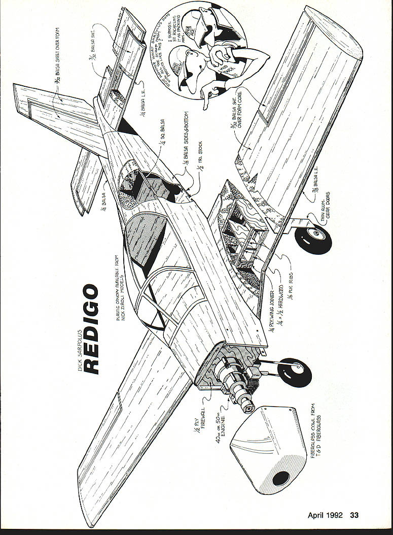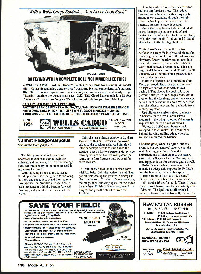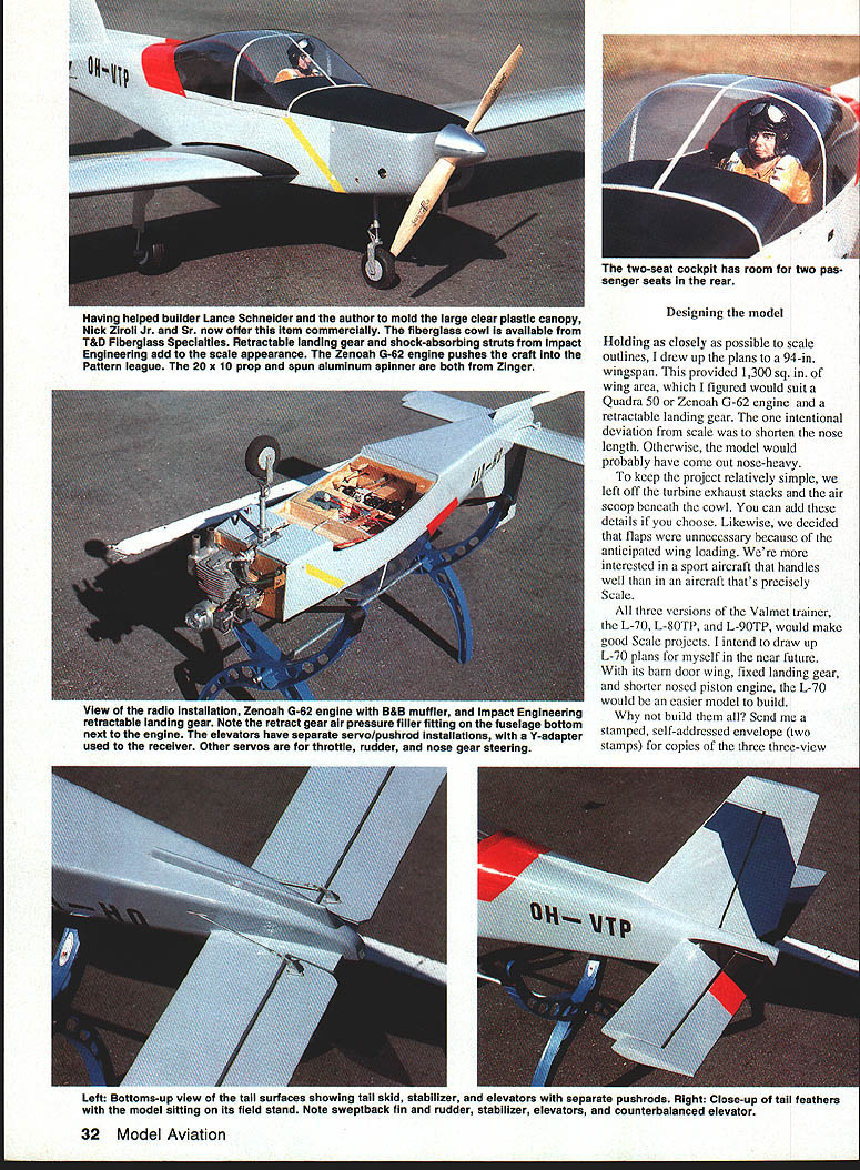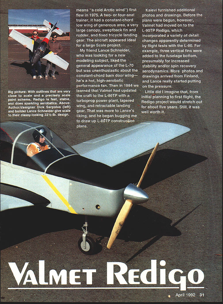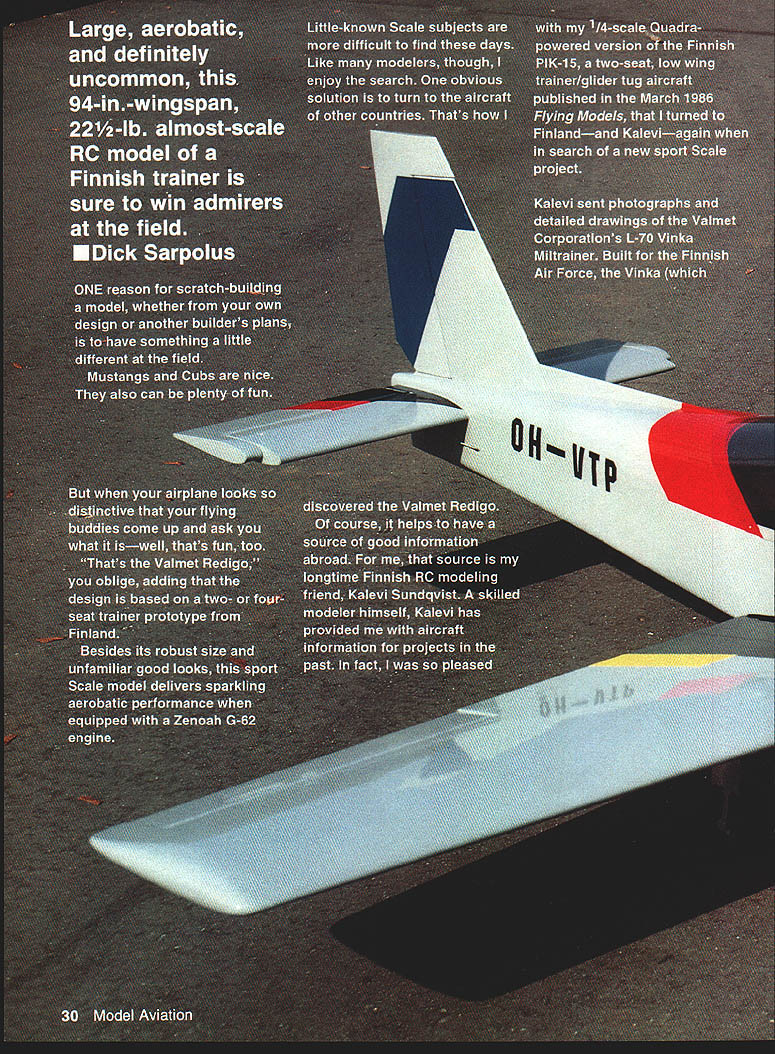 NO OCR TEXT NO OCR TEXT Holding closely possible scale outlines drew up plans 94-in wingspan provided 1300 sq wing area figured would suit Quadra 50 Zenoah 0-62 engine retractable landing gear intentional deviation scale shorten nose length Otherwise model would probably have come out nose-heavy keep project relatively simple left off turbine exhaust stacks air scoop beneath cowl can add details choose Likewise decided flaps unnecessary because anticipated wing loading interested sport aircraft handles well aircraft thats precisely Scale three versions Valmet trainer L-70 L-8OTP L-9OTP would make good Scale projects intend draw up L-70 plans myself near future its barn door wing fixed landing gear shorter nosed piston engine L-70 would easier model build build Send stamped self-addressed envelope two stamps copies three three-view Left Bottoms-up view tail surfaces showing tail skid stabilizer elevators separate pushrods Right Close-up tail feathers model sitting its field stand Note sweptback fin rudder stabilizer elevators counterbalanced elevator 32 Model Aviation Having helped builder Lance Schneider author mold large clear plastic canopy Nick Ziroll Jr Sr now offer Item commercially fiberglass cowl available T&D Fiberglass Specialties Retractable landing gear shock-absorbing struts Impact Engineering add scale appearance Zenoah G-62 engine pushes craft Pattern league 20 x 10 prop spun aluminum spinner both Zinger two-seat cockpit has room two pas senger seats rear Designing model View radio installation Zenoah G-62 engine B&B muffler ImpacT engineering retractable landing gear Note retract gear air pressure filler fitting fuselage bottom next engine elevators have separate servo/pushrod installations Y-adapter used receiver Other servos throttle rudder nose gear steering I z BPLSfl 3HEET OVER OTh DICK S4RPOLz----~I ~auuruu EUWEW PLflSTIC CRNOP9 PILPbLEI FROM NICK ZROII MODE-i-S~7 S4LE -7 7JQBRLSR1141S OR -s I- SUPtO N RECIcL IrSPKING i BRLS SIDE5&O1TOM Ac FIREWOLL 4O op 5O ENGINE- OVER FORM CORE 4z HPRD4o PLY RISS FIBERGL5 COWL Fi T&D FI5ERGLPEE 0 0 drawings few photographs address 32 Alameda Ct Shrewsbury NJ 07702 Redigo uses familiar construction techniques well proven several earlier projects experience foam-cored wing tail surfaces quickest easiest way go scratch-built models size foam cores save great deal design time weight comes reasonable figure doubt built-up rib spar sheet structure sufficient strength could achieved comparable weight fuselage configuration its straight tapered tail section also lends itself use foam-cored upper portions wasnt difficult model design As noted except nose length exact scale outlines followed closely possible lighter weight choice among available large glow engines could probably keep nose length scale proportions scratch-built cowl shape should fairly easy duplicate fiberglass cowl however available T&D Fiberglass Specialties 38624 Mount Kisco Sterling Heights MI 48310 telephone 313 9782512 full-scale Rcdigo uses modified NACA 63-2 18 airfoil root modified NACA 63-4 12 tip root set 30 positive incidence wing has built-in 30 washout twist drawings possession judged airfoils too unusual appearance RC airplane Instead drew up nonscale fully symmetrical 16%-thick wing airfoil section similar others have achieved good aerobatic overall flying characteristics no service cutting foam cores available area recommend Aerosmith Model Aviation RD #1 Box 290 Athens NY 12015 telephone 518 945-1091 large clear plastic canopy presents single difficult challenge scratchbuilder undertaking project Ul PLEWBOB IREALL I2i REINFORCE FIREWALL i1i1I 11111 _____________ 217~ liii Locate PAILS TO SUIT RETRACTS USEDHARDWOOD TRIANGLE SroCK FIBERGLASS COWL AVAIL ABLE FROM TAO FIBERGLASS SPECIALTIES 3*820 MOUNT KISCO STERLING HEIGHTS MI BASID L12 SPINNER / 1'i JI 7 j4A 7i-~--ZENOAK GB USED IN PROTOTTPE ANT 00 OR ROtC ENGINE SHRUG 0 BE SGITADLB PCASIIC TANG NICK ZIROLI 20 EDGAR 0 SMITH TOWN FUEL TANK -BArn 1 -I PLT BALSA BLOCK VBA 3/4 HA NO WOOD RETRACT MOUNTING STRUT LOCATION WILL ART OCPINOING ON RETRACTS I OSEG LOCATE FARTHER FORWARD IF POSSIBLE FIXED OR RE big over 24 long 11 wide about 6 deep isnt easy find canopy vacuum-forming capability scope lucky Well-known modelers Nick Ziroli Jr Sr helped us out vacuum-forming equipment Lance carved plug pine boards glued together quite task Zirolis used pull few canopies us worry Zirolis now offering canopy commercially Details available Nick Ziroli Models 29 Edgar Drive Smithtown NY 11787 some doubts about using retractable landing gear concerned about added weight gear mechanisms need supporting structure worried about reliability retracts Also cost some money Lance builder decision thought clean aircraft layout would look good fly well wheels pulled up retracts way go found several types commercially available retracts thought suitable Dave Platt Impact Engineering designs both looked good finally used Impact gear along shock-absorbing struts same company scale appearance gear appear well designed 34 Model Aviation wing has turned upside down show retract mounting wheel well openings wing mounting thin aluminum gear doors secured silicone rubber Two ny lon bolts heavy plywood tab leading edge provide wing mounting third recess leading edge foreground nose gear retract forward-swept wing leading edge created slightly modifying standard foam-core cut ting techniques main panel cut conventionally notched accept separately cut forward extension piece foam core parts giued together sheeted usuai Full-Size Plans AvailableSee Page 196 S CLOTH AND EPOXY Ii _______ 7/H--I.4 111iiI1 IIrJAr BALSA SKEET ON FOAM LOBED TAIL SURFACES IB SODA RE IB BALSA,r BALSA DYERBLOCKS COCKPIT FLOORFDA/A CORE FUSELABE TOP BLOCKS AC BALSA ~-- // II -___- /tf CCII VER MD BALSASTOCKlAB BALSA DOUBLER I/IC PLY OSUOL IRSlAB PLr FINSBOTTOM IACDOTO HERE NYLON BOLTS USE rWO ELEVATOR SERVOS UB BALSAAB PLYWOODWITH SEPARATE LINKAGE VALMET L9OTP WINO SADDLE PIECES