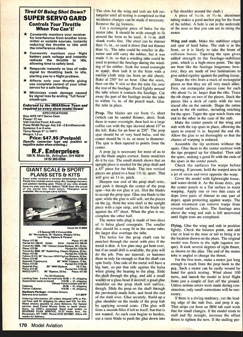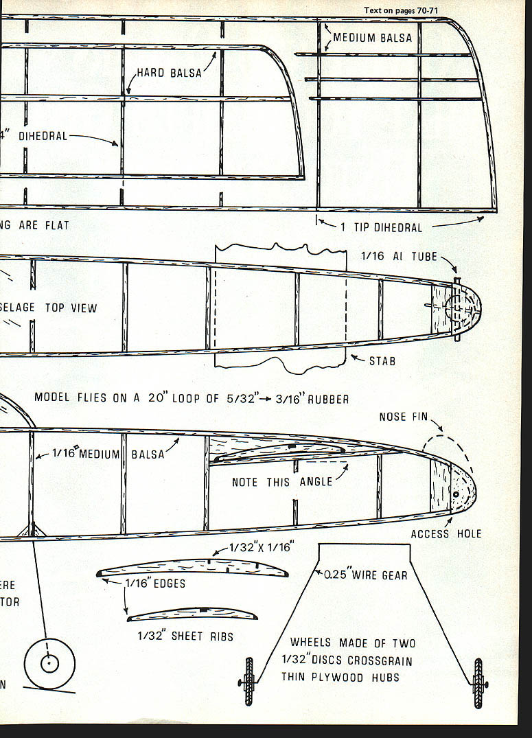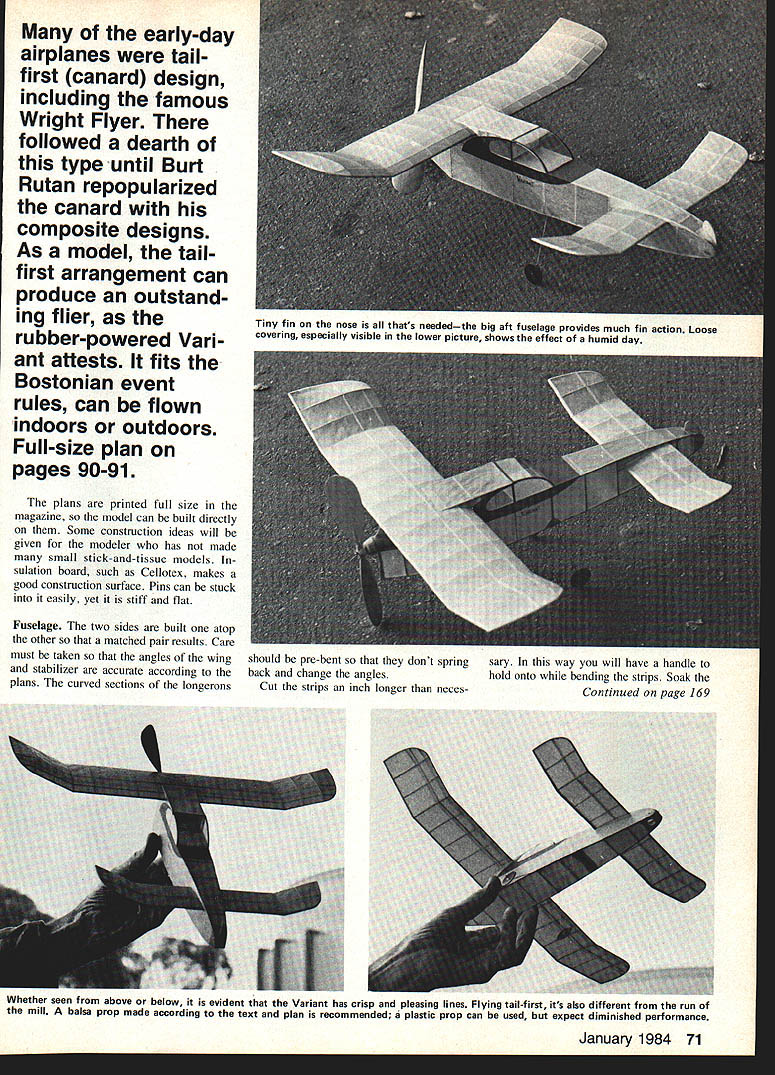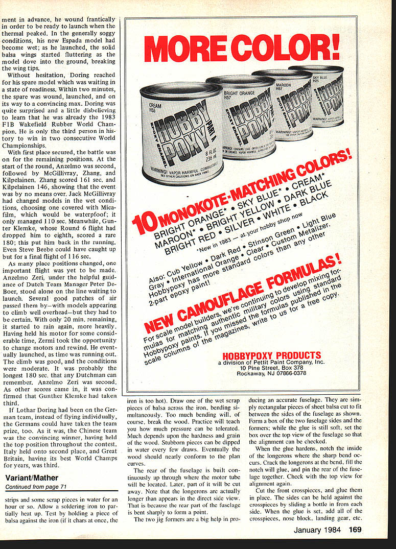 THE BOSTONIAN Ev ers like small spot easy build semiscale pable good flights small gyms event wingspan 16 ii three fuselage lengi diameter six ture must enclose v X l/ inches minin least two wheels meter fuselage two side windows ol area course powered As originated seven grams Mooney muci tise size 14 grams would b cially inexperi club Scale Statte conducted several con rule like heavier model quite strong can survive bang ing around Free Flight models likely experience tissue can shrunk doped producing attractive model models can flown indoors outdoors rules may seem very restrictive variety designs have resulted much creativity being utilized tried canard configuration several reasons rub ber motor can run full length fuse lage maximum use turns large side area fuselage box could located rearward providing fin action upper picture power rubber motor tapering off Variant begins slow descent landing An illusion seems taking place model doesnt come down steeply picture seems indi cate lower picture glide looks normal goes San Diegos Aero space Museum Model can flown outdoors wind down Fudo Takagi pictures moved about produce best trim plastic propeller used rather sheet balsa shown dead weight will have right nose Perhaps some additional weight over 14-gram total will required plastic props two three times heavier builtup type An experienced modeler could built Variant down seven-gram rule would entail use smaller wood sizes con denser tissue covering no dope V Most important canard good flying stable configuration Some years ago canards rare early-day airplanes tailfirst canard design including famous Wright Flyer followed dearth type until Burt Rutan repopularized canard composite designs As model tailfirst arrangement can produce outstand ing flier rubber-powered Vari ant attests fits Bostonian event rules can flown indoors outdoors Full-size plan pages 90-91 plans printed full size magazine model can built directly Some construction ideas will given modeler has made small stick-and-tissue models sulation board such Cellotex makes good construction surface Pins can stuck easily yet stiff flat Fuselage two sides built atop other matched pair results Care must taken angles wing stabilizer accurate according plans curved sections longerons Whether seen above below evident Variant has crisp pleasing lines Flying tail-first its also different run mill balsa prop made according text plan recommended plastic prop can used expect diminished performance January 1984 71 should pre-bent dont springsary way will have handle back change angleshold onto bending strips Soak Cut strips inch longer neces-Continued page 169 BEND TWO PIECES OF 1/32X 1/16TO FORM TIP STAB I H SPAR TAPERED 1 11 BREAK HERE F p B j STAB THIN METAL UBEARING AS 008 BRASS [-j*1 PROP SHAFT BEARING DETAIL 1/8 VERY/ HARD /8DISCliii I WIRE 41 [020 III I\ I II k 450BLADE ANGLE if' fi 1 - 1/32 It U 1Ij II 1I ACTUAL LONGERON LENGTH 0015WIRE SKID 1 / / BALSA / / I/ PROP JIG II I II i1iJIG FORMER Ii II Ii II ii iI Ii II II II II II Ii BALANC WITH DL 14 GRAM BOSTONIAN CMOAVL FULL SI / Ii I/I Text pages 70-7 1 IfiMEOIUM BALSA HARD BALSAS - DIHEDRAL--~ p I______ G ARE FLAT1 TIP DIHEDRAL 1/16 ALTUBE — -N II IIU III ELAGE TOP VIEWI/ III II/I E NNuI -- STAB MODEL FLIES ON 20 LOOP OF 5/32 3/16RUBBER NOSE FIN _______ ______N 25-----I 1/16 MEDIUMBALSA_ NOTE THIS ANGLEV CCESS HOLE RE TOR 1132 SHEET RIBS WHEELS MADE OF TWO 1/32DISCS CROSSORAIN NQ ment advance wound frantically order ready launch thermal peaked generally soggy conditions new Espada model become wet launched solid balsa wings started fluttering model dove ground breaking wing tips Without hesitation Doring reached spare model waiting state readiness Within two minutes spare wound launched its way convincing max Doring quite surprised little disbelieving learn already 1983 FlB Wakefield Rubber World Cham pion third person tory win two consecutive World Championships first place secured battle remaining positions start round Anzelmo second followed McGihivray Zhang Kilpelainen Zhang scored 161 sec Kilpelainen 146 showing event no means over Jack McGillivray changed models wet condi tions choosing covered Micafilm would waterpfoof managed 110 sec Meanwhile Gun ter Klemke Round 6 flight dropped him eighth scored rare 180 put him back running Steve Beebe could have caught up final flight 116 sec As place positions changed important flight yet made Anzelmo Zen under helpful guid ance Dutch Team Manager Peter De Boer stood alone line waiting launch Several good patches air passed bywith models appearing climb well overheadbut certain 20 mm remaining started rain again heavily Having held motor some consid erable time Zermi took opportunity change motors rewind event ually launched time running out climb good conditions moderate probably longest 180 sec Dutchman can remember Anzelmo Zen second As other scores came con firmed Gunther Klemke taken third Lothar Doring Ger man team instead flying individualiy Germans could have taken team prize too As Chinese team convincing winner having held top position throughout contest Italy held onto second place Great Britain having its best World Champs years third Variant/Mather Continued page 71 MORE COLOR 0 Ge ~Lr6 QO r0 0 \\e eS AO iron too hot Draw wet scrap pieces balsa across iron bending si multaneously Too much bending will course break wood Practice will teach much pressure can tolerated Much depends upon hardness grain wood Stubborn pieces can dipped water few draws Eventually wood should nearly conform plan curves rear fuselage built con tinuously up through motor tube will located Later part will cut away Note longerons actually longer appears direct side view because rear part fuselage bent sharply form point two jig formers big help proHOBBYPOXY PRODUCTS a division Pettit Paint Company Inc 10 Pine Street Box 378 Rockaway NJ 07866-0378 ducing accurate fuselage sim ply rectangular pieces sheet balsa cut fit between sides fuselage shown F