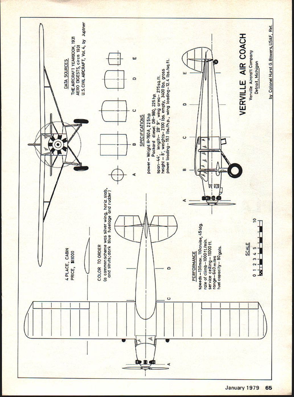 4 PLACE CABIN PRICE 511000 czz COLOR TO ORDER common scheme silver wing horizstab strutsdark blue fuselage rudder C0 PERFORMANCE speedsl3Omax ilOcruise 451dg rate ctimblOOOft/min service ceiling 11000 ft range 640 miLes fuel capacity B0 gals SCALE 01234510 II IIIII DATA SOURCES THE AIRCRAFT YEARBOOK 1931 AERO DIGESTS circa 1931 US CIVIL AIRCRAFT Vol4 Juptner DE SPECIFICATIONS power ht R-760A 225 ltp Packard diesel DR-980 225 hp span-44 length 28 9 wing area 275sqft height ights 2100 lbs empty 3400 lbs gross power loading151 lbsjhp wing loading124 lbsjsqft ABCDE N V VERVILLE AIR COACH Verville Aircraft Company Detroit Michigan Colonel Hurst G BowersUSAF Ret IUaZ7TW