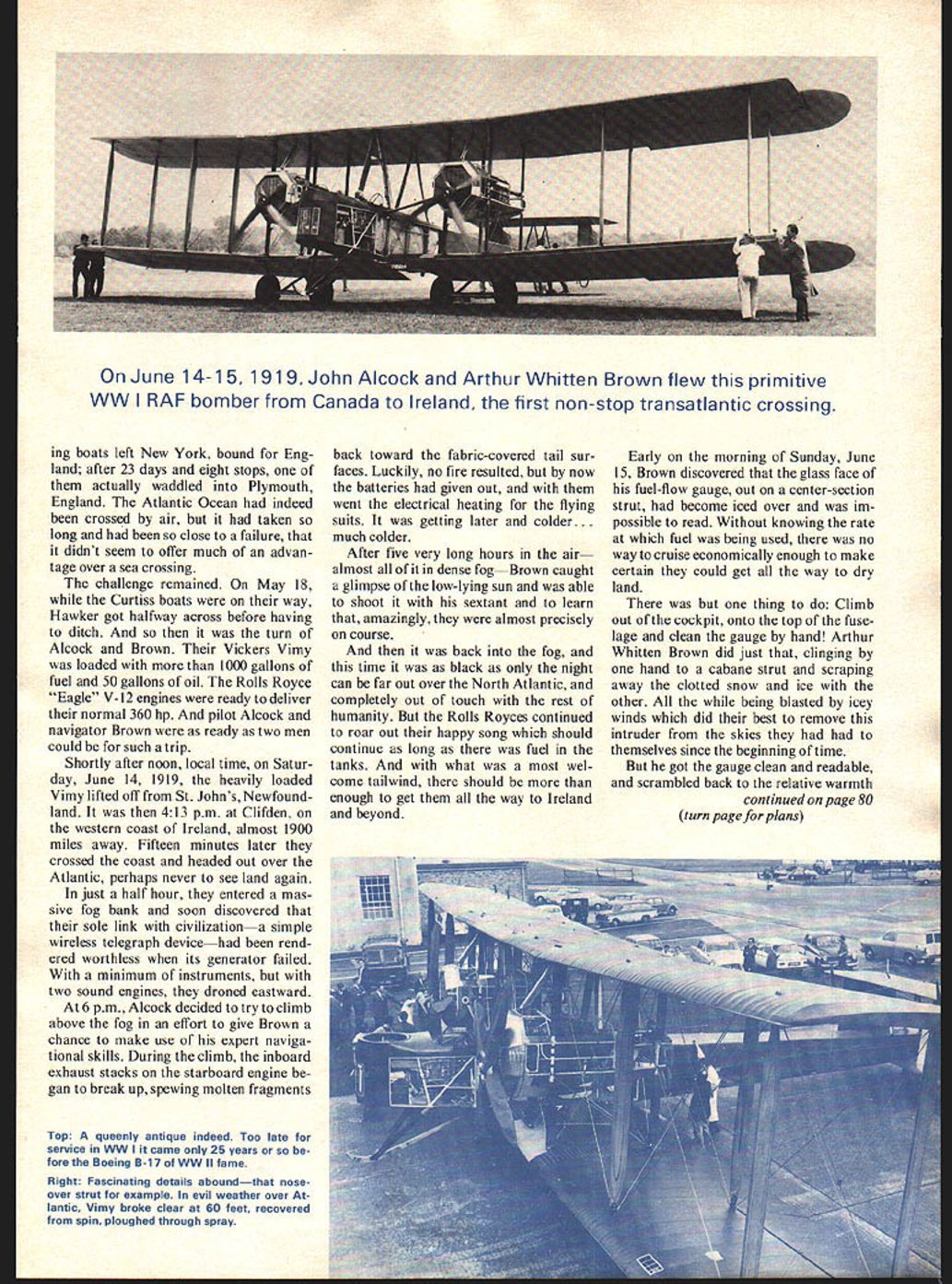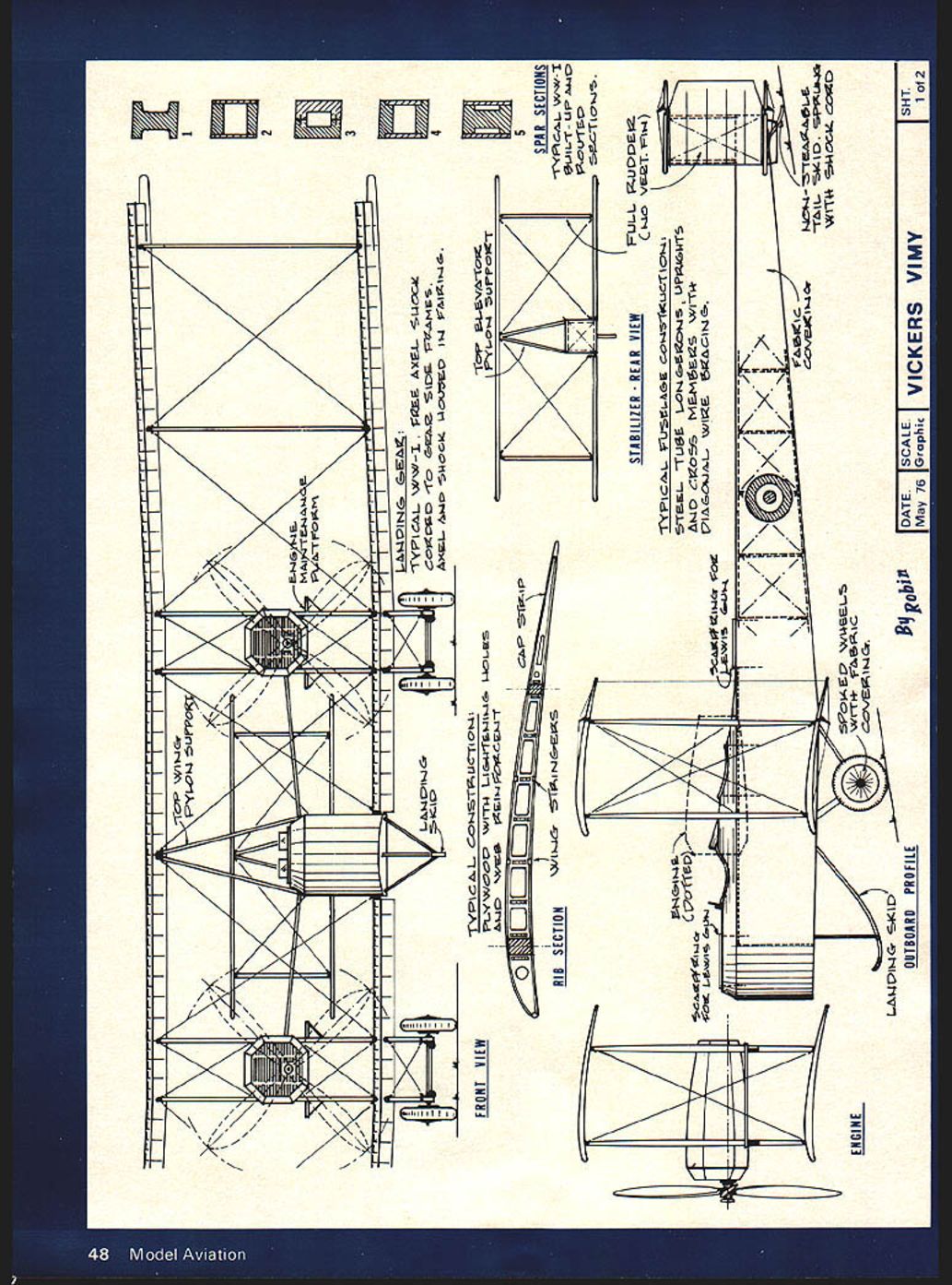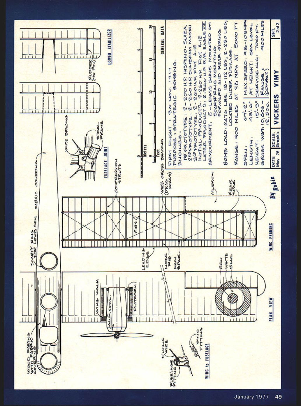 Vickers 0 Vimy OPEN-COCKPIT biplanes fun Like Pitts Specials aerobatics Wacos Stearmans nostalgic short hops airport next serious flying youd rather sensible people prefer airplanes tops keep out wind rain cold course hasnt always way Time flying men knew wasnt safe sit inside protected wind Because wind told things going right going wrong since instruments rarely right electronic navigation aids hadnt broken science fiction today otherwise rational peo ple some funny things thoroughly uncomfortable airplanes weve got jolly friend has racked up well over 5000 miles cross-country flying open-everything Breezy thats mostly summer mostly dry weather As people intention ally go places bad weather protection least canopy theyre either gluttons punishment doing best can what theyve got two young Britishers set out become hrst fly forbidding Atlantic Ocean non-stop werent first try others embarked before Harry Hawker Mackenzie-Grieve got halfway Sopwith Atlantic before landing drink Raynham Morgan didnt get Martinsyde far end runway Still others hadnt gotten far plans failures did nothing dis courage vast mysteri ous icey Atlantic greatest Top This reproduction built 50th Anni versery Atlantic flight attended 1969 Paris Air Show Plane made Atlantic hop hangs Englands Science Museum challenges Atlantic wasnt com pletely unknown ships plying hundreds perhaps thousands years climb above rickety airplane having crude radio few instruments would clearly involve bravery skill luck unprecedented quanti ties As John Alcock Arthur Whitten Brown proceeded plans fly converted Vickers Vimy bomber Canada Ireland rivals trying put plans action well no strictly-for-glory stunt Lord Northcliffe towering figure British newspaper industry offered prize $50000 first direct crossing between Great Britain North America calm aftermath Great War such prize stirred hearts bored aviator Early May 1919 Alcock Brown airplane arrived ship New foundland Already scene Harry Hawker later gain fame classic fighter planes Martinsyde crew May 8 fleet four Curtiss NC fly46 Model Aviation Don Berliner Below Under urging twin Rolls-Royce 360hp Eagles reproduction taxies grassprobably save its tail skid June 14-1 5 1 91 9 John Alcock Arthur Whitten Brown flew primitive WW RAF bomber Canada Ireland first non-stop transatlantic crossing ing boats left New York bound Eng land after 23 days eight stops actually waddled Plymouth England Atlantic Ocean indeed crossed air taken long close failure didnt seem offer much advan tage over sea crossing challenge remained May 18 Curtiss boats way Hawker got halfway across before having ditch turn Alcock Brown Vickers Vimy loaded 1000 gallons fuel 50 gallons oil Rolls Royce Eagle V-12 engines ready deliver normal 360 hp pilot Alcock navigator Brown ready two men could such trip Shortly after noon local time Satur day June 14 1919 heavily loaded Vimy lifted off St Johns Newfound land 413 pm Clifden western coast Ireland almost 1900 miles away Fifteen minutes later crossed coast headed out over Atlantic perhaps never see land again just half hour entered mas sive fog bank soon discovered sole link civilization simple wireless telegraph devicehad rend ered worthless its generator failed minimum instruments two sound engines droned eastward 6 pm Alcock decided try climb above fog effort give Brown chance make use expert naviga tional skills During climb inboard exhaust stacks starboard engine gan break up spewing molten fragments Top A queenly antique indeed Too late service WW came 25 years fore Boeing B-il WW II fame Right Fascinating details aboundthat noseover strut example evil weather over lantic Vimy broke clear 60 feet recovered spin ploughed through spray back toward fabric-covered tail sur faces Luckily no fire resulted now batteries given out went electrical heating flying suits getting later colder. much colder After five very long hours air almost dense fogBrown caught glimpse low-lying sun able shoot sextant learn amazingly almost precisely course back fog time black night can far out over North Atlantic completely out touch rest humanity Rolls Royces continued roar out happy song should continue long fuel tanks what wel come tailwind should enough get way Ireland beyond Early morning Sunday June 15 Brown discovered glass face fuel-flow gauge out center-section strut become iced over im possible read Without knowing rate fuel being used no way cruise economically enough make certain could get way dry land thing Climb out cockpit onto top fuse lage clean gauge hand Arthur Whitten Brown did just clinging hand cabane strut scraping away clotted snow ice other being blasted icey winds did best remove intruder skies had themselves since beginning time got gauge clean readable scrambled back relative warmth continued page 80 turn page plans II / \ N \ I I U fJf} FRONT VIEW II I Al III I IIIIII - \~i-J / -N \ \\ I I I II 1VFC -TUCTI Oi& RIB ION Trsa&IzE COiOBD 1c eAe SD2 AM5i PYLOtJ LPPT TARII I7FR REAR VIEW 1Y PlC L U~Lh64 CO4S1ZUC lO-4 1 3 U 5 SPAR SECTIONS r%Plc1L v/-I LilLT- UP -ic 3 5CT& 0 LL IZUO2 C i-io VET vh-a /II\ AN/ININ rr Hcc1e C0D ENGINE 4c OUTBOARD PROFILEqobiPIDATE I~I VICKERS VIMYI SHT I1 &0c VO 1~ECI dUh40Zic iiNIIIINhl gnu U - I - I 2 WING FUSELAGE ILEAI2It4G tic Mui-1 -4--__ - -WING FRAMING FUSELAGE JOINT 0 5 feet LX -I 2 10 guro 15 GENERAL DATA OfO1YPE Q- 2C0W1 F7T I-I2 14fl&L PPocUCT2- 2-2o NF TE2 0E2UCT- 2-3c0 4P V2 EAGL~vrrr AA0UMENT LEN/E &U4I Ut4Tt LOiP 47 Iv2 L66 -23o L~-J 4G- oo N1LS tT q MI ACt Eooo PT Z M FEZ MP L4TI-44~AT -AEAGWt L2VKL eoe ecc 4ILES PLAN VIEWI SHT ~0biP 1DATE ISCALEIVIC KERS VIMY -I LOWER STABILIlER 9A23455 Meters [Au I/C IrnI BOX 511E HIGGINSVILLE MISSOURI 64037 Vickers Vimy continued page 47 comfort open cockpit over again again again long storm lasted seemed forever ac counts tell Brown also cleaning snow ice shutters front engine radiators own story mentions nothing sort three morning still good 600 miles land Vimy suddenly broke free clouds 
