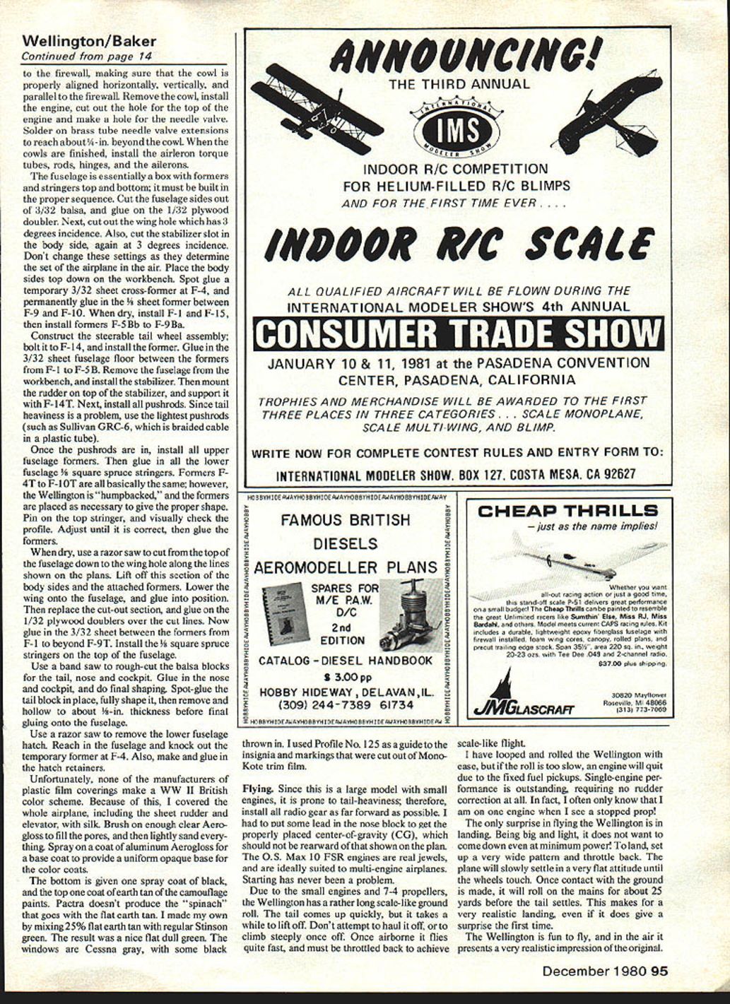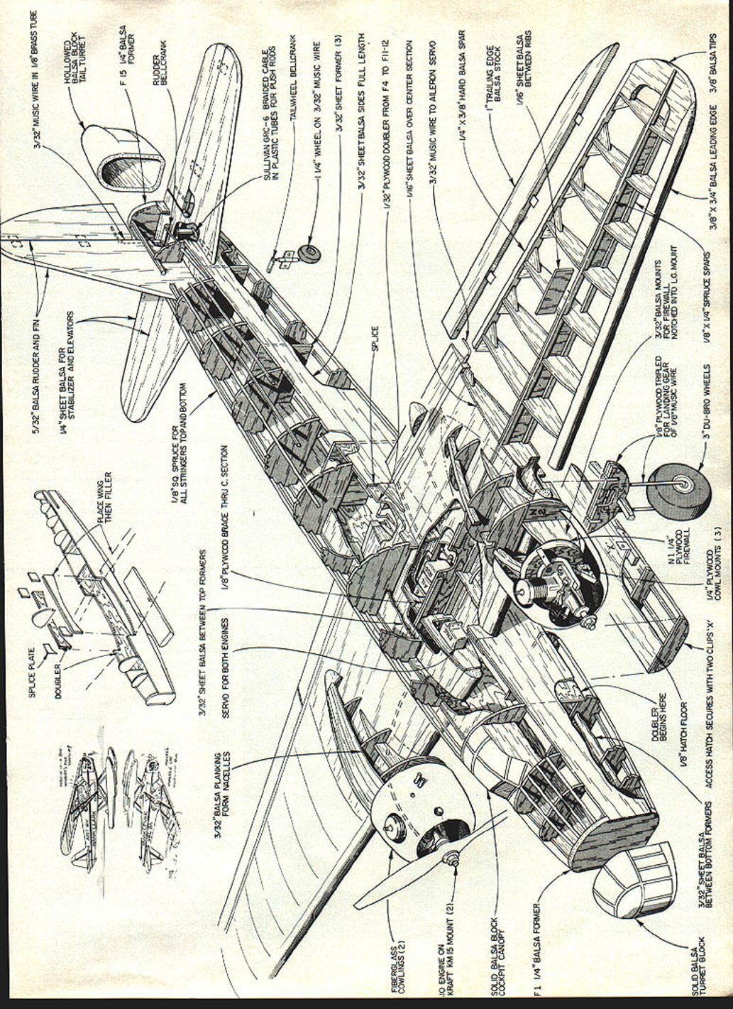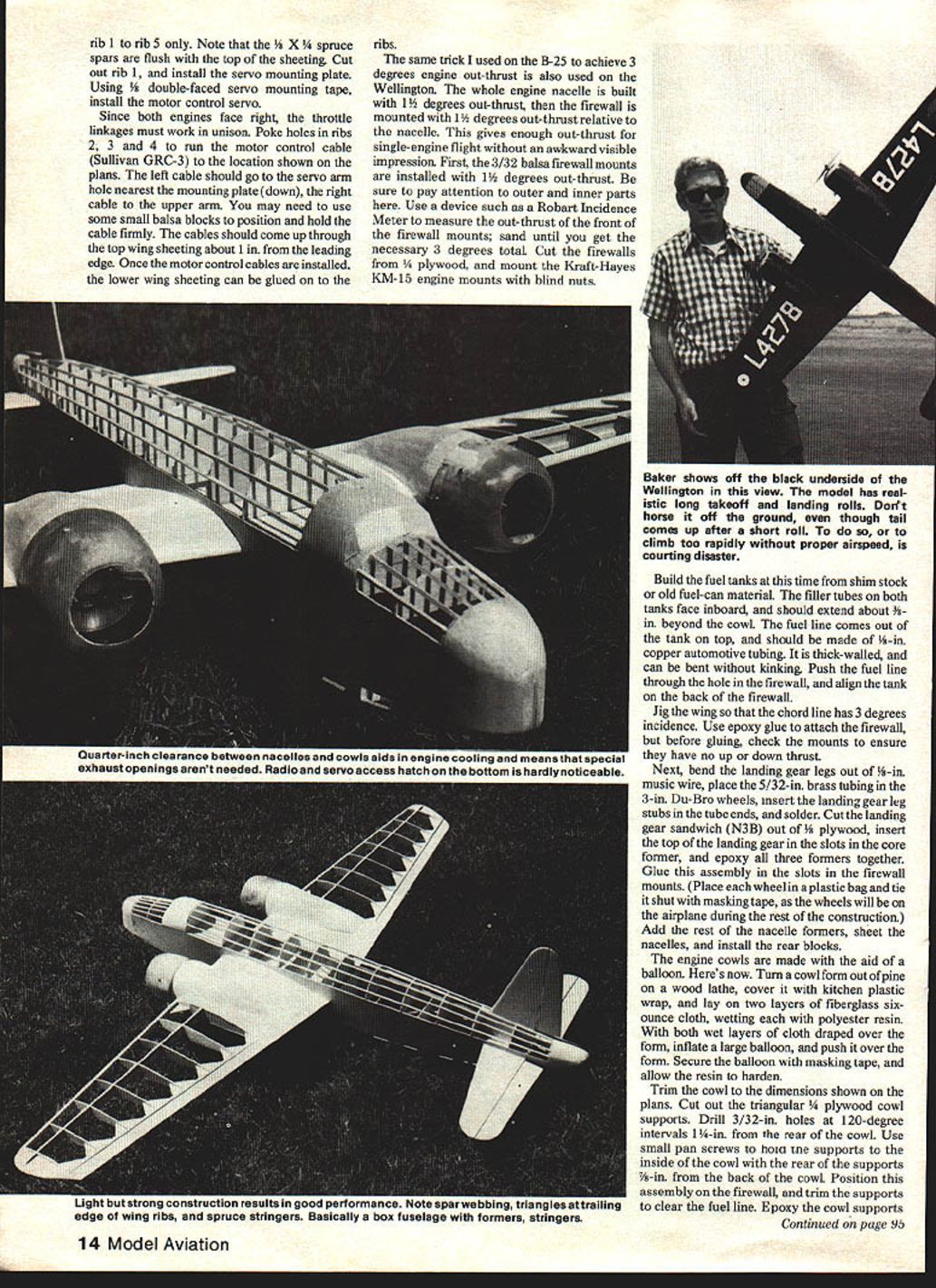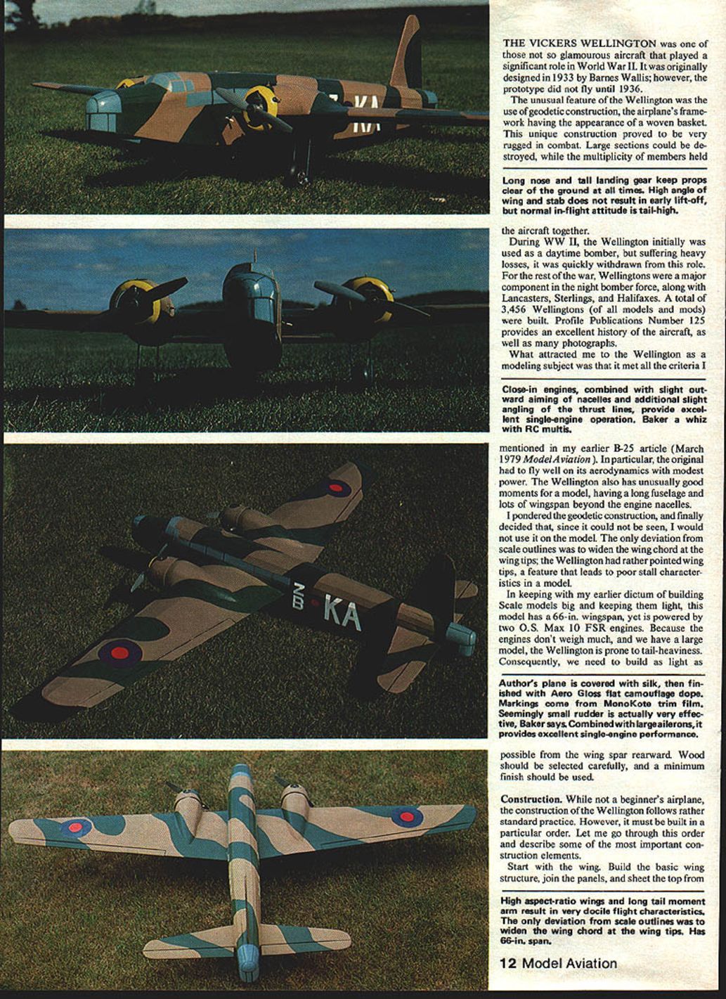 NO OCR TEXT NO OCR TEXT THE VICKERS WELLINGTON glamourous aircraft played significant role World War II originally designed 1933 Barnes Wallis however prototype did fly until 1936 unusual feature Wellington use geodetic construction airplanes frame work having appearance woven basket unique construction proved very rugged combat Large sections could de stroyed multiplicity members held Long nose tall landing gear keep props clear ground times High angle wing stab does result early lift-off normal in-flight attitude tail-high aircraft together During WW II Wellington initially used daytime bomber suffering heavy losses quickly withdrawn role rest war Wellingtons major component night bomber force along Lancasters Sterlings Halifaxes total 3456 Wellingtons models mods built Profile Publications Number 125 provides excellent history aircraft well photographs What attracted Wellington modeling subject met criteria Close-in engines combined slight out ward aiming nacelles additional slight angling thrust lines provide excel lent single-engine operation Baker whiz RC multis mentioned earlier B-25 article March 1979 ModelAviation icular original fly well its aerodynamics modest power Wellington also has unusually good moments model having long fuselage lots wingspan beyond engine nacelles pondered geodetic construction finally decided since could seen would use modeL deviation scale outlines widen wing chord wing tips Wellington rather pointed wing tips feature leads poor stall character istics modeL keeping earlier dictum building Scale models big keeping light model has 66-in wingspan yet powered two OS Max 10 FSR engines Because engines dont weigh much have large model Wellington prone tail-heaviness Consequently need build light Authors plane covered silk f ished Aero Gloss flat camouflage dope Markings come MonoKote trim film Seemingly small rudder actually very effec tive Baker says Combined largeaileronsit provides excellent single-engine performance possible wing spar rearward Wood should selected carefully minimum finish should used Construction beginners airplane construction Wellington follows rather standard practice However must built particular order Let go through order describe some important con struction elements Start wing Build basic wing structure join panels sheet top 12 Model Aviation High aspect-ratio wings long tail moment arm result very docile flight characteristics deviation scale outlines widen wing chord wing tips Has 66-in span SPLICE PLATE 5/32 BALSA RUDDER AND FIN 1/4 SHEET BALSA FOR STABILIZER AND ELEVATORS I/B SQ SPFOCE FOR ALL STRINGERS TOPAND BOTTOM 3/32 SHEET BALSA BETWEEN lOP FORMERS 3/32 BALSA PLANKING FORM NACELLESSERVO FOR BOTH ENGINESI/B PLYV/CflD BRACE THRU C SECTION FIBERGLASS COWLIS 12 10 ENGINE ON SOLID BALSA BLOCK 7 COCKPIT CANOPY F 1 1/4 BALSA FORMER SOLID BALSA TURRET BLOCK 3/32 SHEET BALSA BETWEEN BOTTOM FCMERS DOELER BEGINS HERE I/B HATCH FLOOR x T ACCESS HATCH SECURES WITH TWO CLIPS X / 1/4 PLYWWD COWL MOUNTS 3 7in 7 / -x -SPLICE 3/32 MUSIC WIRE IN I/BBRASS TUBE BALSA BLOCK TAIL TURRET HOLLO WED F 5 1/4 BALSA FORMER RUDDER BELLCRANK SUWVANGRC6 BRAIDED CABLE IN PLASTiC TUBES FOR PUSH RODS TAILVv1-IEEL BELLCRANK 11/4 WHEEL ON 3/32 MUSIC WIRE 3/3SHEET FORMER 3 3/32 SHEETBALSA SIDES FULL LENGTH 1/32 PLYWCOD DOUBLER FROM F4 10 Fl 1-12 I/IA SHEET BALSA OVER CENTER SECliON 7-7 1/8 PLYWOCO TRIPLED FOR LANDING GEAR OF I/B MUSIC WIRE 1/4 X 3/8 HARD BALSA SPAR BALSA STOCK 1/16 SHEET BALSA BETWEEN RIBS -73/32 BALSA MOUNTS FOR FIREWALL NOiCHED INTO LG MCUff -BRO WHEELS I/BX I/4SPRUCE SPARS 3/BX 3/4 BALSA LEADING EDGE 3/B BALSA TIPS MUSIC WIRE TO AILEFON SERV 7W rib 1 rib 5 Note pruce spars flush top sheeting Cut Out rib 1 install servo mounting plate Using le-faced servo mounting tape install motor control servo Since both engines face right throttle linkages must work unison Poke holes ribs 2 3 4 run motor control cable Sullivan GRC-3 location shown plans left cable should go servo arm hole nearest mounting plate down right cable upper arm may need use some small balsa blocks position hold cable firmly cables should come up through top wing sheeting about leading edge Once motor control cables installed lower wing sheeting can glued ribs same trick used B-25 achieve 3 degrees engine out-thrust also used Wellington whole engine nacelle built 1 degrees out-thrust firewall mounted 1 degrees out-thrust relative nacelle gives enough out-thrust single-engine flight awkward visible impression First 3/32 balsa firewall mounts installed 1 degrees out-thrust sure pay attention outer inner parts Use device such Robart Incidence Meter measure out-thrust front firewall mounts sand until get necessary 3 degrees totaL Cut firewalls 1A plywood mount Kraft-Hayes KIvI-15 engine mounts blind nuts Build fuel tanks time shim stock old fuel-can material filler tubes both tanks face inboard should extend about beyond cowL fuel line comes out tank top should made -in copper automotive tubing thick-walled can bent kinking Push fuel line through hole firewall align tank back firewall Jig wing chord line has 3 degrees incidence Use epoxy glue attach firewall before giuing check mounts ensure have no up down thrust Next bend landing gear legs out -in music wire place 5/32-in brass tubing 3-in Du-Bro wheels insert landing gear leg stubs tube ends solder Cut landing gear sandwich N3B Out 4 plywood insert top landing gear slots core former epoxy three formers together Glue assembly slots firewall mounts Place wheel plastic bag tie shut masking tape wheels will airplane during rest construction Add rest nacelle formers sheet nacelles install rear blocks engine cowls made ald balloon Heres now Turns cowl form out pine wood lathe cover kitchen plastic wrap lay two layers fiberglass sixounce cloth wetting polyester resin both wet layers cloth draped over form inflate large balloon push over form Secure balloon masking tape allow resin harden Trim cowl dimensions shown plans Cut out triang