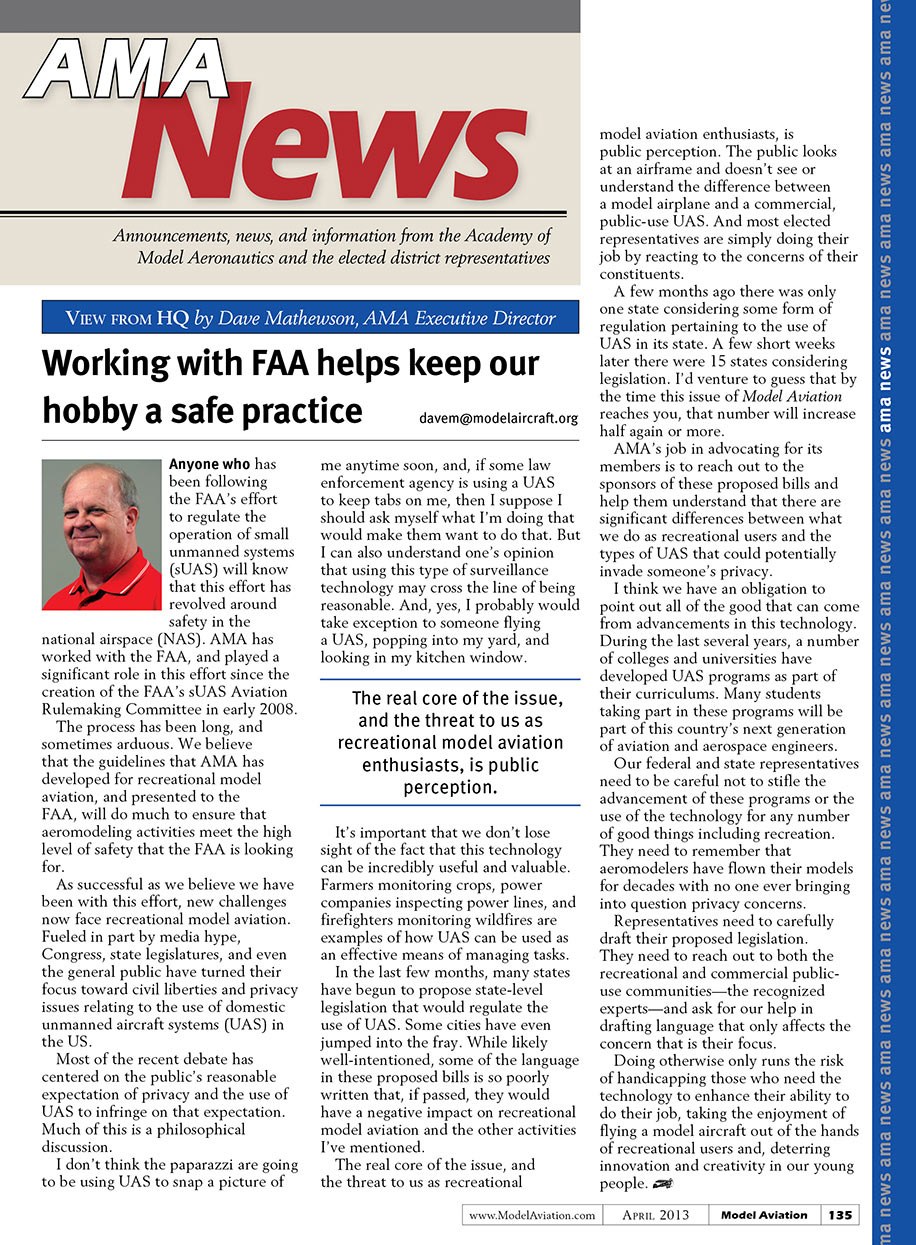 Only a few months ago there was but one state considering some form of regulation pertaining to the use of UASs in its state. A few short weeks later there were 15 states considering legislation. I’d venture to guess that by the time this issue of Model Aviation reaches you, that number will increase half again or more.