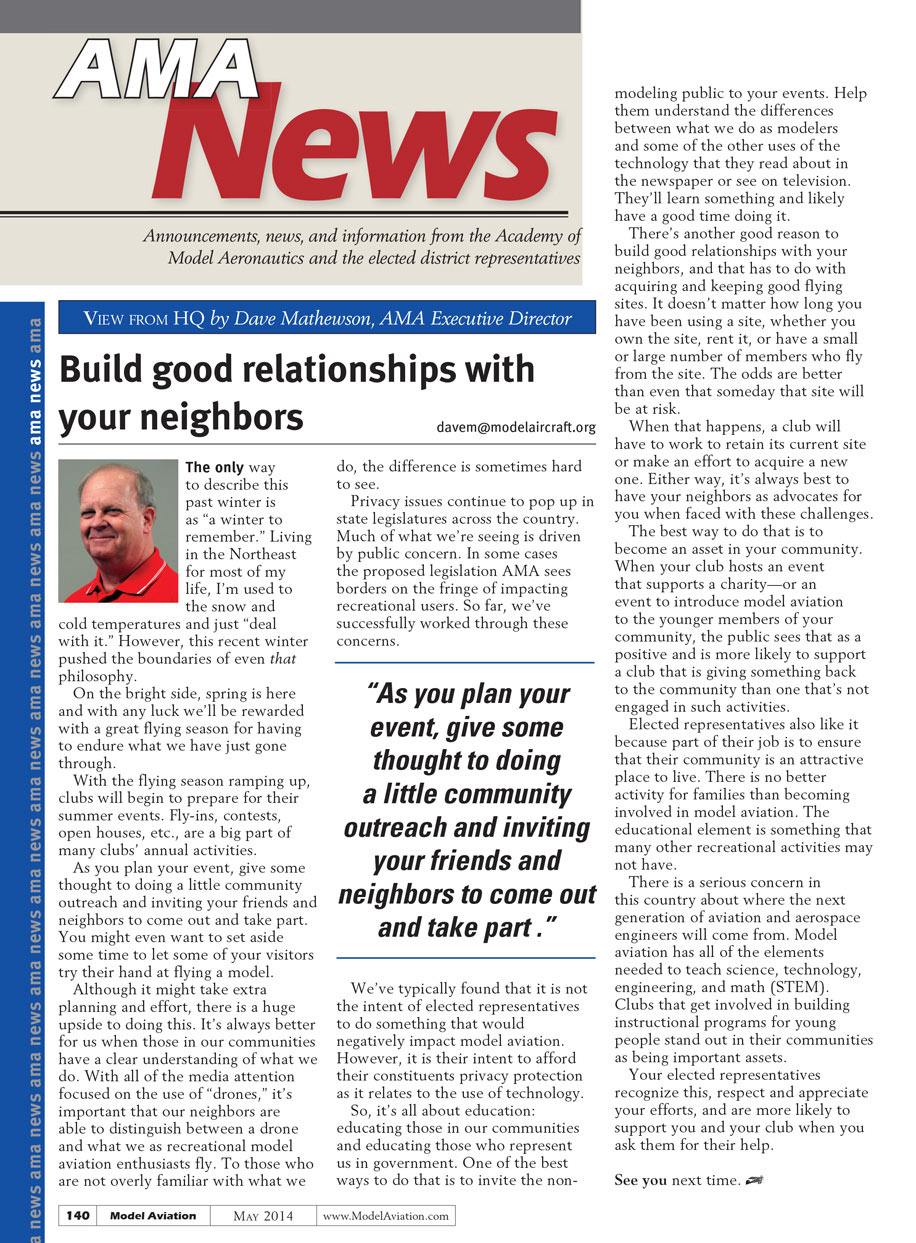 The best way to do that is to become an asset in your community. When your club hosts an event that supports a charity—or an event to introduce model aviation to the younger members of your community—the public sees that as a positive. The public recognizes this and is more likely to support a club that is giving something back than one that’s not engaged in such activities.