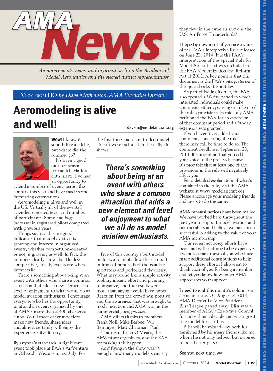 If you haven’t yet added your comments concerning the rule, there may still be time to do so. The comment deadline is September 23. It’s important that you add your voice to the process because it’s probable at least one of the provisions in the rule will negatively affect you. For a detailed explanation of what’s contained in the rule, visit the AMA website at www.modelaircraft.org. Please encourage your modeling friends and peers to do the same.