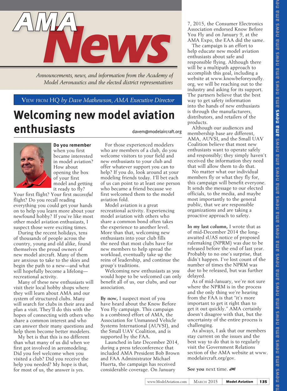 As always, I ask the our members stay current on the issues and the best way to do that is to regularly visit the Government Relations section of the AMA website at www.modelaircraft.org/gov.