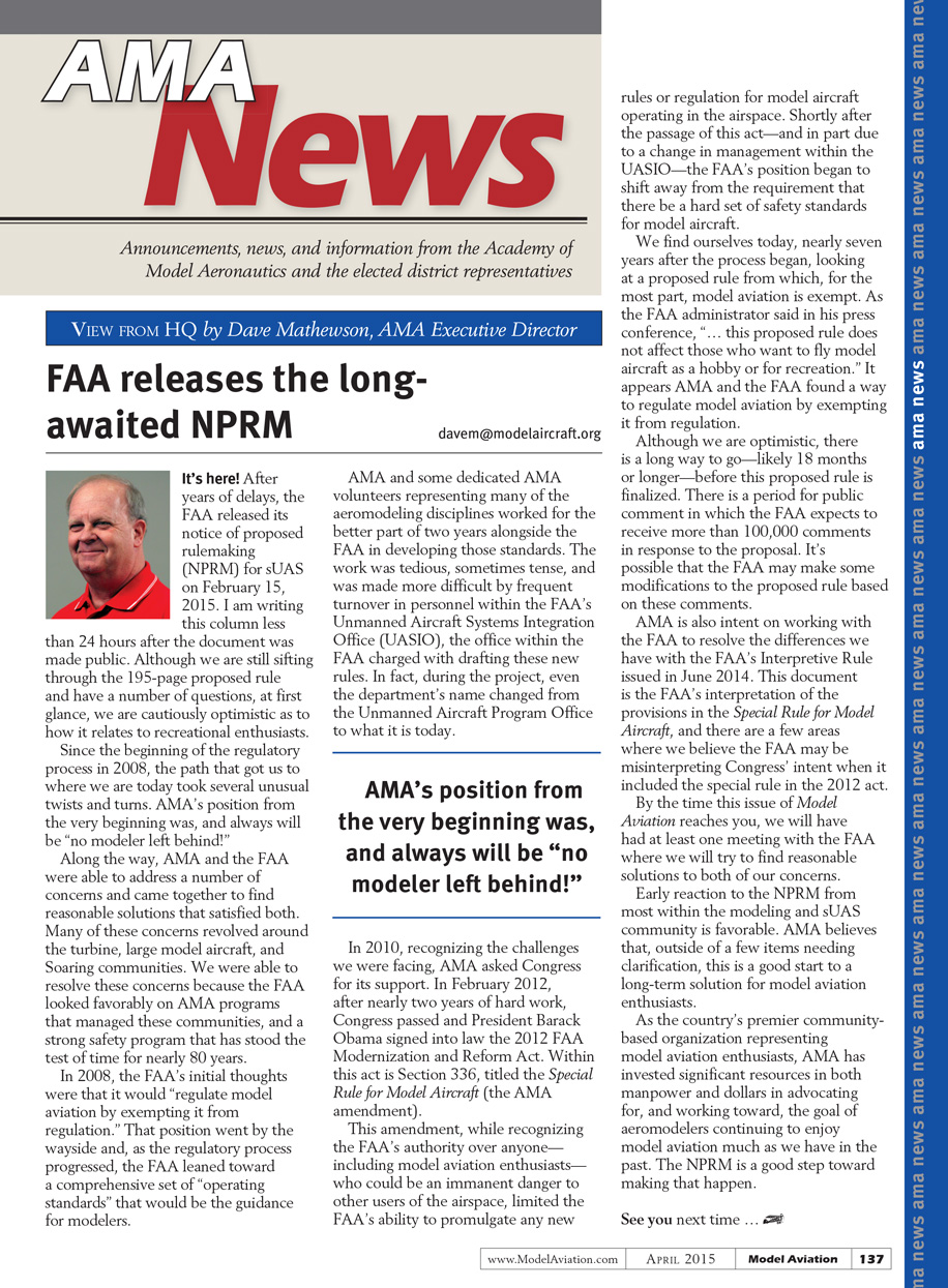 It’s here! After years of delays, the FAA released its notice of proposed rulemaking (NPRM) for sUAS on February 15, 2015. I am writing this column less than 24 hours after the document was made public. Although we are still sifting through the 195-page proposed rule and have a number of questions, at first glance we are cautiously optimistic as to how it relates to recreational enthusiasts.