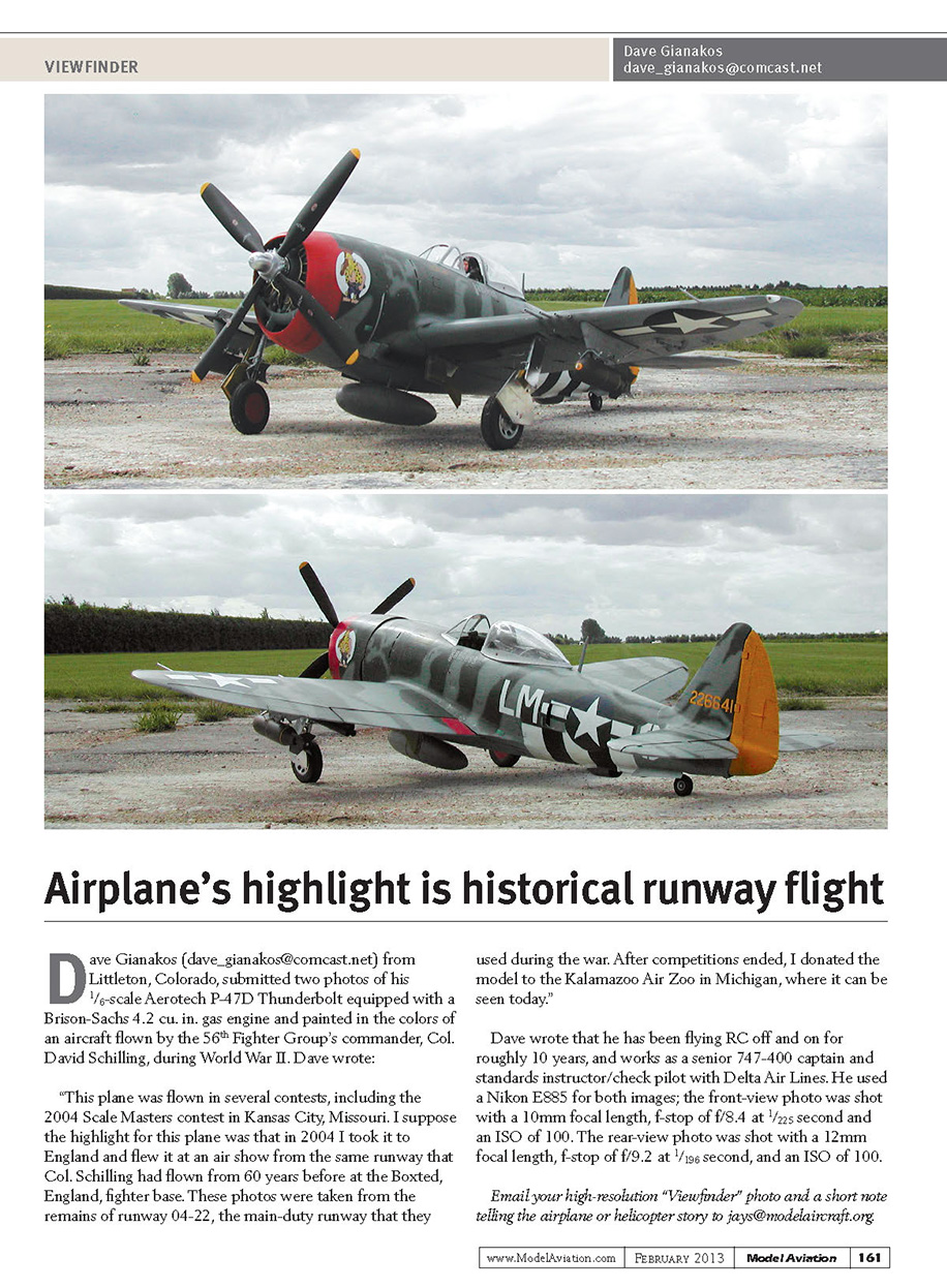 Dave Gianakos (dave_gianakos@comcast.net) from Littleton, Colorado, submitted two photos of his 1/6-scale Aerotech P-47D Thunderbolt equipped with a Brison-Sachs 4.2 cu. in. gas engine and painted in the colors of an aircraft flown by the 56th Fighter Group’s commander, Col. David Schilling, during World War II. Dave wrote: “This plane was flown in several contests, including the 2004 Scale Masters contest in Kansas City, Missouri. I suppose the highlight for this plane was that in 2004 I took it to England and flew it at an air show from the same runway that Col. Schilling had flown from 60 years before at the Boxted, England, fighter base. These photos were taken from the remains of runway 04-22, the main-duty runway that they used during the war. After competitions ended, I donated the model to the Kalamazoo Air Zoo in Michigan, where it can be seen today.” Dave wrote that he has been flying RC off and on for roughly 10 years, and works as a senior 747-400 captain and standards instructor/check pilot with Delta Air Lines. He used a Nikon E885 for both images; the front-view photo was shot with a 10mm focal length, f-stop of f/8.4 at 1/225 second and an ISO of 100. The rear-view photo was shot with a 12mm focal length, f-stop of f/9.2 at 1/196 second, and an ISO of 100. Email your high-resolution “Viewfinder” photo and a short note telling the airplane or helicopter story to jays@modelaircraft.org.