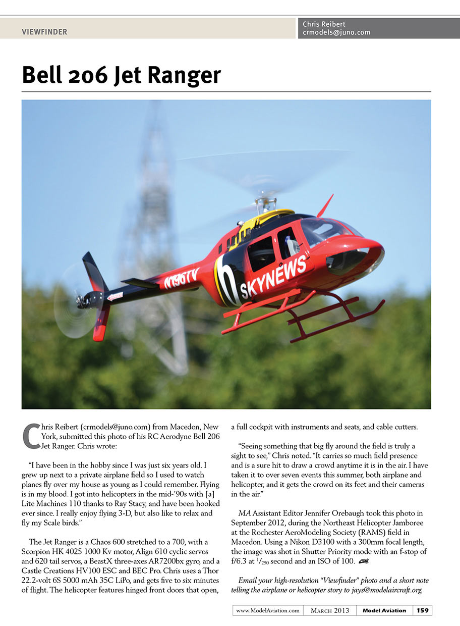Chris Reibert (crmodels@juno.com) from Macedon, New York, submitted this photo of his RC Aerodyne Bell 206 Jet Ranger. Chris wrote: