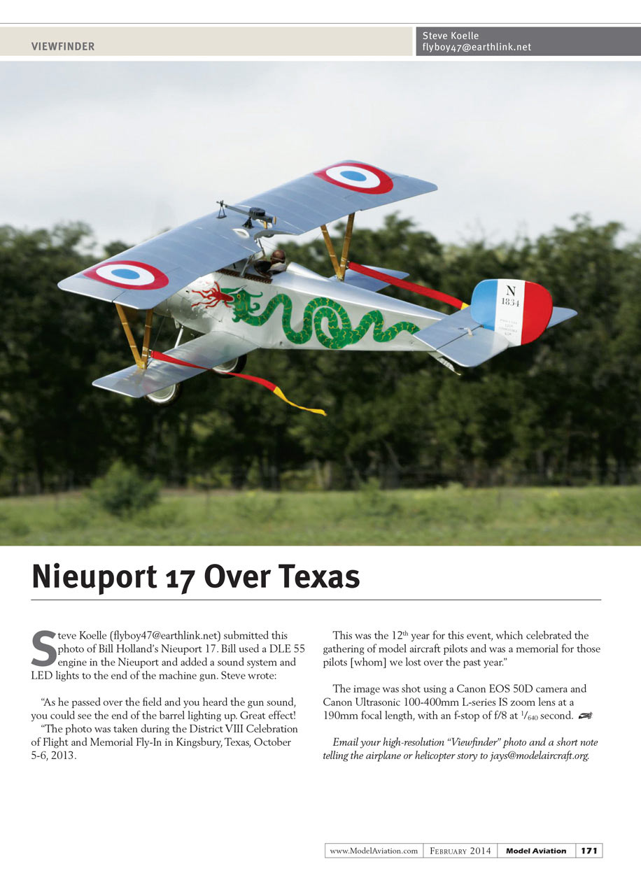 Steve Koelle (flyboy47@earthlink.net) submitted this photo of Bill Holland’s Nieuport 17. Bill used a DLE 55 engine in the Nieuport and added a sound system and LED to the end of the machine gun. Steve wrote: