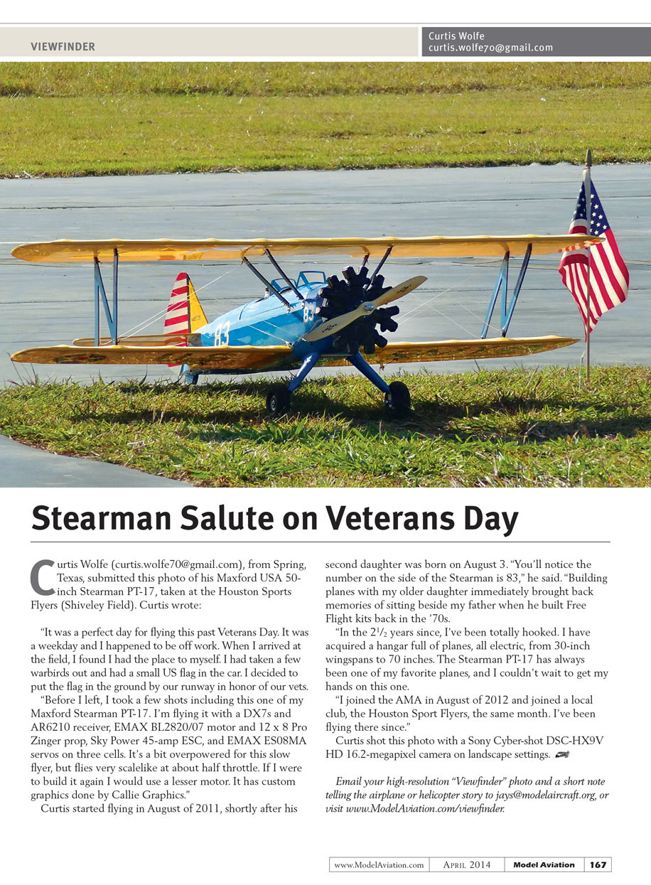 Curtis Wolfe (curtis.wolfe70@gmail.com), from Spring, Texas, submitted this photo of his Maxford USA 50-inch Stearman PT-17, taken at the Houston Sports Flyers (Shiveley Field). Curtis wrote: